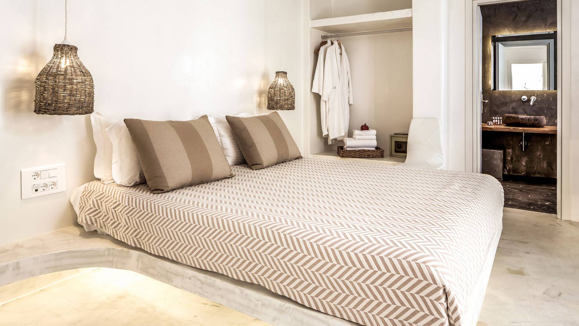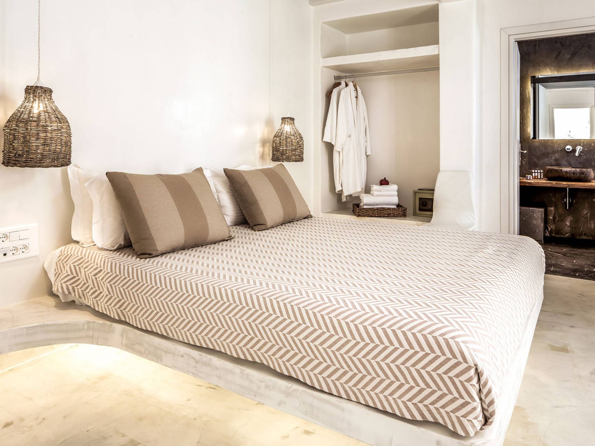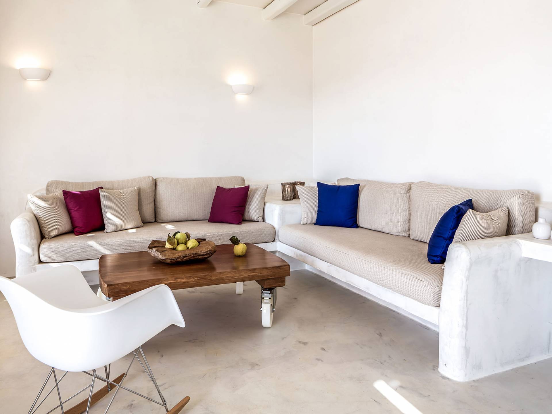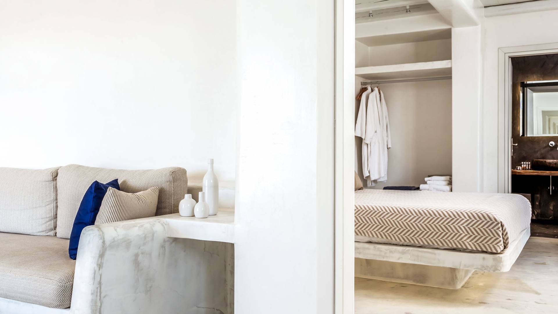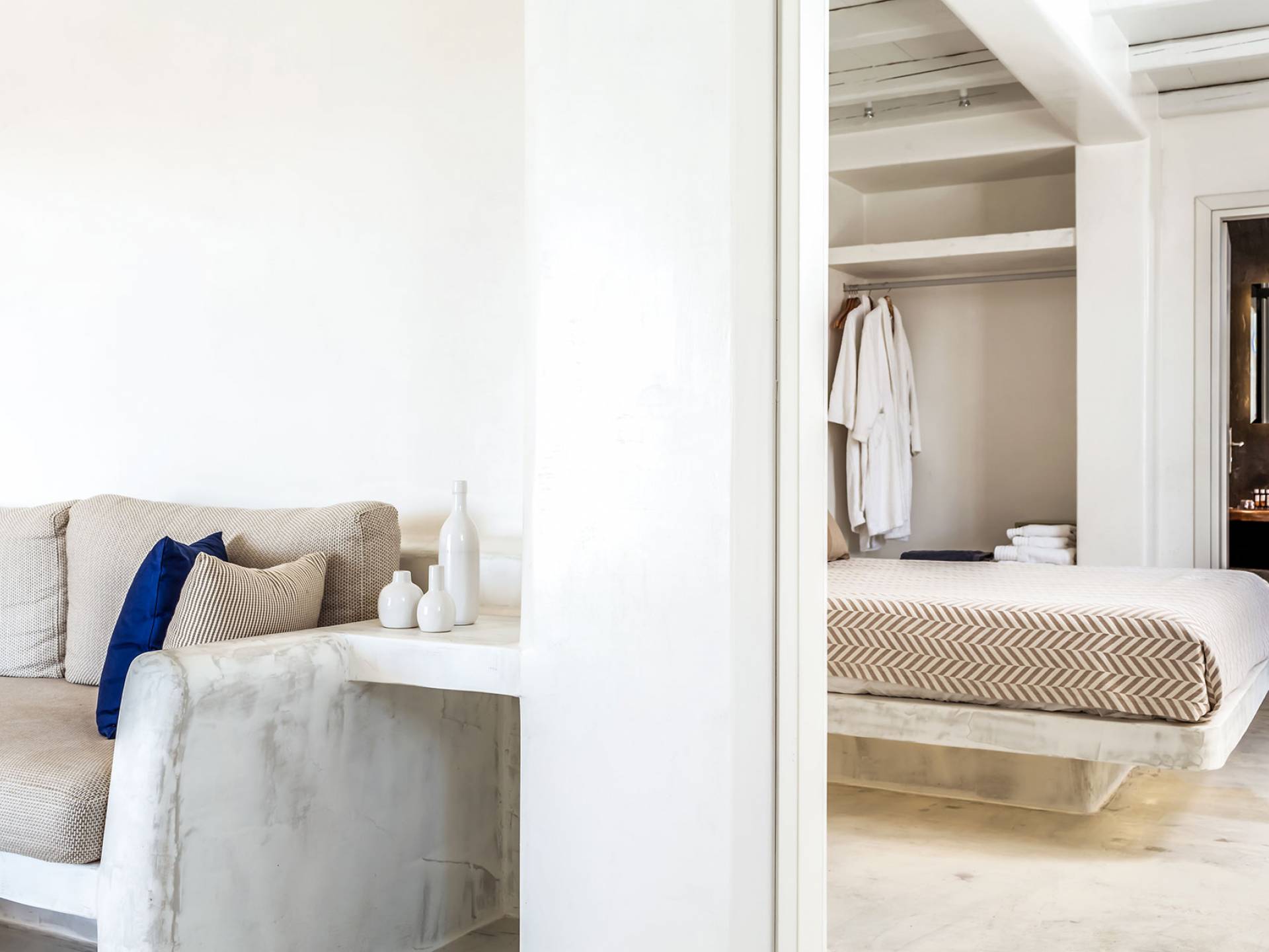 Die Grand Suite besteht aus zwei eingebauten Steinsofas und einer gewagten Dosis Weiß spiegeln den wahren Stil der Kykladen wider, während moderne Annehmlichkeiten wie ultra-geräumige Badezimmer, herrliche Betten und eine voll ausgestattete Küche zum Charme beitragen. Das private Schlafzimmer im Innenbereich und der separate Wohn-/Essbereich kontrastieren mit dem privaten Außenpool und der Terrasse, die die Wohnung nach außen erweitern. Ein oder zwei Schlafsofas sind perfekt für Kinder und bieten den Eltern absolute Privatsphäre im separaten Schlafzimmer. Größere Familien werden in den beiden miteinander verbundenen Suiten (eine davon mit voll ausgestatteter Küche) den ultimativen Urlaub genießen.