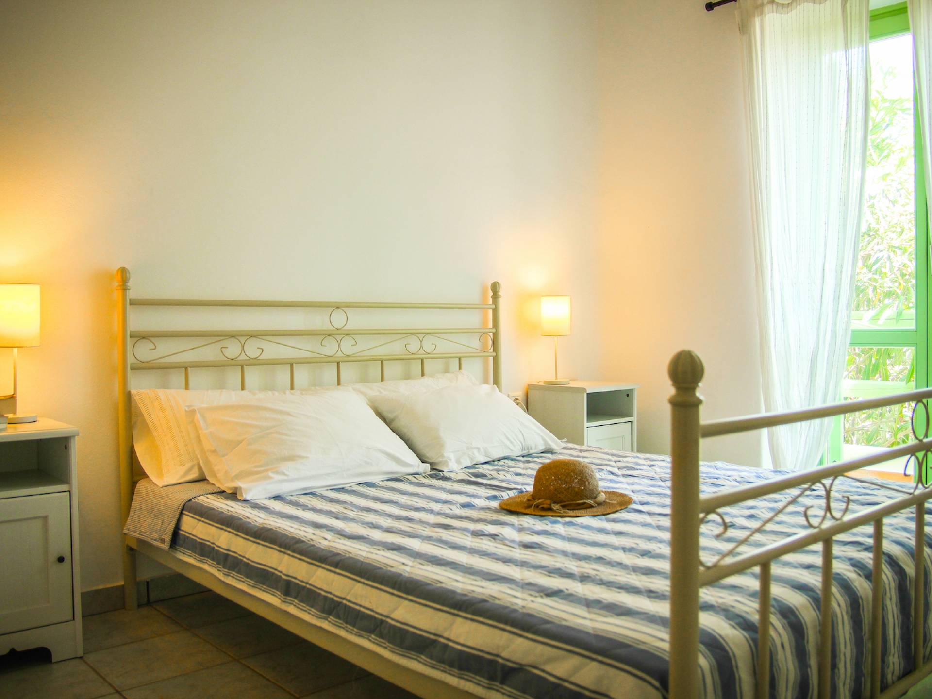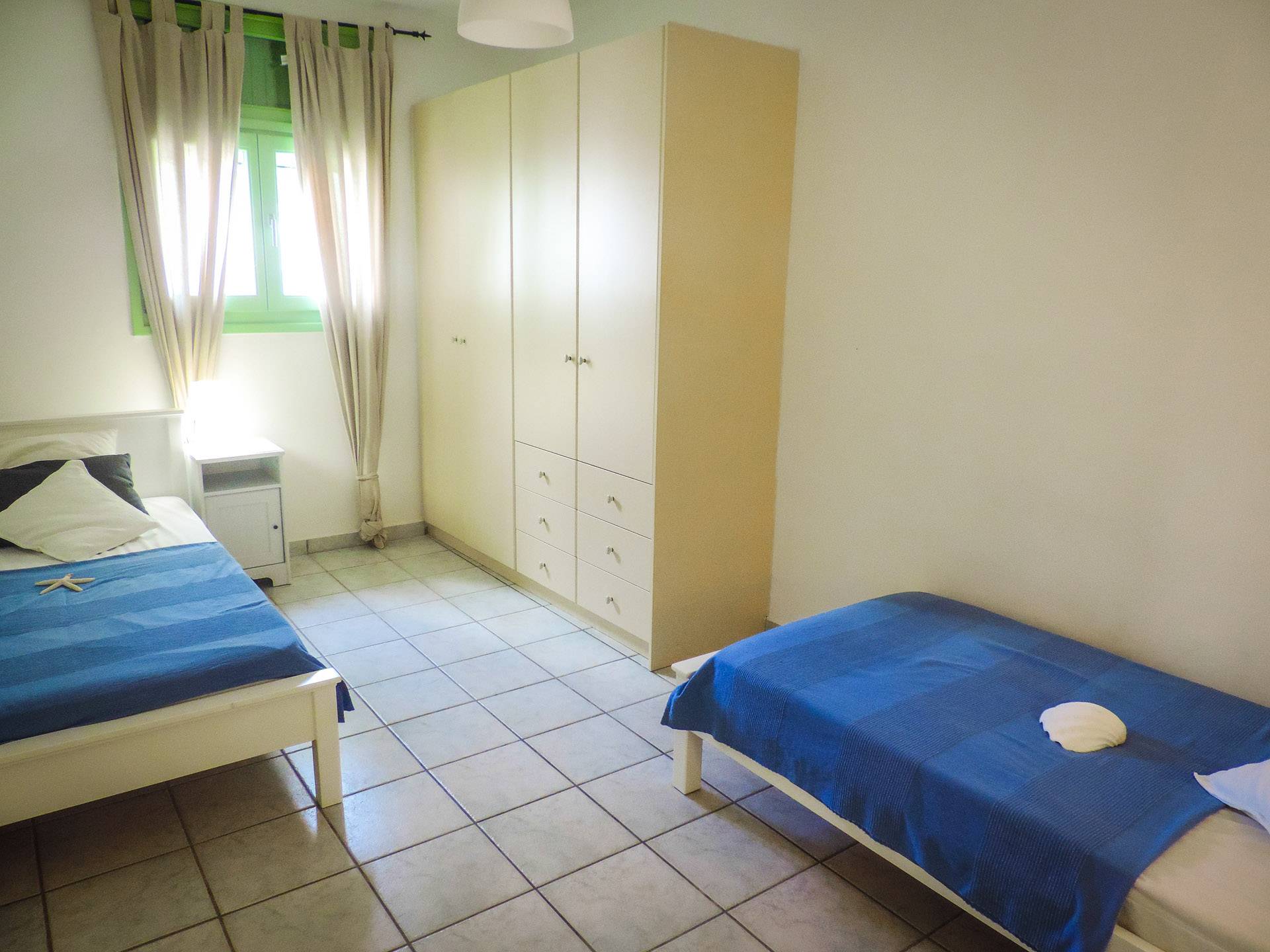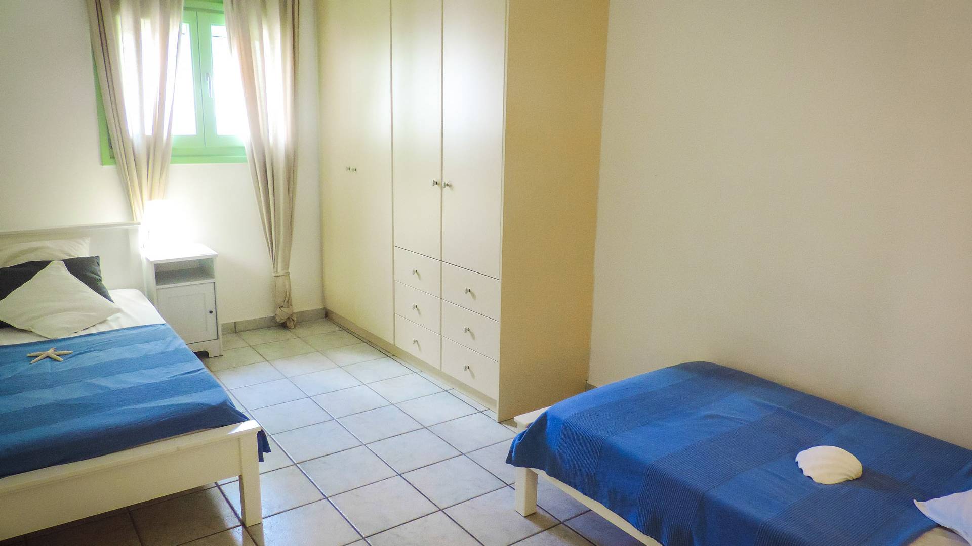 Villa Naxos, Teil von Archipelagos Villas, hat 3 Ebenen. Auf der ersten Ebene (Souterrain) befinden sich zwei große Schlafzimmer für vier Gäste, zwei geräumige Badezimmer und Platz im Freien. Von dieser Ebene aus haben Sie Zugang zum Hof, zum Gemeinschaftspool und über eine Innentreppe in den ersten Stock.