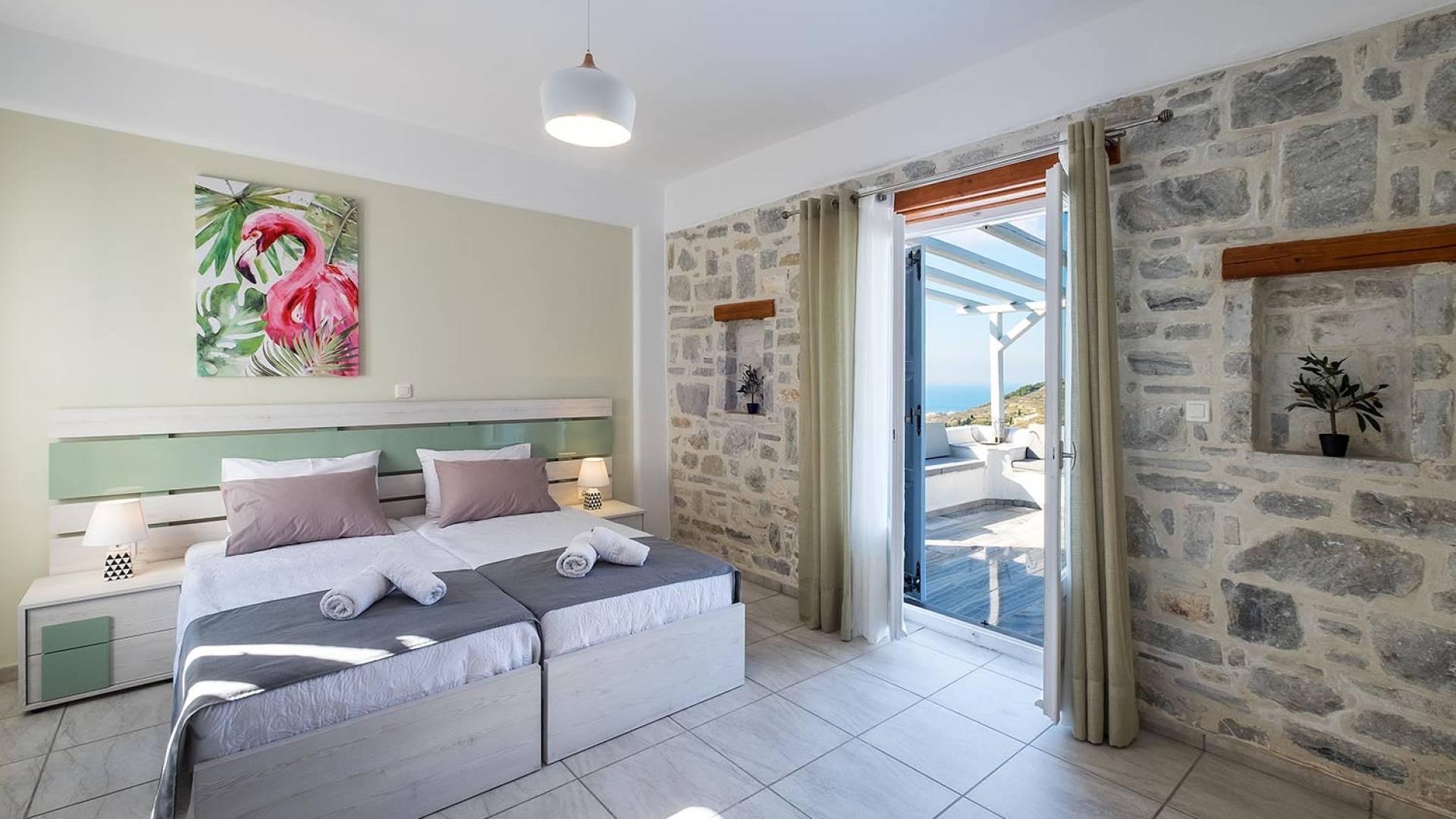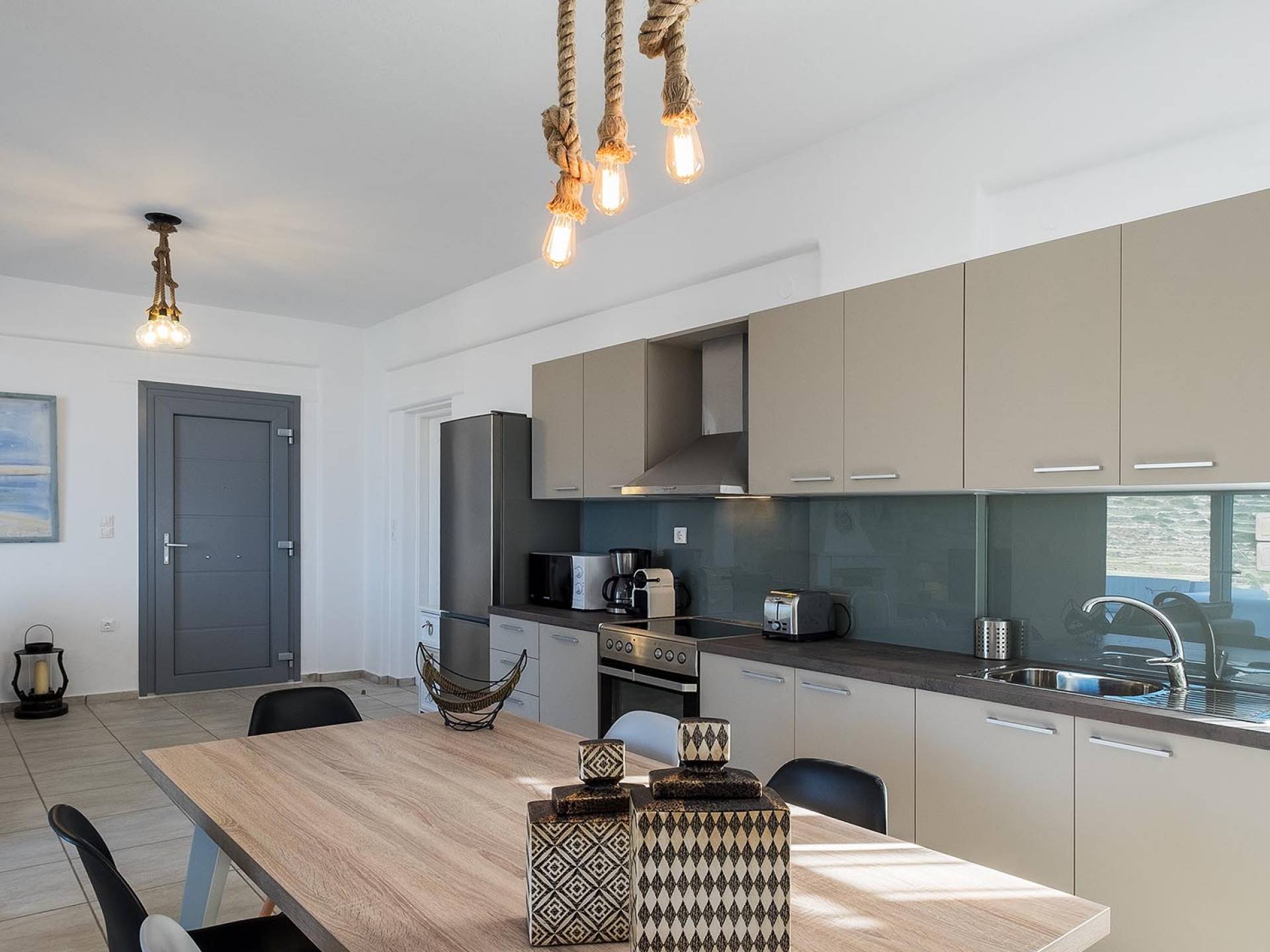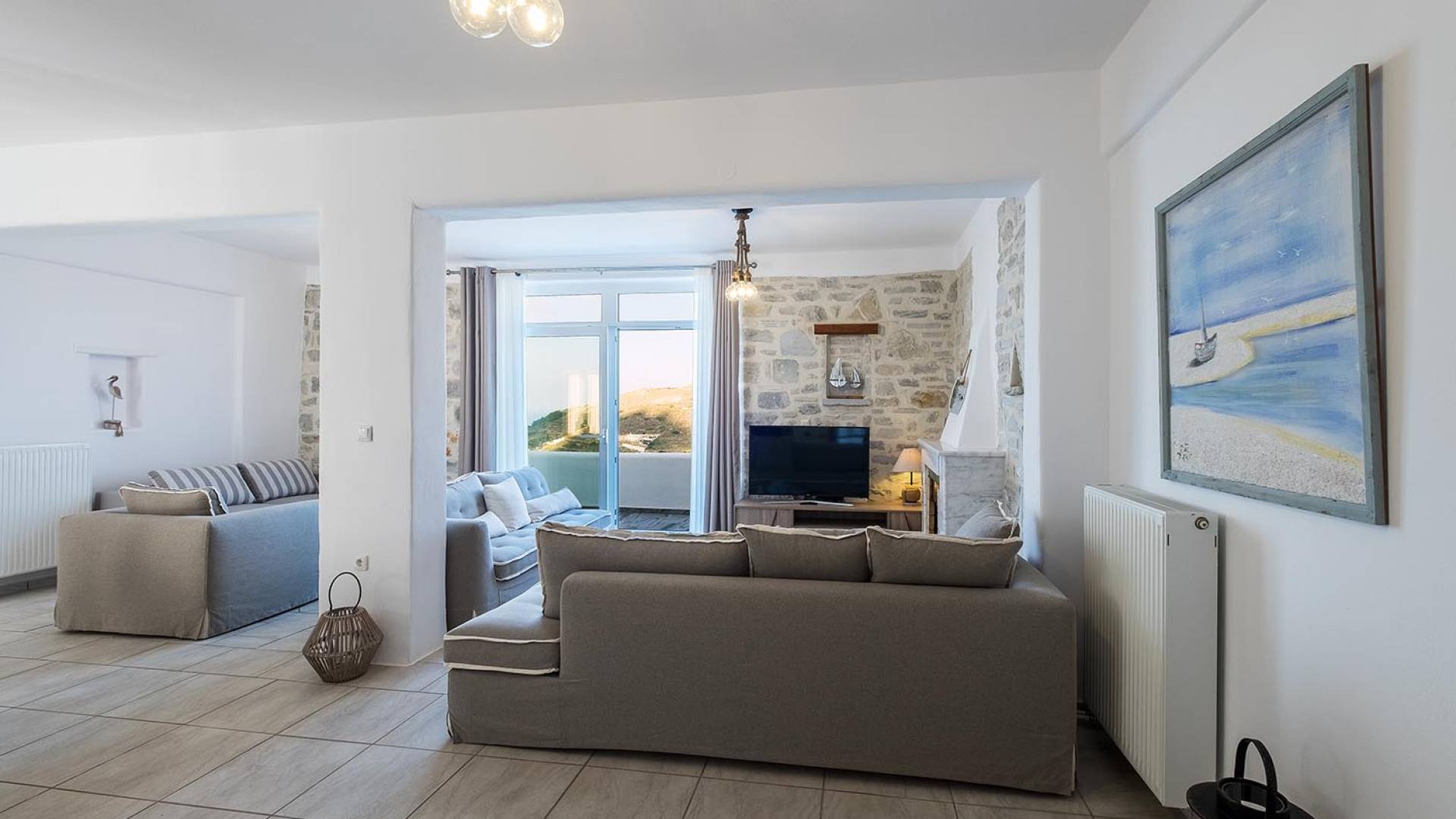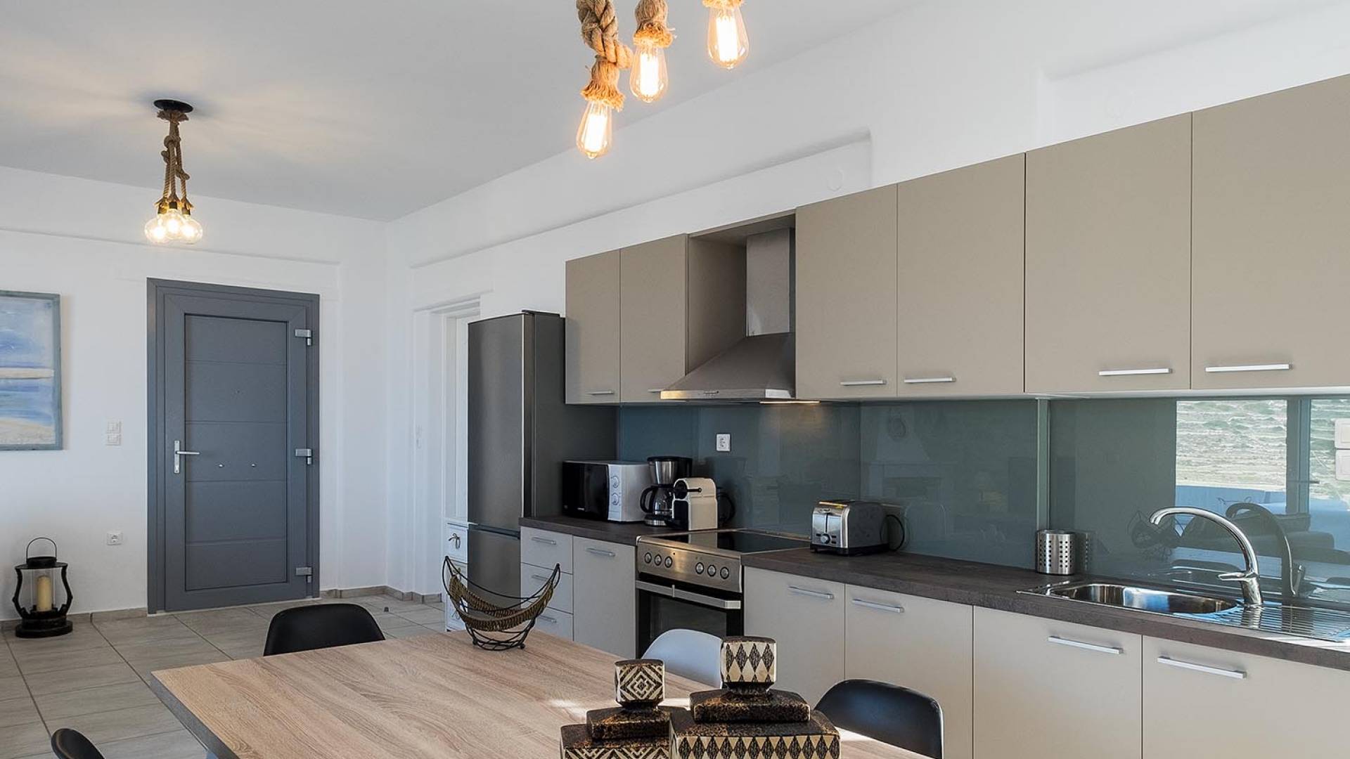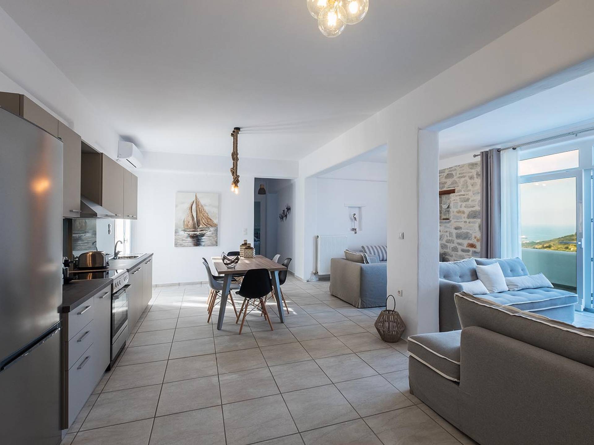 Villa Amphitrite besteht aus zwei separaten Schlafzimmern, eines mit einem Doppelbett und das zweite mit zwei Einzelbetten, sowie zwei Badezimmern. Im Wohnbereich finden Sie ein großes Wohnzimmer mit zwei Sofas und einem Couchtisch, einen Esstisch und eine voll ausgestattete offene Küche. Die Terrasse hat vorne einen Sitzbereich im Freien mit eingebauten Sofas und einen unverstellten Meerblick.