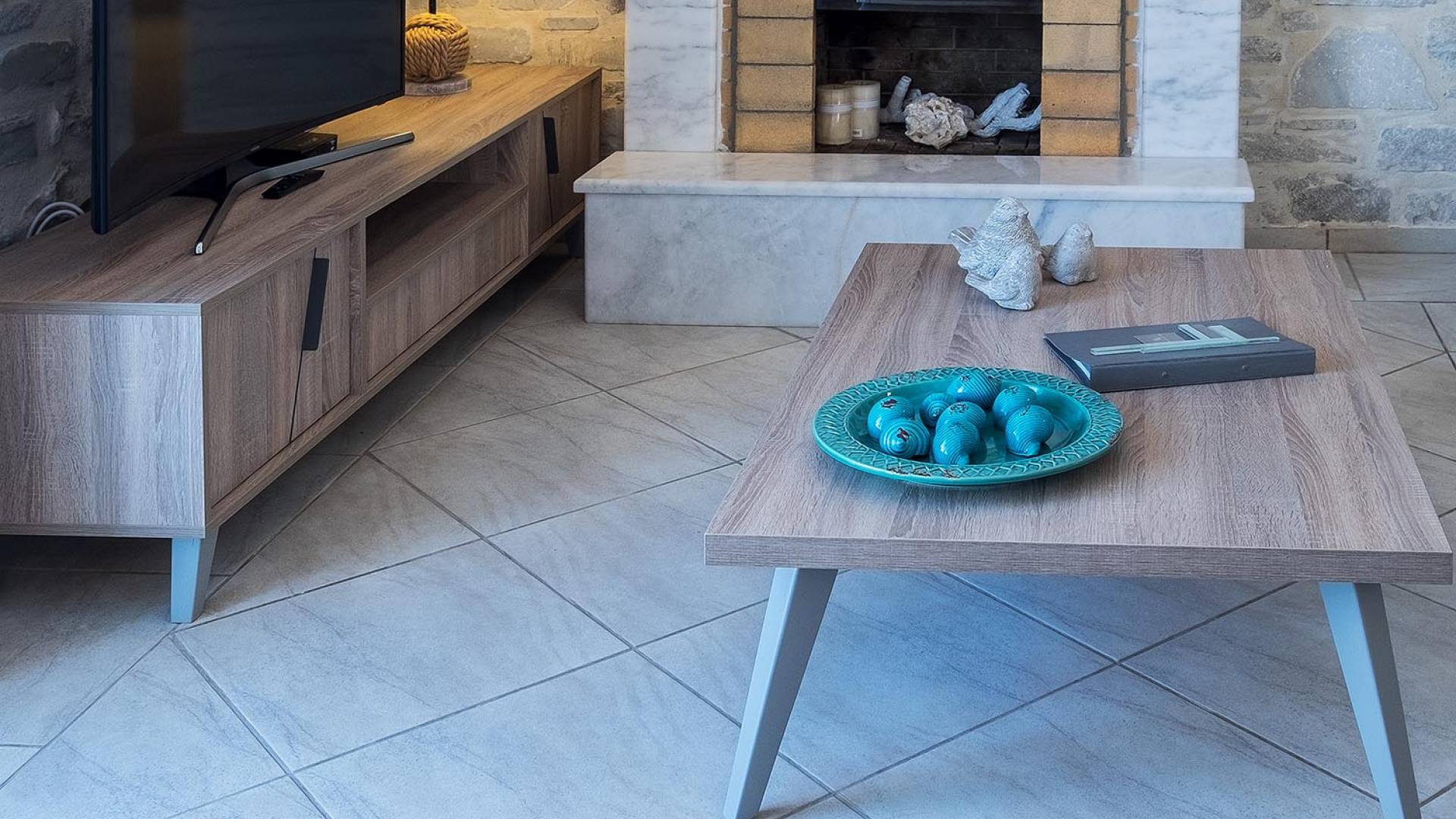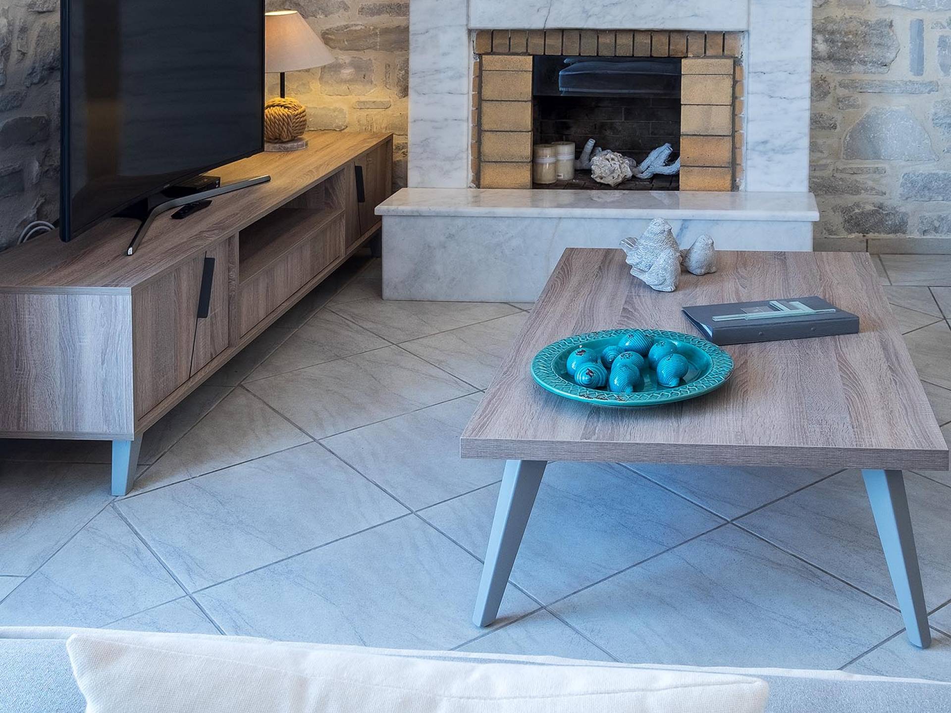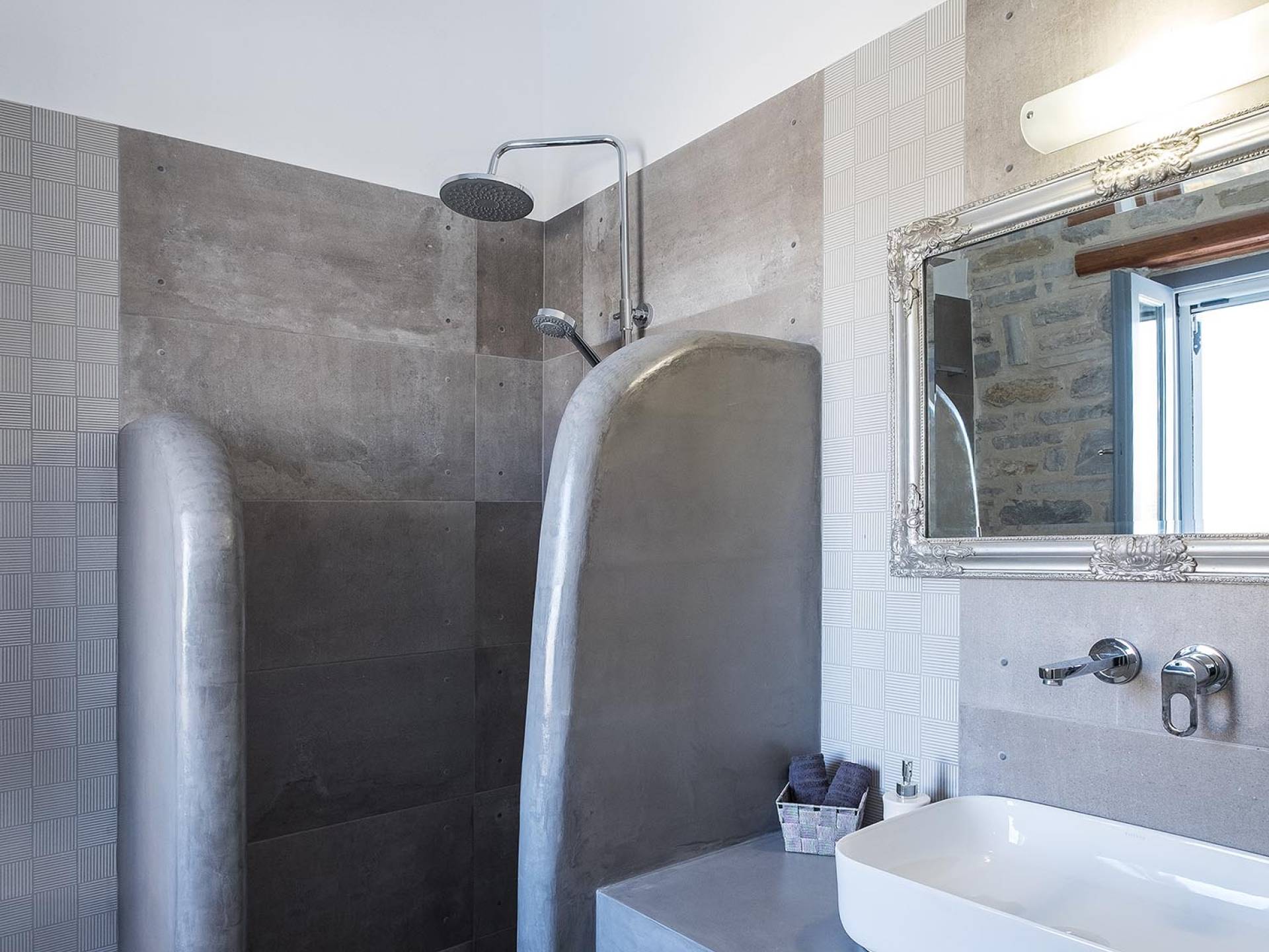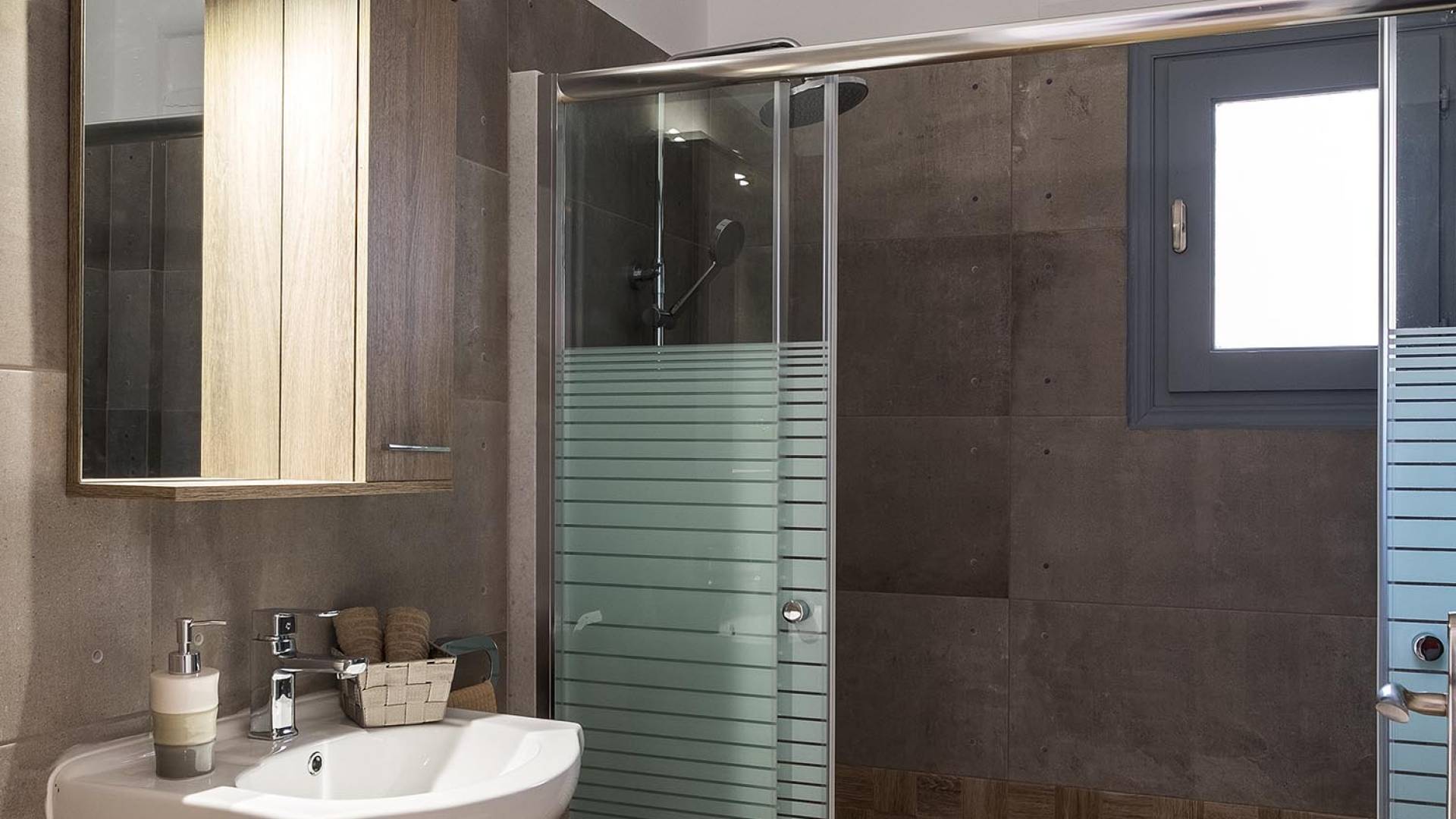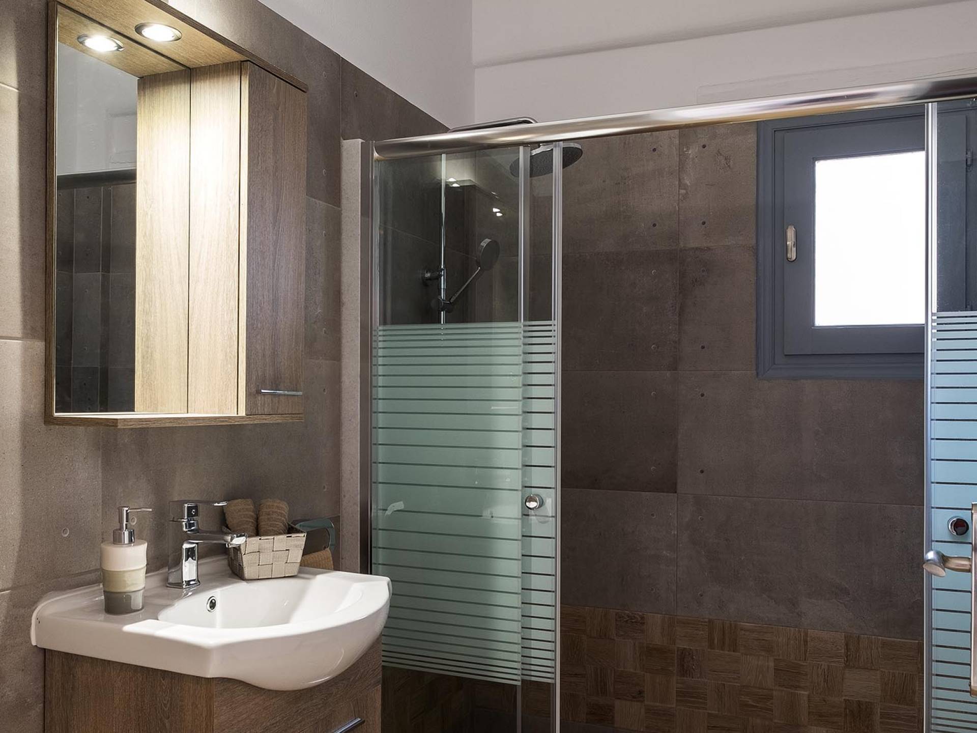 Villa Amphitrite besteht aus zwei separaten Schlafzimmern, eines mit einem Doppelbett und das zweite mit zwei Einzelbetten, sowie zwei Badezimmern. Im Wohnbereich finden Sie ein großes Wohnzimmer mit zwei Sofas und einem Couchtisch, einen Esstisch und eine voll ausgestattete offene Küche. Die Terrasse hat vorne einen Sitzbereich im Freien mit eingebauten Sofas und einen unverstellten Meerblick.