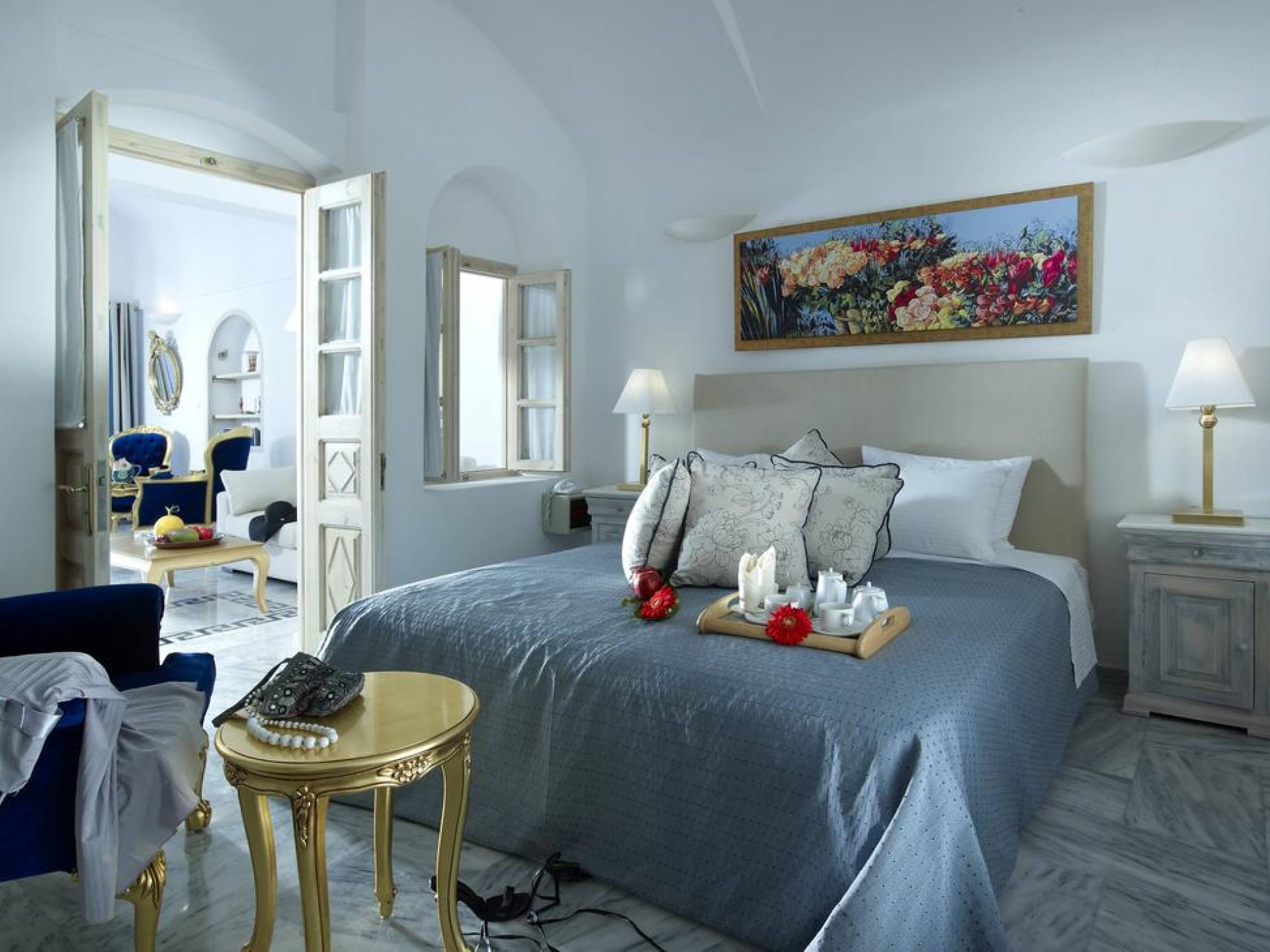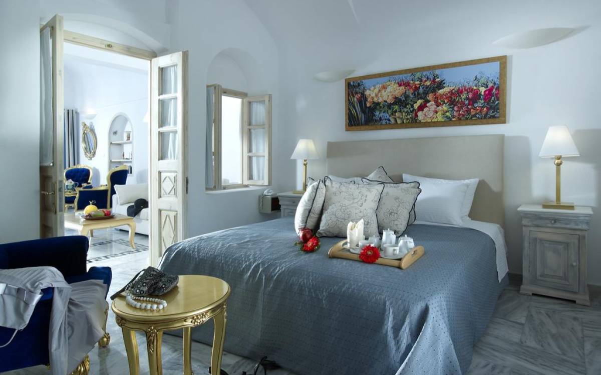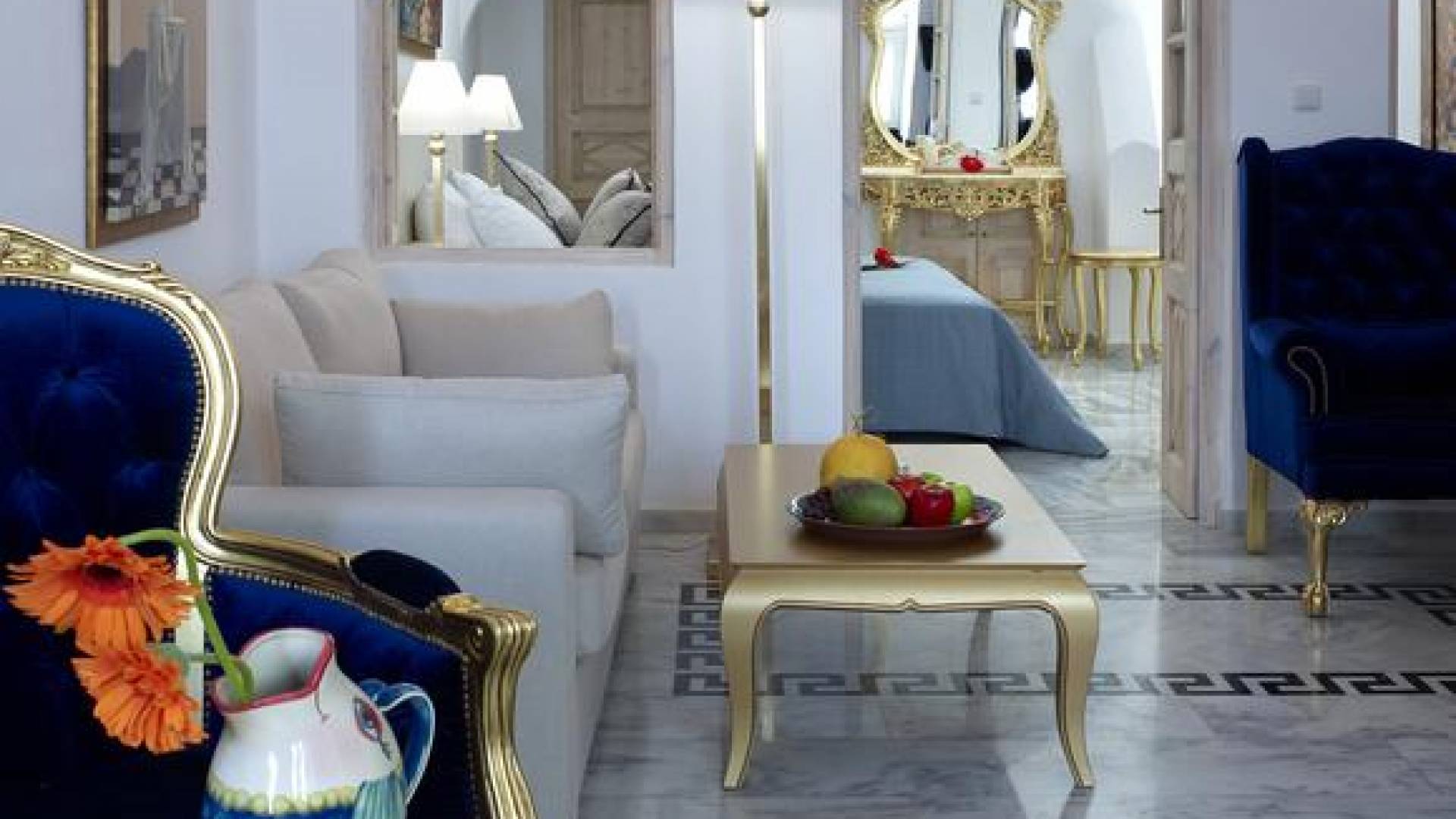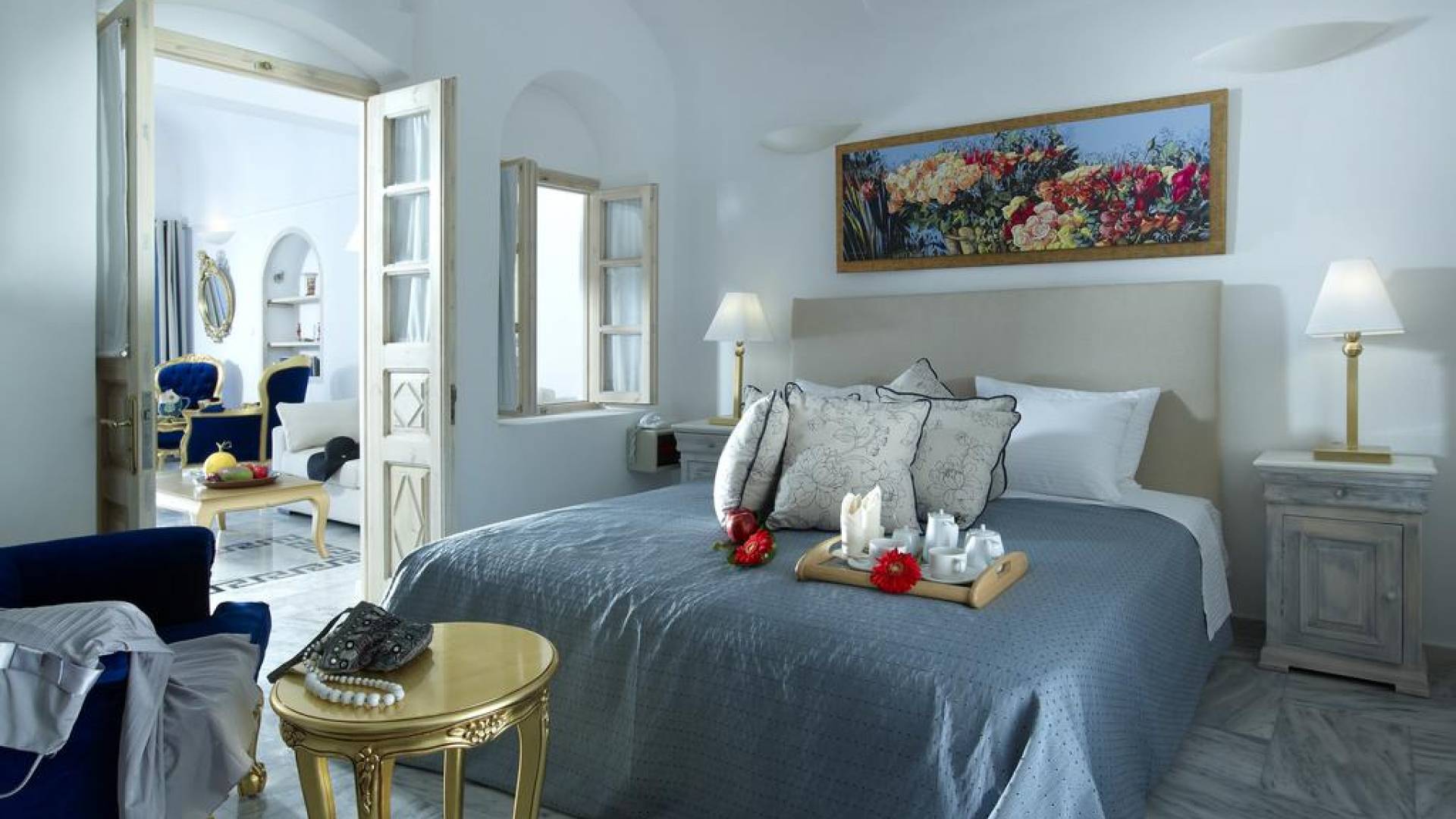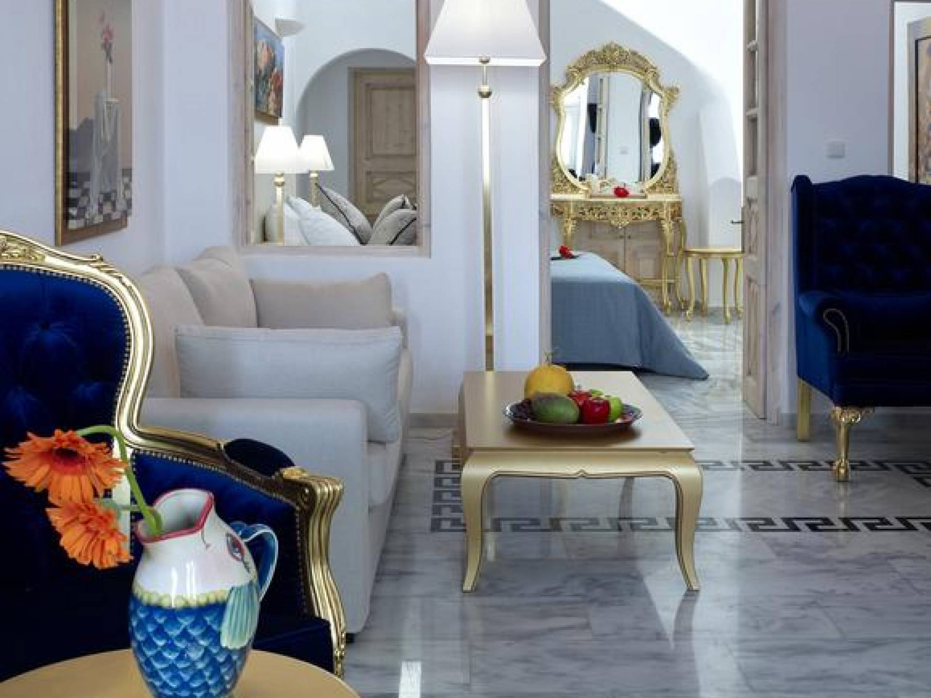 Executive Suite im Kallisto Hotel Santorini: Geräumiges Wohnzimmer, Schlafzimmer mit Queensize-Bett, Schlafsofa, Badezimmer mit Badewanne und private Treppe, die direkt zum Hotelpool führt, private Terrasse mit Blick auf die Caldera.