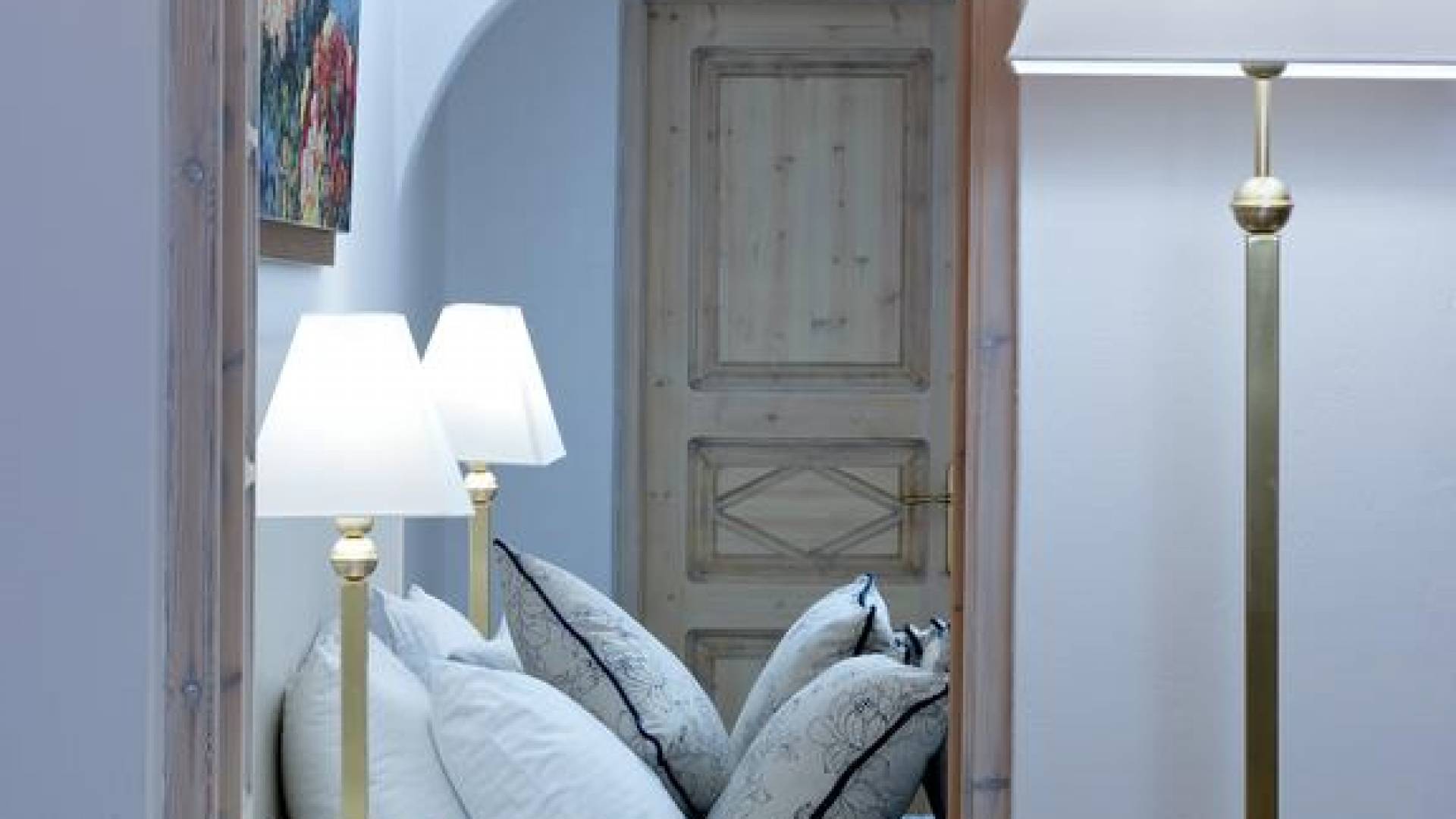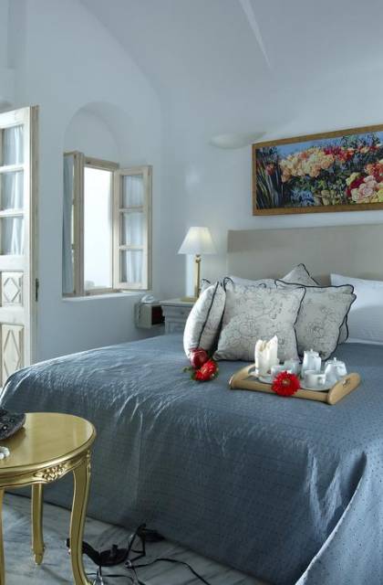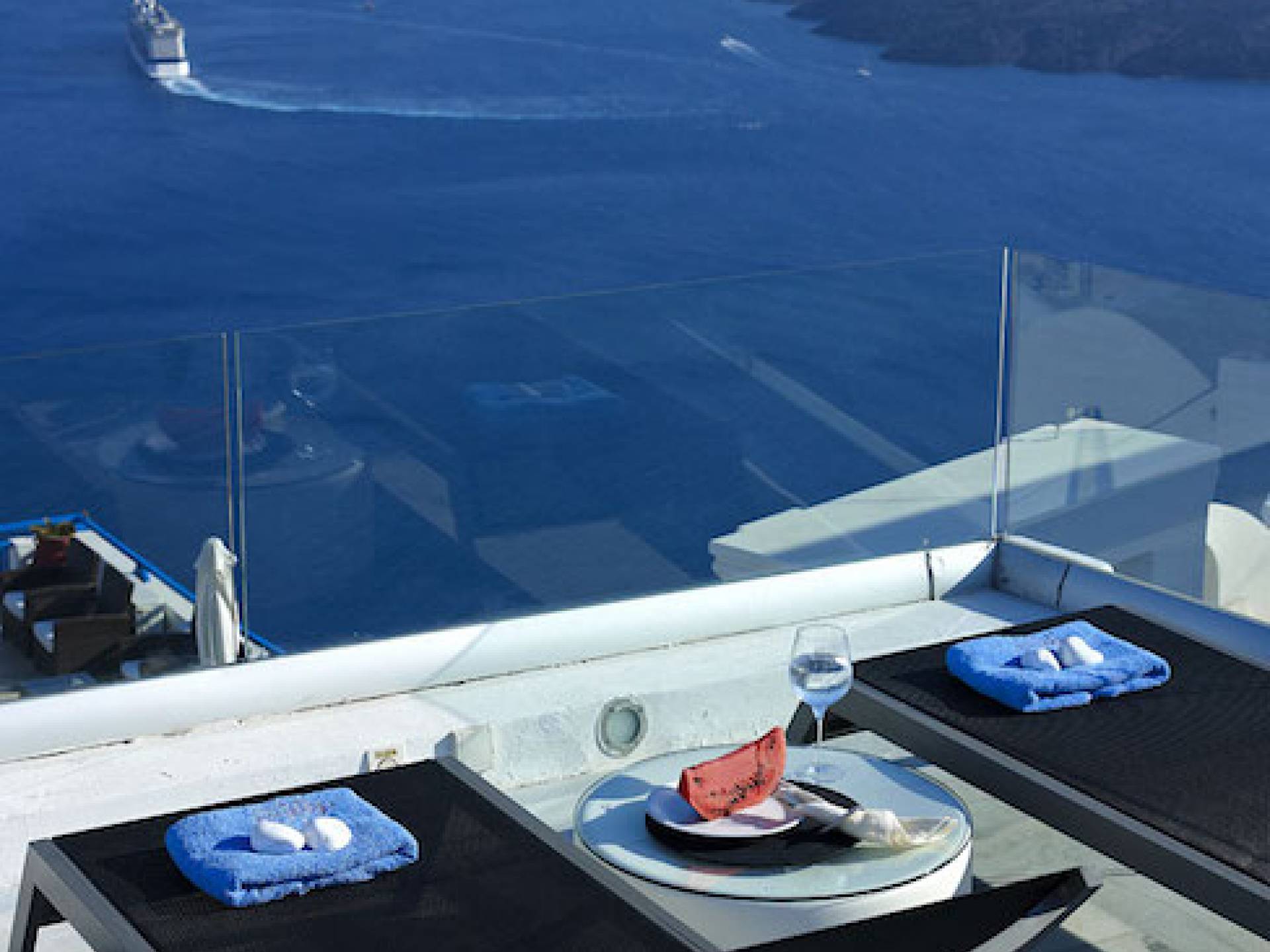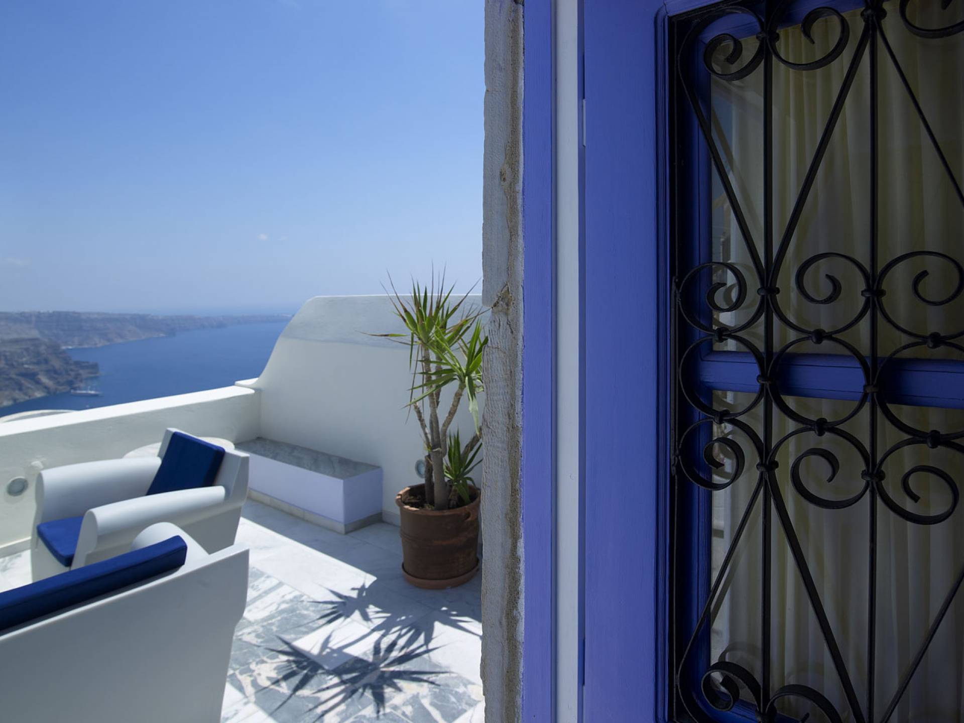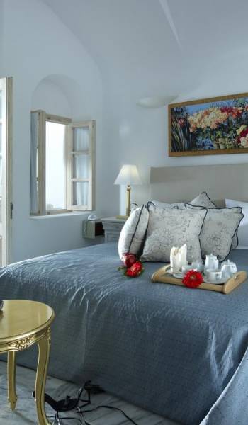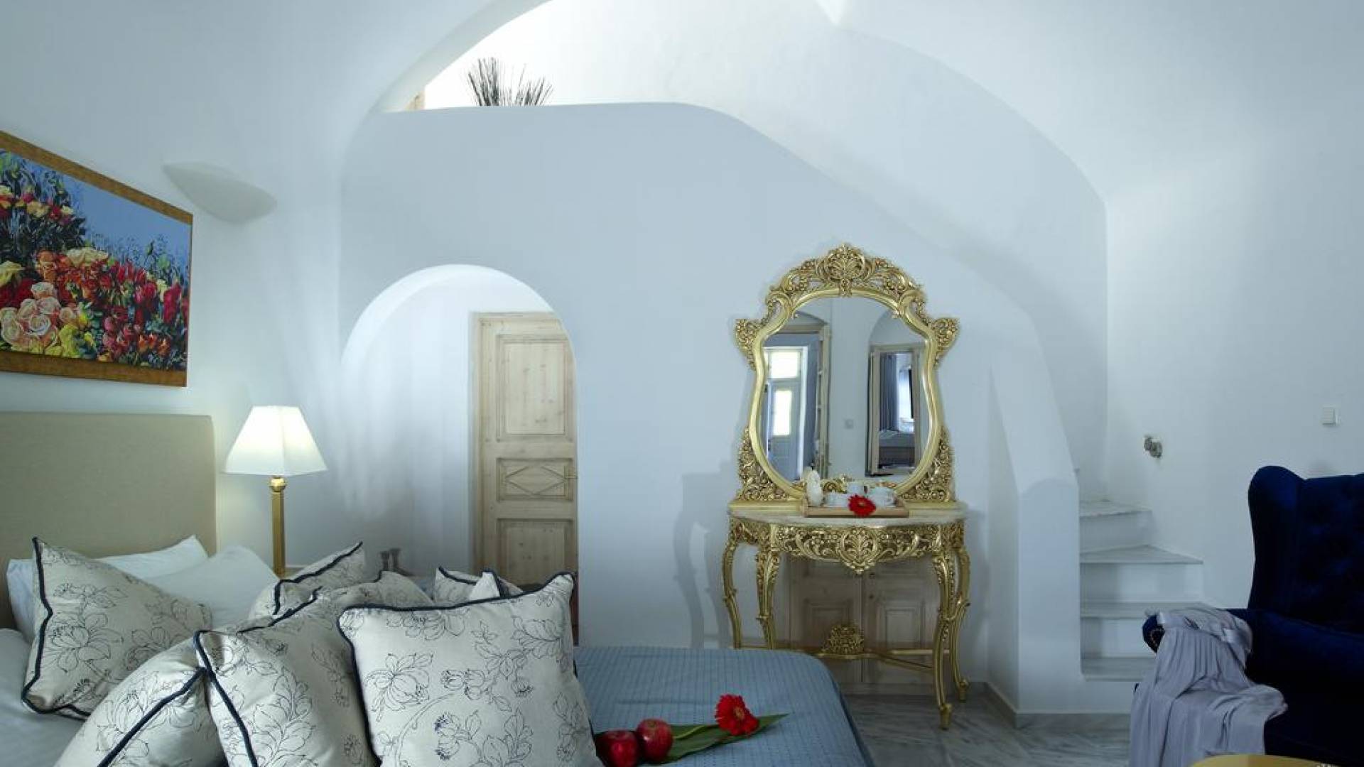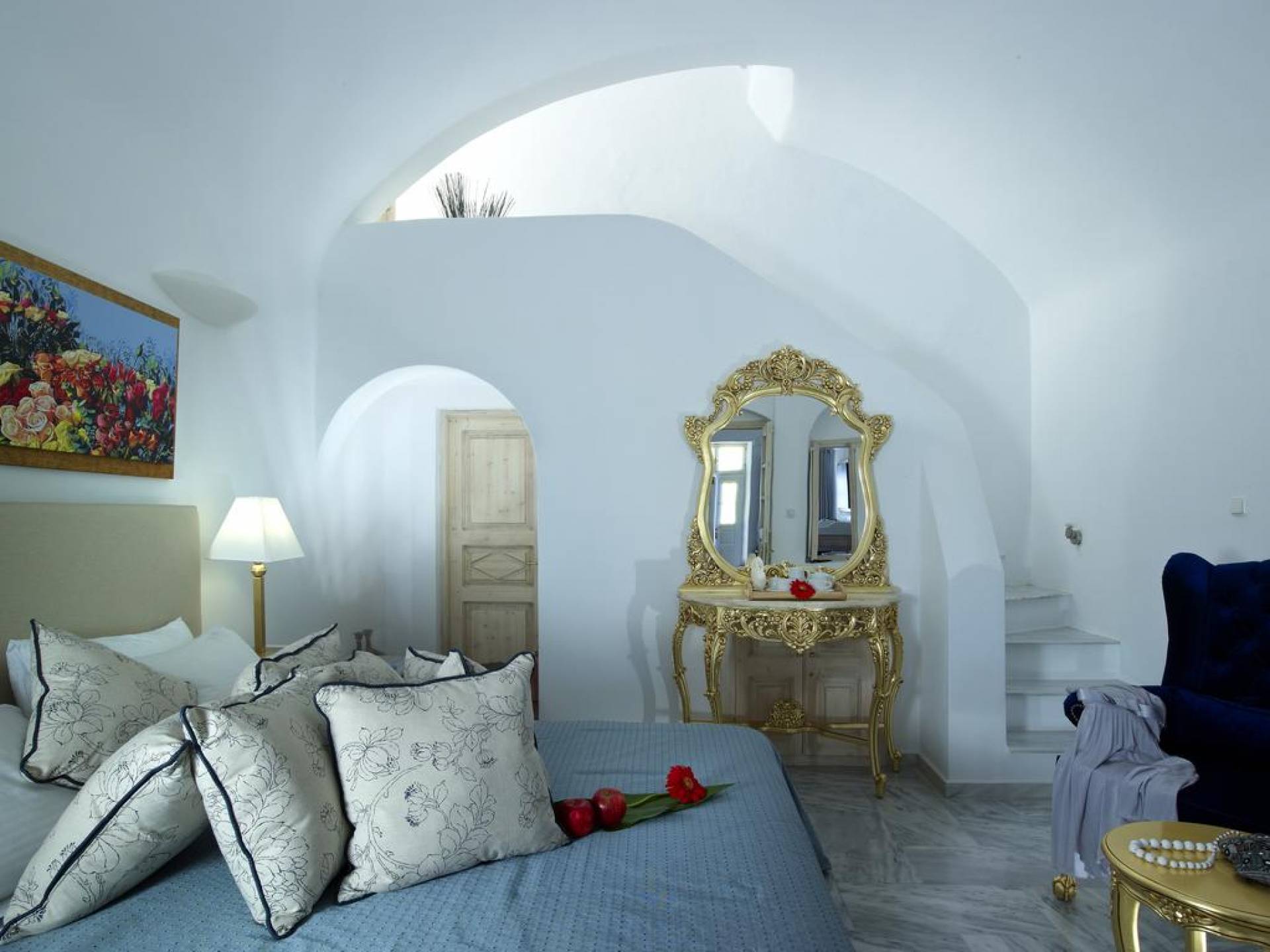 Executive Suite im Kallisto Hotel Santorini: Geräumiges Wohnzimmer, Schlafzimmer mit Queensize-Bett, Schlafsofa, Badezimmer mit Badewanne und private Treppe, die direkt zum Hotelpool führt, private Terrasse mit Blick auf die Caldera.