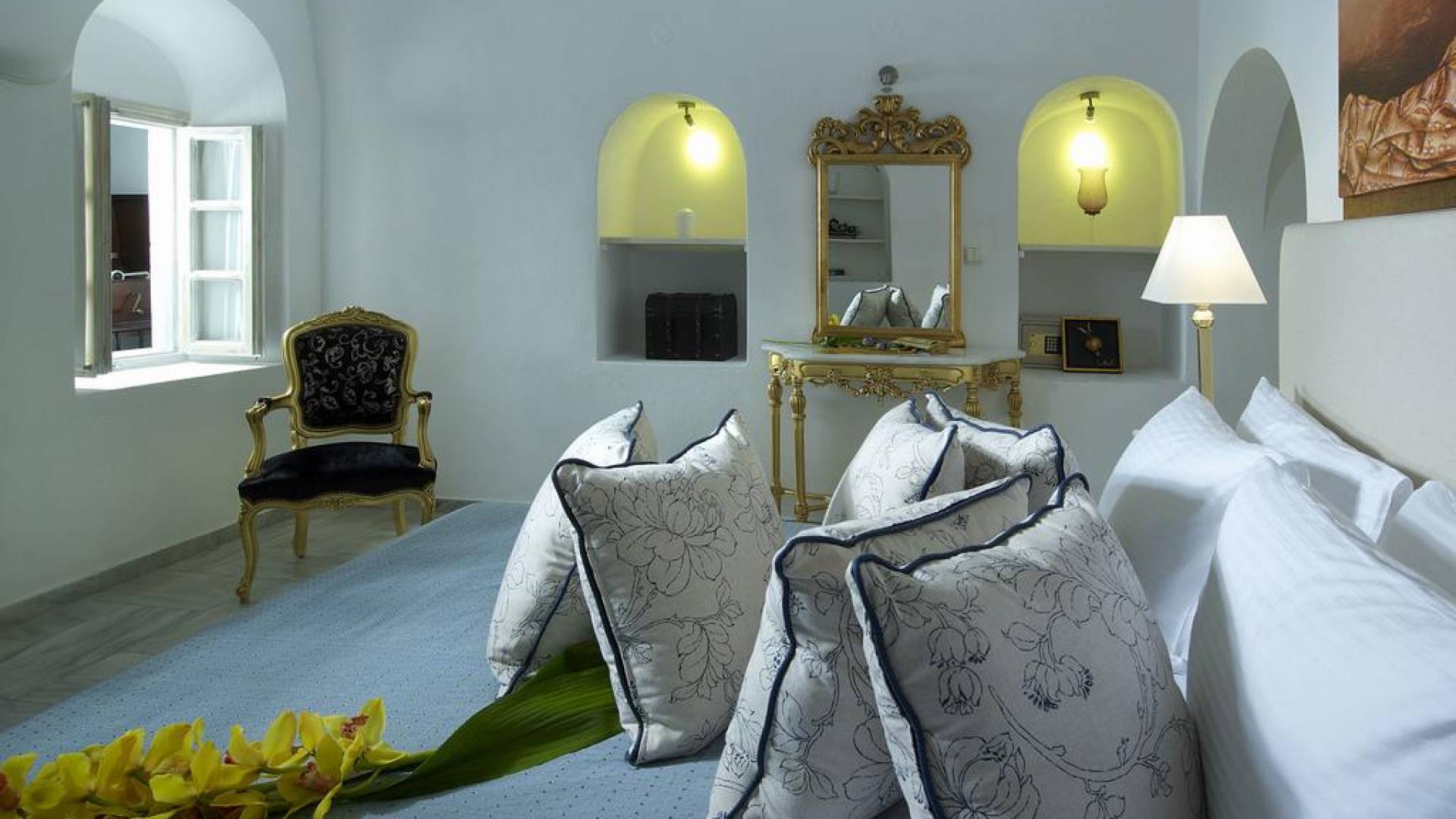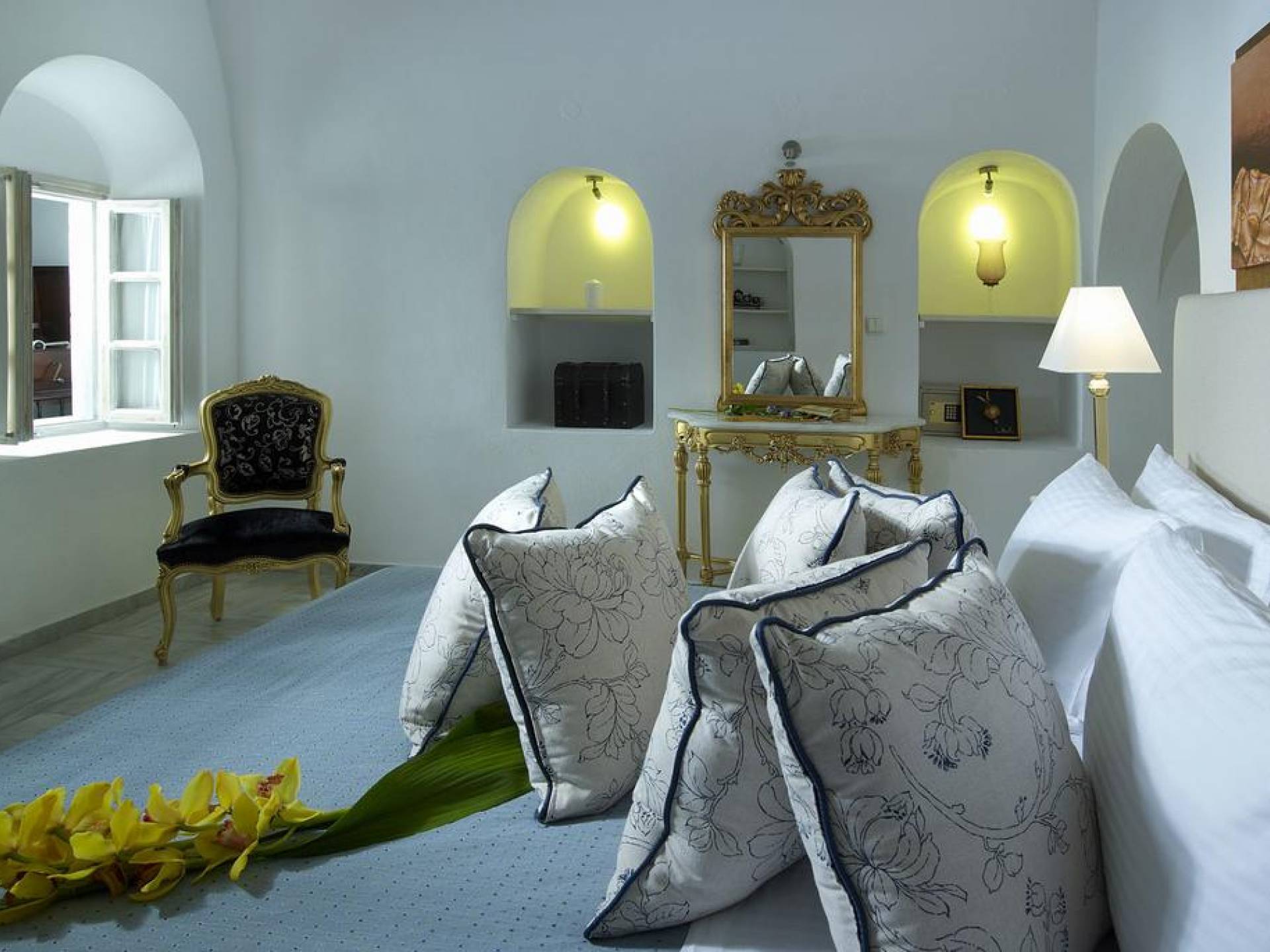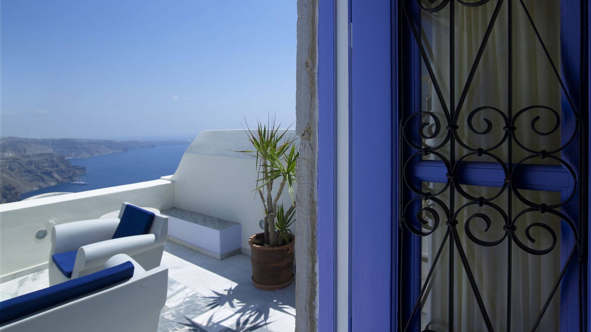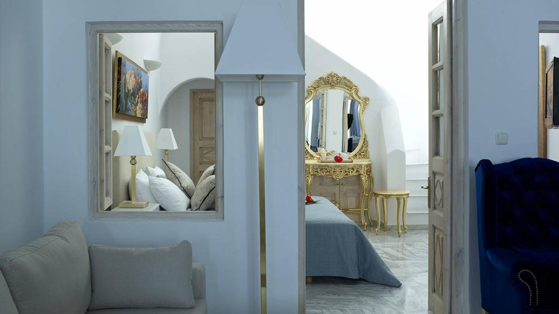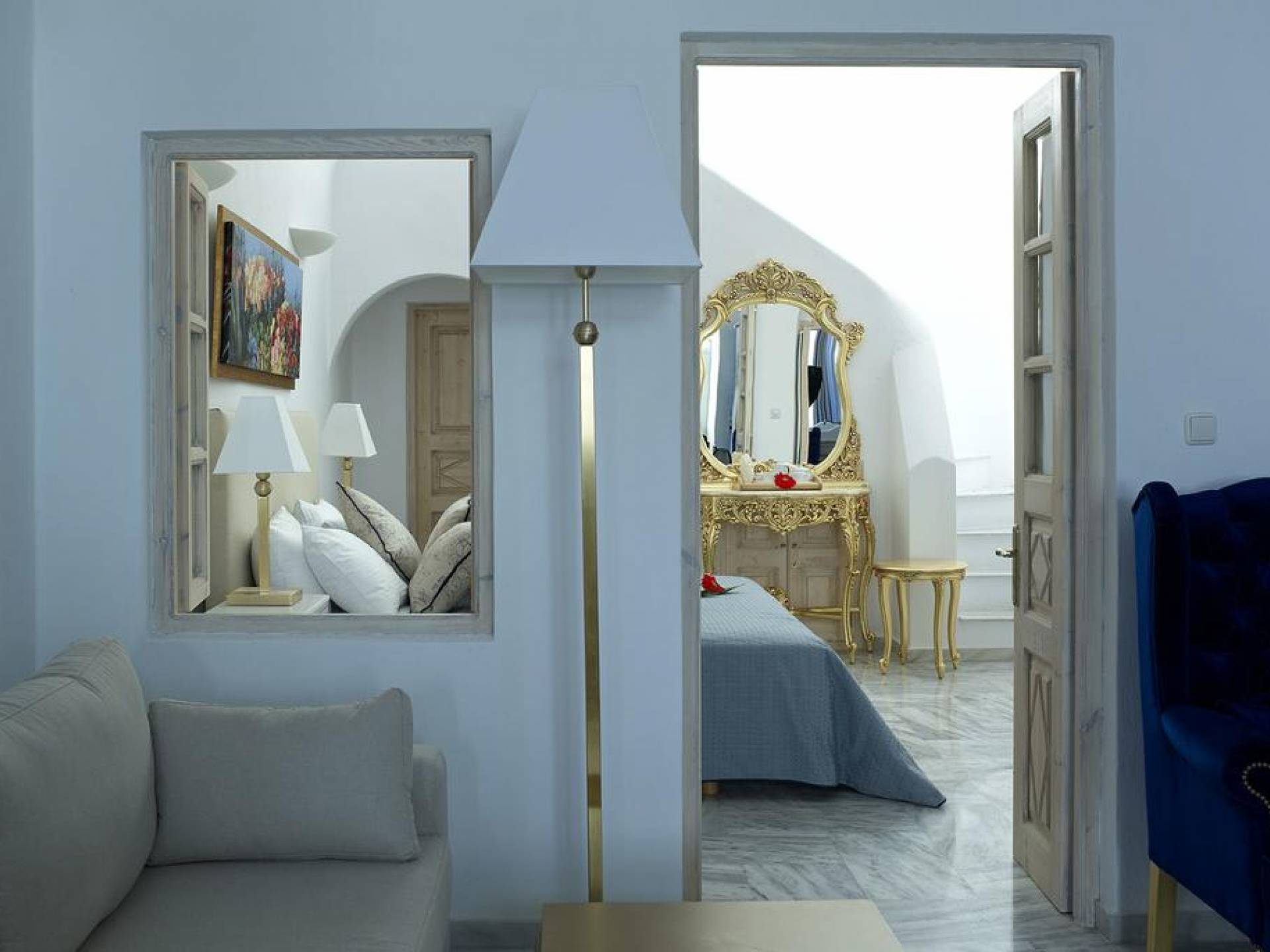 Kallisto Master Suite: Geräumiges Wohnzimmer und großes Schlafzimmer mit Queensize-Bett, Badezimmer mit Badewanne und privater Treppe, die direkt zum Swimmingpool des Hotels führt; private Terrasse mit Blick auf die Caldera.