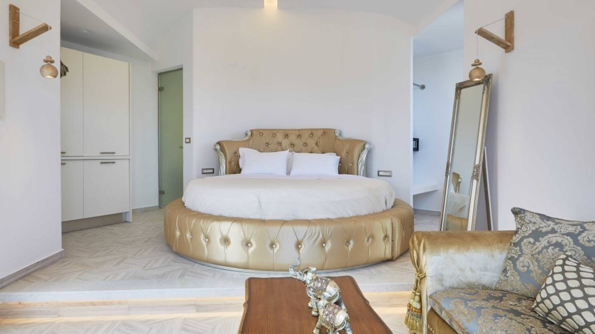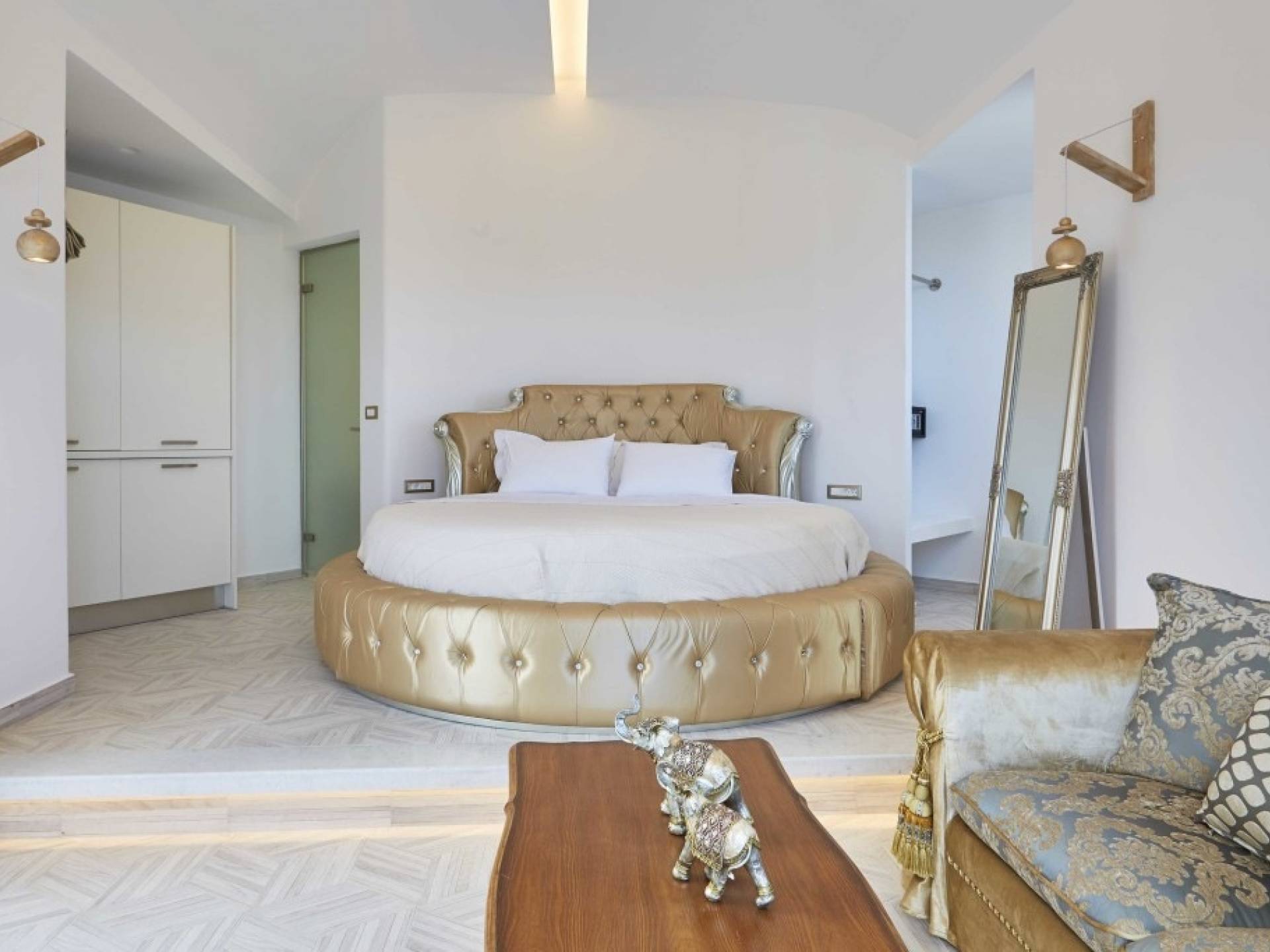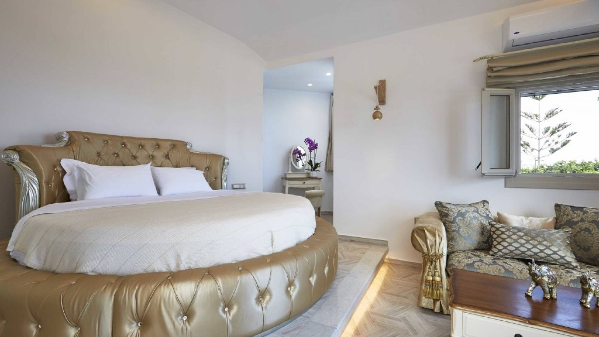 "King's Throne" ist ein hübsches Haus von ca. 38 m². und befindet sich im ersten Stock und bietet einen Panoramablick auf das Meer und den Sonnenaufgang der Kykladen. Das Haus verfügt über einen Einzelzimmer mit Kingsize-Rundbett, ein Wohnzimmer mit Sat-TV, eine kleine Küchenzeile und ein Badezimmer mit Dusche. Es bietet hochwertige Möbel und Einrichtungsgegenstände sowie einen möblierten Balkon mit Whirlpool.