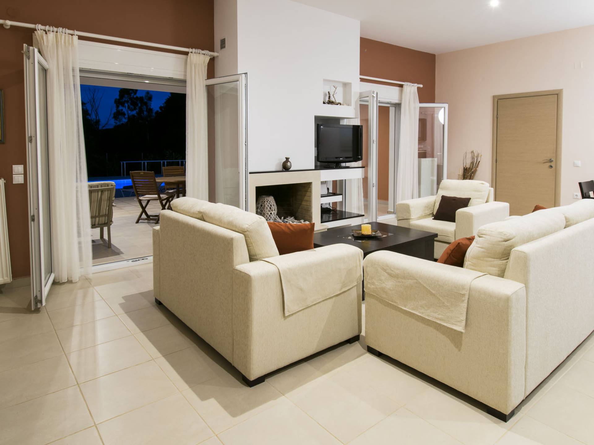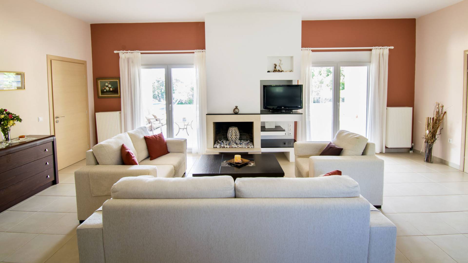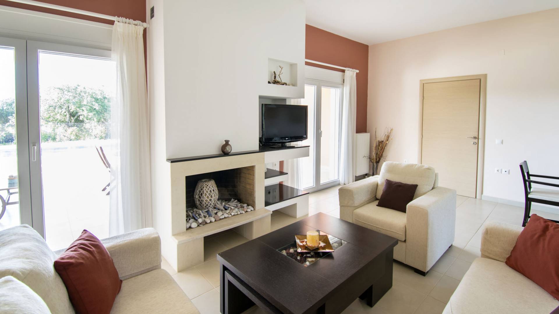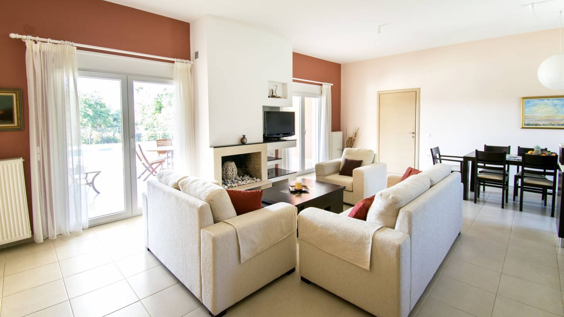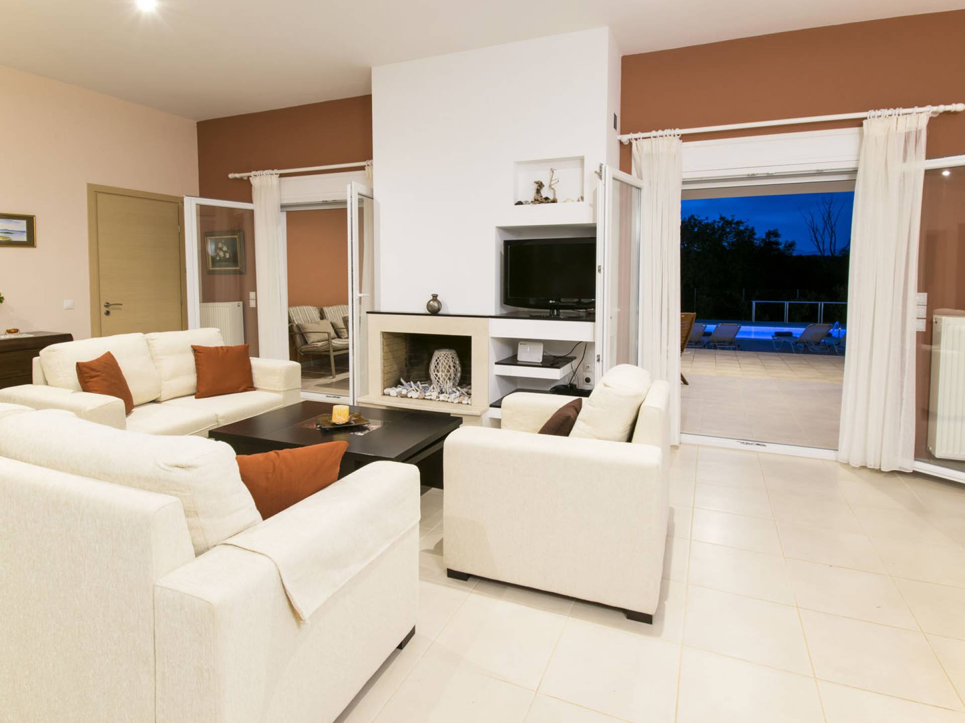Corfu Erimitis Villa bietet Platz für bis zu 9 Gäste, in 2 Doppel-, 2 Zweibettzimmern und 1 Einzelzimmer und das Innere umfasst geräumige Bereiche, ein großes Wohnzimmer mit Kamin, Klimaanlage, 3 Badezimmer, eine voll ausgestattete Küche, Bügeleisen/-brett, Smart-TV mit DVD-Player und drahtloser Internetverbindung.