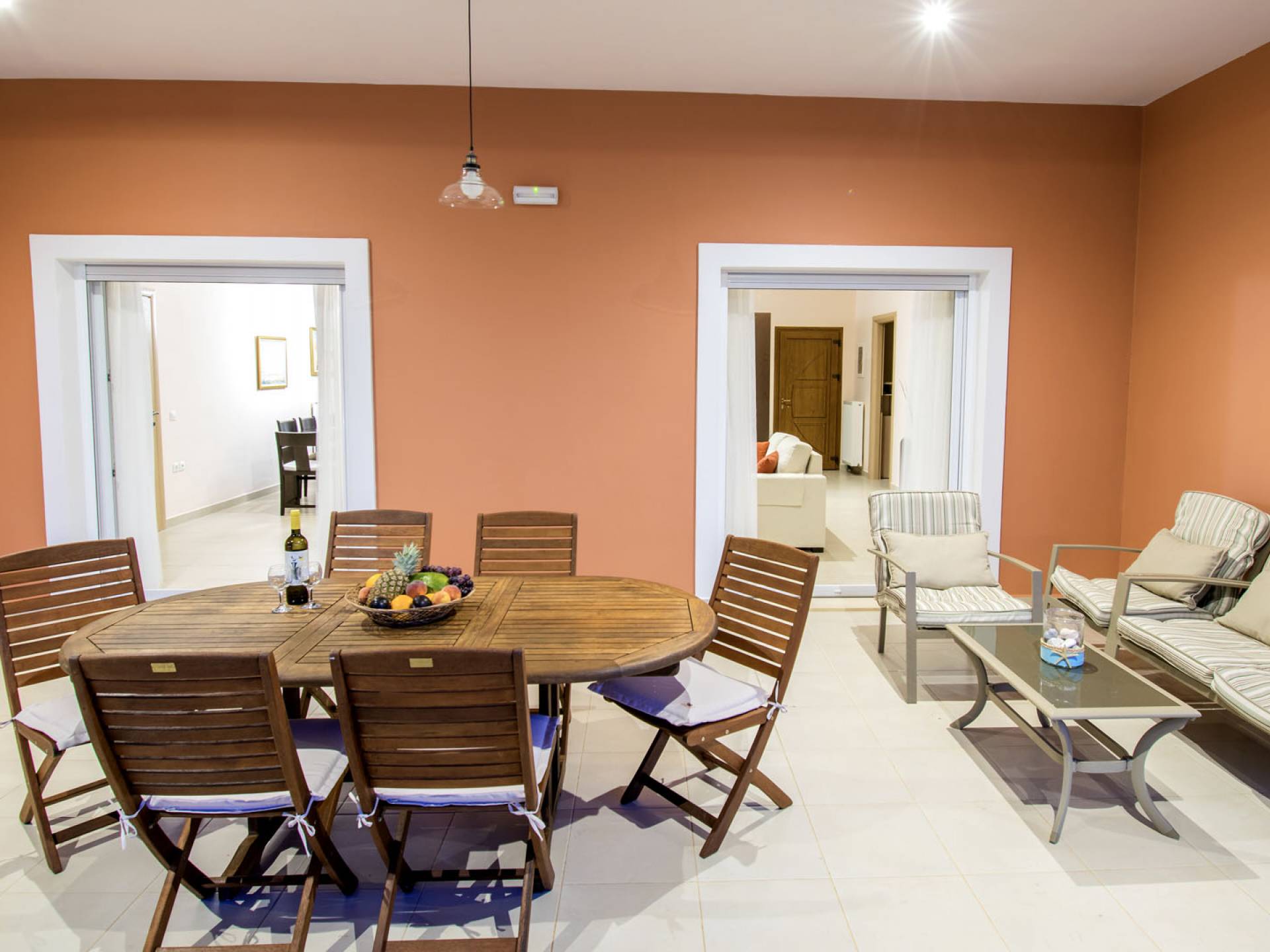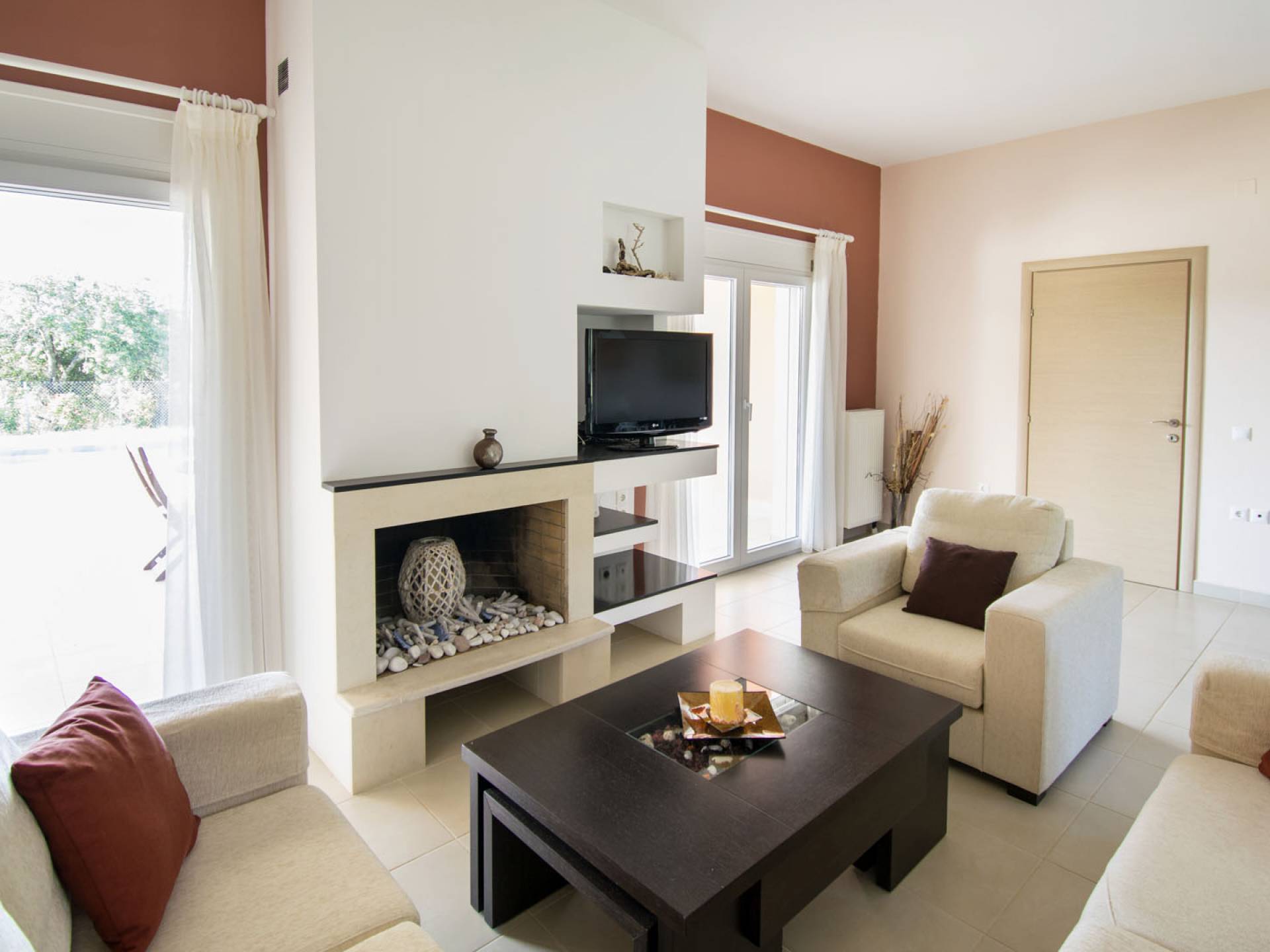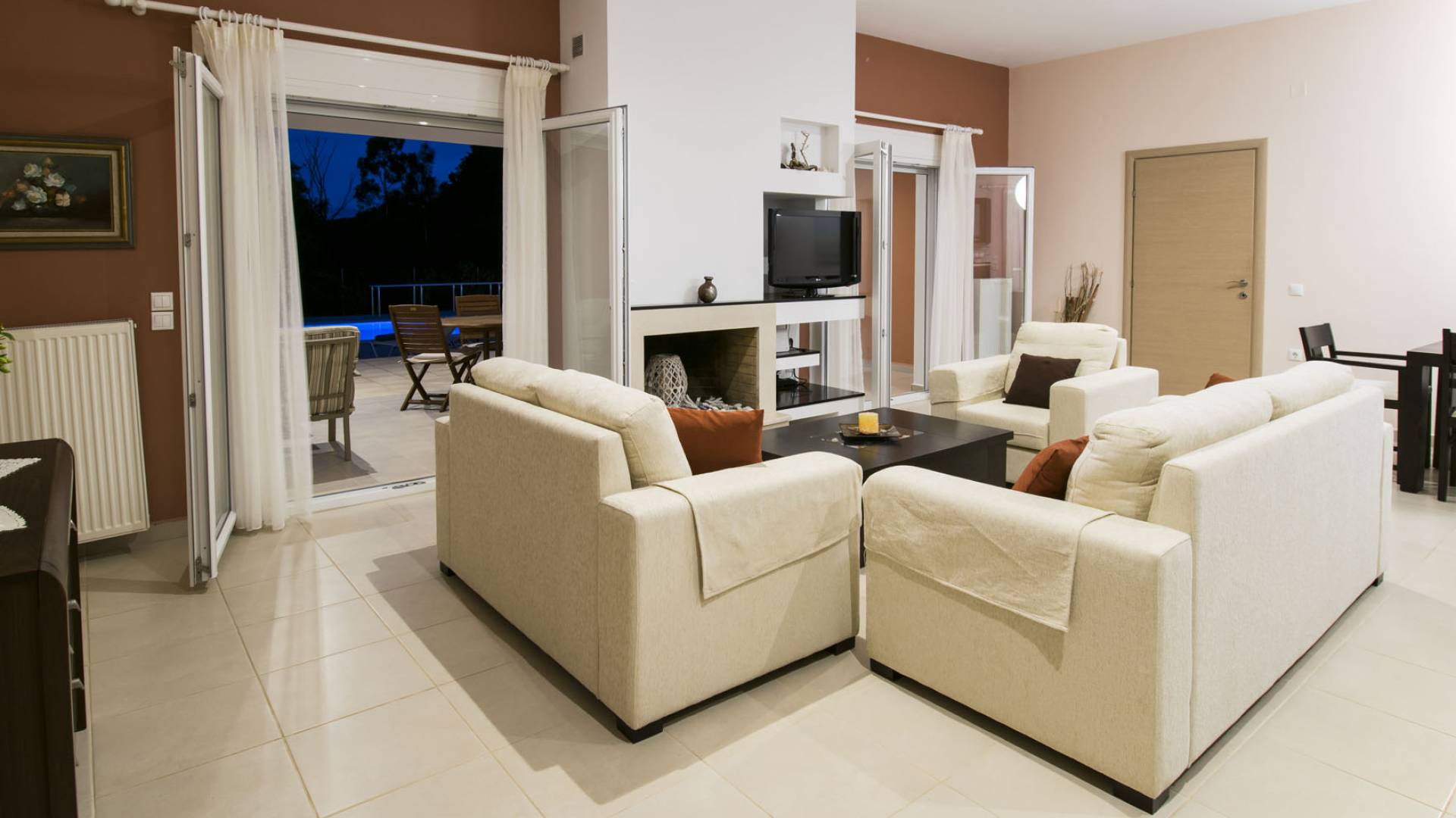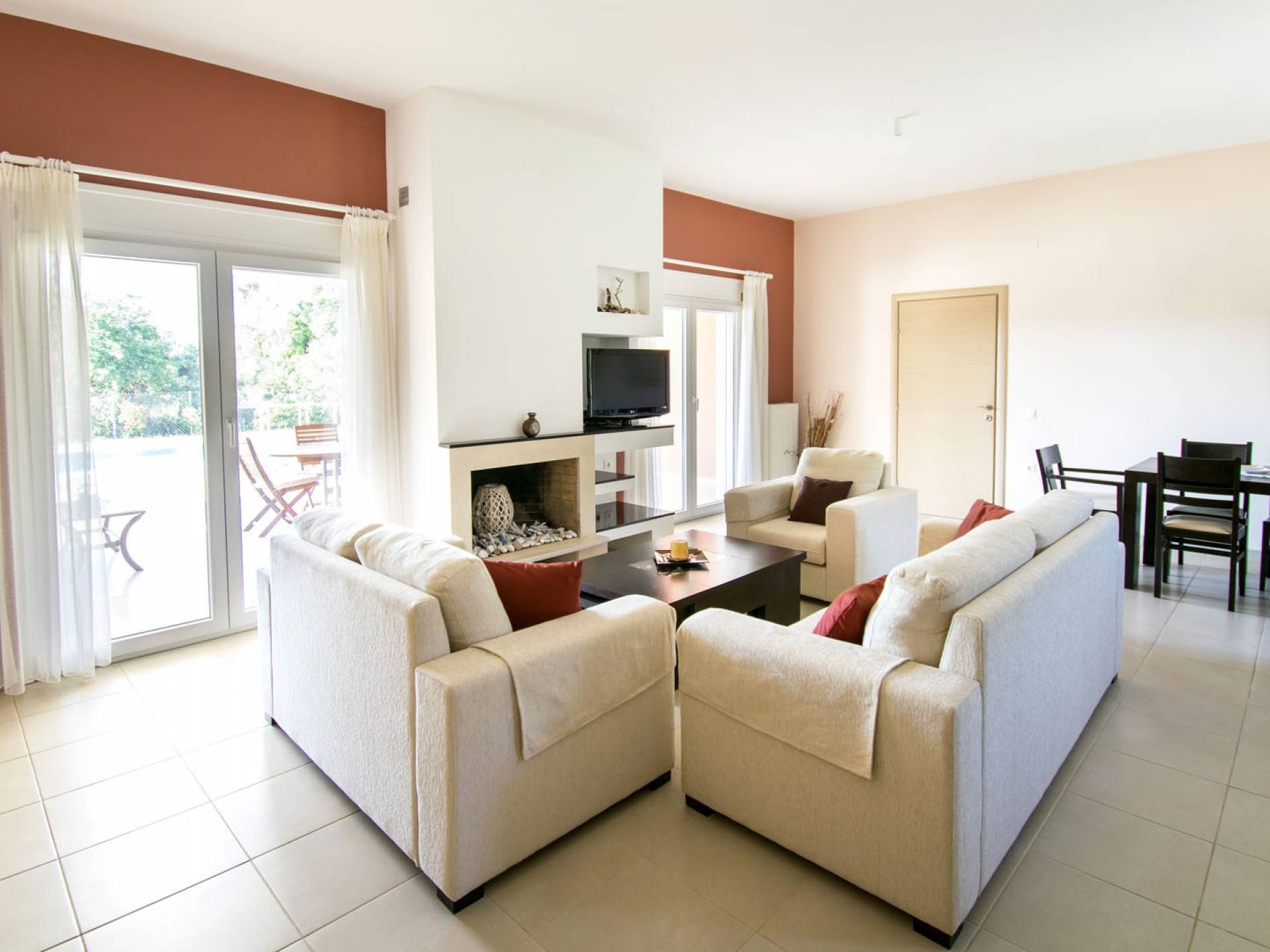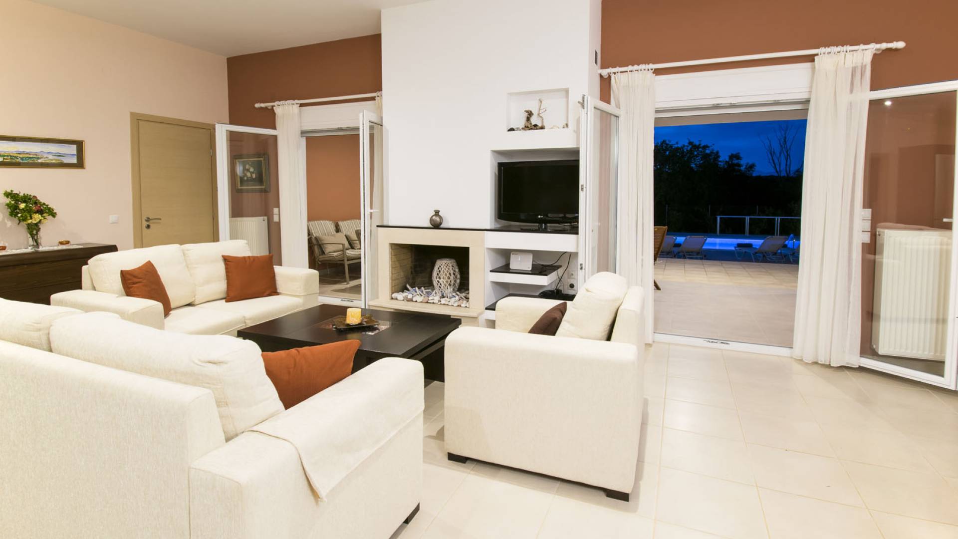 Corfu Erimitis Villa bietet Platz für bis zu 9 Gäste, in 2 Doppel-, 2 Zweibettzimmern und 1 Einzelzimmer und das Innere umfasst geräumige Bereiche, ein großes Wohnzimmer mit Kamin, Klimaanlage, 3 Badezimmer, eine voll ausgestattete Küche, Bügeleisen/-brett, Smart-TV mit DVD-Player und drahtloser Internetverbindung.