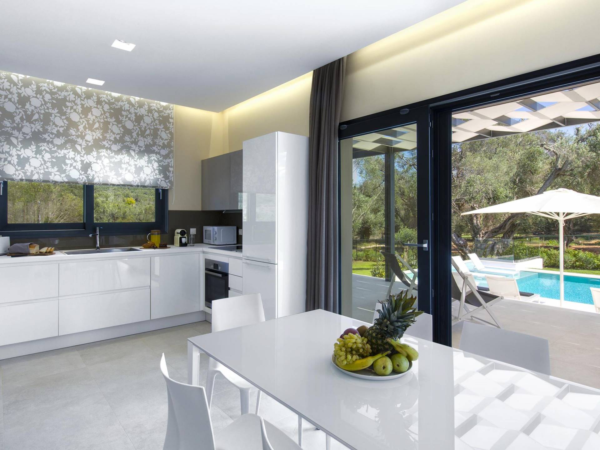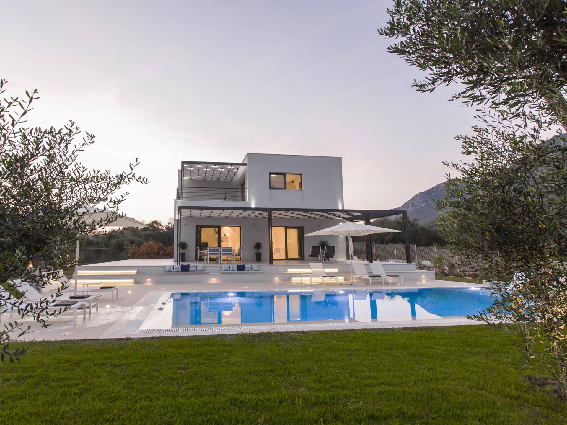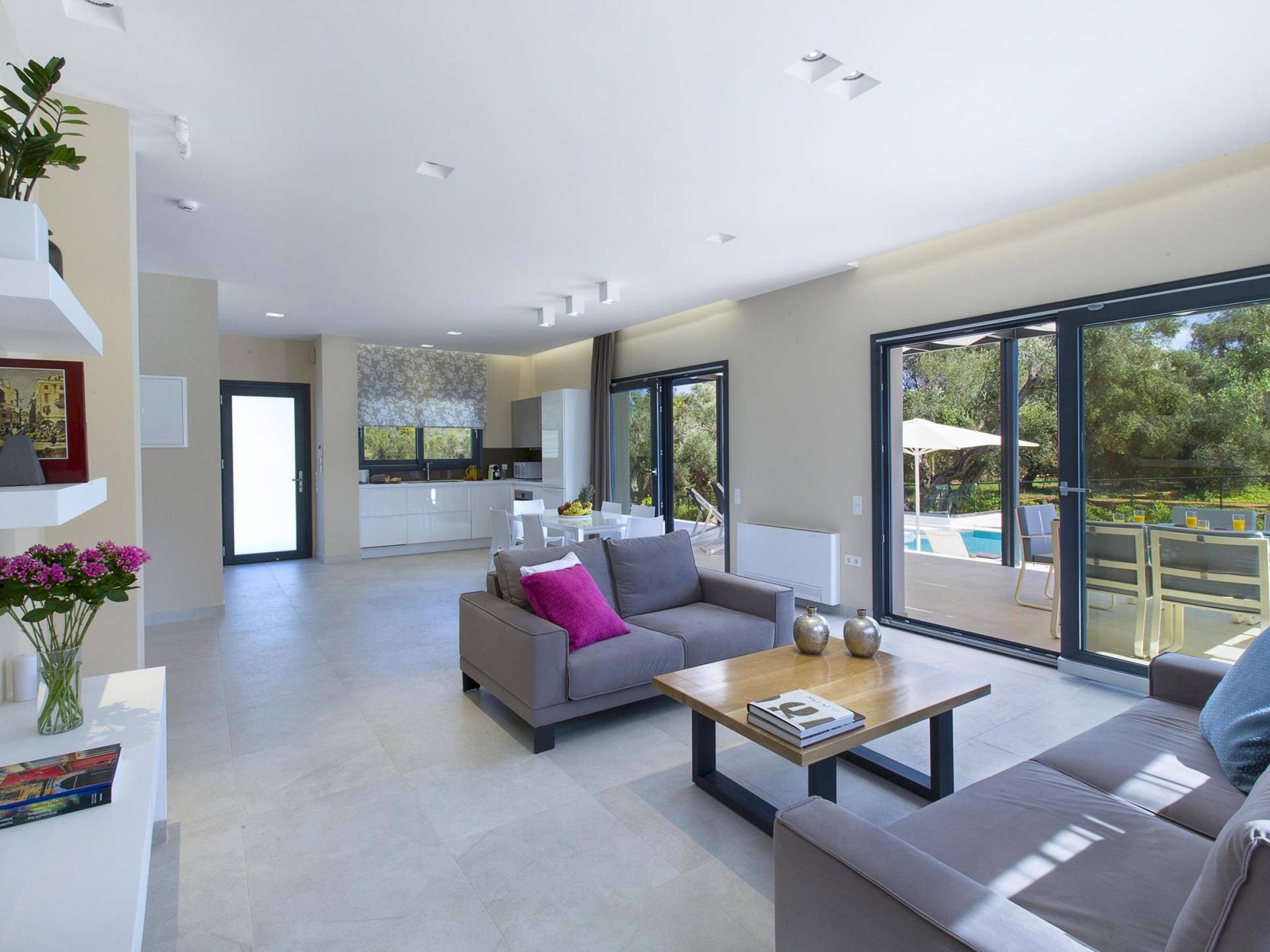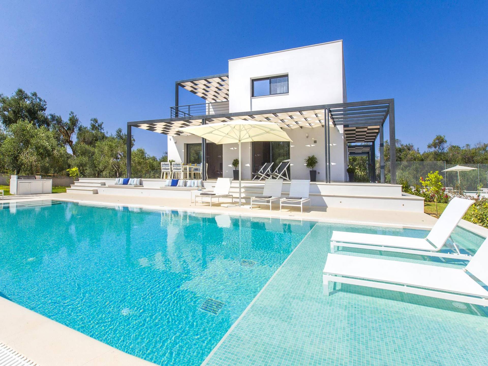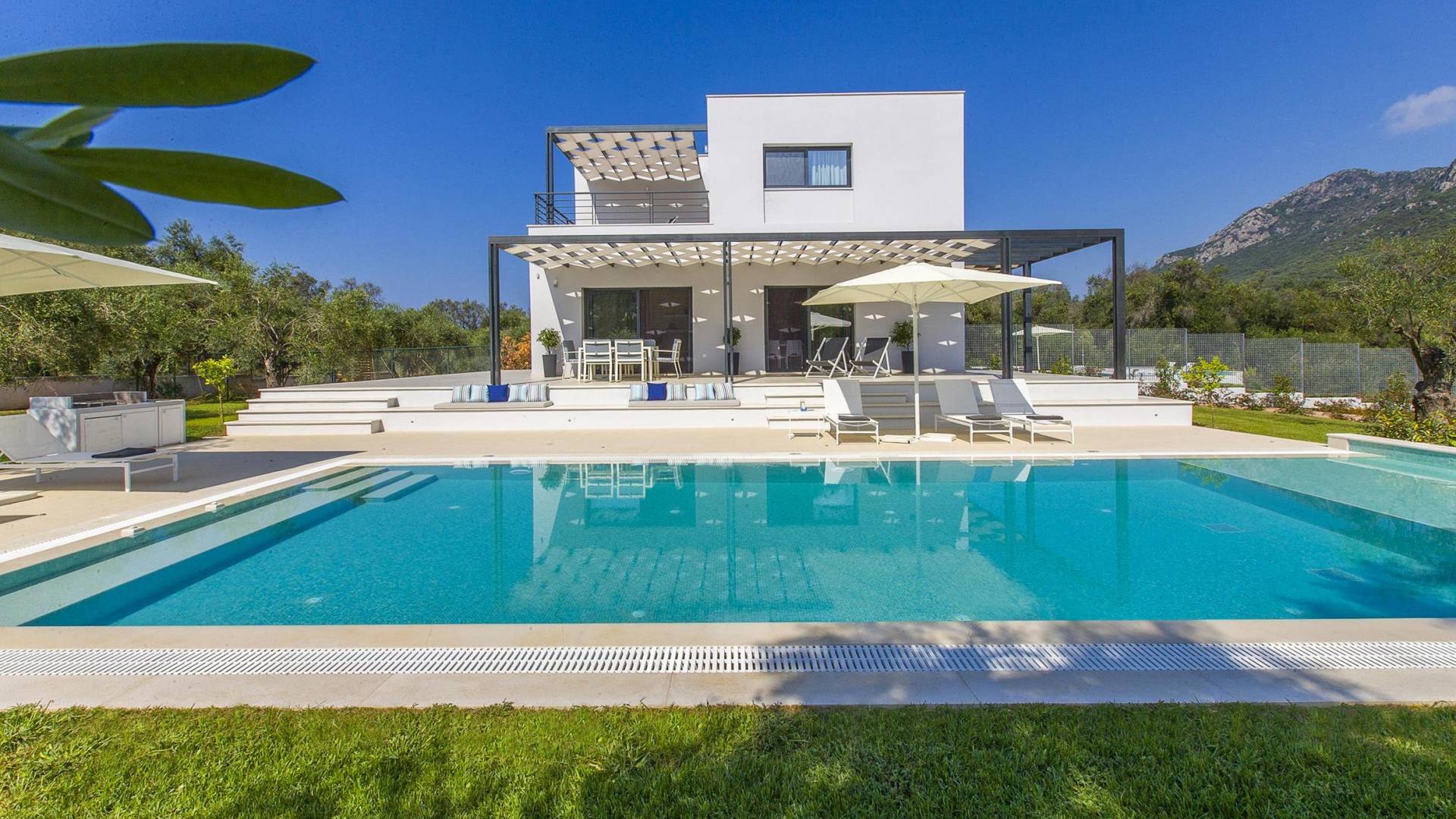 Dieses wunderschön eingerichtete Ferienhaus mit drei Schlafzimmern setzt mit klarer Architektur und moderner Einrichtung einen stilvollen Akzent. Der elegante Stil bietet ein ruhiges Ambiente für jeden Familienurlaub oder Gruppenurlaub. Das Wohnzimmer und die Küche öffnen sich zur geräumigen Veranda mit Zugang zu den Essbereichen im Freien. Von dort aus können Sie ganz einfach ein Bad in Ihrem privaten Swimmingpool nehmen, während Sie sich in einen Zen-Modus versetzen und das schöne korfiotische Klima in vollen Zügen genießen.