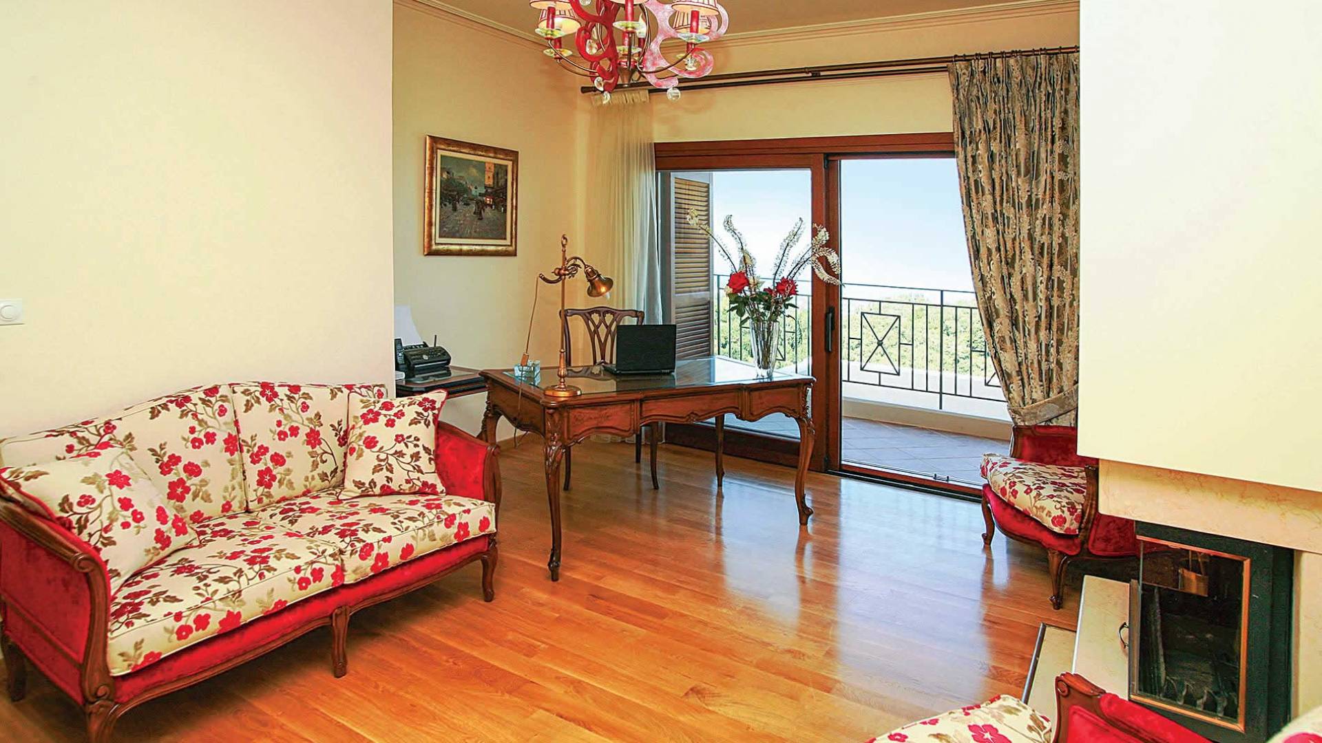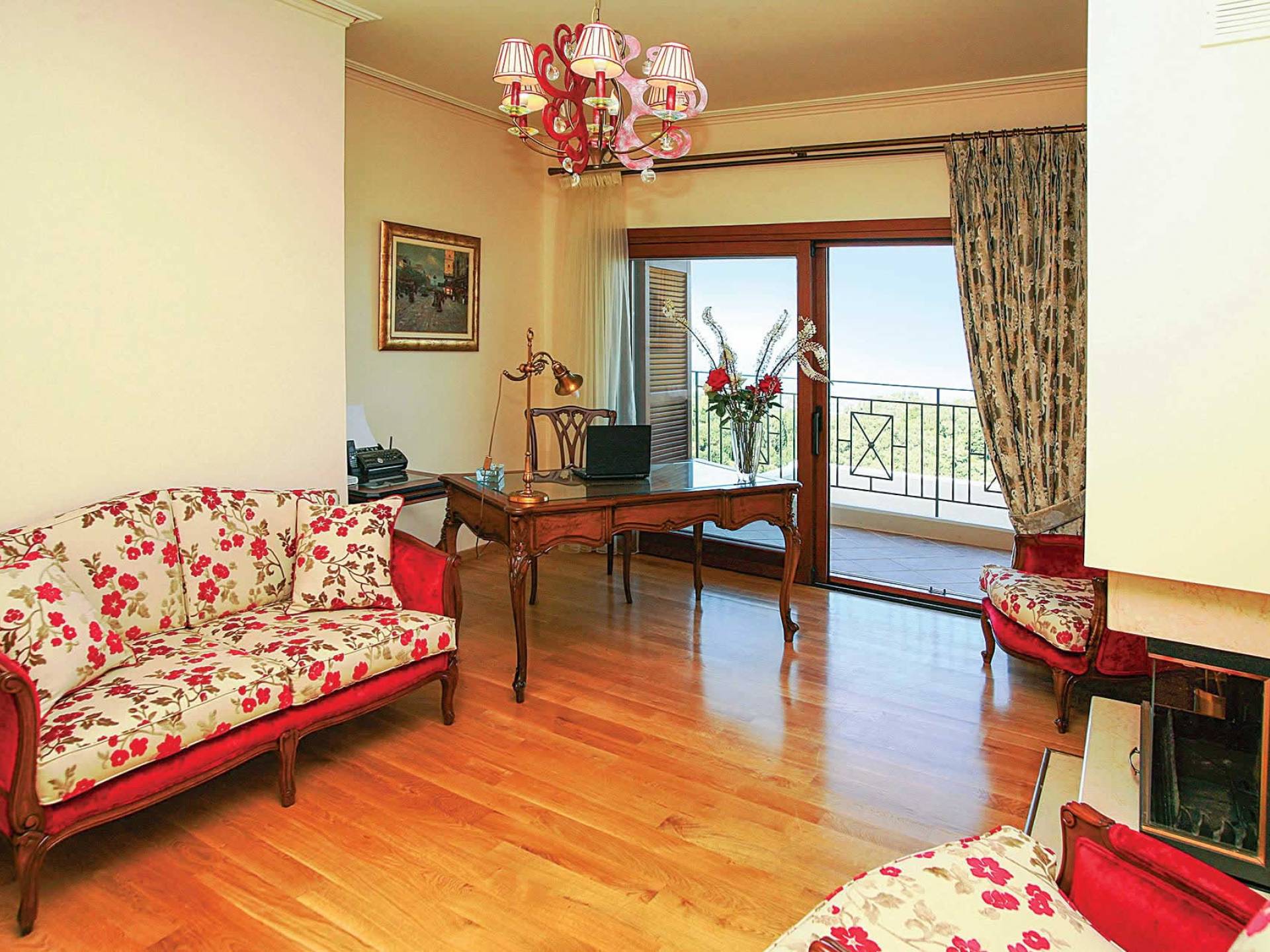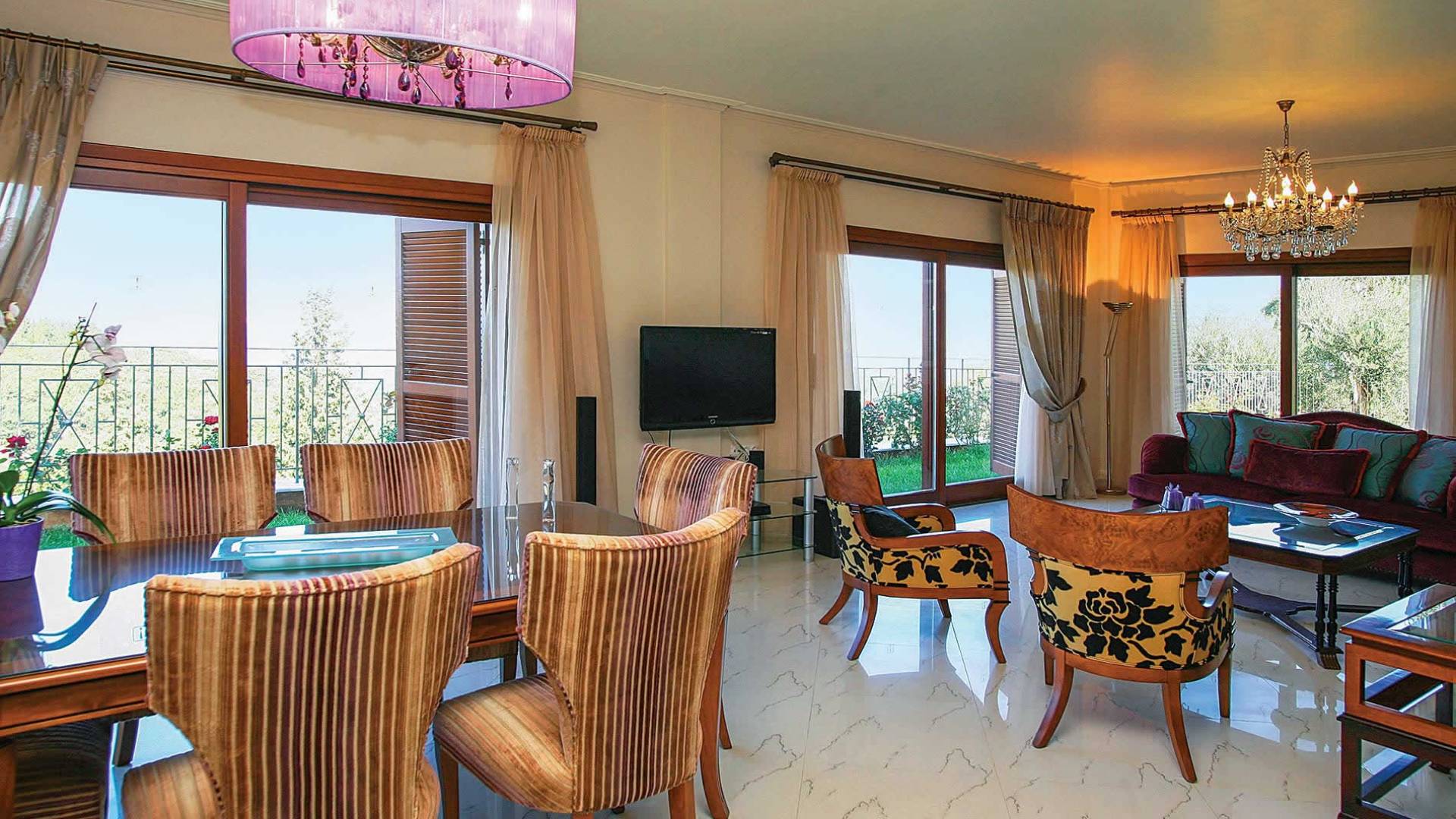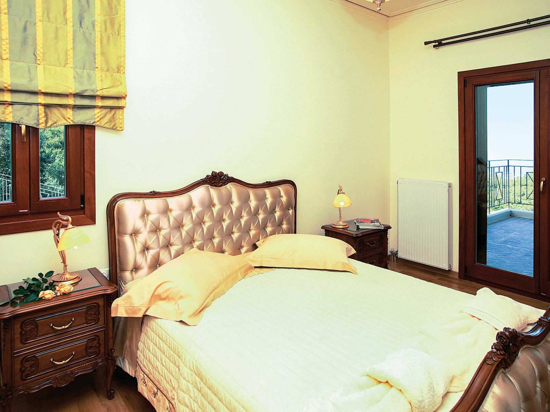Im Erdgeschoss befindet sich ein geräumiges offenes Wohnzimmer mit Flachbild-Sat-TV, iPod-Dockingstation, Soundsystem und Kamin, eine Küche, ein Essbereich und Türen zur Terrasse mit Meerblick und über den Korfu-Kanal. Es gibt auch zwei Doppelschlafzimmer mit Terrassentüren zur Terrasse, jedes Schlafzimmer hat ein eigenes Badezimmer. Im ersten Stock gibt es einen offenen Studienbereich mit Zugang zum Aufzug, Sofa und Stühlen, Schreibtisch, Bibliothek und Kamin sowie Türen zur Terrasse. Zwei Kingsize-Doppelzimmer mit Jacuzzi und ein Zweibettzimmer.