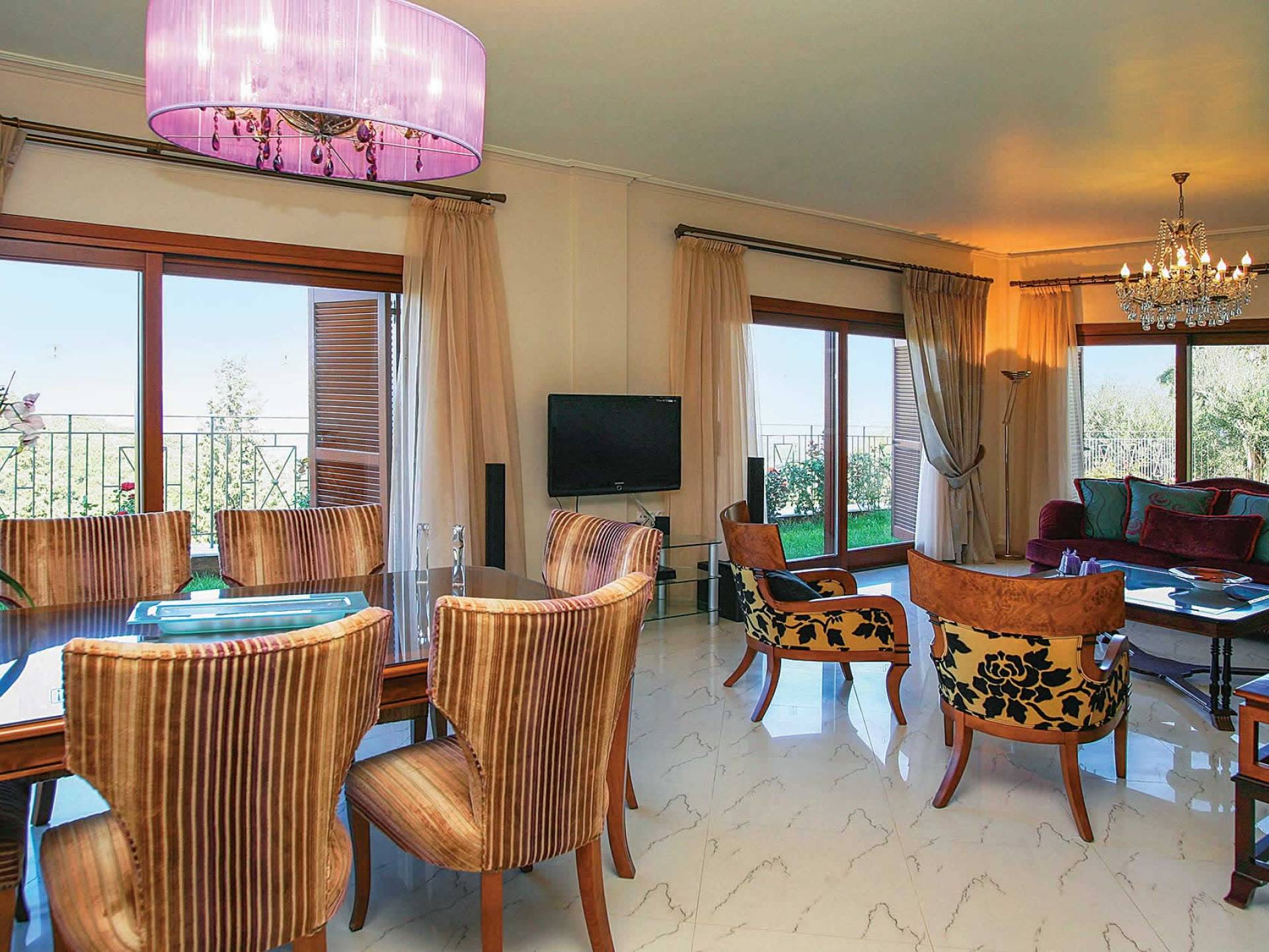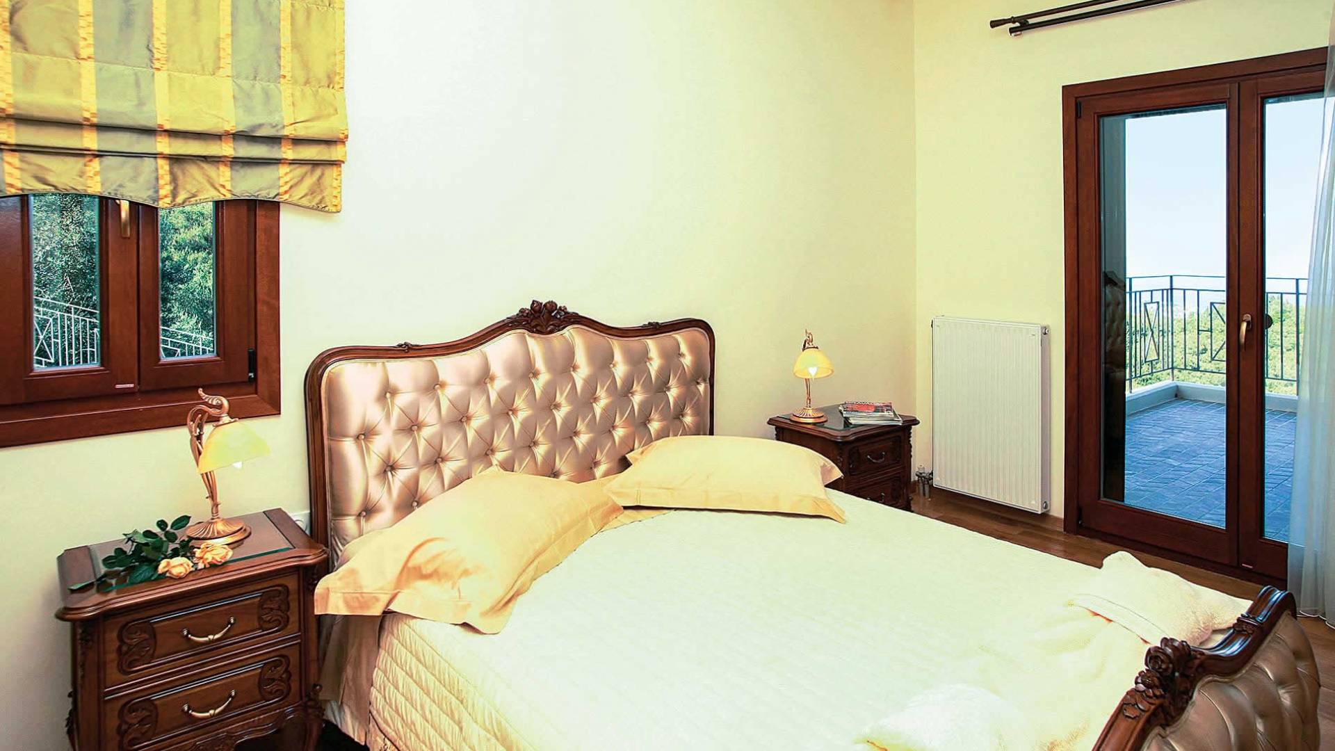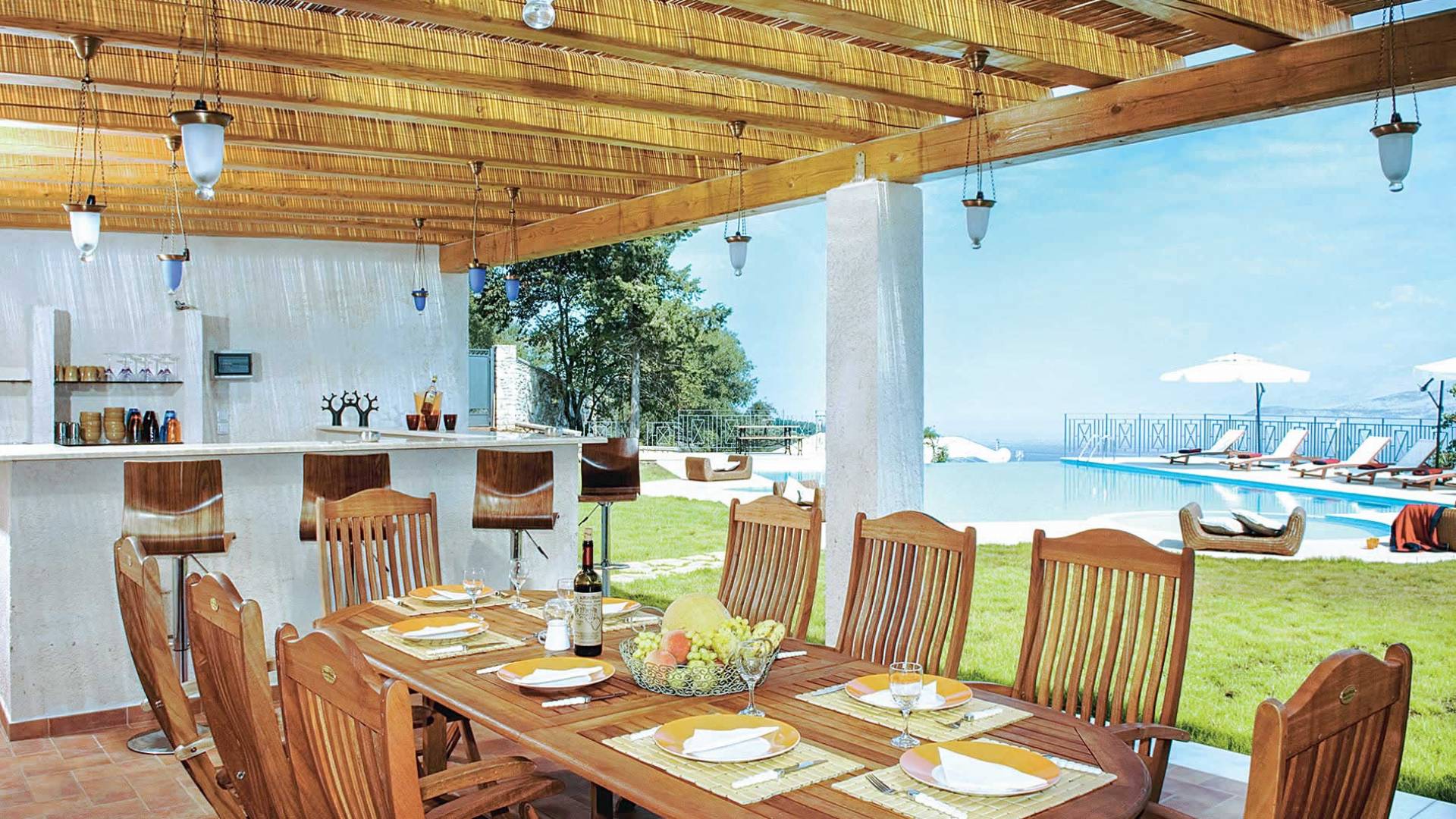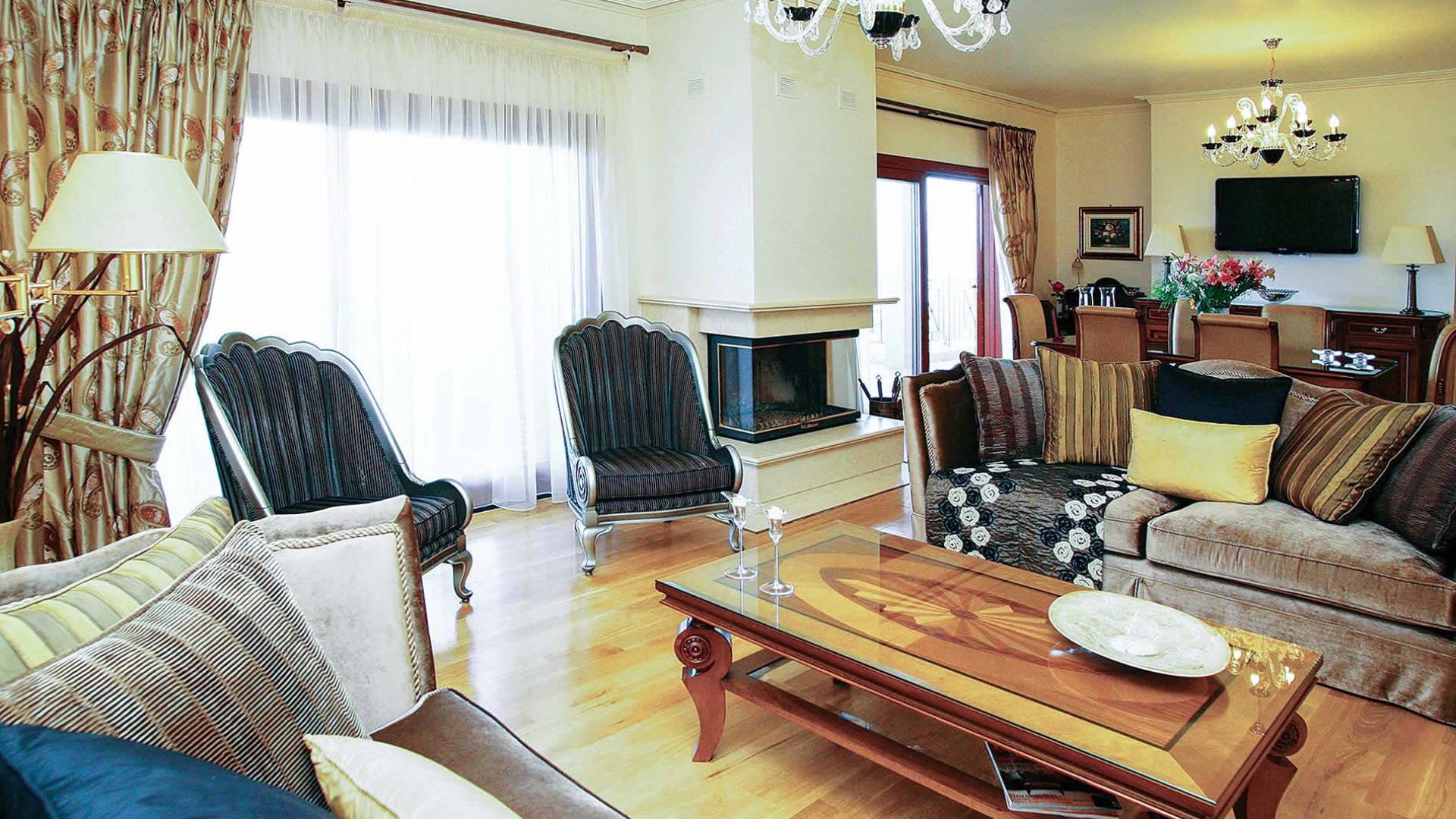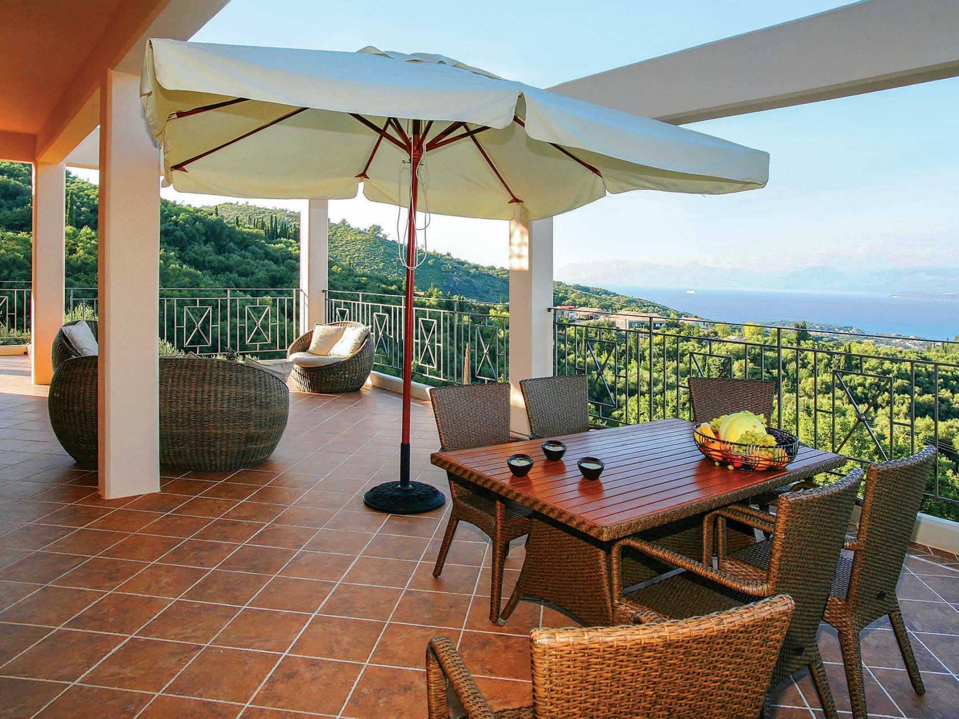Im Erdgeschoss befindet sich ein geräumiges offenes Wohnzimmer mit Flachbild-Sat-TV, iPod-Dockingstation, Soundsystem und Kamin, eine Küche, ein Essbereich und Türen zur Terrasse mit Meerblick und über den Korfu-Kanal. Es gibt auch zwei Doppelschlafzimmer mit Terrassentüren zur Terrasse, jedes Schlafzimmer hat ein eigenes Badezimmer. Im ersten Stock gibt es einen offenen Studienbereich mit Zugang zum Aufzug, Sofa und Stühlen, Schreibtisch, Bibliothek und Kamin sowie Türen zur Terrasse. Zwei Kingsize-Doppelzimmer mit Jacuzzi und ein Zweibettzimmer.