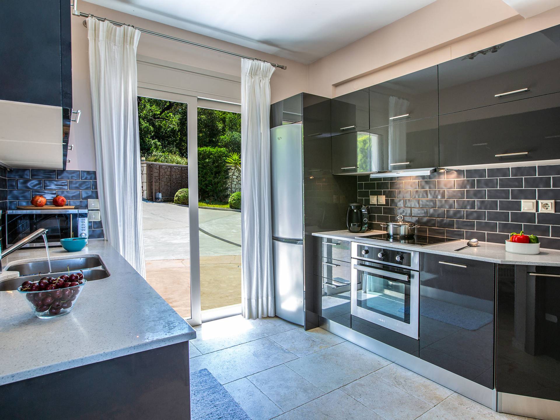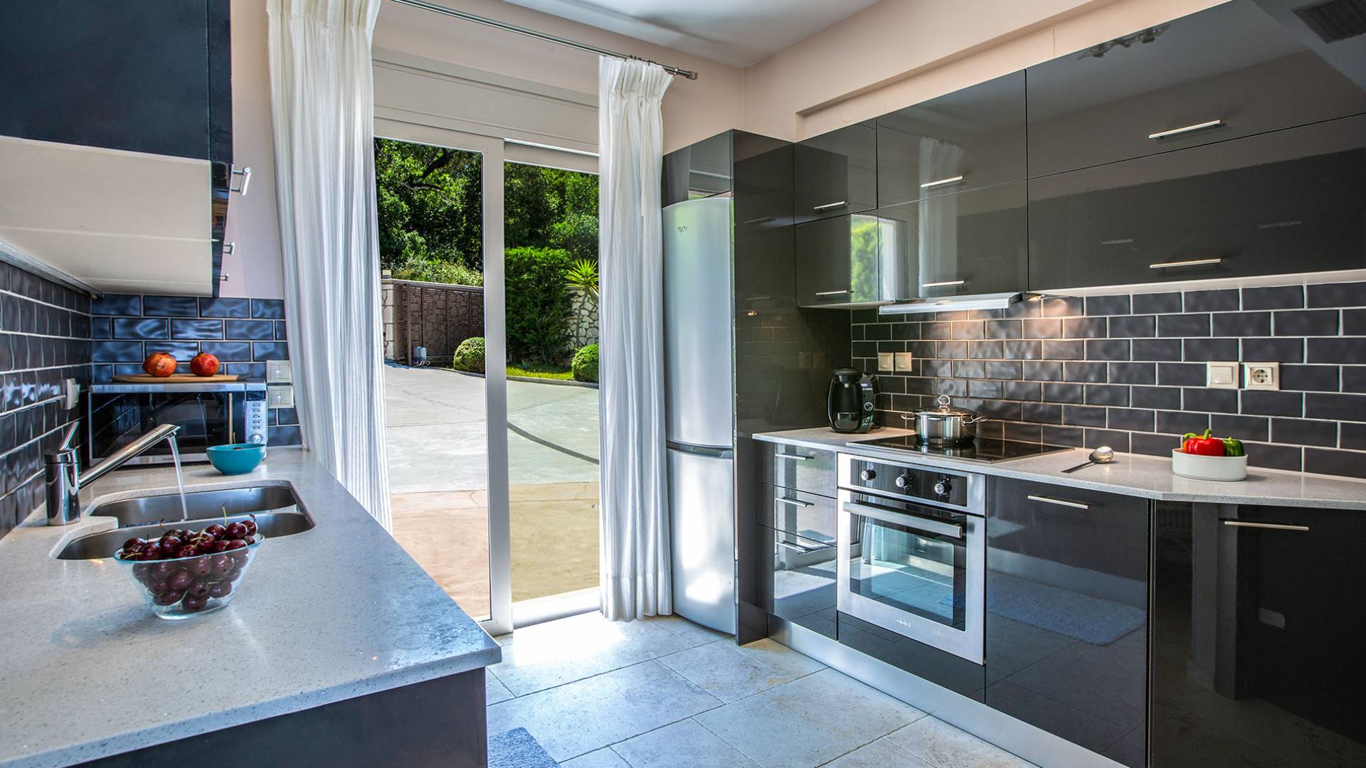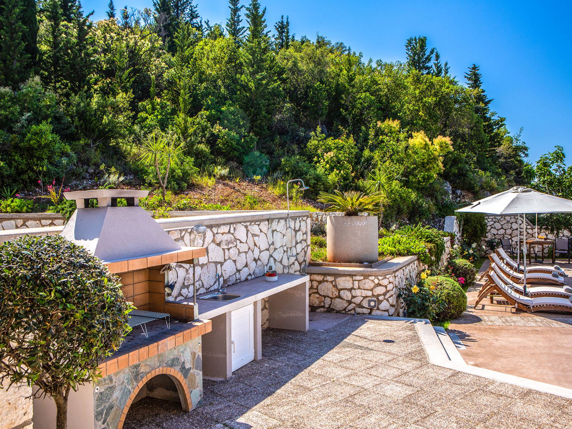 Die Ebene des gesamten Bereichs umfasst das Wohnzimmer mit einem Sofa, das in ein Bett umgewandelt werden kann, dem Fernseher, dem Kamin und der großen Schiebetür mit der atemberaubenden Aussicht, dem Esszimmer, der voll ausgestatteten Küche und das kleine Bad mit Dusche. Durch die große Tür des Wohnzimmers oder der Küche oder des Eingangsbereichs haben Sie Zugang zum Garten mit der atemberaubenden Aussicht, dem Überlaufpool, dem Whirlpool und dem Außenbereich, der mit Rasen und anderen Pflanzen bedeckt ist. Der Bereich um den Swimmingpool bietet Liegestühle und Sonnenschirme sowie eine Außendusche und eine Pergola mit Esstisch und Grill.