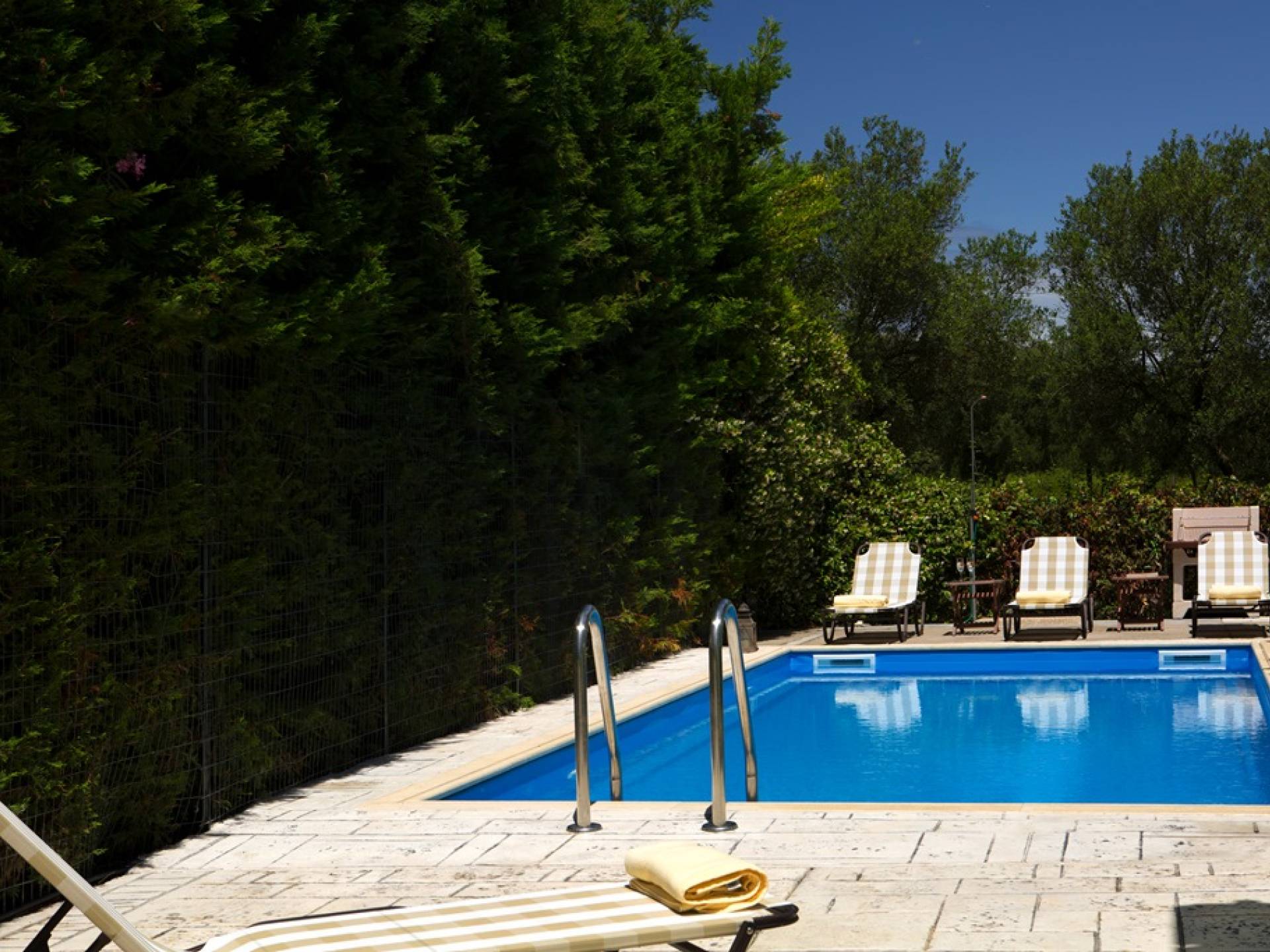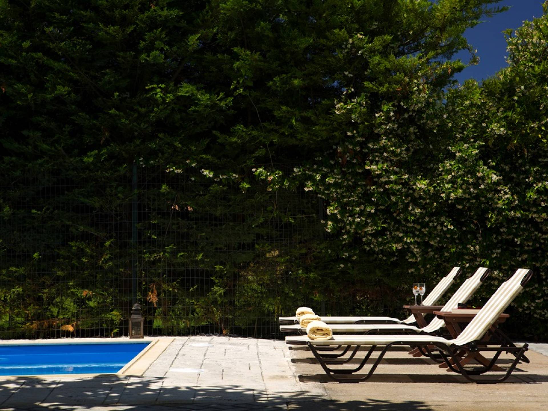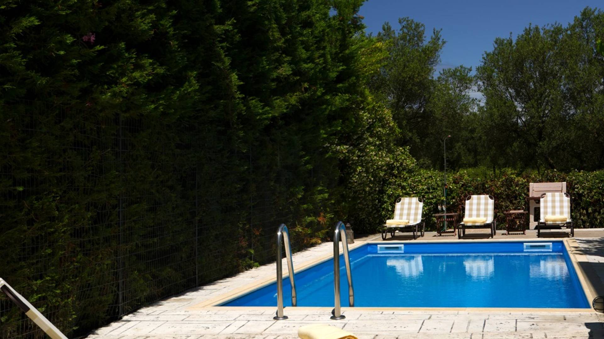 Jedes Schlafzimmer verfügt über einen großen Kleiderschrank, einen LED-Fernseher und eine Klimaanlage. Wie jedes Zimmer in der Villa wurde es neu eingerichtet, um Komfort und Stil zu bieten. Im Freien können die Gäste entspannende Momente auf der großen Veranda des Erdgeschosses an ihrem privaten Swimmingpool genießen, der mit bequemen Möbeln und entspannenden Liegestühlen ausgestattet ist. Oder sie können alleine oder mit Gästen Spaß haben und auf ihrem privaten Grill kochen, alles in einer ruhigen und besonders gastfreundlichen Umgebung.