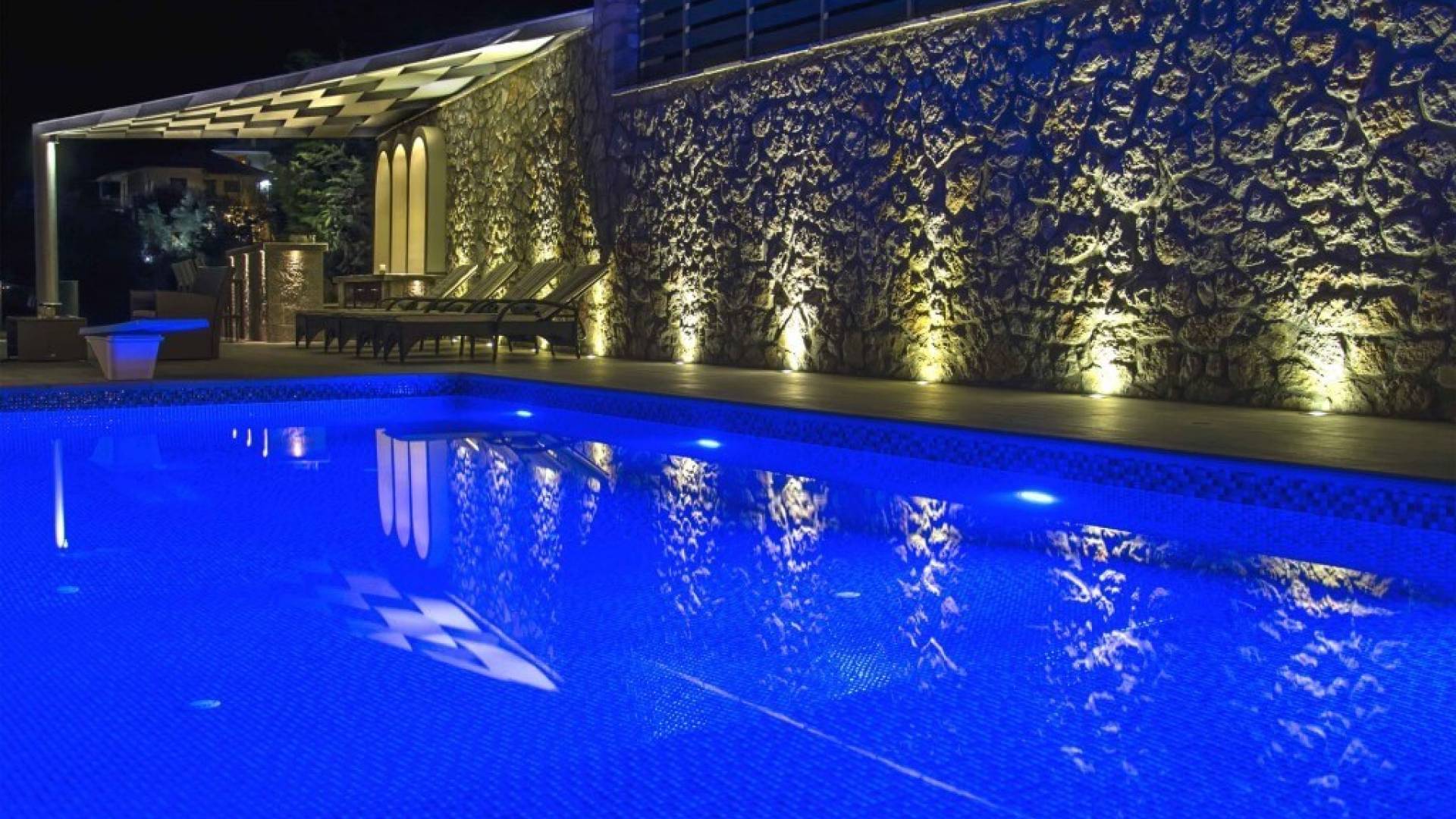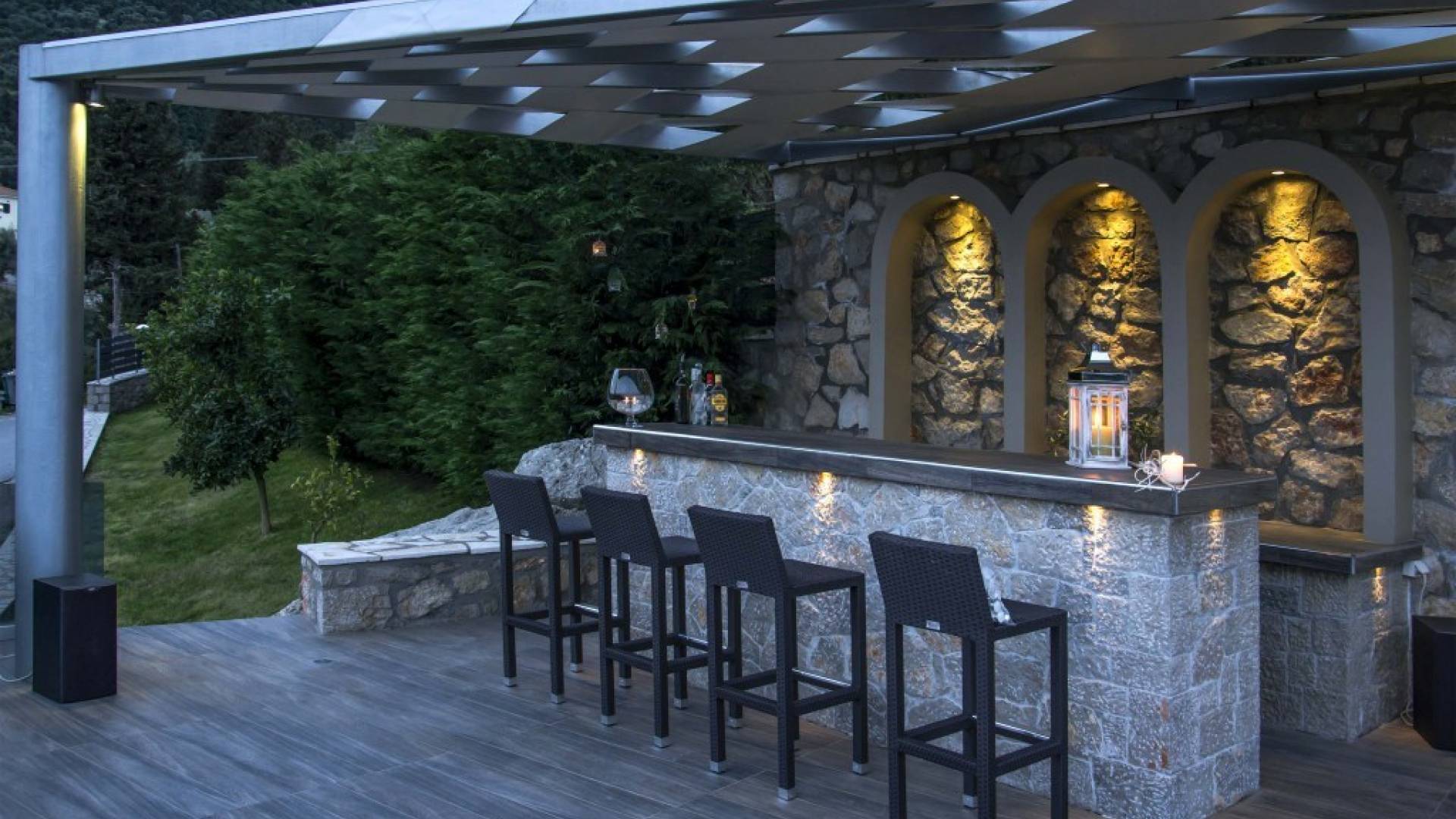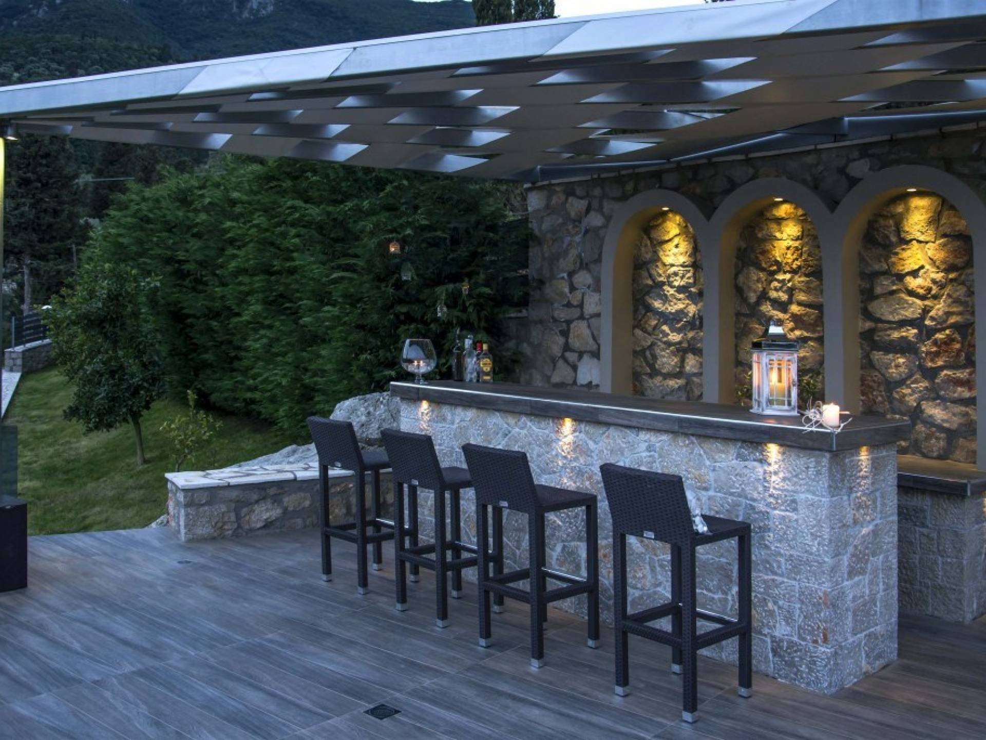 Vor der oberen Ebene gibt es auch einen 250 Quadratmeter großen Bereich rund um den Pool, der mit rutschfesten Fliesen bedeckt ist, wo Sie sich auf Sonnenliegen, einer (in ein Bett umwandelbaren) Schaukelsitz, einem Gartensalon und entspannen können nippen Sie an einem leckeren Getränk an der Poolbar. Der Infinity-Pool misst 5x10x3,20 mit einem Sprungbrett und Glasfliesen, wo der Überlauf eins mit dem tiefen Blau wird.