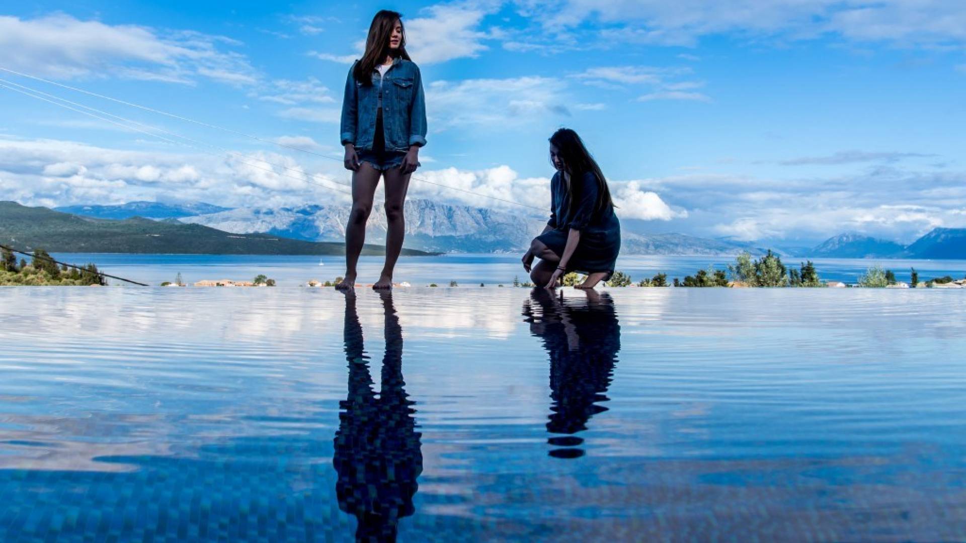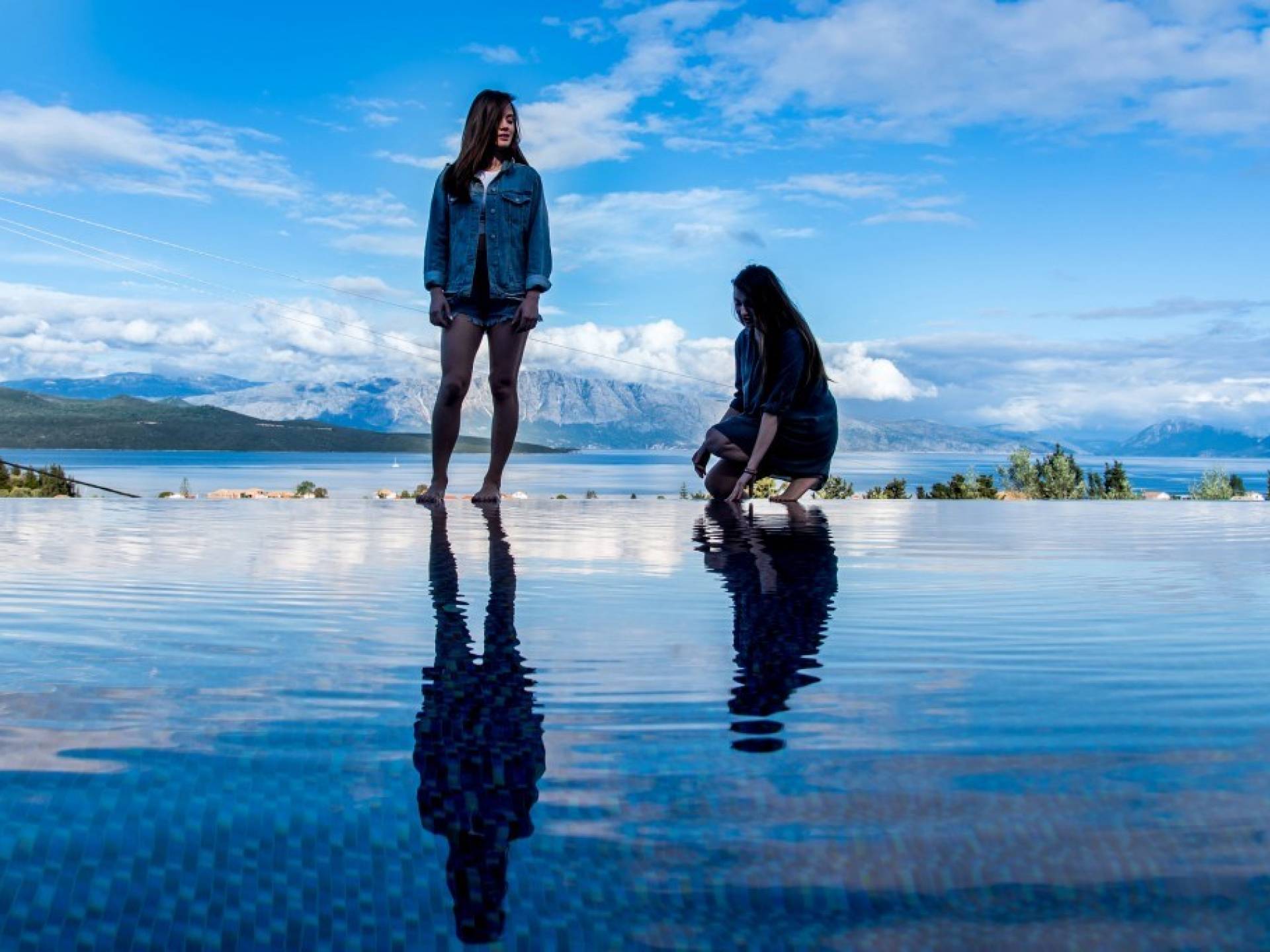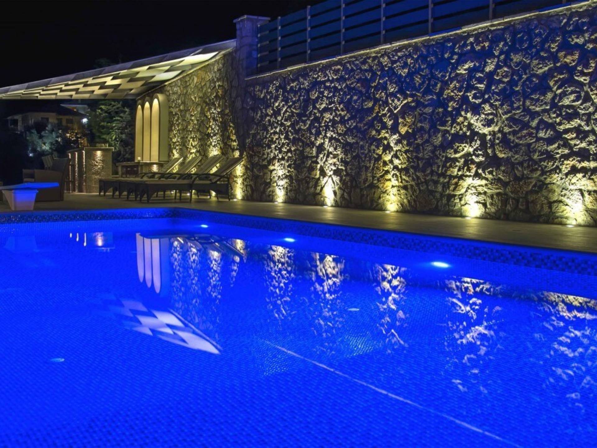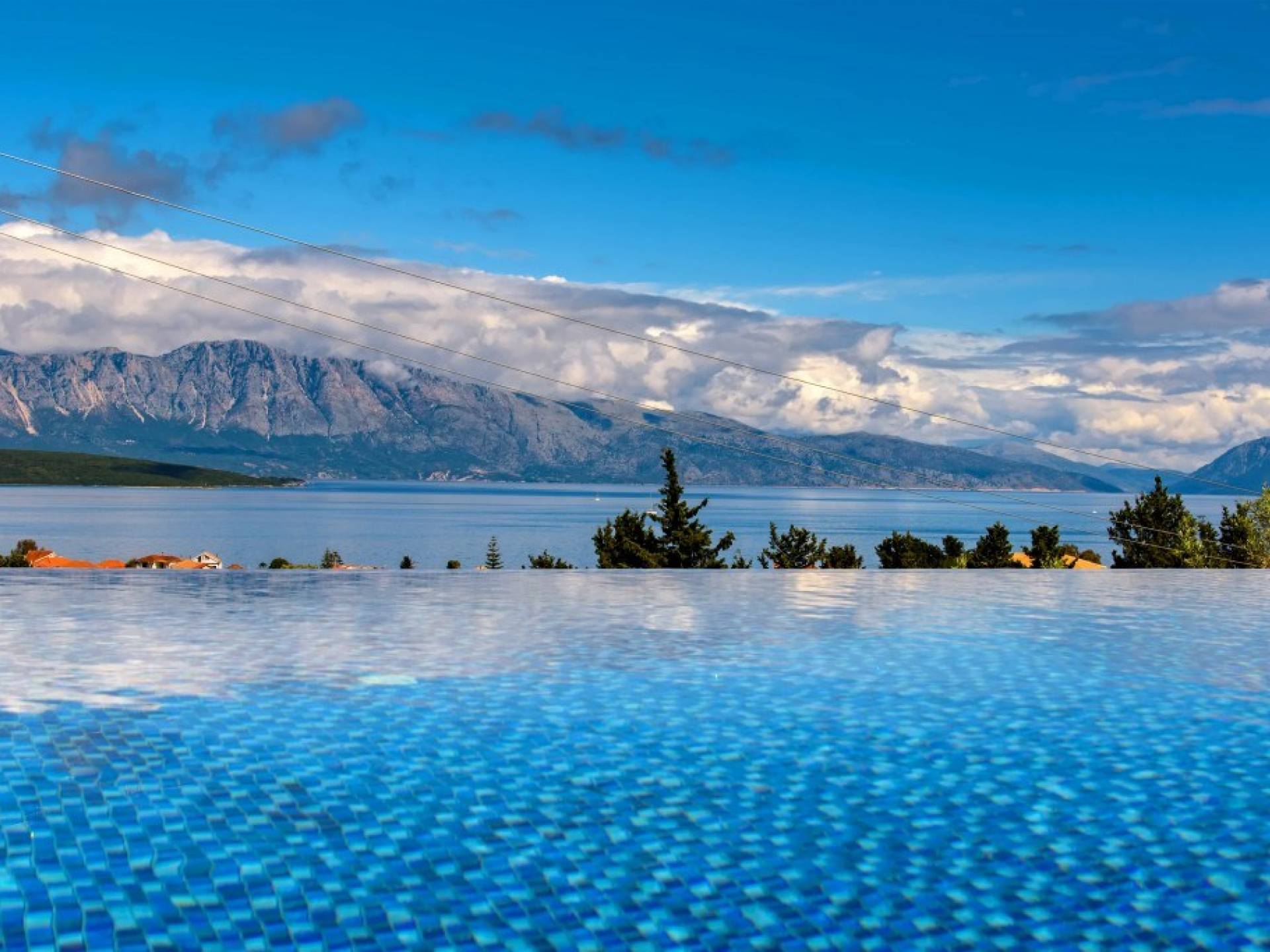 Vor der oberen Ebene gibt es auch einen 250 Quadratmeter großen Bereich rund um den Pool, der mit rutschfesten Fliesen bedeckt ist, wo Sie sich auf Sonnenliegen, einer (in ein Bett umwandelbaren) Schaukelsitz, einem Gartensalon und entspannen können nippen Sie an einem leckeren Getränk an der Poolbar. Der Infinity-Pool misst 5x10x3,20 mit einem Sprungbrett und Glasfliesen, wo der Überlauf eins mit dem tiefen Blau wird.