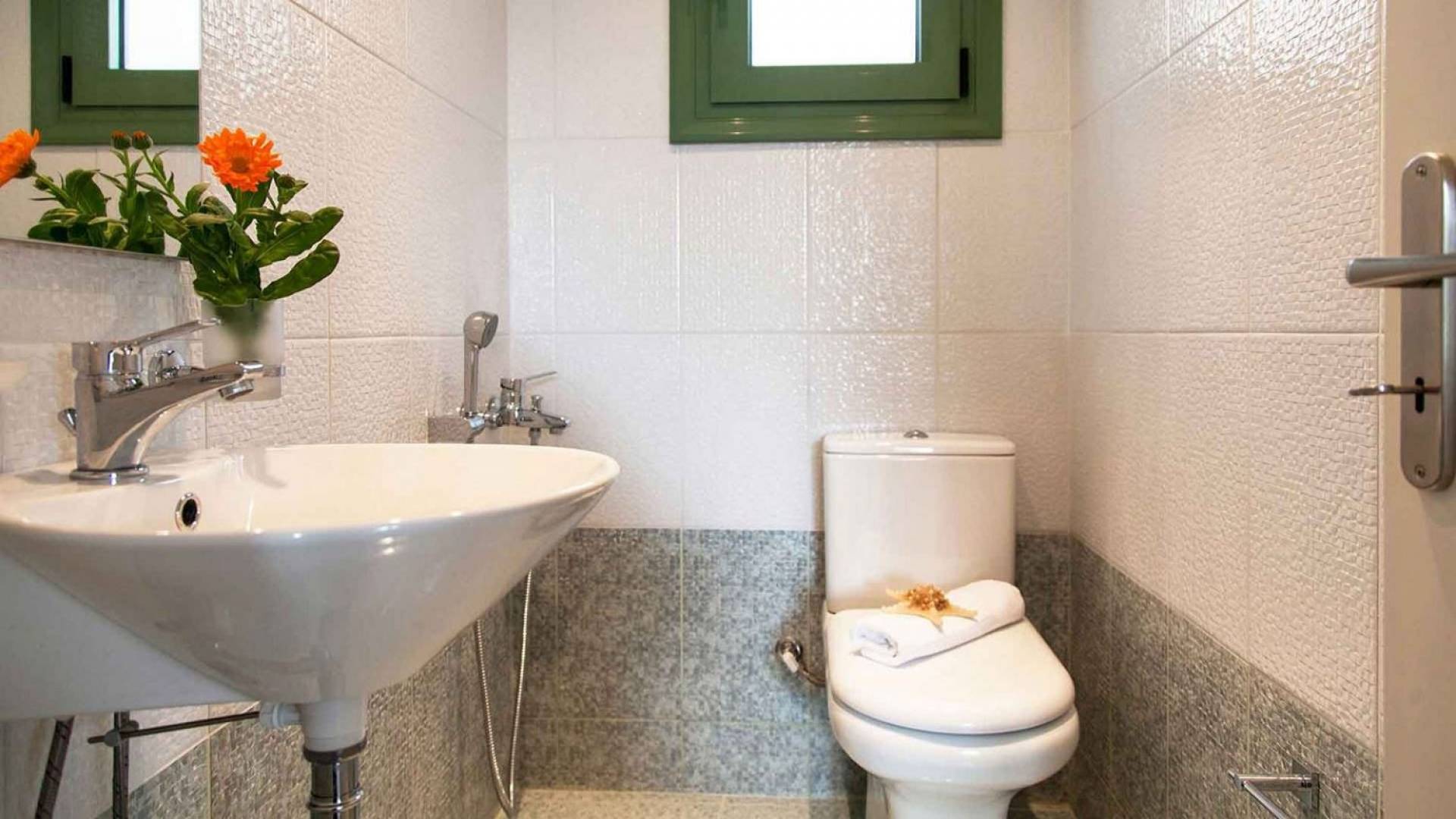 Im ersten Stock befindet sich ein Gästezimmer mit einem 43-Zoll-LED-Fernseher, einem eigenen Badezimmer und einem Sofa, das in ein Doppelbett umgewandelt werden kann. Auf der gleichen Ebene befindet sich der Poolbereich, der direkt durch die französische Tür betreten werden kann.