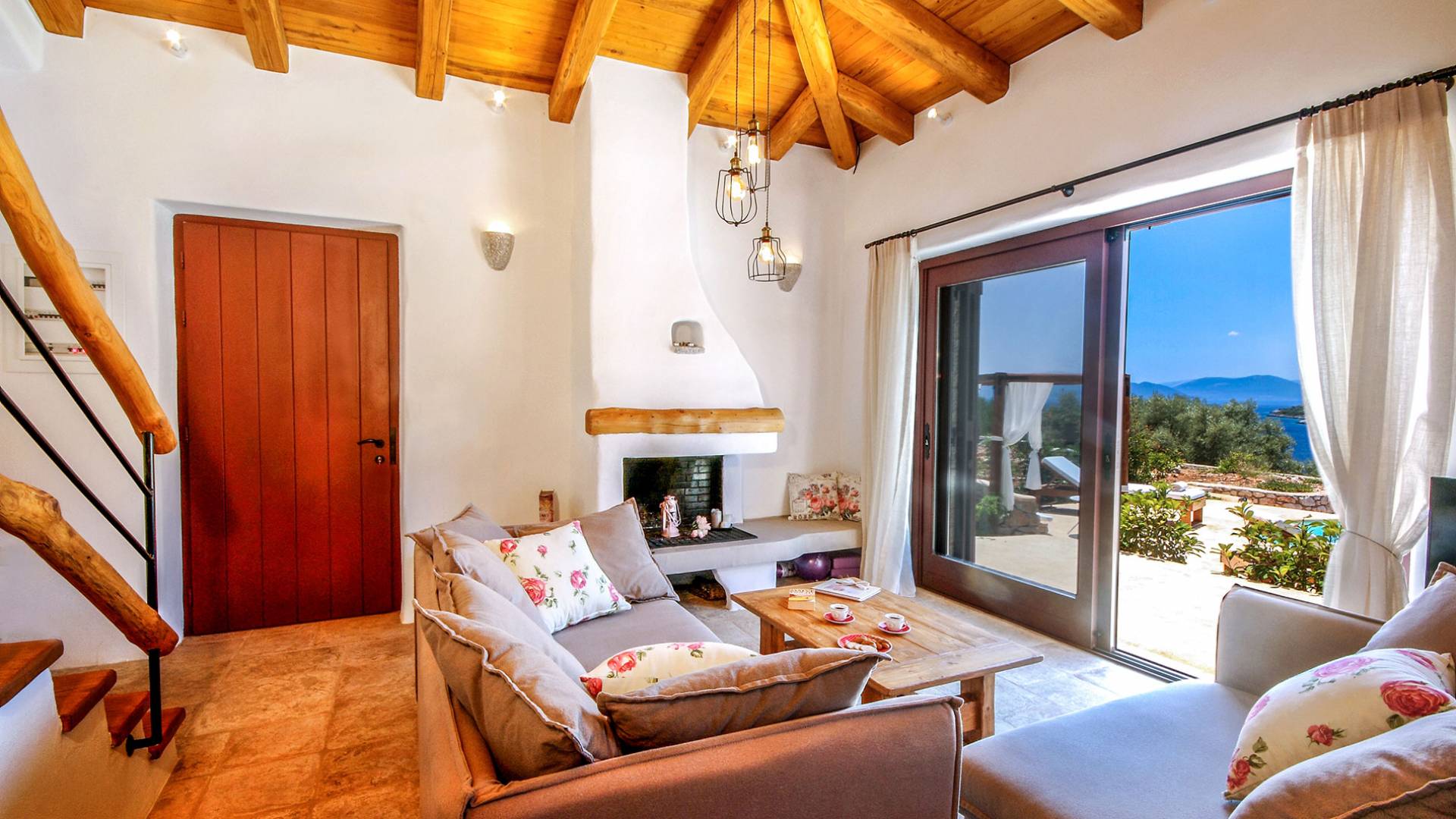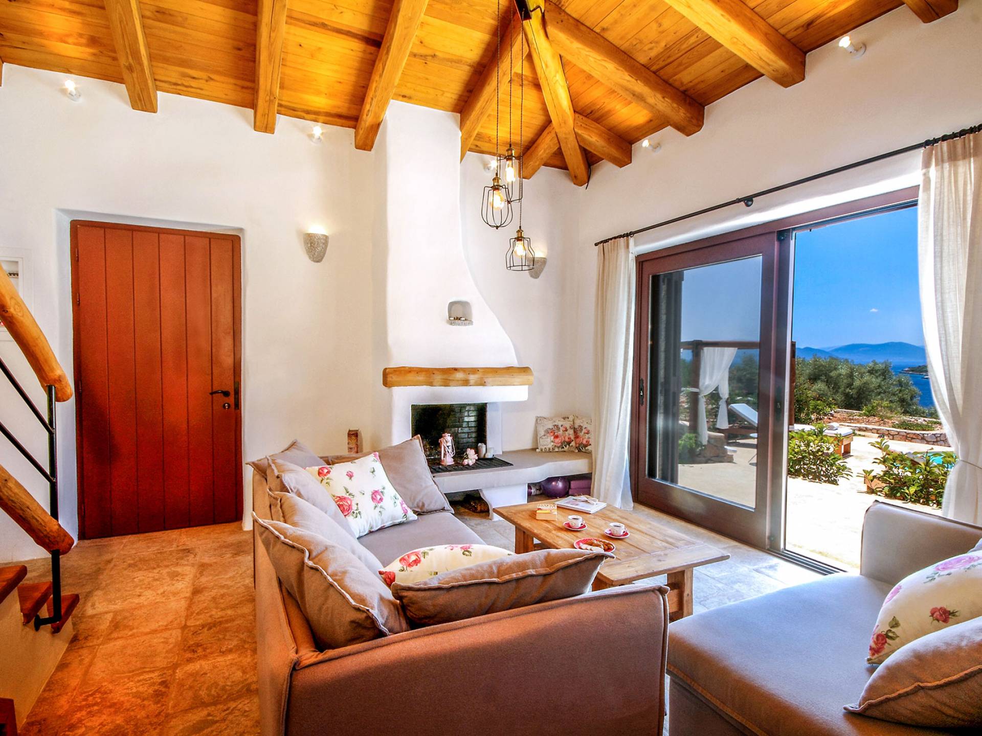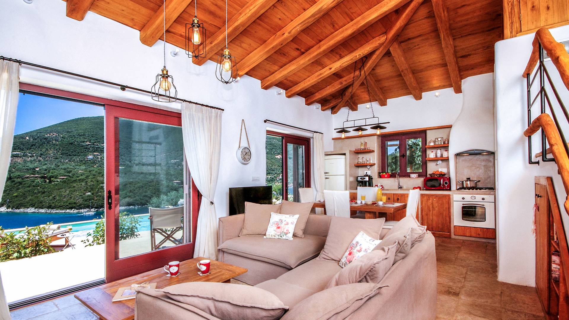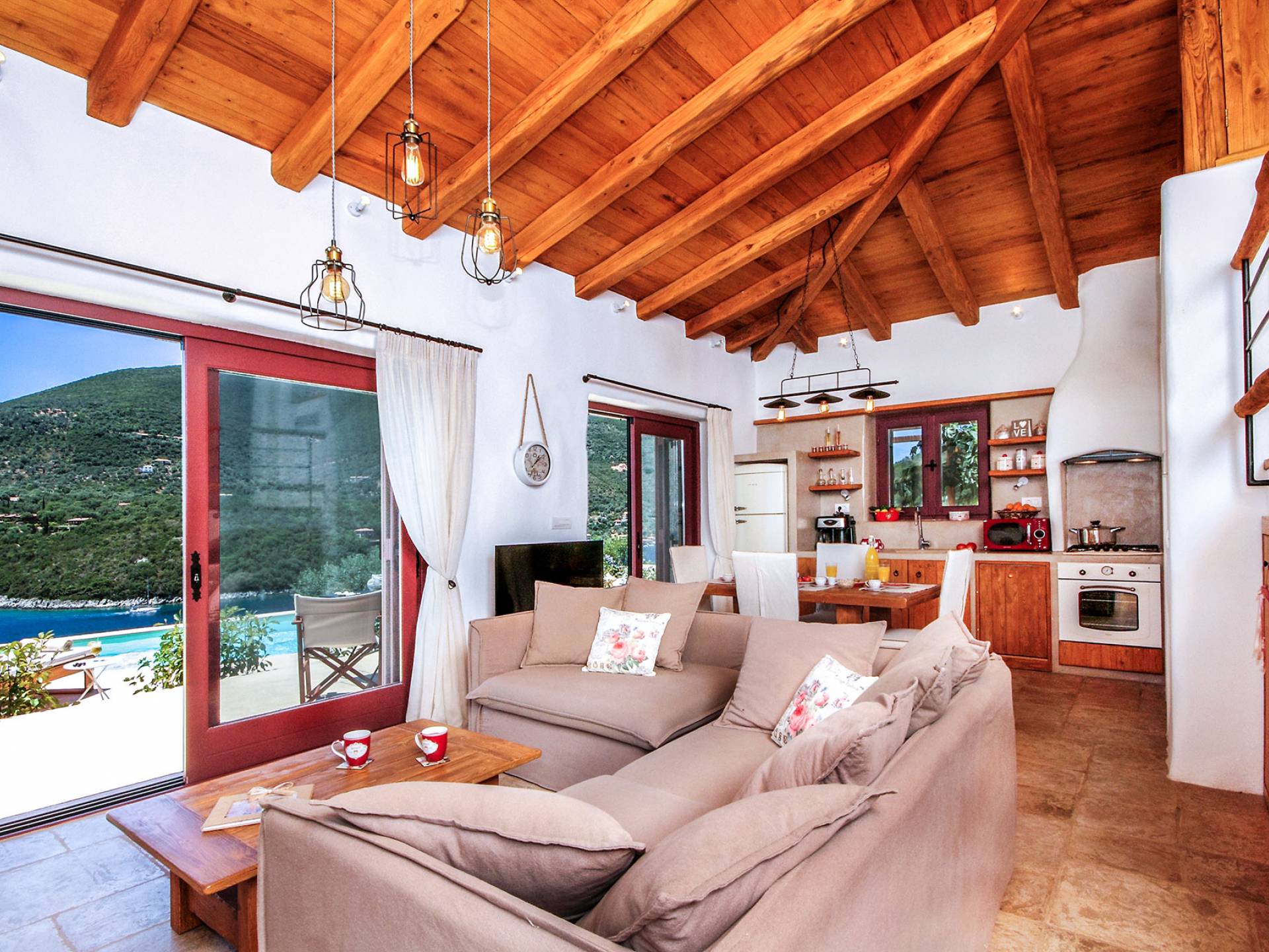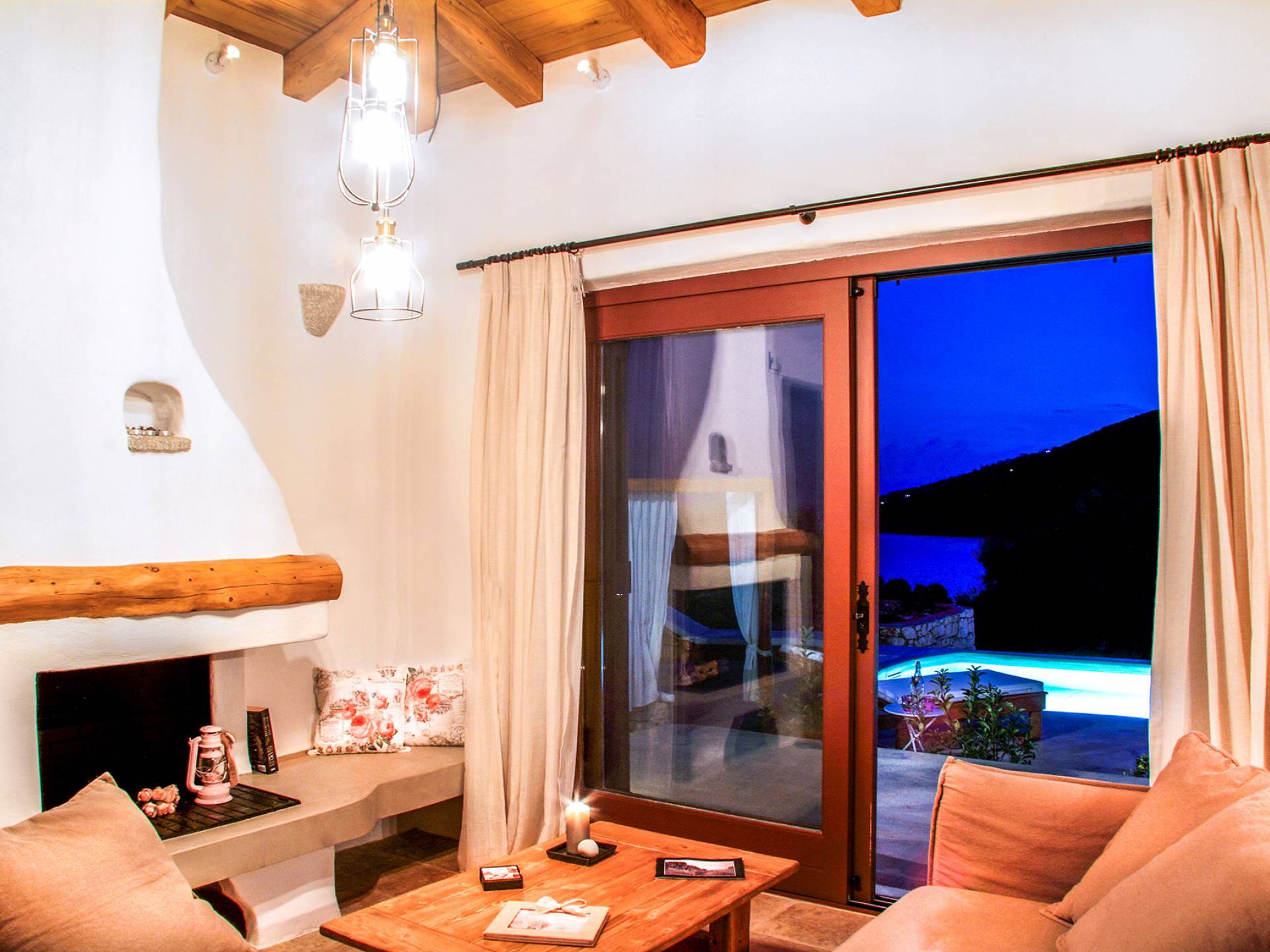 Villa Phos Lefkada ist eine Luxusvilla mit 2 Schlafzimmern und einem privaten Pool sind durch Innentreppen miteinander verbunden. Auf der ersten Ebene liegt der vereinte Raum der Küche, des Wohnzimmers und eines WCs. Die Küche ist mit allen notwendigen Retro-ähnlichen Haushaltsgeräten voll funktionsfähig für jeden Zweck und einem Esstisch ausgestattet. Das Wohnzimmer mit dem bequemen Sofa, dem Kamin, der Klimaanlage, der diskret gesteuerten Beleuchtung und der großen Fenstertür mit Blick auf den Swimmingpool und das Meer bietet Erholung, Spaß, Lesen und Spielen für Kinder oder Erwachsene. Das Sofa kann in ein Doppelbett umgewandelt werden.