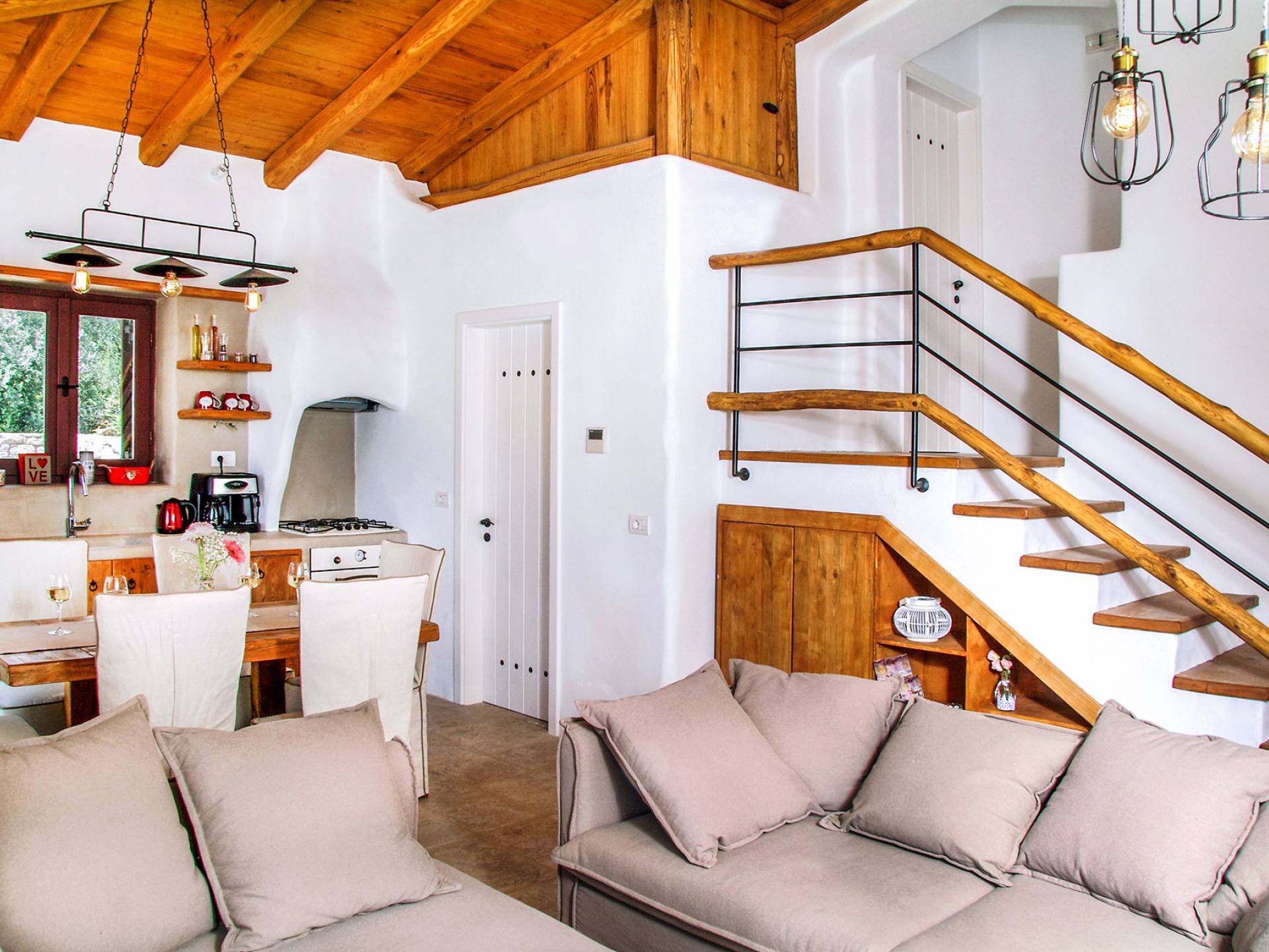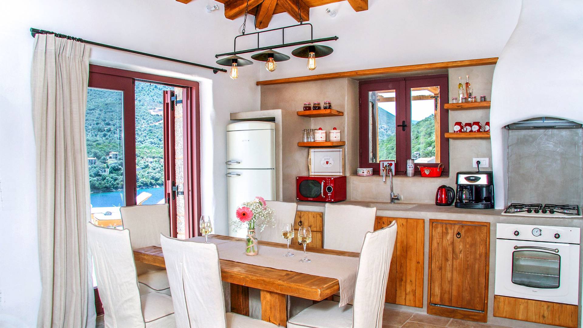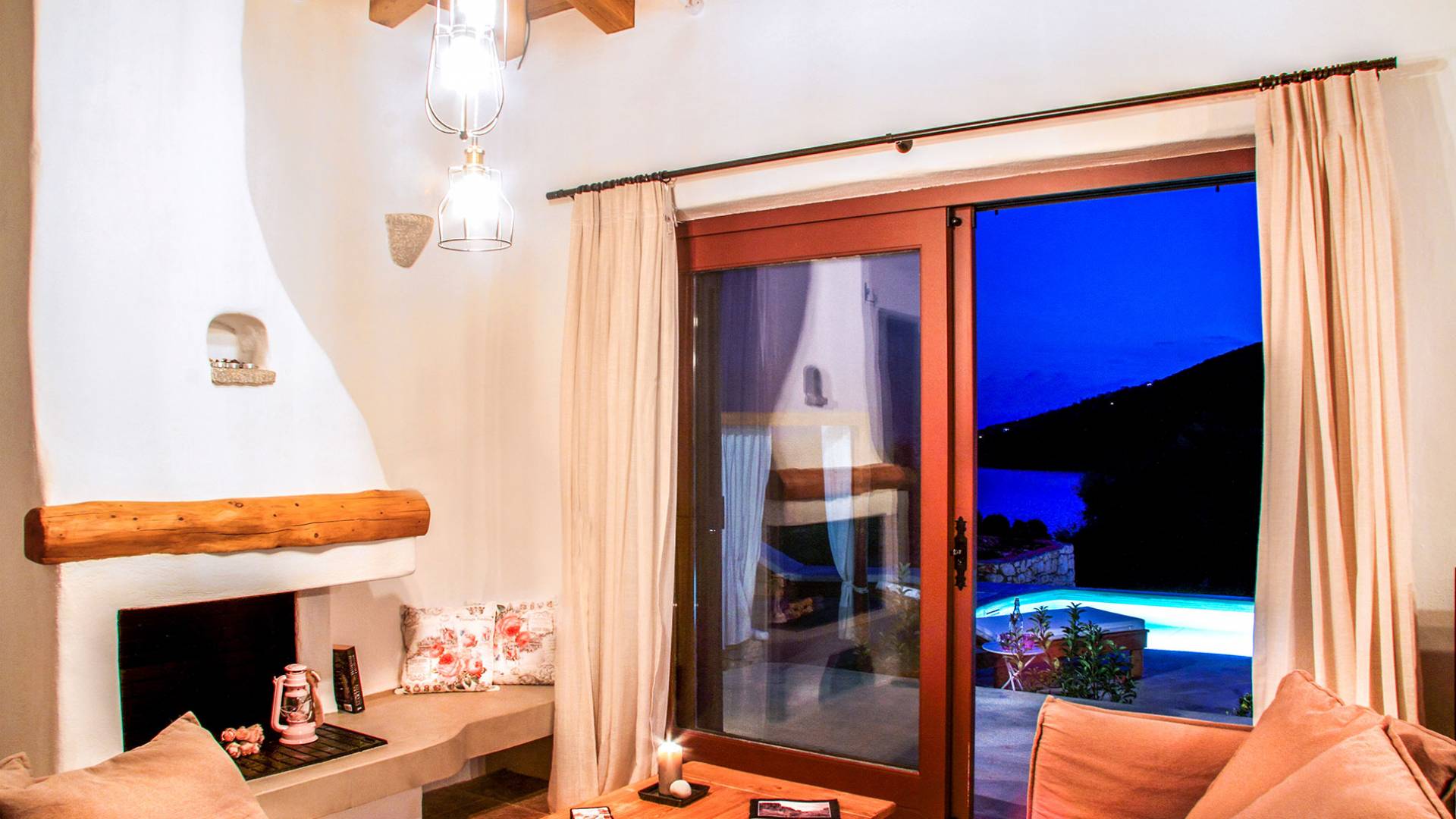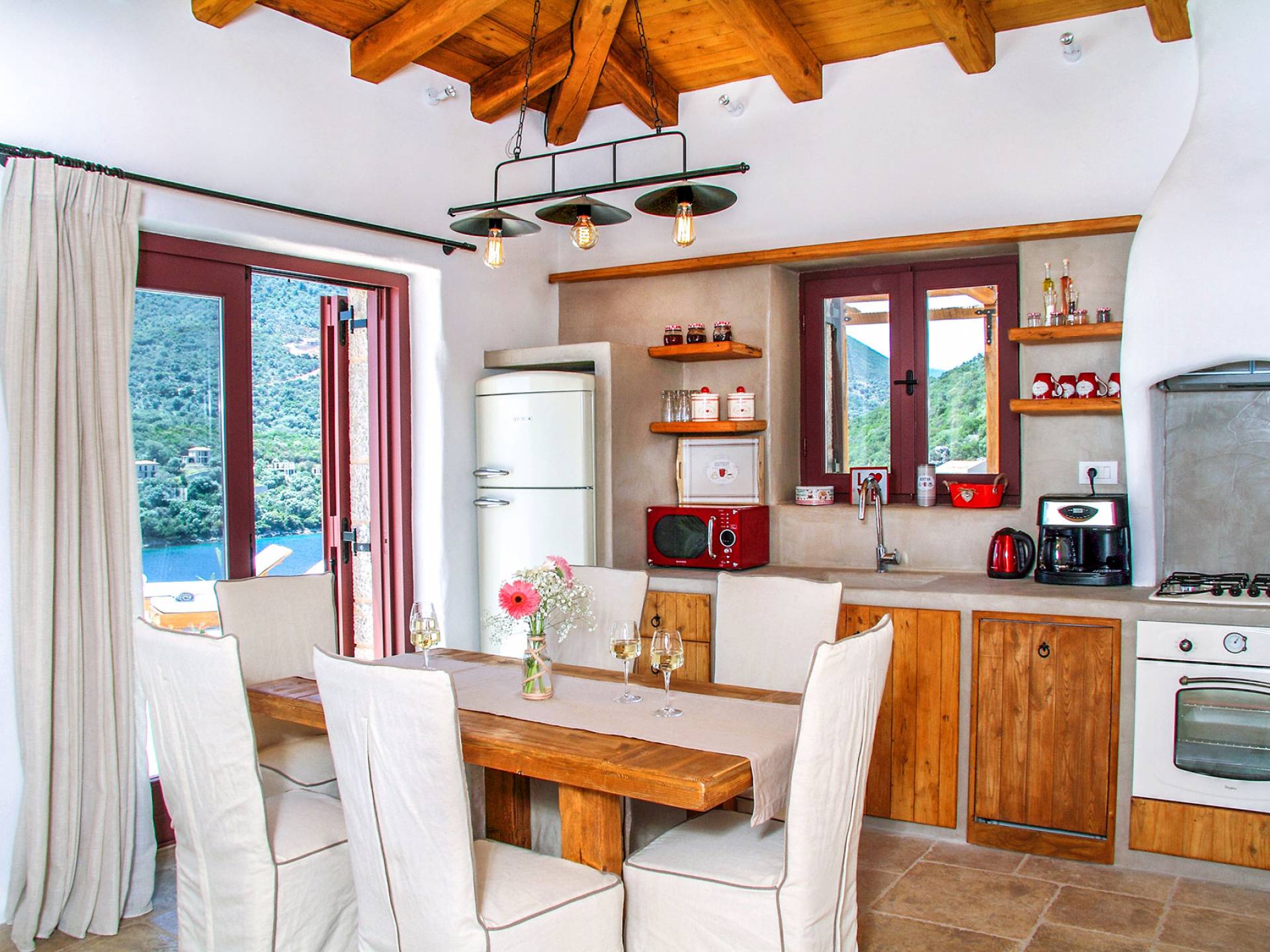 Villa Phos Lefkada ist eine Luxusvilla mit 2 Schlafzimmern und einem privaten Pool sind durch Innentreppen miteinander verbunden. Auf der ersten Ebene liegt der vereinte Raum der Küche, des Wohnzimmers und eines WCs. Die Küche ist mit allen notwendigen Retro-ähnlichen Haushaltsgeräten voll funktionsfähig für jeden Zweck und einem Esstisch ausgestattet. Das Wohnzimmer mit dem bequemen Sofa, dem Kamin, der Klimaanlage, der diskret gesteuerten Beleuchtung und der großen Fenstertür mit Blick auf den Swimmingpool und das Meer bietet Erholung, Spaß, Lesen und Spielen für Kinder oder Erwachsene. Das Sofa kann in ein Doppelbett umgewandelt werden.