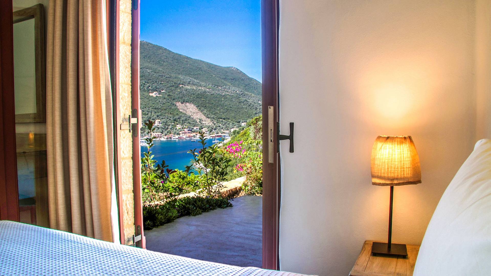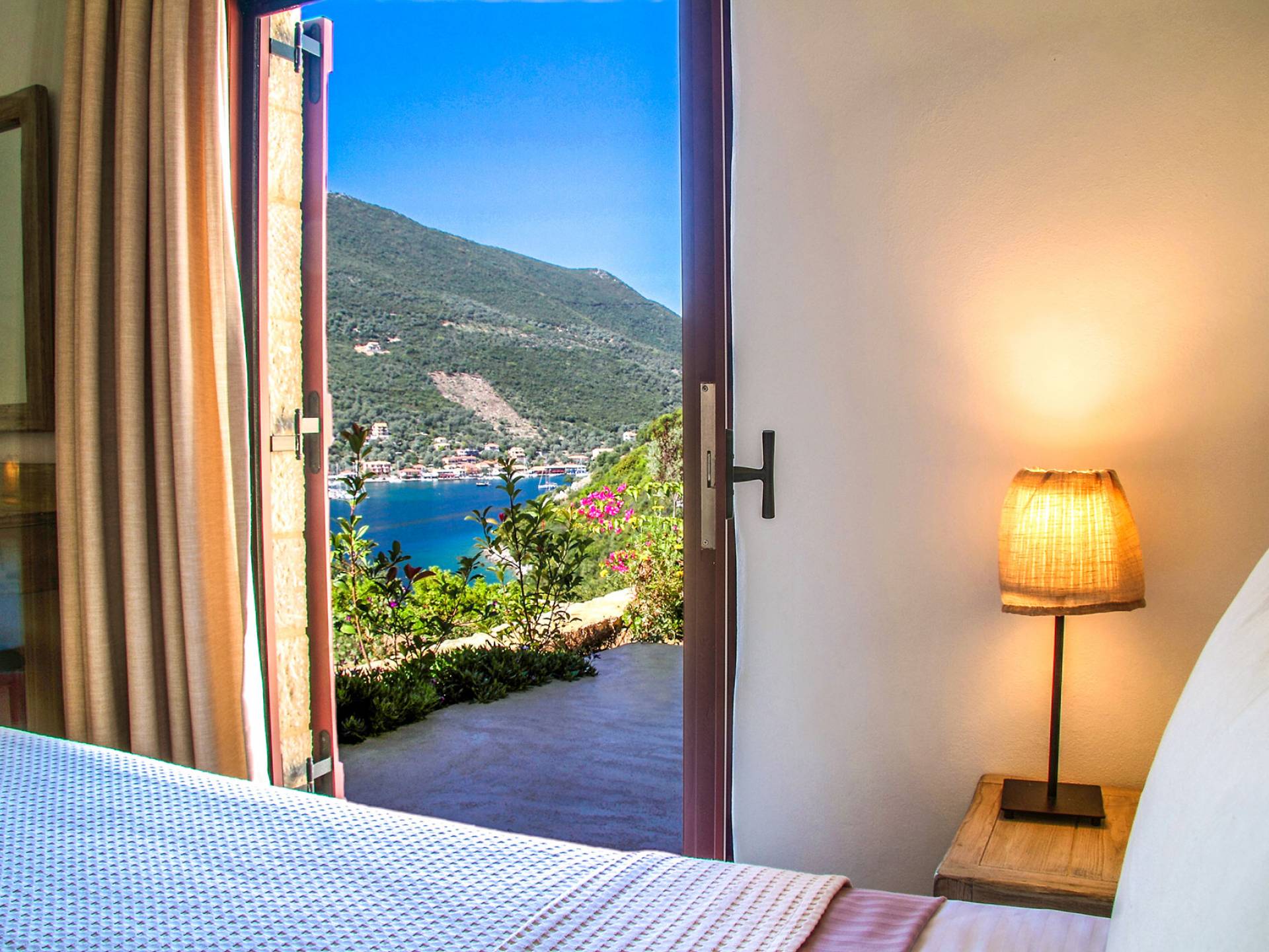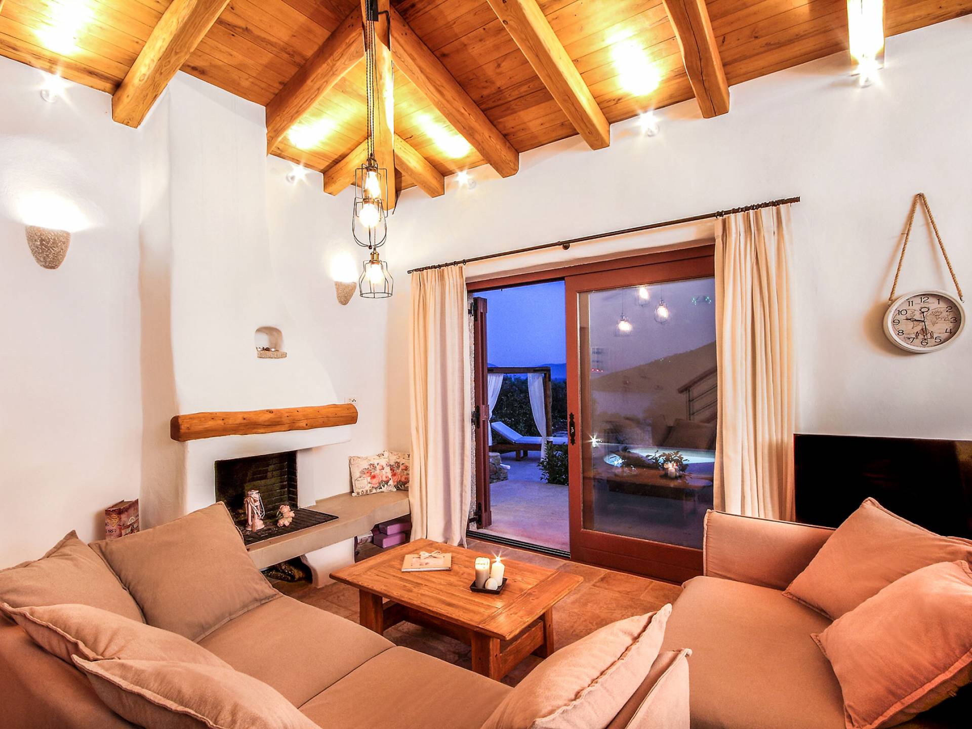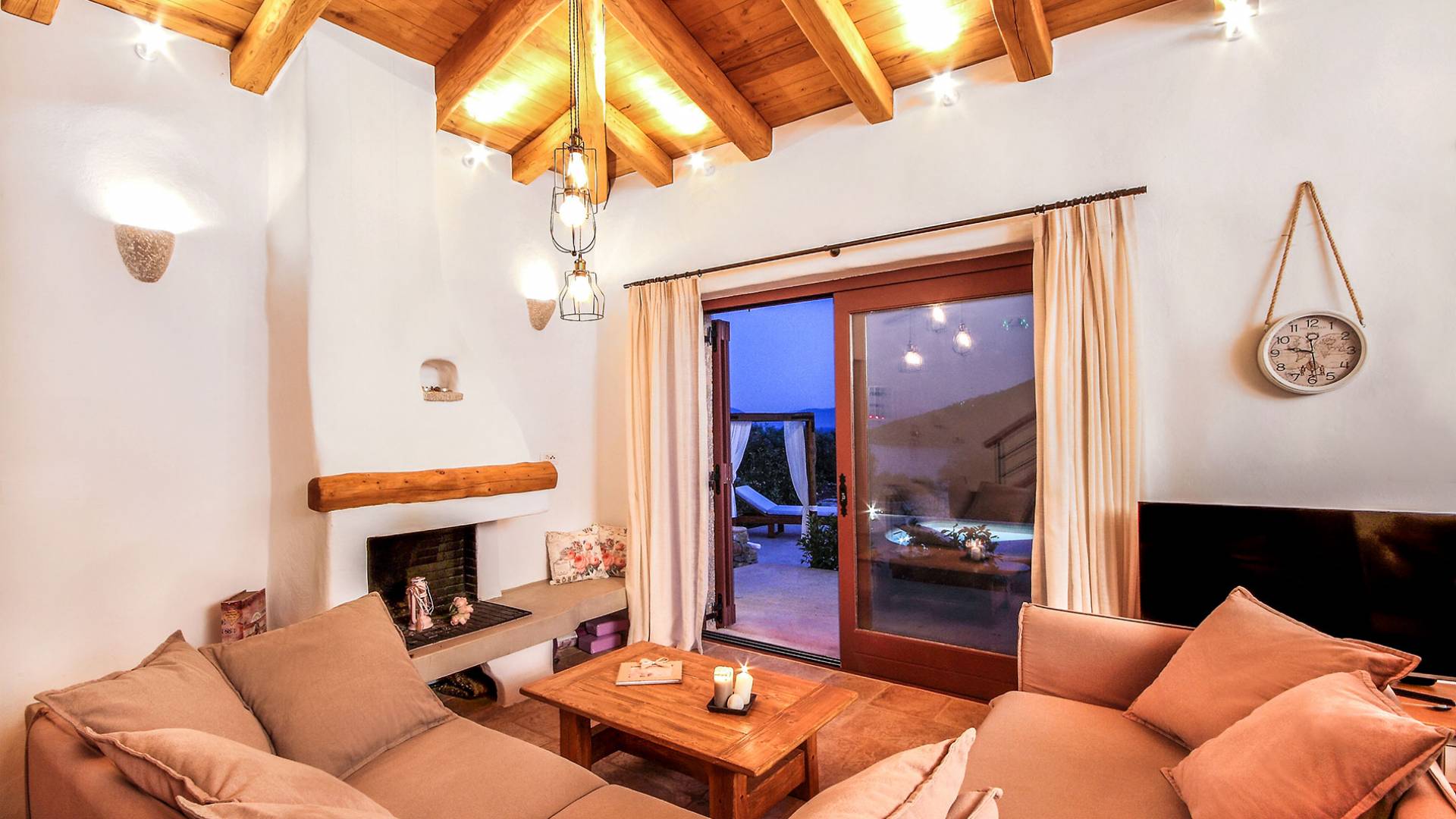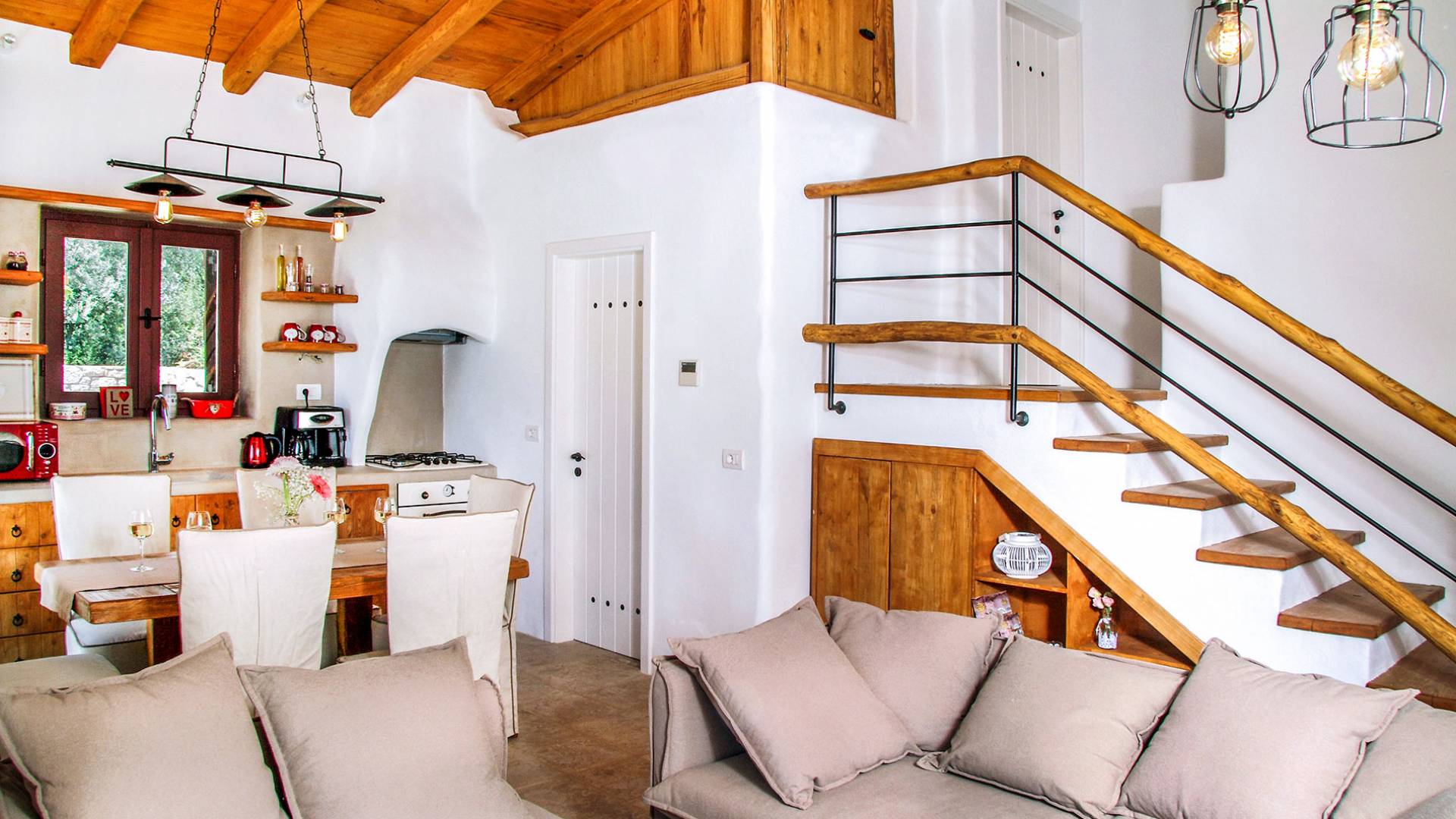 Villa Phos Lefkada ist eine Luxusvilla mit 2 Schlafzimmern und einem privaten Pool sind durch Innentreppen miteinander verbunden. Auf der ersten Ebene liegt der vereinte Raum der Küche, des Wohnzimmers und eines WCs. Die Küche ist mit allen notwendigen Retro-ähnlichen Haushaltsgeräten voll funktionsfähig für jeden Zweck und einem Esstisch ausgestattet. Das Wohnzimmer mit dem bequemen Sofa, dem Kamin, der Klimaanlage, der diskret gesteuerten Beleuchtung und der großen Fenstertür mit Blick auf den Swimmingpool und das Meer bietet Erholung, Spaß, Lesen und Spielen für Kinder oder Erwachsene. Das Sofa kann in ein Doppelbett umgewandelt werden.