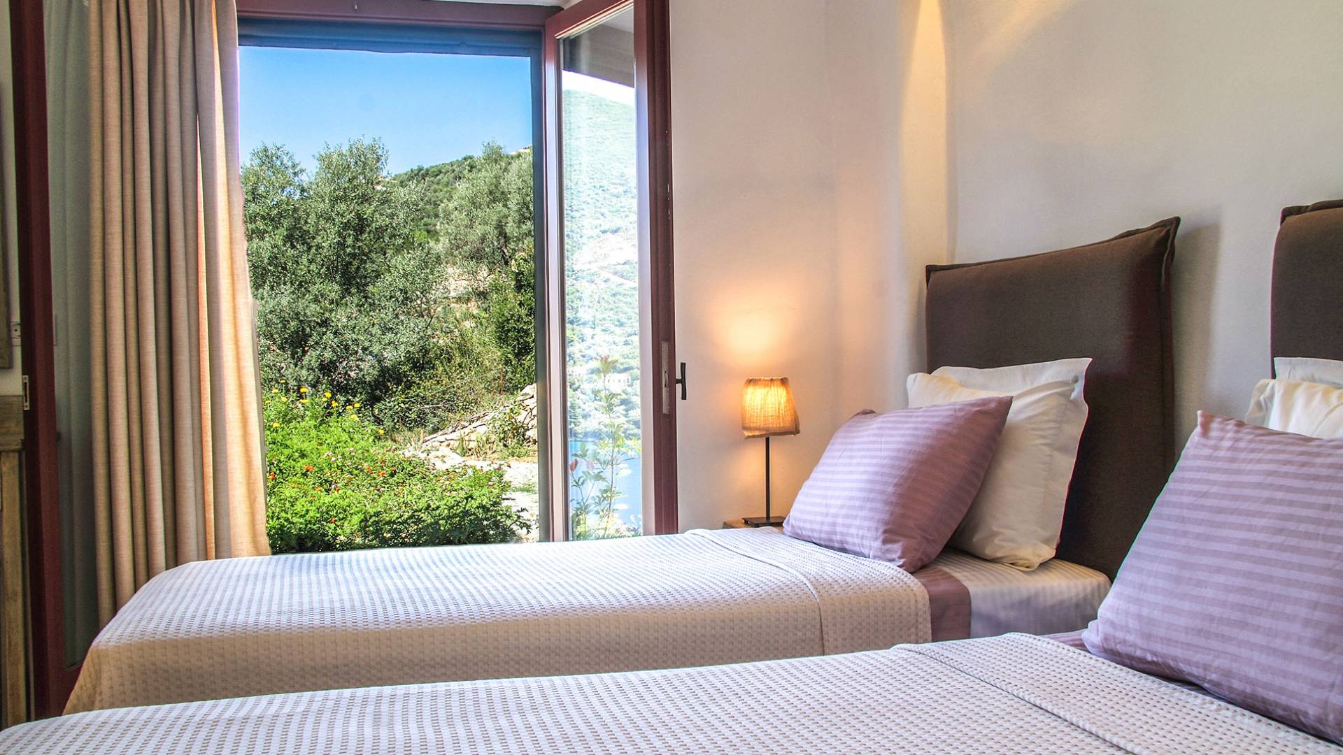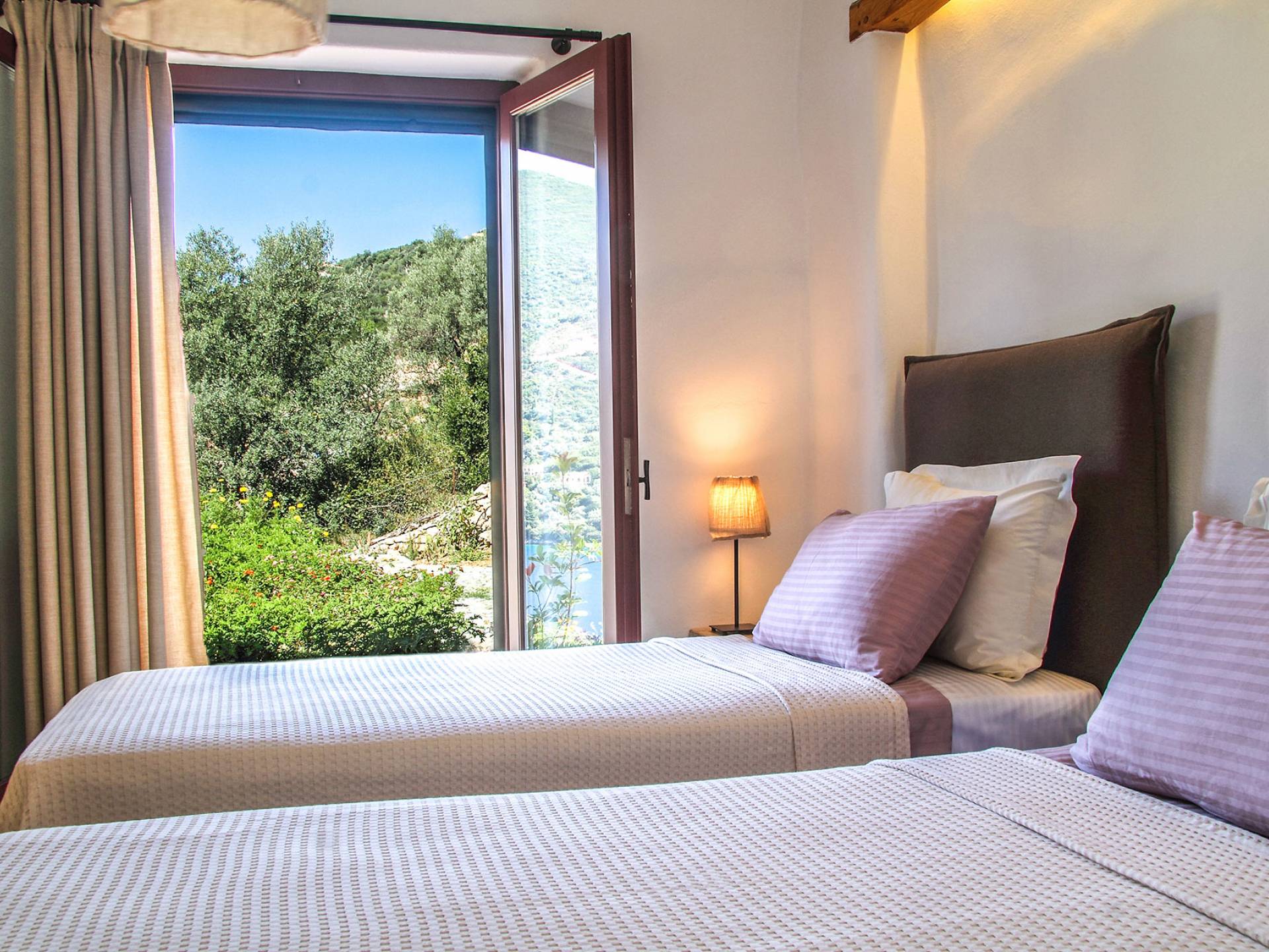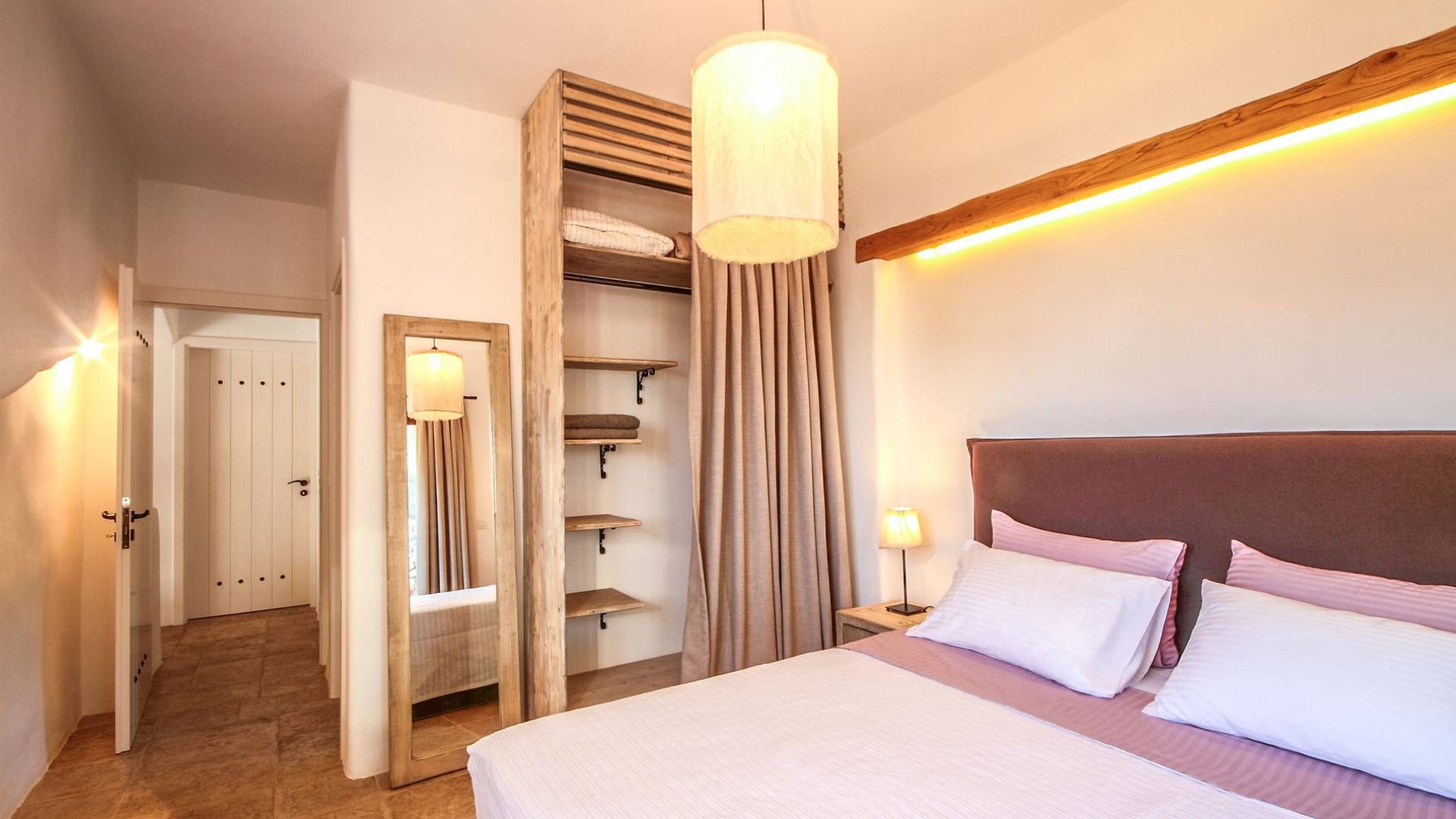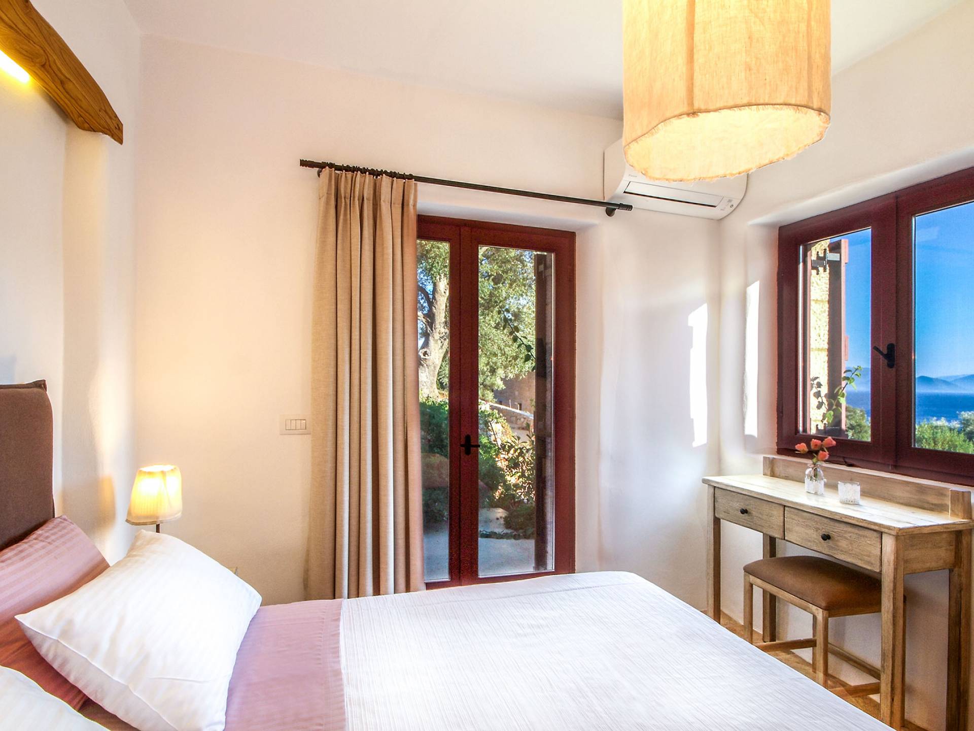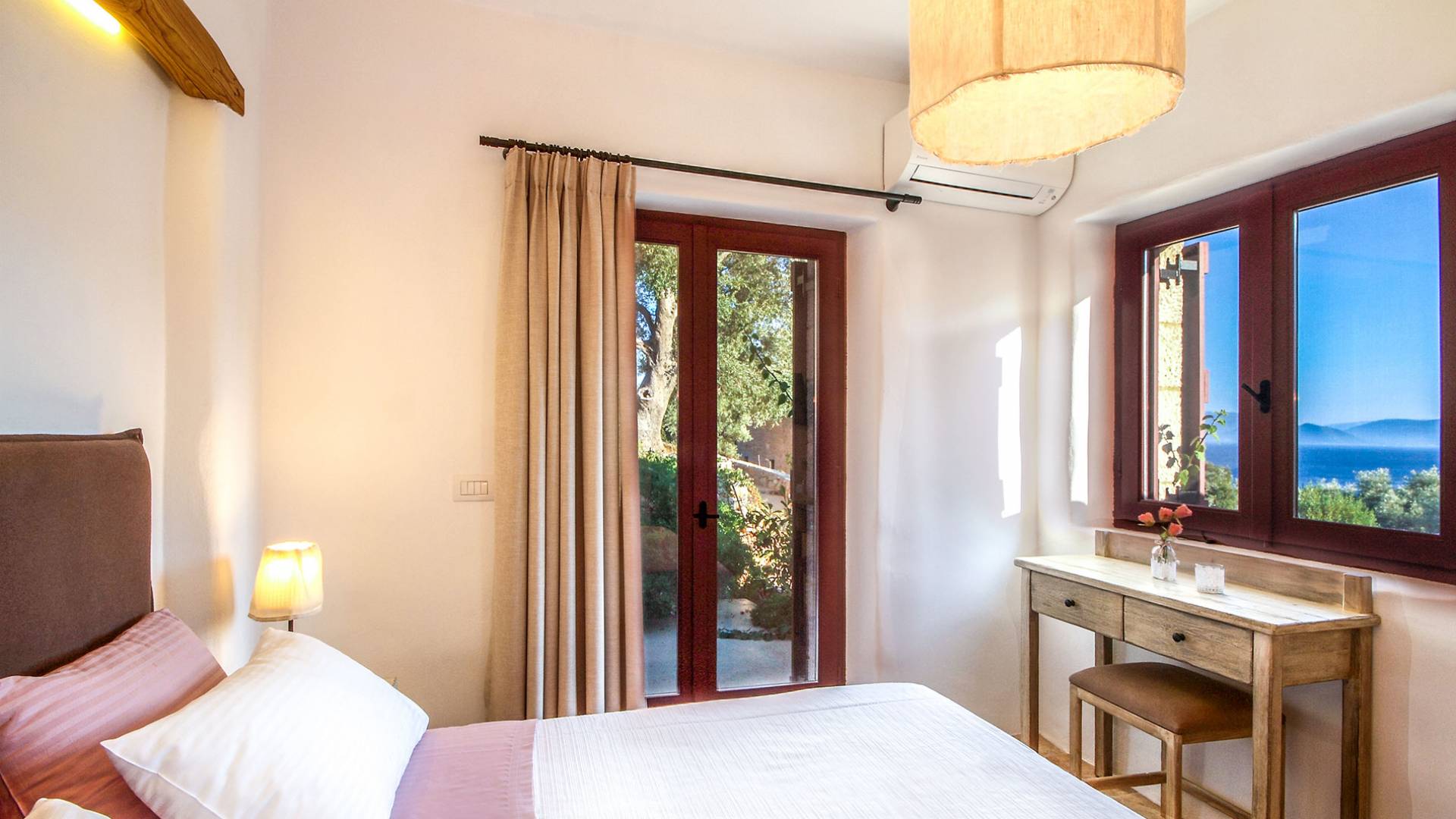 Wenn Sie die kleine Treppe hinaufgehen, befinden sich auf der erhöhten Ebene die beiden Schlafzimmer. Jedes von ihnen hat, abgesehen von der vollständigen Ausstattung in Möbeln, dem Fernseher und der Klimaanlage, ein eigenes privates Badezimmer sowie französische Fenster mit Zugang auf der Oberseite des Außenbereichs immer mit der entsprechenden Aussicht. Das erste Zimmer verfügt über ein Doppelbett, das zweite über zwei Einzelbetten, die auf Anfrage zusammengestellt werden können.