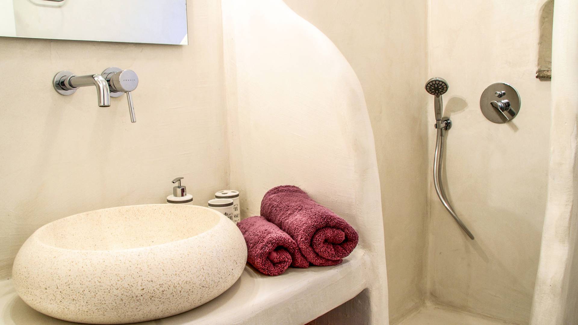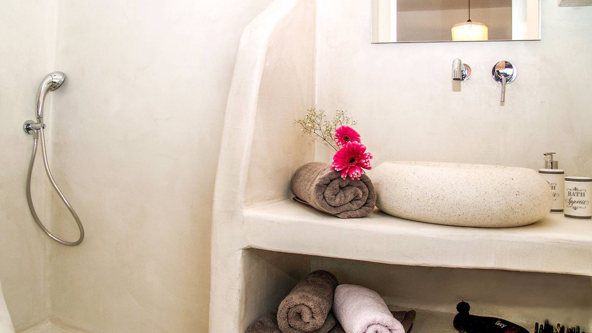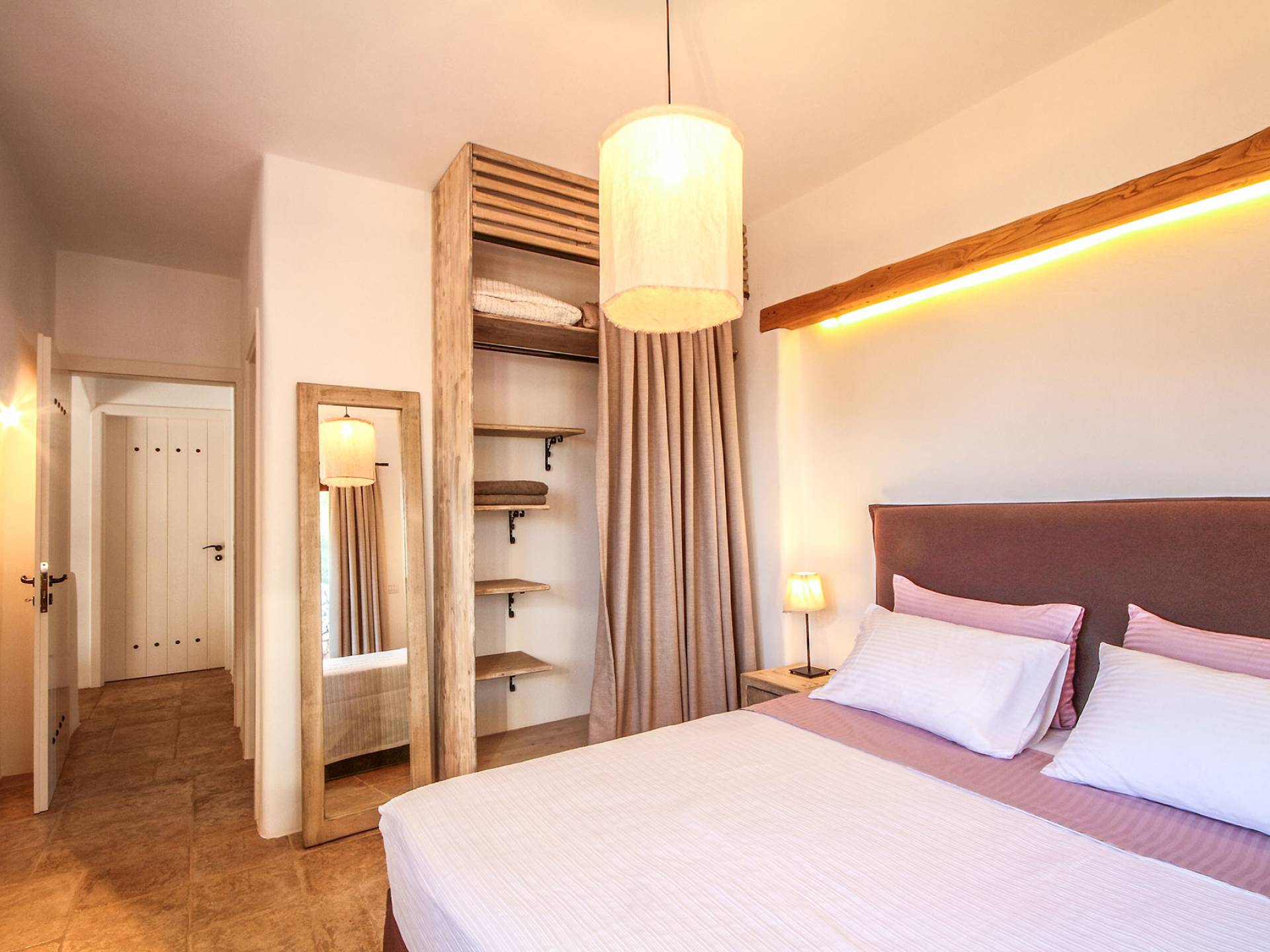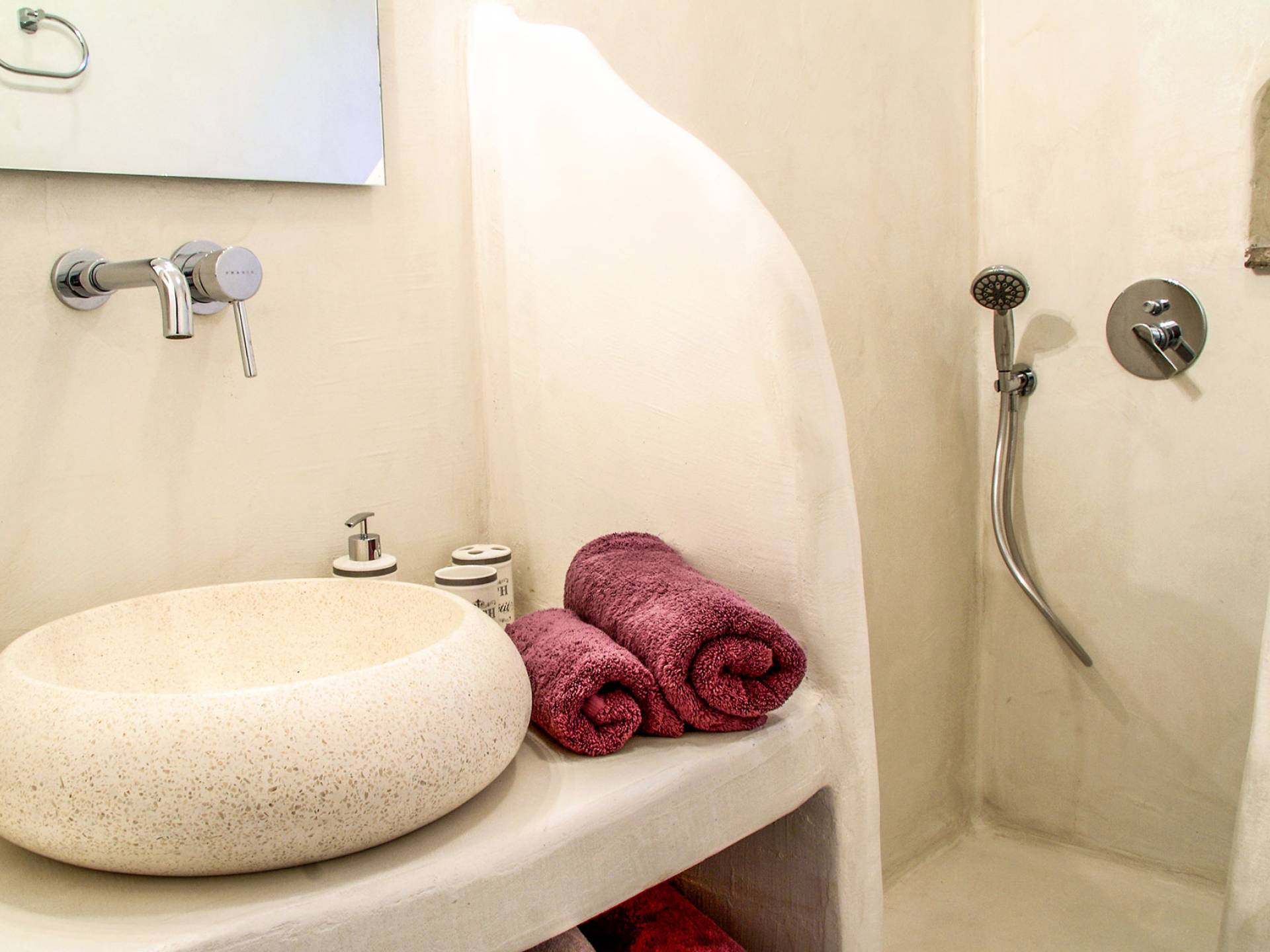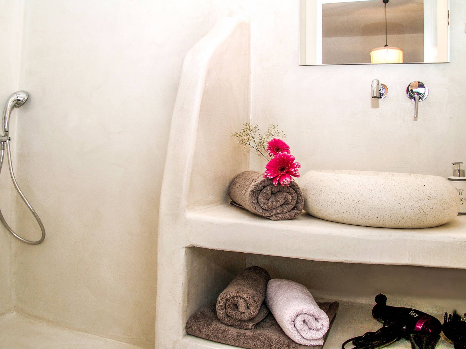 Ein Schlafzimmer muss das bieten, was es bieten soll. Angenehmer und gesunder Schlaf. Und das sollten wir respektieren. Aus diesem Grund wurden die ausgewählten Matratzen ausschließlich aus natürlichen Materialien wie Gummi, Kokospalme, Baumwolle, atmungsaktivem Gewebe, Atemwegen für ausreichende Belüftung und unabhängigen Federn für eine bessere Anatomie und Unterstützung hergestellt. Bei den Kissen wird die gleiche Philosophie bei den Materialien verfolgt und es besteht immer die Möglichkeit, von den weichsten bis zu den härteren zu wählen. Die Bettlaken und Bettdecken aus 100% Baumwolle und Satin vermitteln ein tolles Gefühl von Weichheit und Gesundheit, das zur absoluten Entspannung beiträgt. Die restliche Bettwäsche sowie die Badetücher folgen dem gleichen Weg aus reiner Baumwolle. Jedes Schlafzimmer verfügt über ein eigenes Bad en Suite und bietet so absolute Privatsphäre. Auch hier haben wir bei allem Respekt vor Raum und Ästhetik die schlichten, aber luxuriösen Linien der eingebauten Duschen und des Whirlpools im Hauptschlafzimmer der Villa Agapi, sanfte Farben und einfache Dekoration gewählt. Alle Badezimmer sind während Ihres Aufenthalts mit Körperpflegeprodukten wie Shampoo und Conditioner, Duschgel und Handseife ausgestattet.