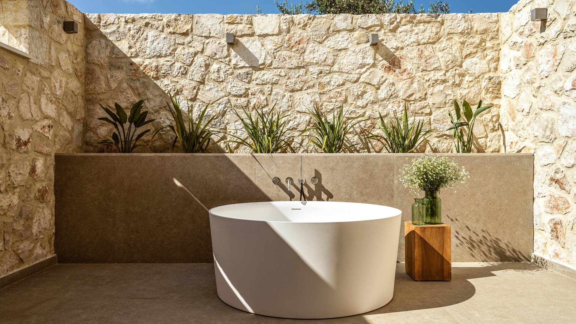 Das Schlafzimmer im Erdgeschoss bietet ein Doppelbett und ein Schlafsofa, das perfekt für ein kleines Kind zum Schlafen geeignet ist. Mit wunderschönem Blick auf den Garten sowie direktem Zugang zum Pool und zur Terrasse verfügt das Schlafzimmer auch über einen privaten Außenbereich Badewanne. Im Erdgeschoss gibt es auch ein WC. Die zwei großen Schlafzimmer, die sich im ersten Stock befinden, verfügen über Doppelbetten, en-suite Badezimmer und eine möblierte Terrasse mit Sofas, die den Rahmen für entspannende Momente mit wunderschönem Blick auf das Meer bilden. Eines der Schlafzimmer im ersten Stock ist außerdem mit einem Schlafsofa ausgestattet.