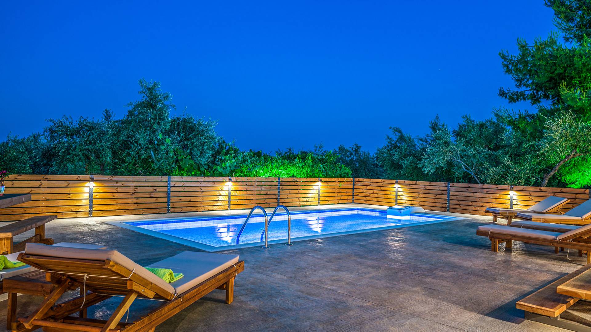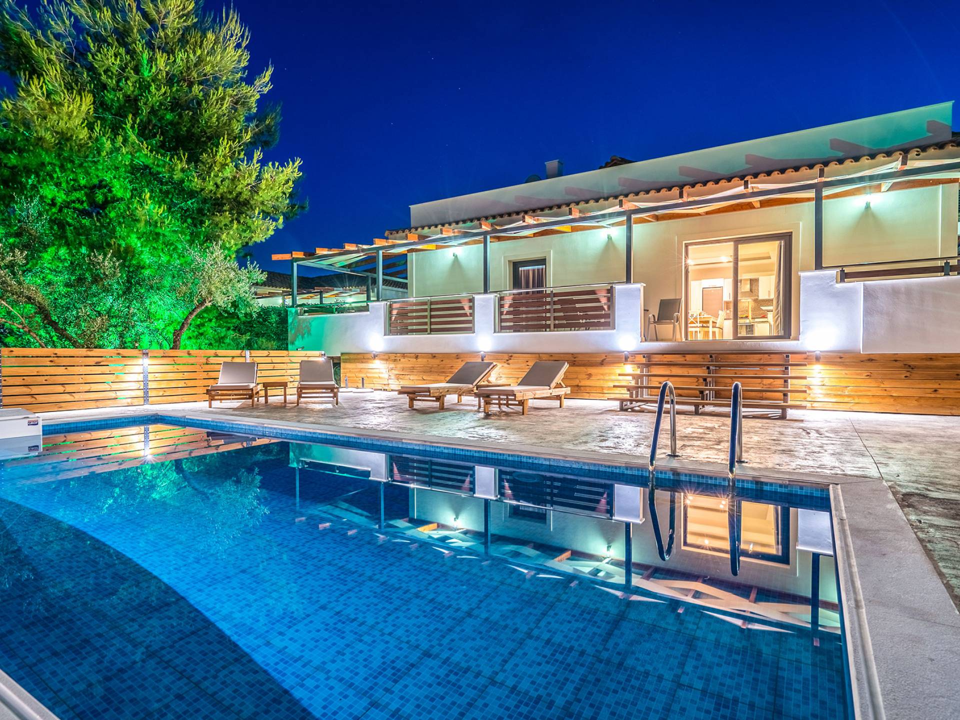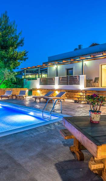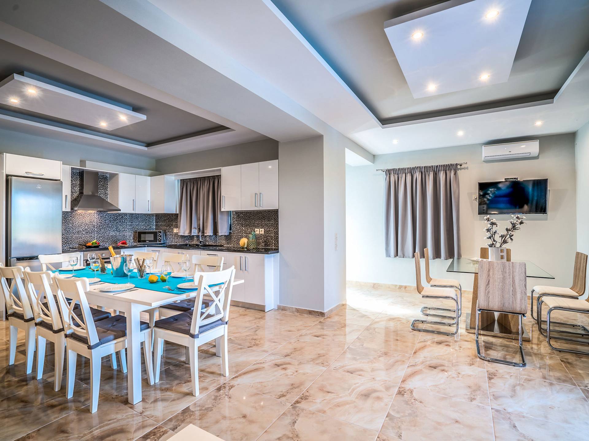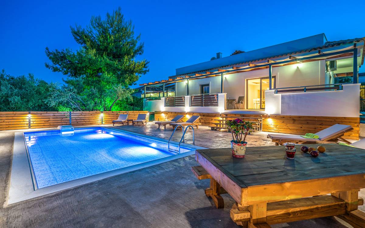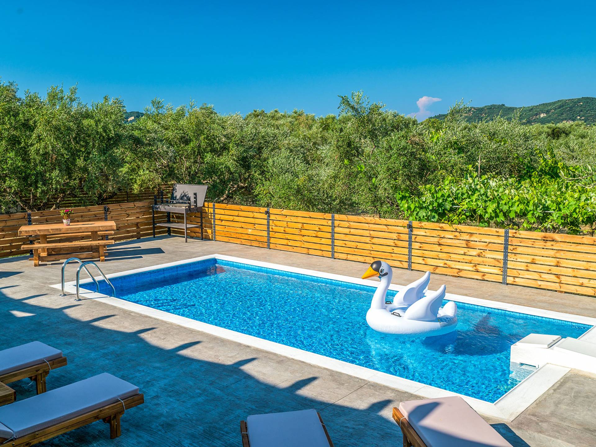 Villa Chloe Zante ist eine Villa mit 4 Schlafzimmern, die sich in der Mitte des Komplexes befindet, etwa 160 m² groß ist und über einen neu gebauten privaten Pool verfügt. Die Villa bietet bequem Platz für bis zu 8 + 5 Gäste. Der Haupteingang der Villa führt zu einem modernen und geräumigen Wohnzimmer mit einer voll ausgestatteten Küche und einem Essbereich sowie einem Hauptbadezimmer mit Dusche. Das Wohnzimmer verfügt über zwei 3-Sitzer-Sofas, die in ein Doppelbett (150 x 210 cm) umgewandelt werden können.