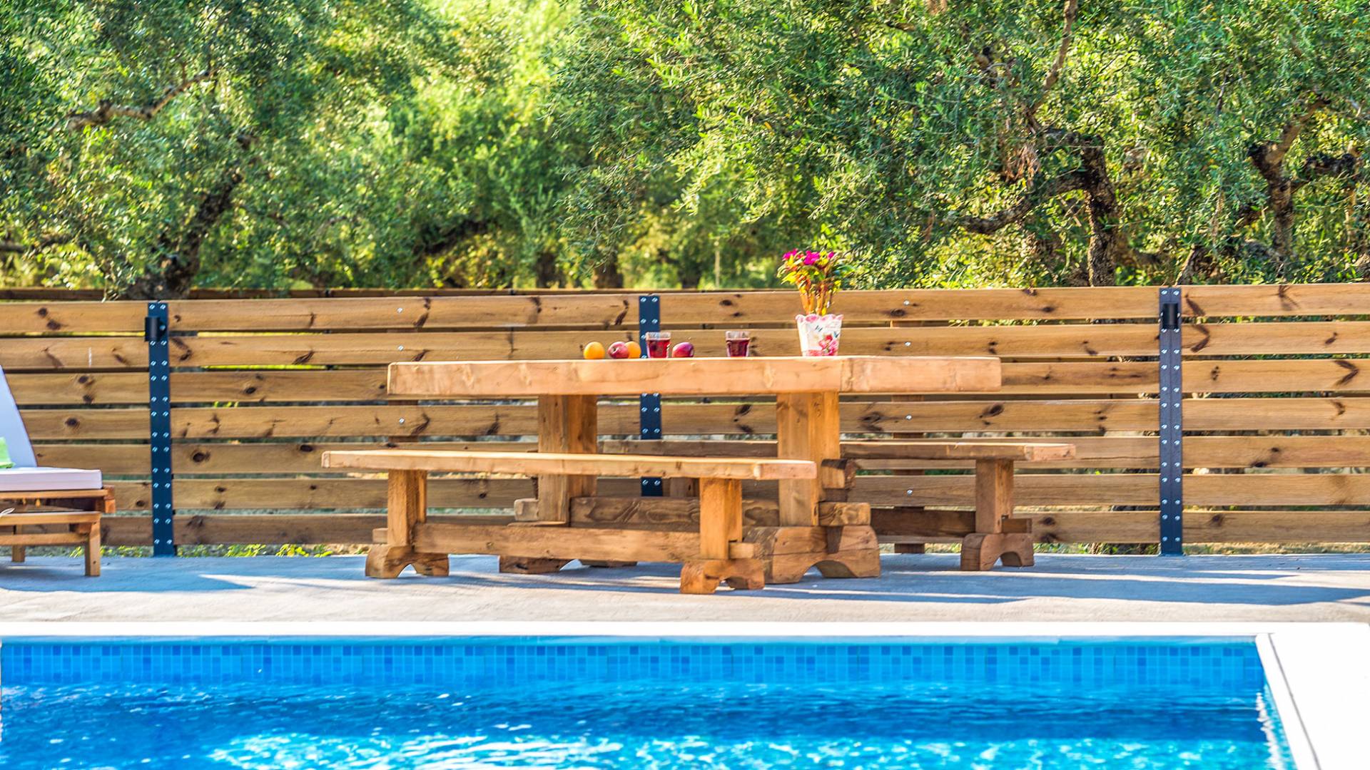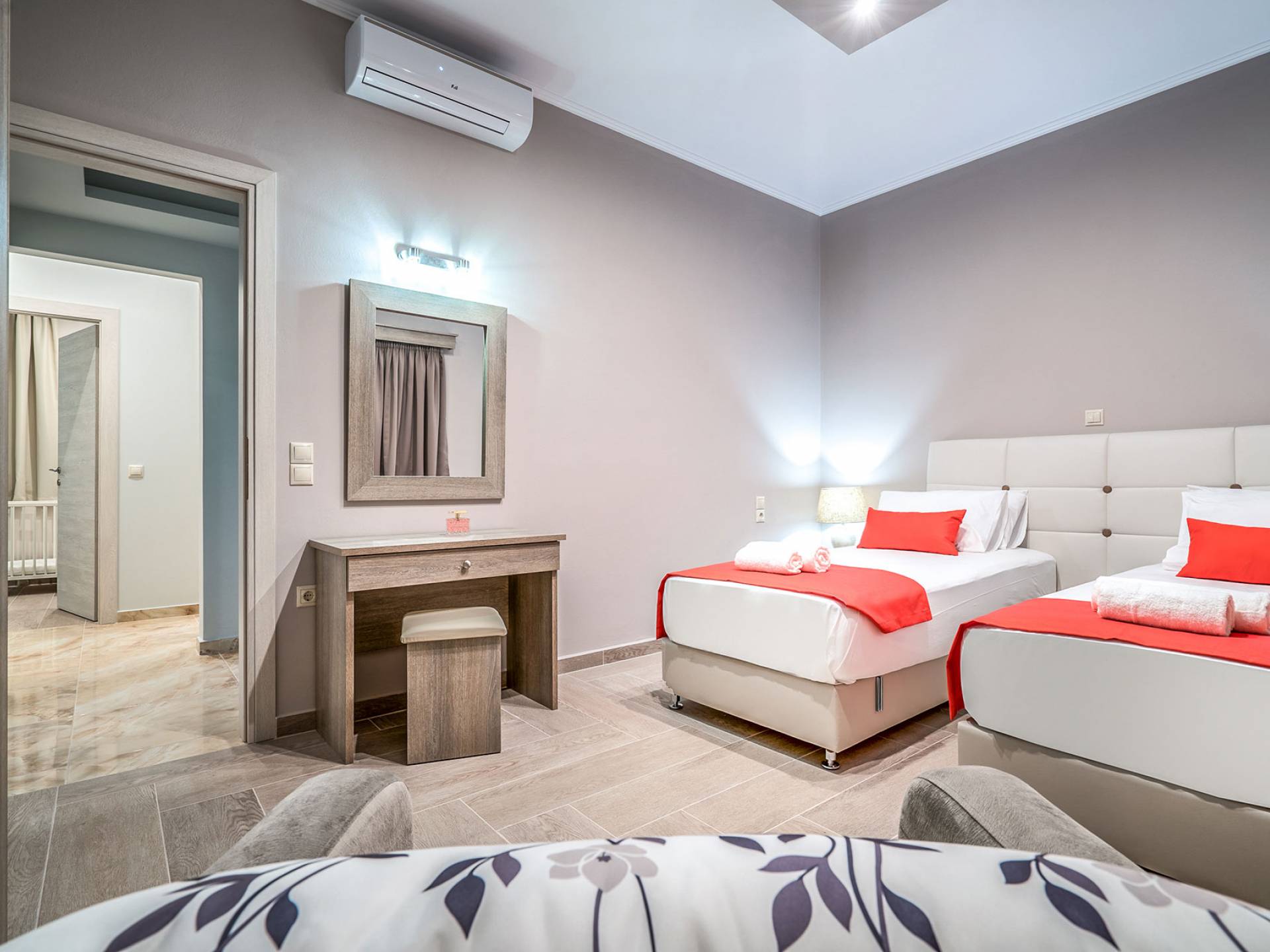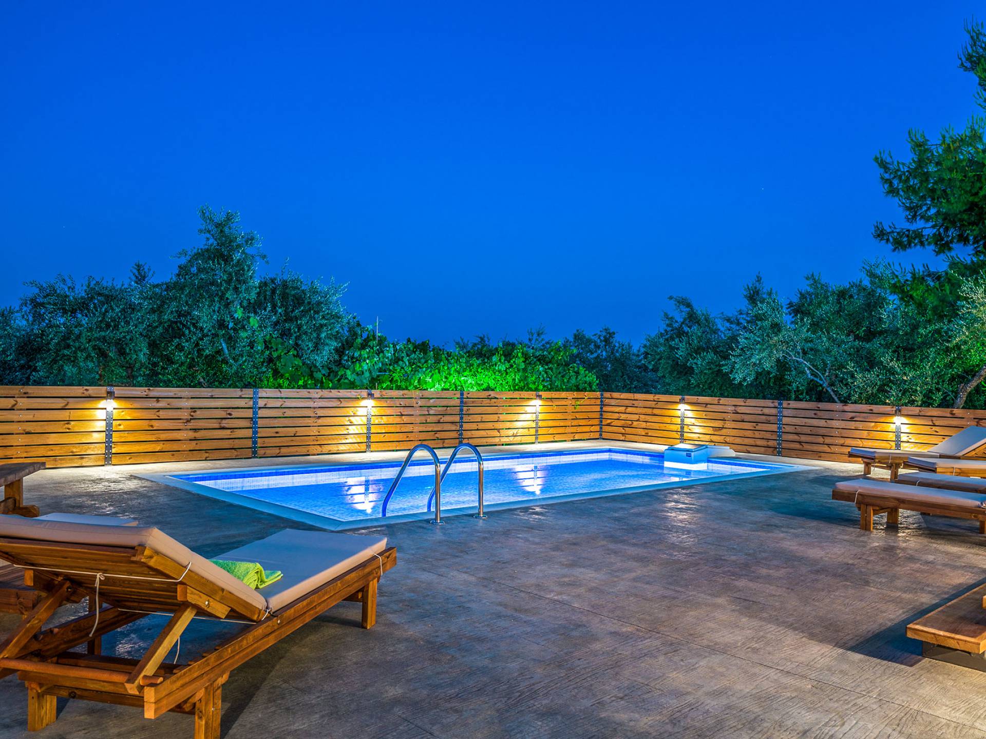 Das Erdgeschoss bietet 3 Schlafzimmer, von denen eines ein Hauptschlafzimmer mit einem Queensize-Bett (160 x 200 cm) und einem eigenen Badezimmer mit Dusche ist. Das zweite Schlafzimmer bietet 2 Einzelbetten (90 x 200 cm), die zu einem Kingsize-Bett (180 x 200 cm) und einem Einzelschlafsofa (75 x 190 cm) verbunden werden können, während das dritte Schlafzimmer 2 Einzelbetten (90 x 200 cm) bietet ), die zu einem Kingsize-Bett (180 x 200 cm) verbunden werden können. Ein paar Stufen in die untere Etage führen zu einem weiteren geräumigen Schlafzimmer mit einem Queensize-Bett (160 x 200 cm) und einem 3-Sitzer-Sofa, das durch einen praktisch mühelosen Betätigungsmechanismus in ein Doppelbett (150 x 210 cm) umgewandelt werden kann. Die vordere möblierte Veranda der Villa Chloe bietet einen privaten Pool und Blick auf den Garten sowie direkten Zugang zum Pool.