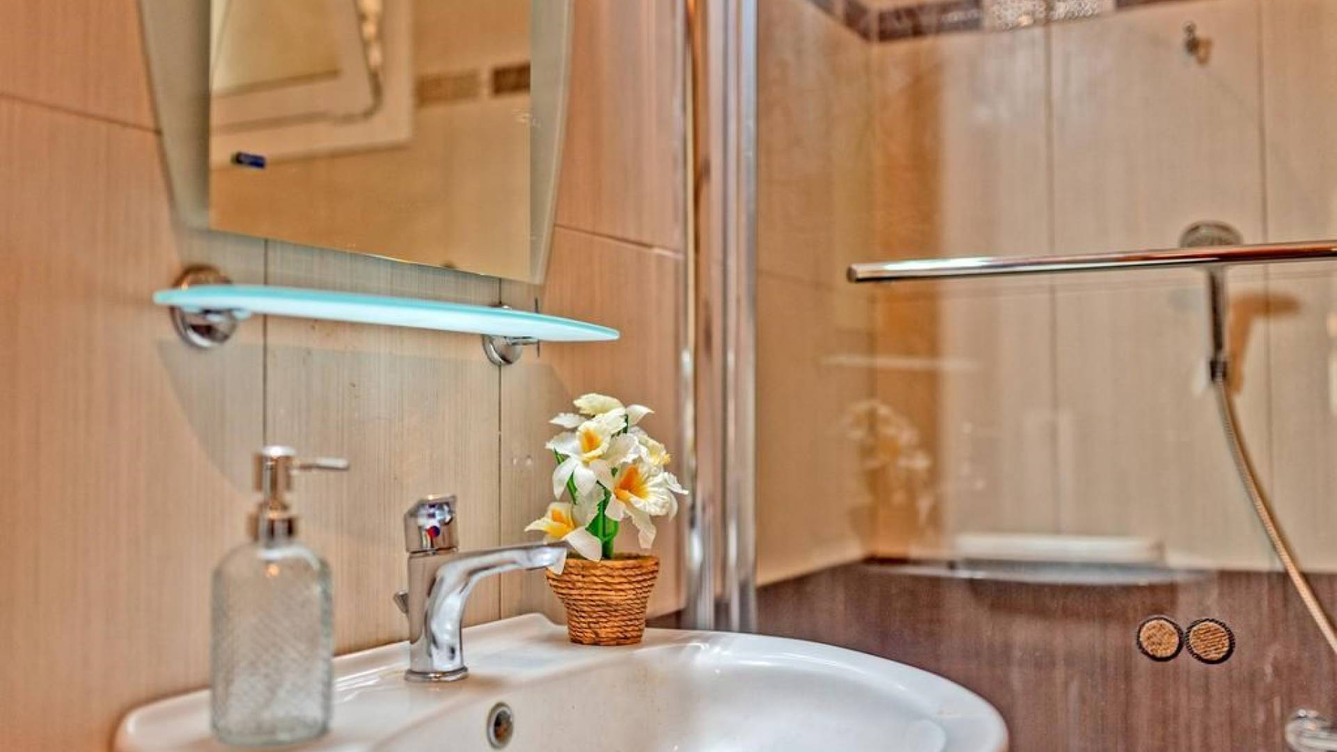 Neben dem Wohnzimmer befindet sich die schöne Küche mit all den modernen Geräten, sodass es ein Kinderspiel ist, frische Funde von den lokalen Märkten zuzubereiten. Es gibt sogar eine Außentür direkt in den Garten. Jedes der drei modernen und schönen Schlafzimmer ist Ihrem Komfort gewidmet, eines davon hat ein eigenes Badezimmer mit Dusche. Ein Bonus ist, dass jedes eine Reihe von Außentüren hat, die Sie direkt auf die Veranda führen.