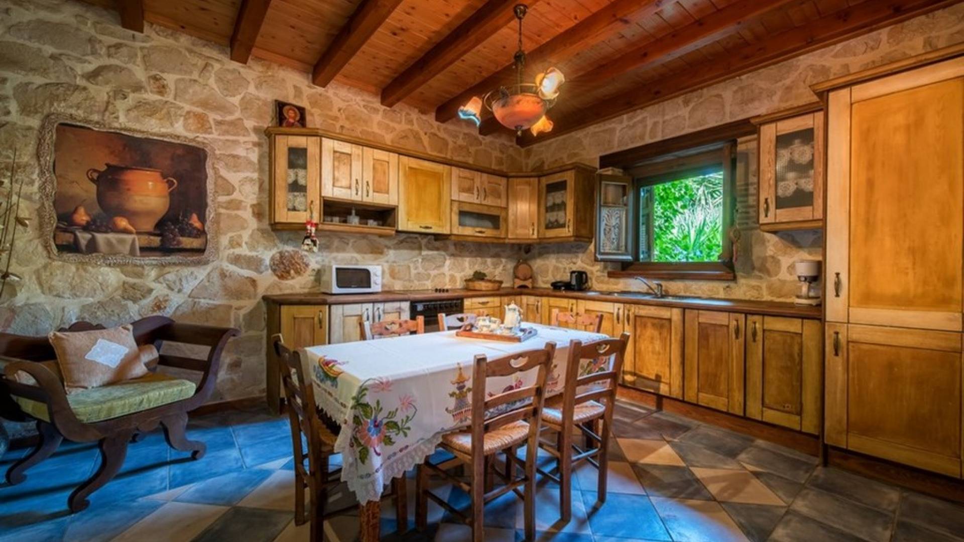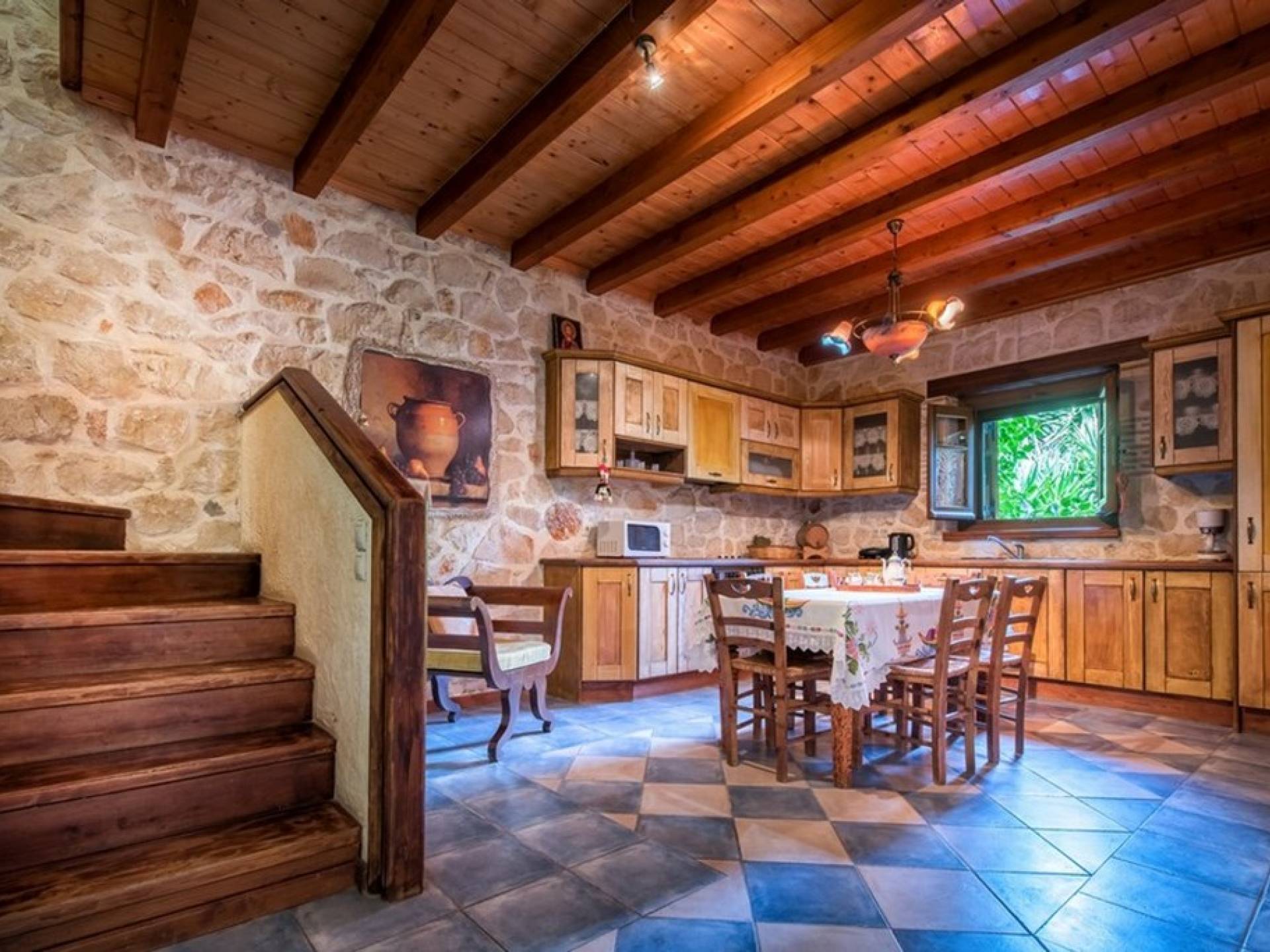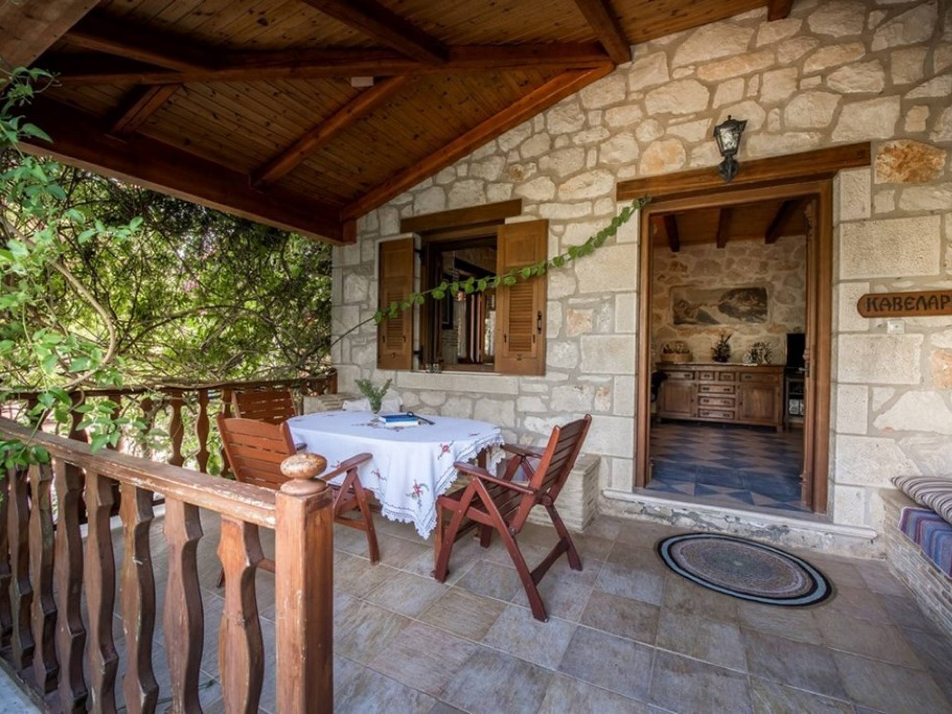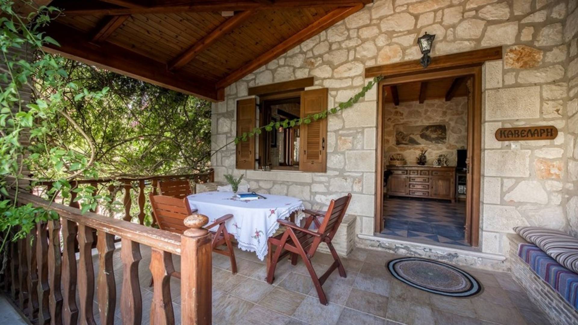 Dieses Haus hat seinen Namen vom Kavelari-Hügel, auf dem das Dorf Tragaki liegt. Das zweistöckige Haus misst 140qm und besteht aus zwei Schlafzimmern, die problemlos 4-6 Personen beherbergen können. Ktima Kourou Tragaki Zante ZakynthosEs ist bekannt für seine herrlichen Malereien an den Steinwänden und die rustikalen Möbel aus Holz und Eisen. Das Erdgeschoss besteht aus einem geräumigen Wohnzimmer mit geschnitzten Holzsofas, einem offenen Kamin, TV, DVD und Musikanlage und ist in schönen traditionellen Farben dekoriert. Die hervorragende, voll ausgestattete, handgefertigte Holzküche enthält einen Backofen, eine Kaffeemaschine, einen Wasserkocher, einen Toaster, einen Mixer und alle Utensilien. Im ersten Stock befinden sich zwei große Schlafzimmer mit einem Doppelbett und zwei Einzelbetten, beide mit handgeschnitzten Holzbetten und handgemachter Bettwäsche. Die Schlafzimmer verfügen über ein eigenes Badezimmer und einen eigenen möblierten Balkon mit Blick auf die malerische Landschaft.