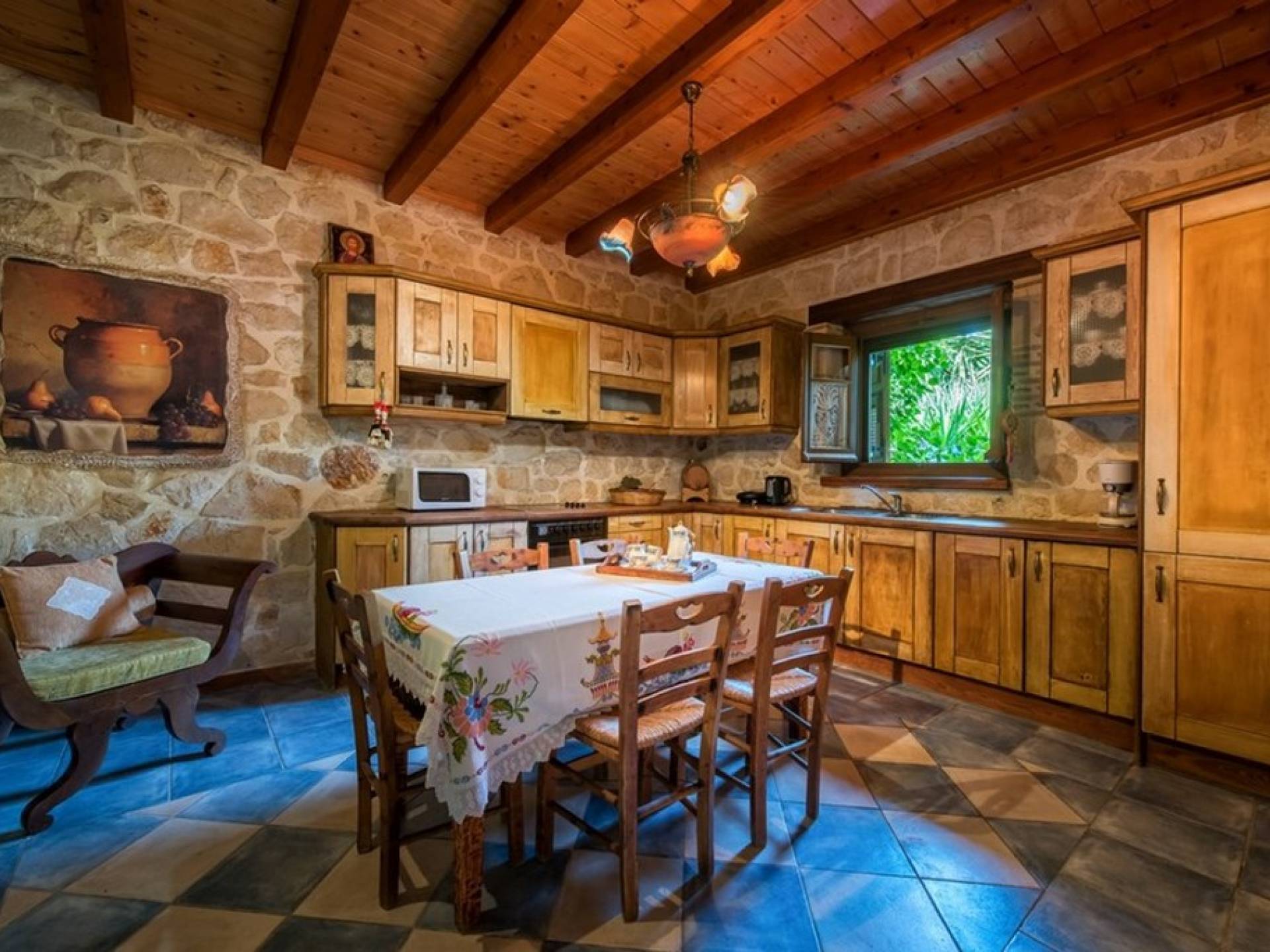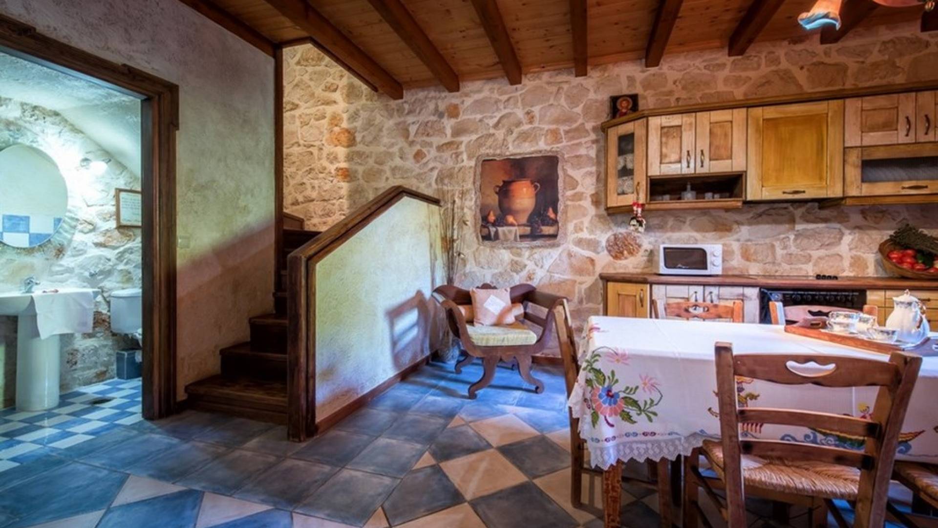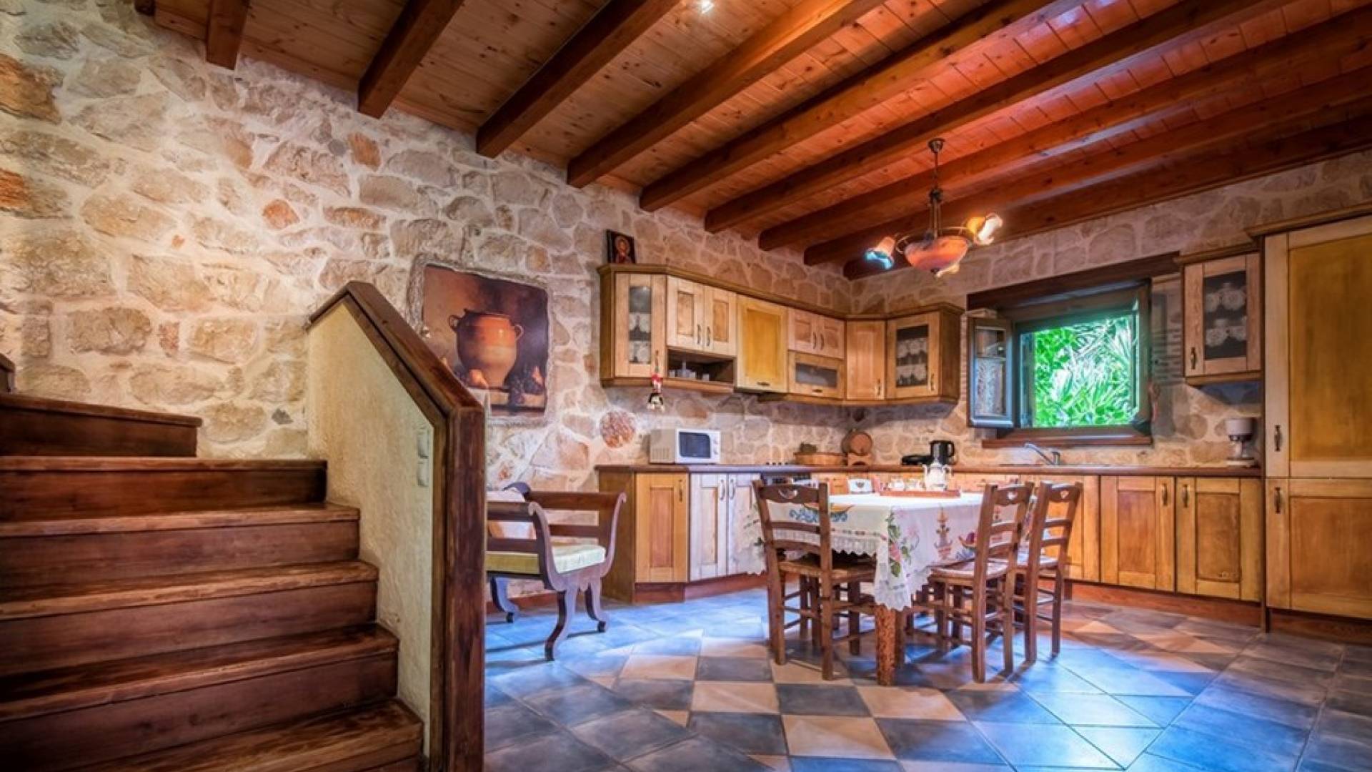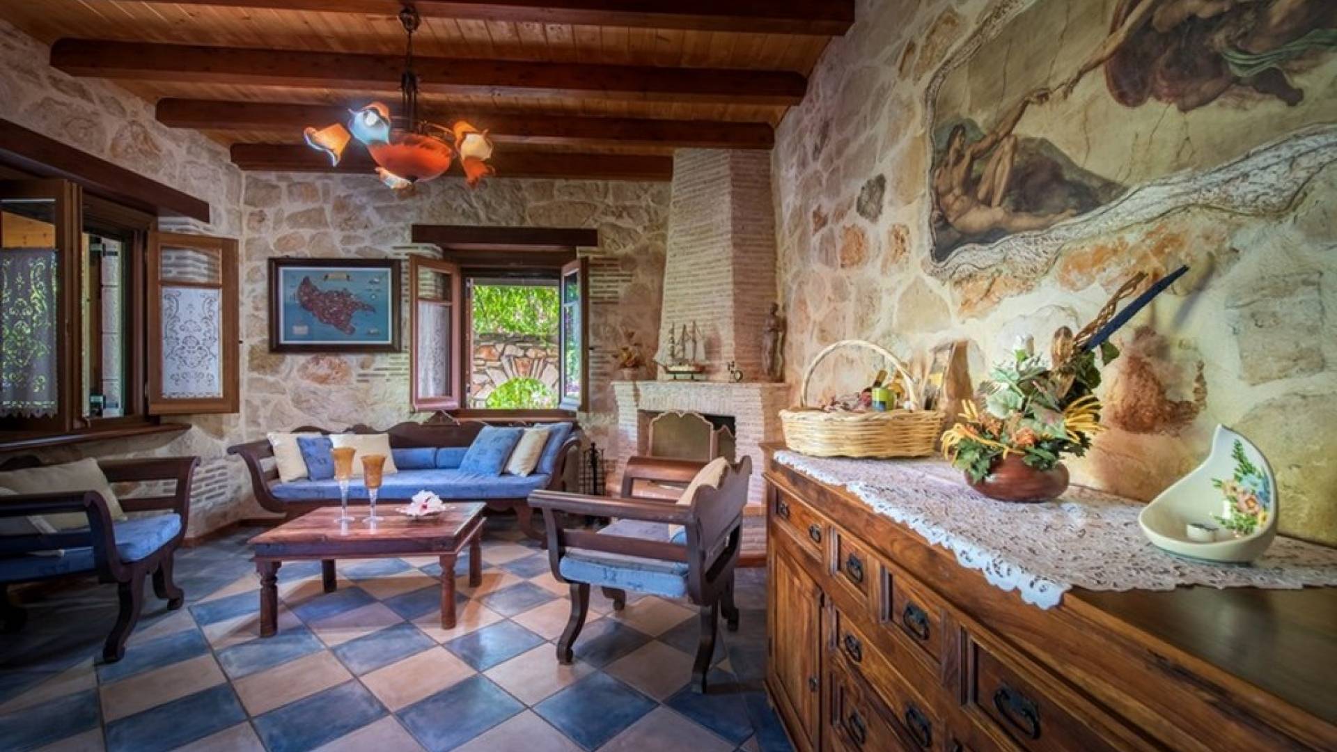 Dieses Haus hat seinen Namen vom Kavelari-Hügel, auf dem das Dorf Tragaki liegt. Das zweistöckige Haus misst 140qm und besteht aus zwei Schlafzimmern, die problemlos 4-6 Personen beherbergen können. Ktima Kourou Tragaki Zante ZakynthosEs ist bekannt für seine herrlichen Malereien an den Steinwänden und die rustikalen Möbel aus Holz und Eisen. Das Erdgeschoss besteht aus einem geräumigen Wohnzimmer mit geschnitzten Holzsofas, einem offenen Kamin, TV, DVD und Musikanlage und ist in schönen traditionellen Farben dekoriert. Die hervorragende, voll ausgestattete, handgefertigte Holzküche enthält einen Backofen, eine Kaffeemaschine, einen Wasserkocher, einen Toaster, einen Mixer und alle Utensilien. Im ersten Stock befinden sich zwei große Schlafzimmer mit einem Doppelbett und zwei Einzelbetten, beide mit handgeschnitzten Holzbetten und handgemachter Bettwäsche. Die Schlafzimmer verfügen über ein eigenes Badezimmer und einen eigenen möblierten Balkon mit Blick auf die malerische Landschaft.