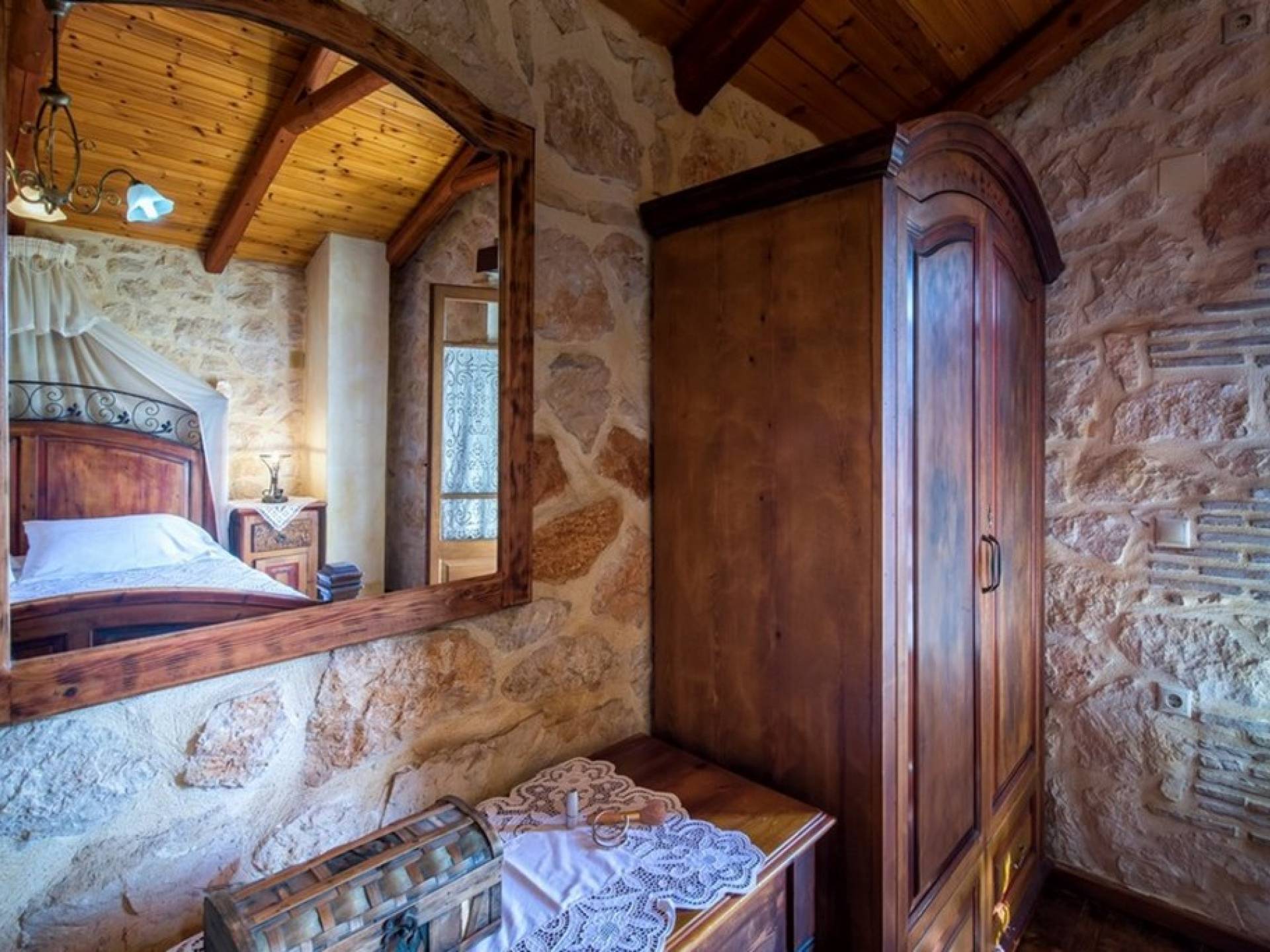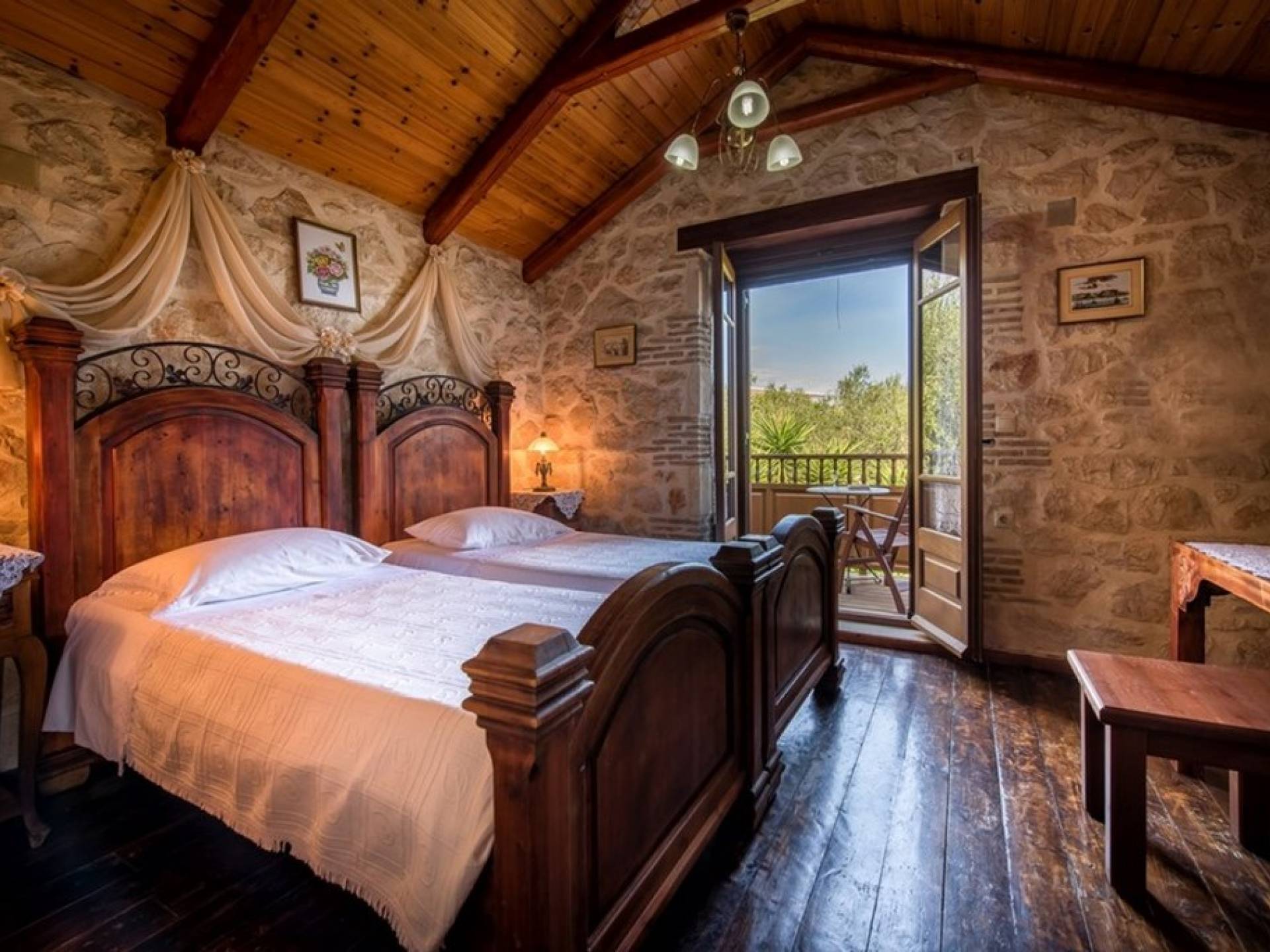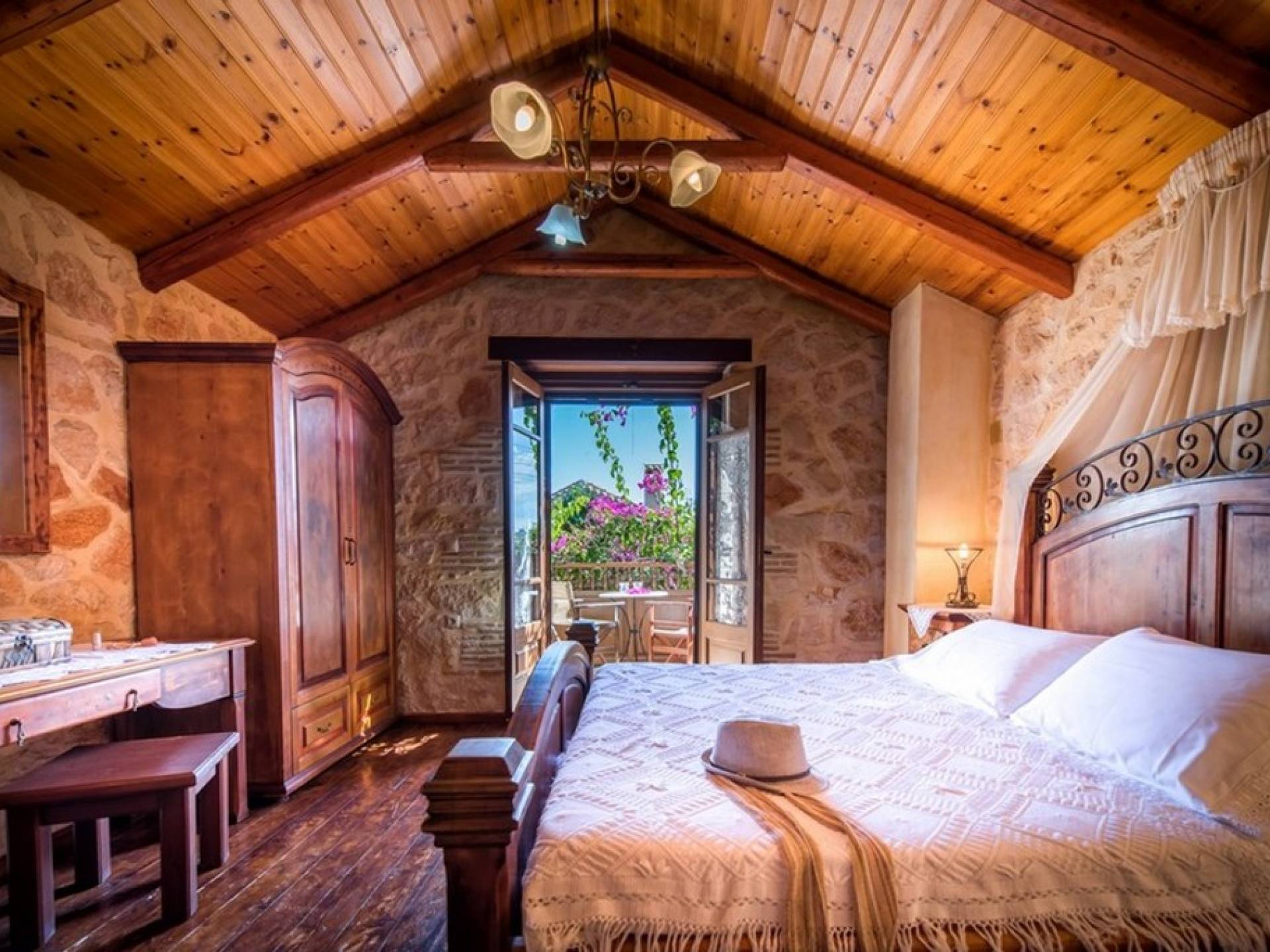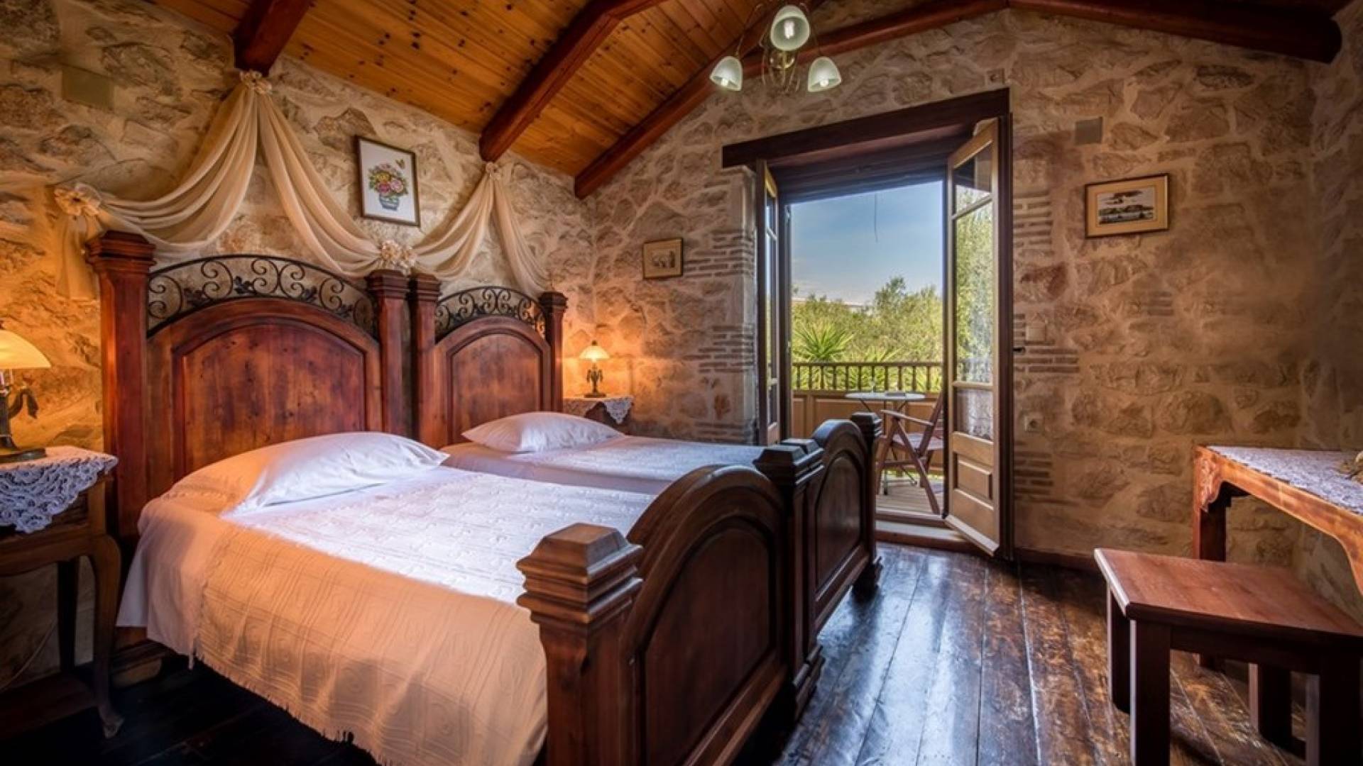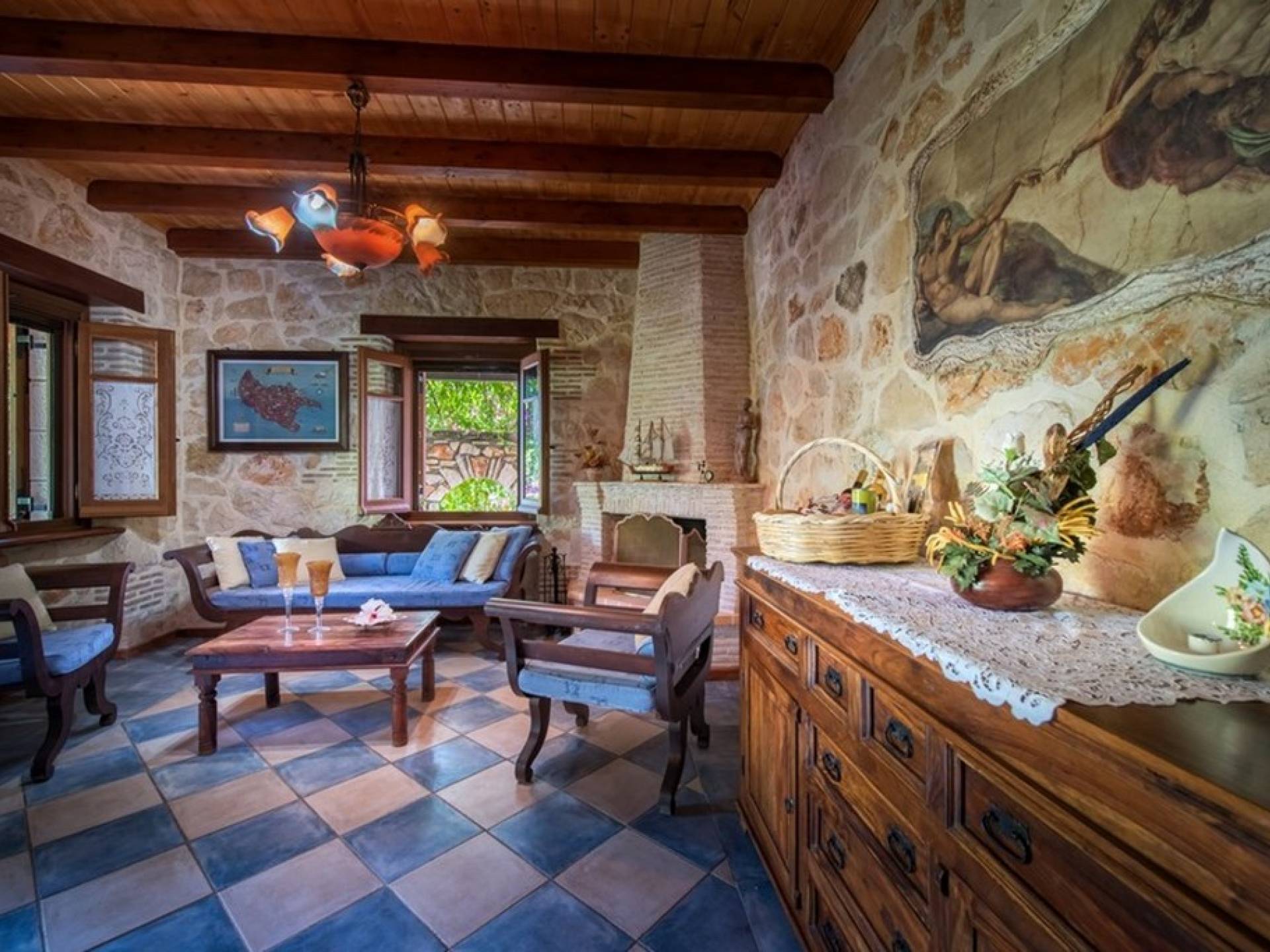 Dieses Haus hat seinen Namen vom Kavelari-Hügel, auf dem das Dorf Tragaki liegt. Das zweistöckige Haus misst 140qm und besteht aus zwei Schlafzimmern, die problemlos 4-6 Personen beherbergen können. Ktima Kourou Tragaki Zante ZakynthosEs ist bekannt für seine herrlichen Malereien an den Steinwänden und die rustikalen Möbel aus Holz und Eisen. Das Erdgeschoss besteht aus einem geräumigen Wohnzimmer mit geschnitzten Holzsofas, einem offenen Kamin, TV, DVD und Musikanlage und ist in schönen traditionellen Farben dekoriert. Die hervorragende, voll ausgestattete, handgefertigte Holzküche enthält einen Backofen, eine Kaffeemaschine, einen Wasserkocher, einen Toaster, einen Mixer und alle Utensilien. Im ersten Stock befinden sich zwei große Schlafzimmer mit einem Doppelbett und zwei Einzelbetten, beide mit handgeschnitzten Holzbetten und handgemachter Bettwäsche. Die Schlafzimmer verfügen über ein eigenes Badezimmer und einen eigenen möblierten Balkon mit Blick auf die malerische Landschaft.