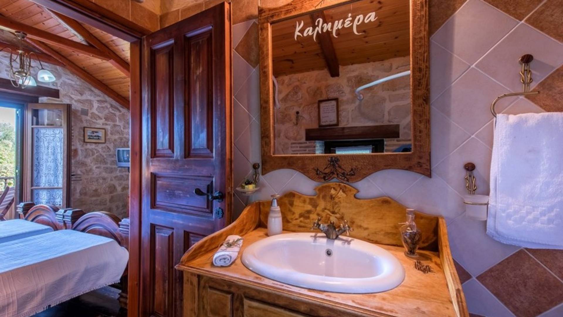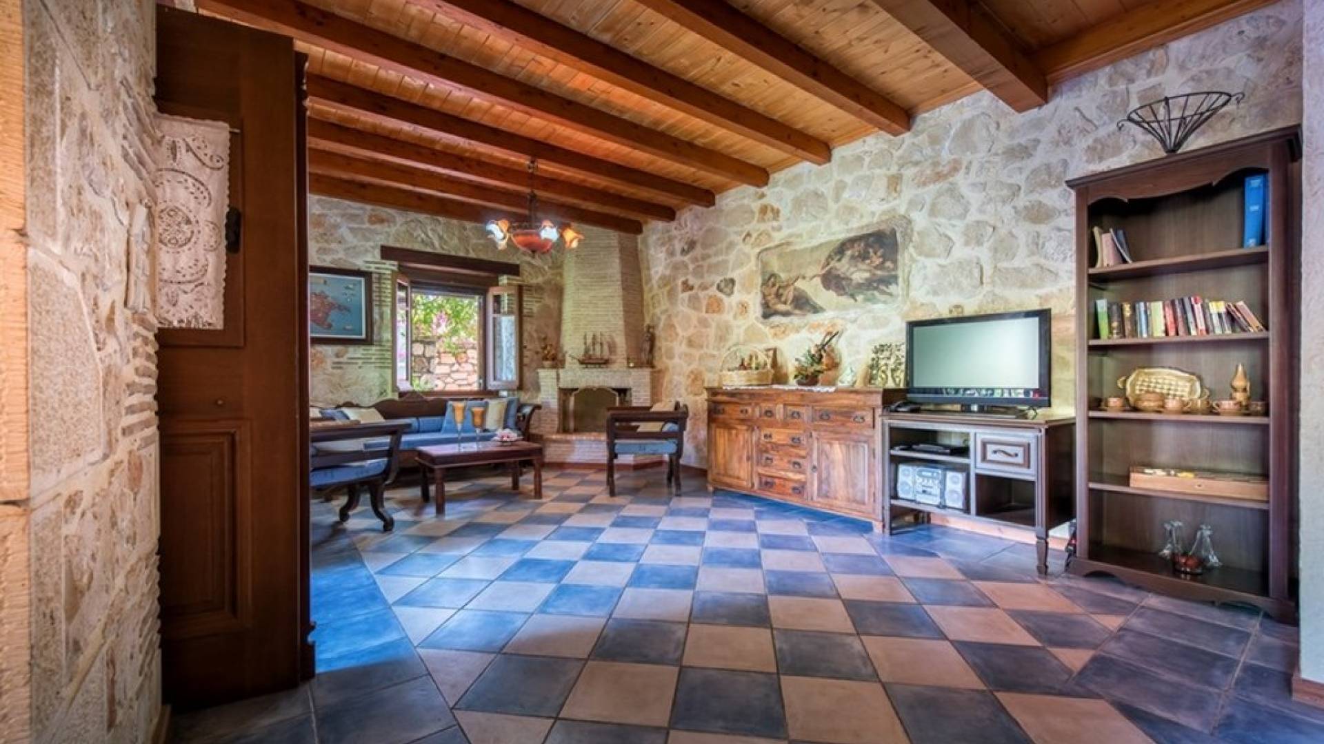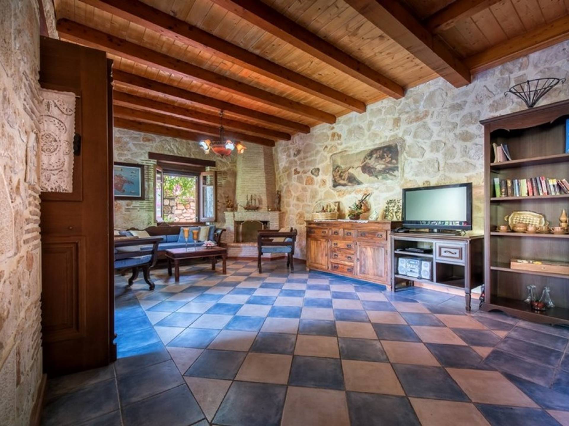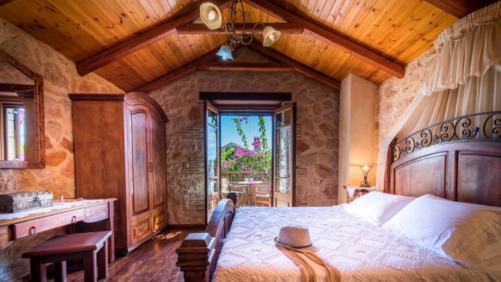 Dieses Haus hat seinen Namen vom Kavelari-Hügel, auf dem das Dorf Tragaki liegt. Das zweistöckige Haus misst 140qm und besteht aus zwei Schlafzimmern, die problemlos 4-6 Personen beherbergen können. Ktima Kourou Tragaki Zante ZakynthosEs ist bekannt für seine herrlichen Malereien an den Steinwänden und die rustikalen Möbel aus Holz und Eisen. Das Erdgeschoss besteht aus einem geräumigen Wohnzimmer mit geschnitzten Holzsofas, einem offenen Kamin, TV, DVD und Musikanlage und ist in schönen traditionellen Farben dekoriert. Die hervorragende, voll ausgestattete, handgefertigte Holzküche enthält einen Backofen, eine Kaffeemaschine, einen Wasserkocher, einen Toaster, einen Mixer und alle Utensilien. Im ersten Stock befinden sich zwei große Schlafzimmer mit einem Doppelbett und zwei Einzelbetten, beide mit handgeschnitzten Holzbetten und handgemachter Bettwäsche. Die Schlafzimmer verfügen über ein eigenes Badezimmer und einen eigenen möblierten Balkon mit Blick auf die malerische Landschaft.