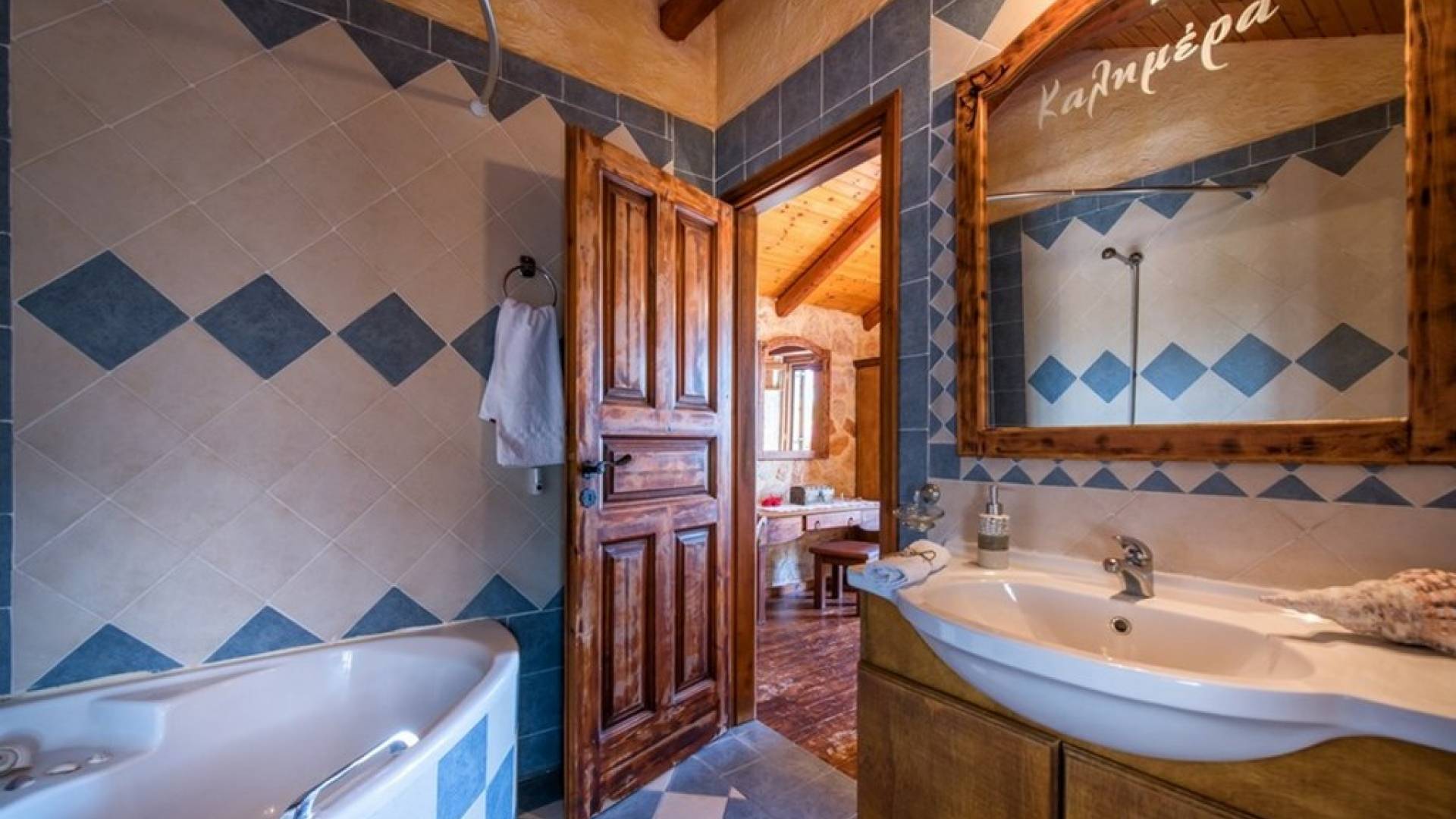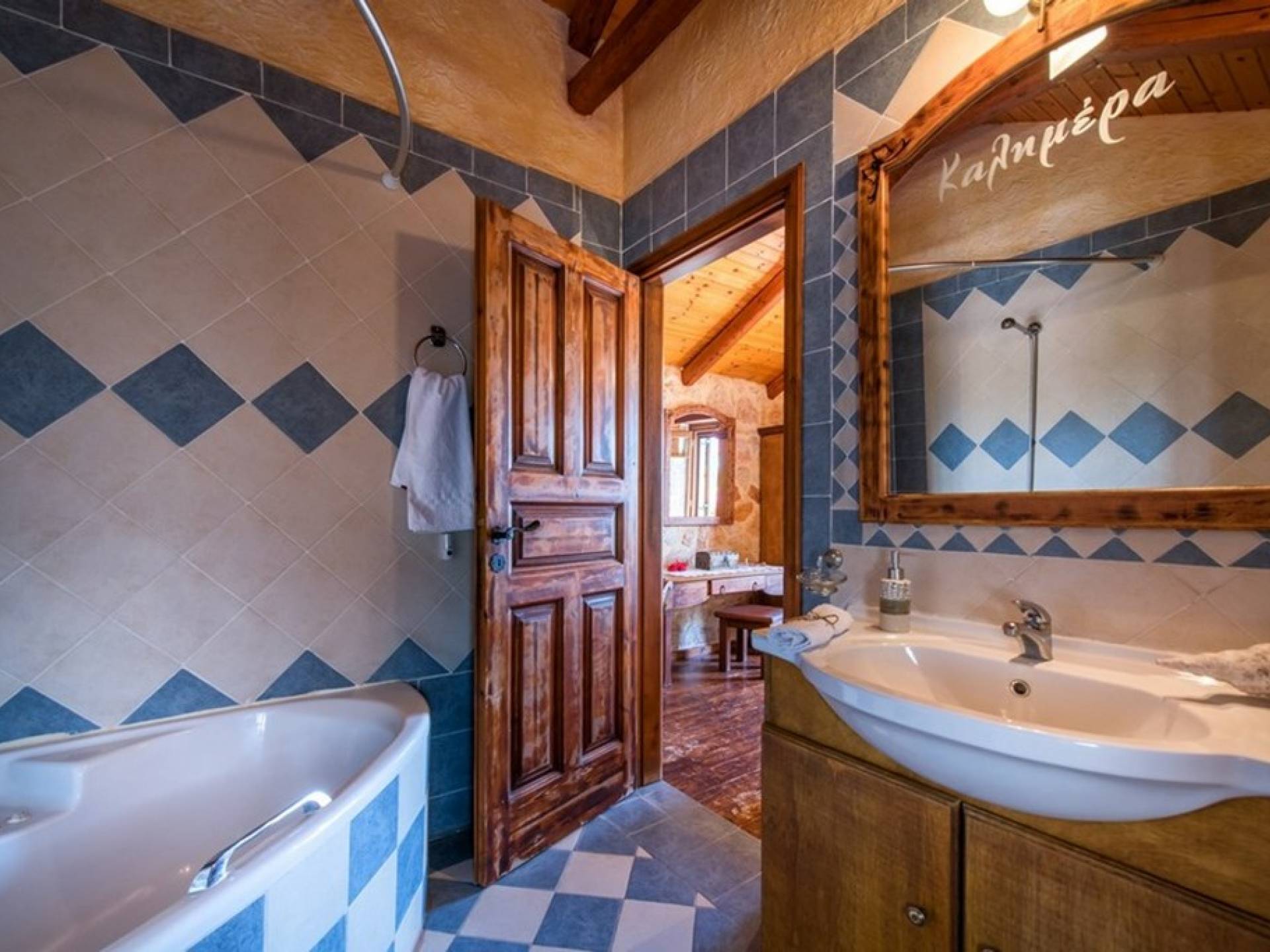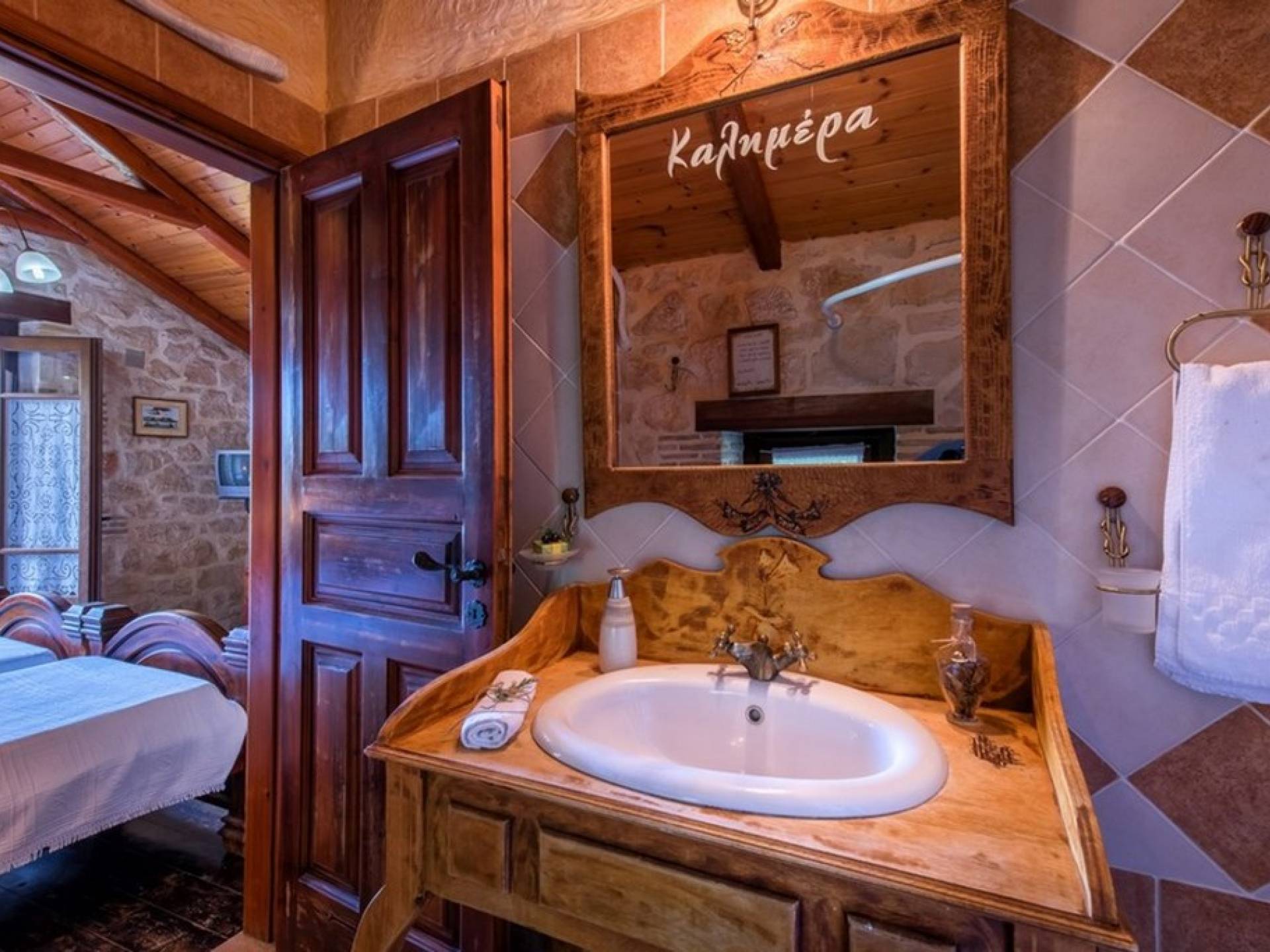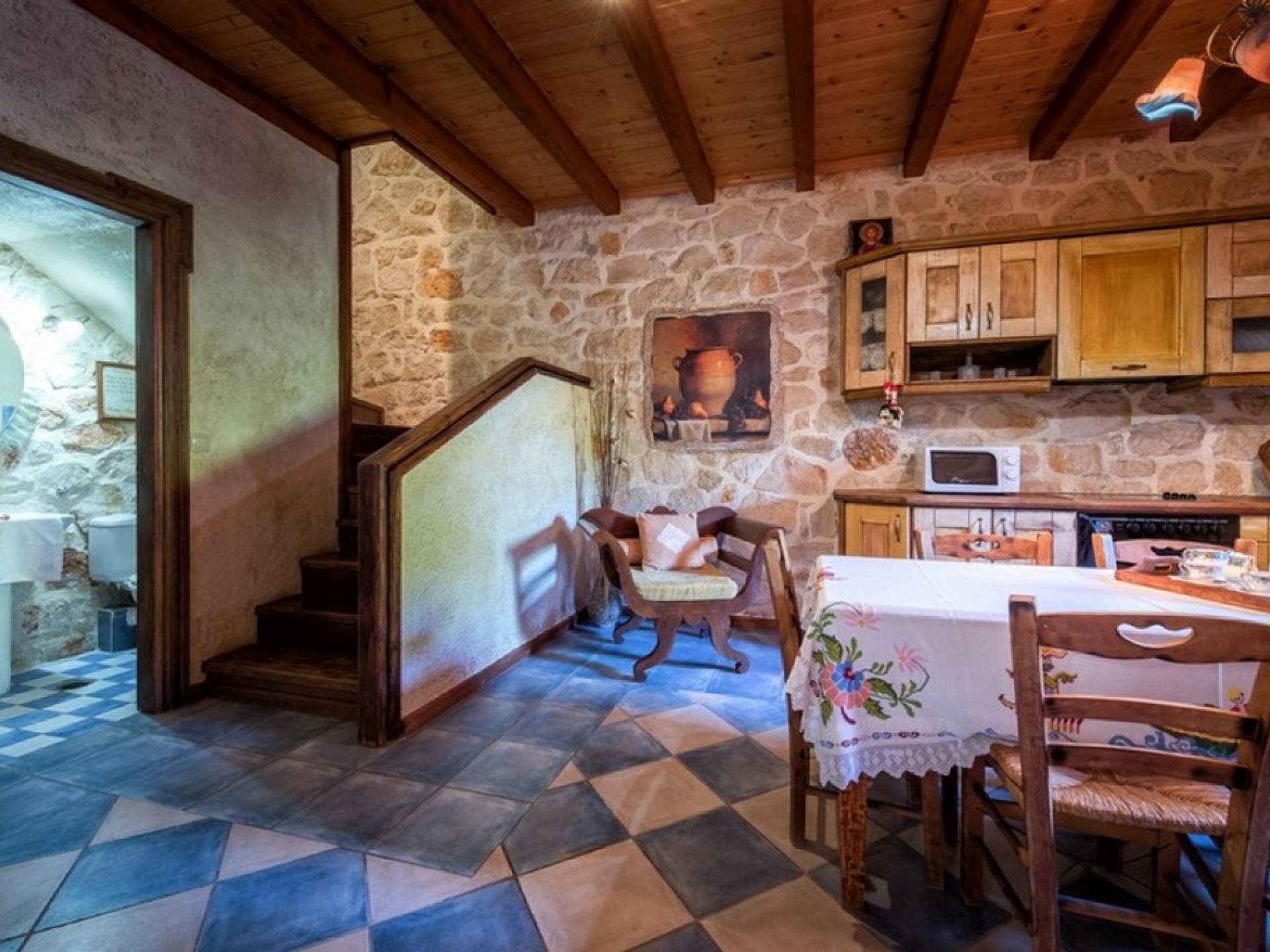 Dieses Haus hat seinen Namen vom Kavelari-Hügel, auf dem das Dorf Tragaki liegt. Das zweistöckige Haus misst 140qm und besteht aus zwei Schlafzimmern, die problemlos 4-6 Personen beherbergen können. Ktima Kourou Tragaki Zante ZakynthosEs ist bekannt für seine herrlichen Malereien an den Steinwänden und die rustikalen Möbel aus Holz und Eisen. Das Erdgeschoss besteht aus einem geräumigen Wohnzimmer mit geschnitzten Holzsofas, einem offenen Kamin, TV, DVD und Musikanlage und ist in schönen traditionellen Farben dekoriert. Die hervorragende, voll ausgestattete, handgefertigte Holzküche enthält einen Backofen, eine Kaffeemaschine, einen Wasserkocher, einen Toaster, einen Mixer und alle Utensilien. Im ersten Stock befinden sich zwei große Schlafzimmer mit einem Doppelbett und zwei Einzelbetten, beide mit handgeschnitzten Holzbetten und handgemachter Bettwäsche. Die Schlafzimmer verfügen über ein eigenes Badezimmer und einen eigenen möblierten Balkon mit Blick auf die malerische Landschaft.