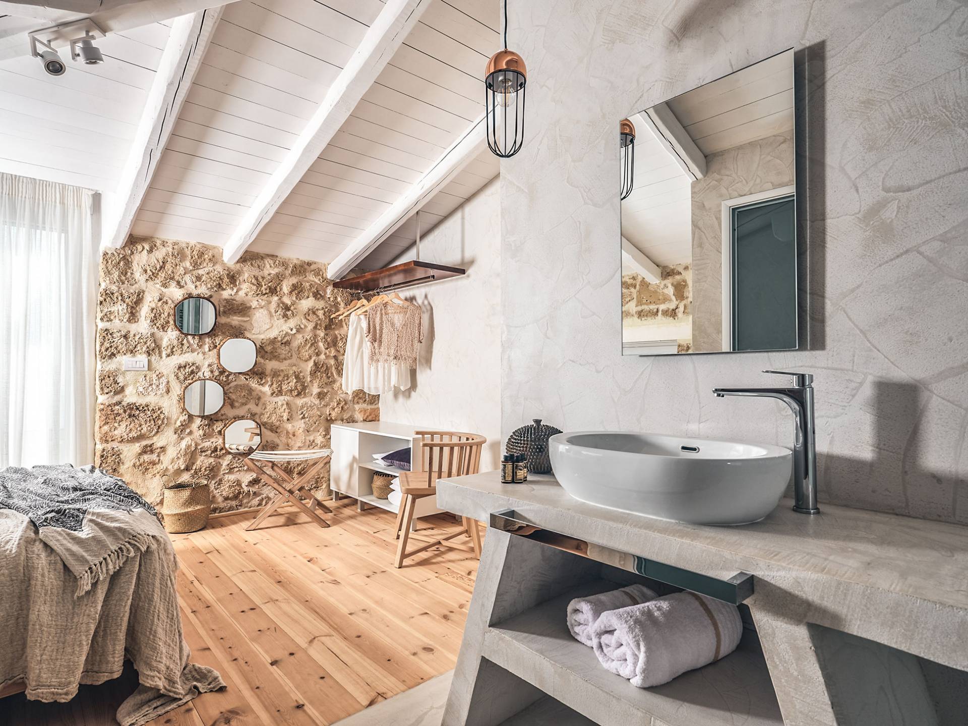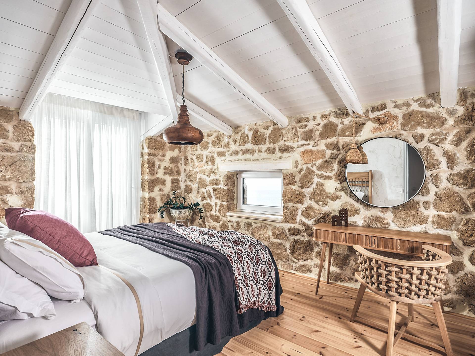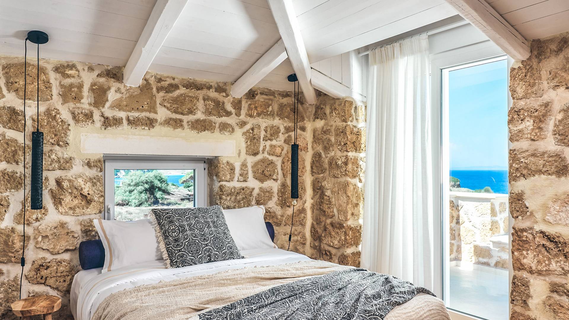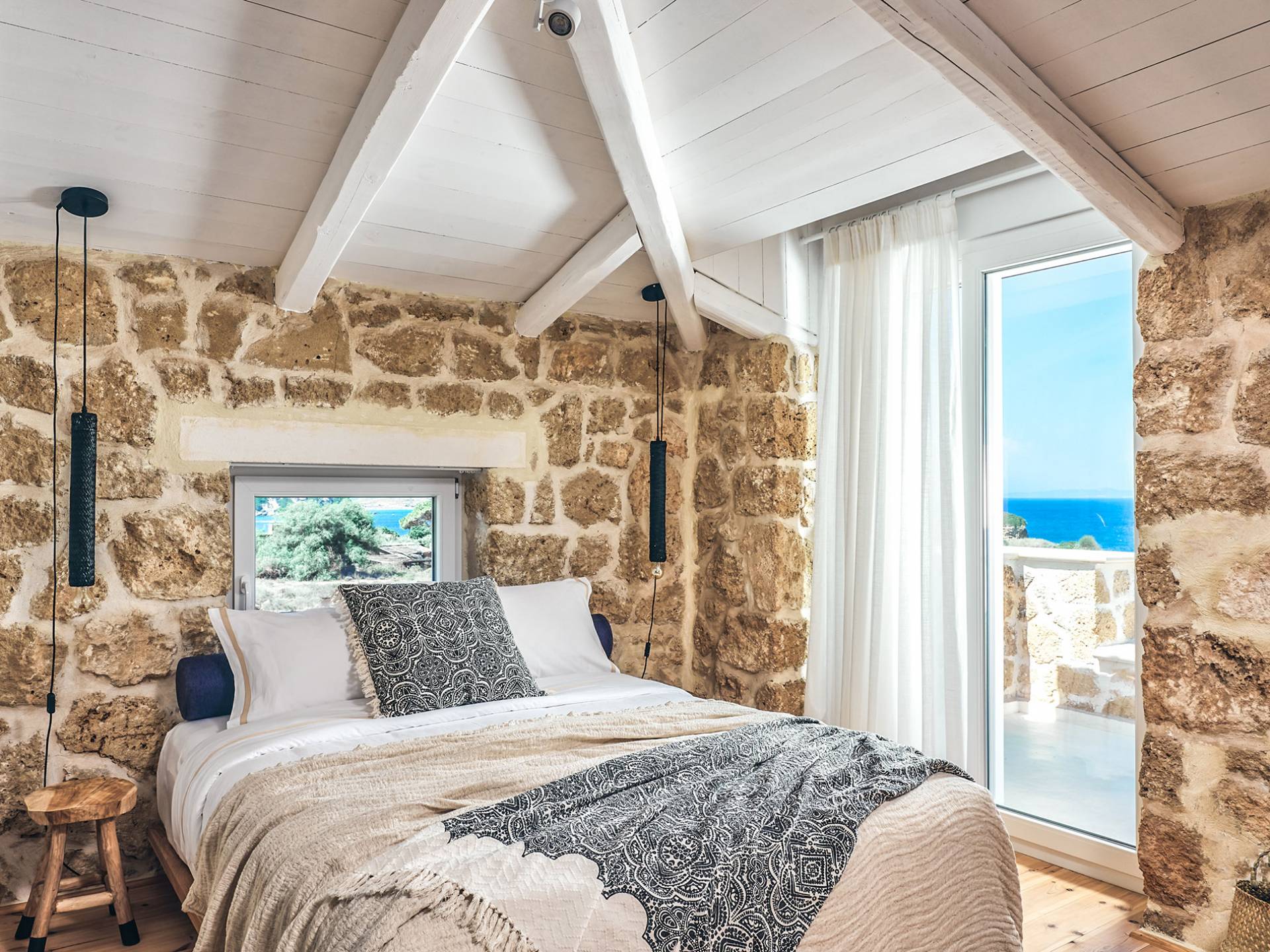 Villa K1 in Arismari Villas hat zwei Etagen und ein geräumiges Loft. Im ersten Stock befinden sich zwei große Schlafzimmer mit eigenem Bad. Die zweite Etage umfasst eine Küche, ein Wohnzimmer und ein gemeinsames Badezimmer. Das Loft umfasst zwei Schlafzimmer mit eigenem Bad und bietet einen atemberaubenden Blick auf das Ionische Meer.