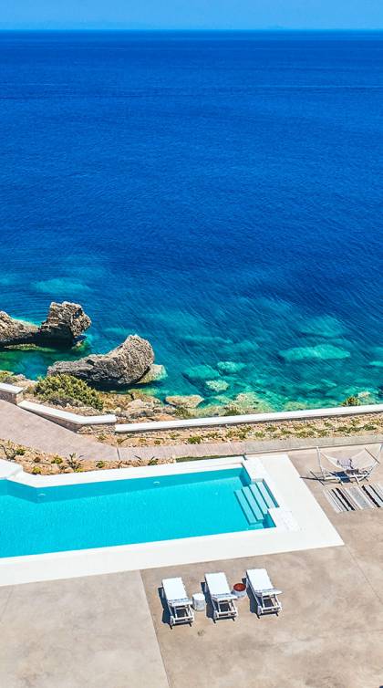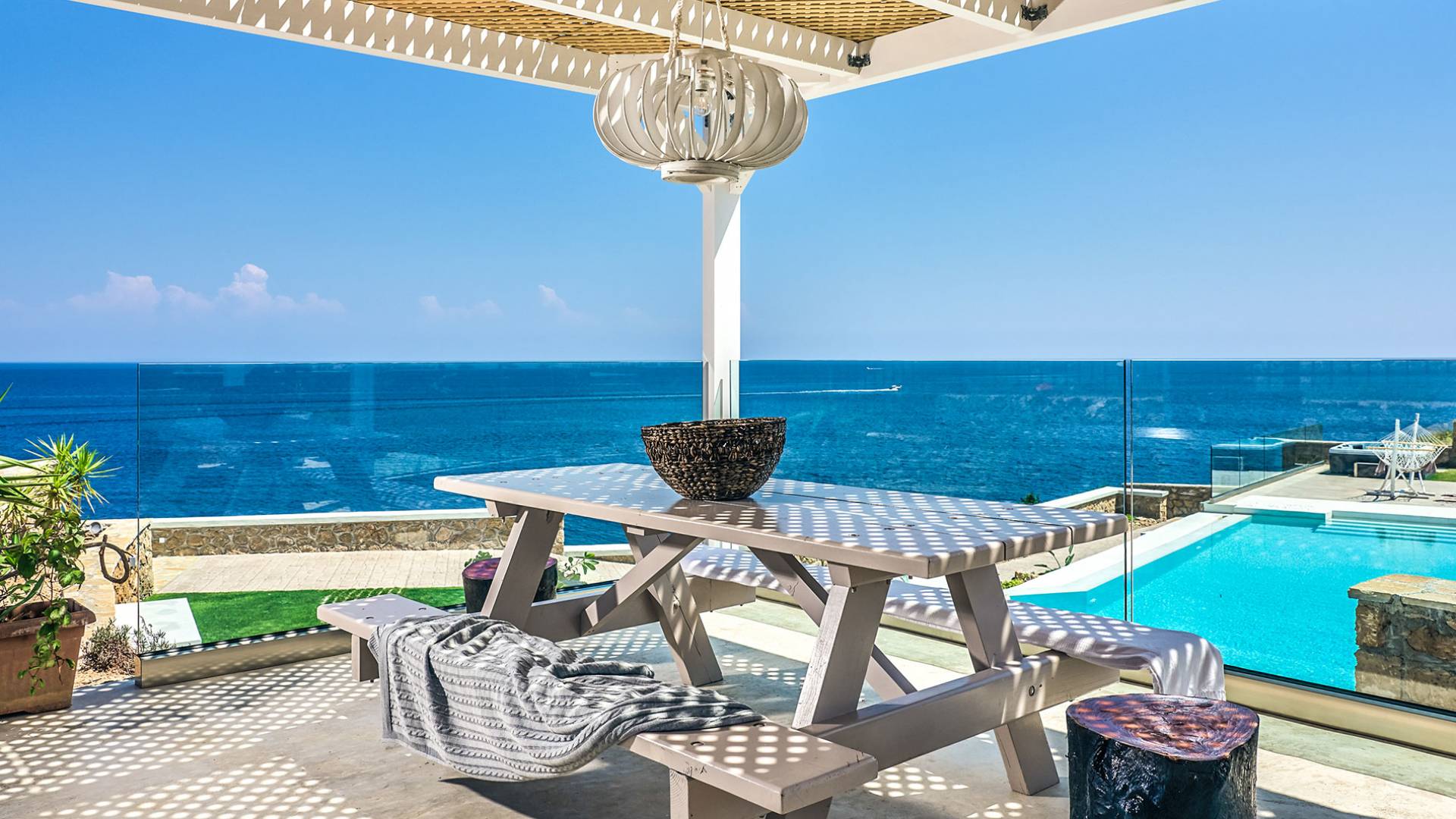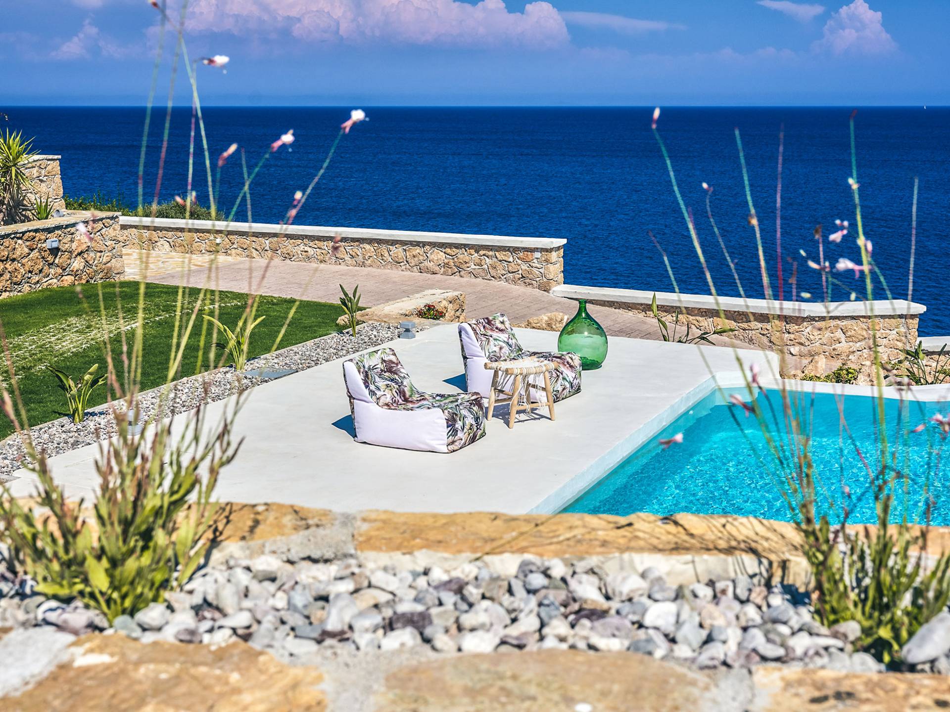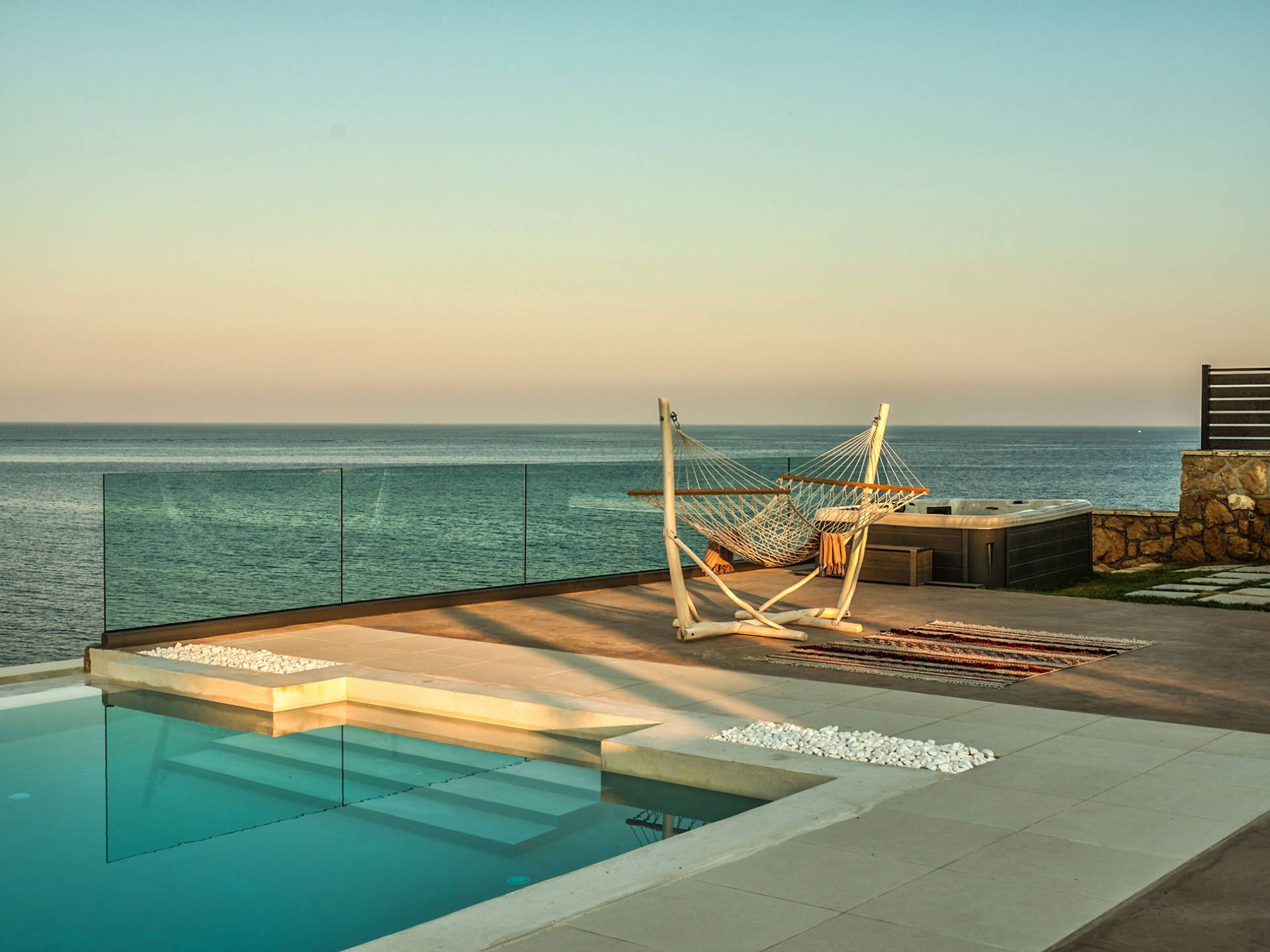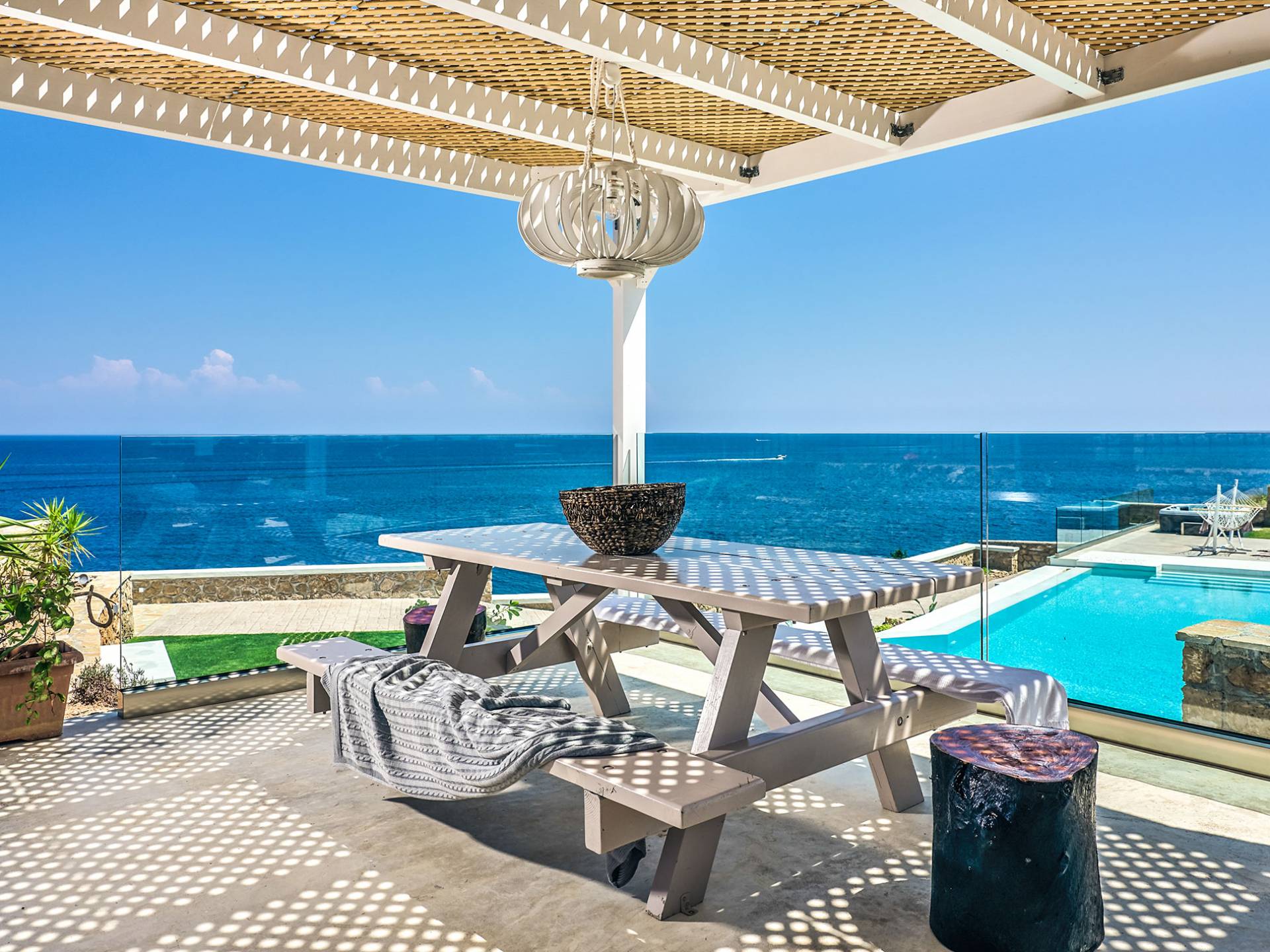 Der Außenbereich ist ein riesiger Hof, der direkt am Meer gebaut wurde. Es beinhaltet alles, was Sie brauchen, um Ihren Aufenthalt in der Arismari Villa zu genießen und zu entspannen. Die bedeutendste Einrichtung des Ortes ist ein großer unendlicher Swimmingpool, in dem Sie sich entspannen können, während Sie auf das Meer und den Horizont blicken. In der Nähe finden Sie auch einen Grill, falls Sie einfach einen ganzen Tag in der Villa verbringen möchten, entspannen, träumen, schwimmen, kochen, essen, schlafen.