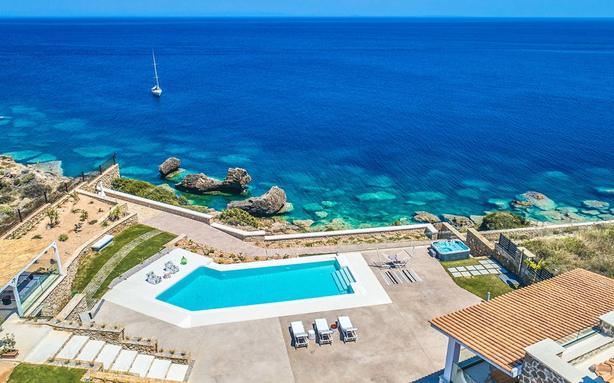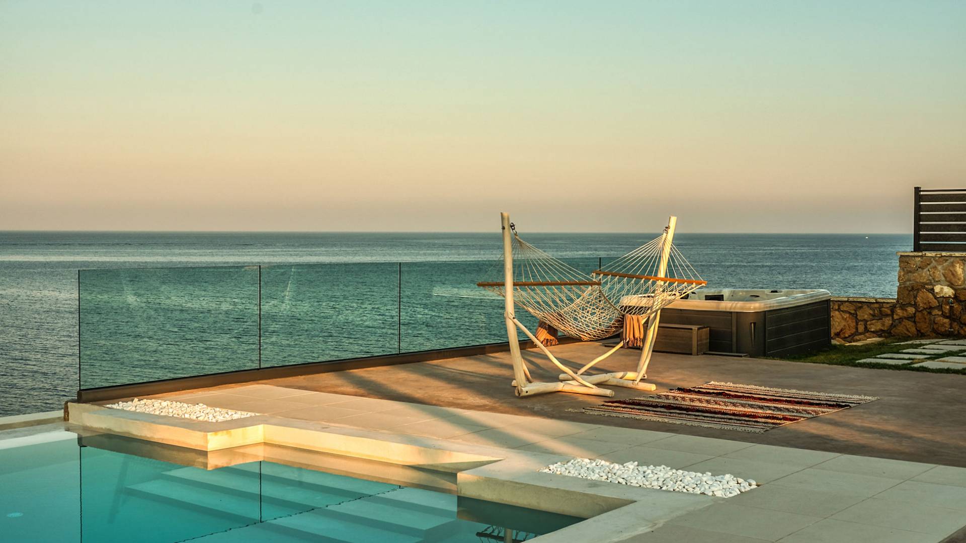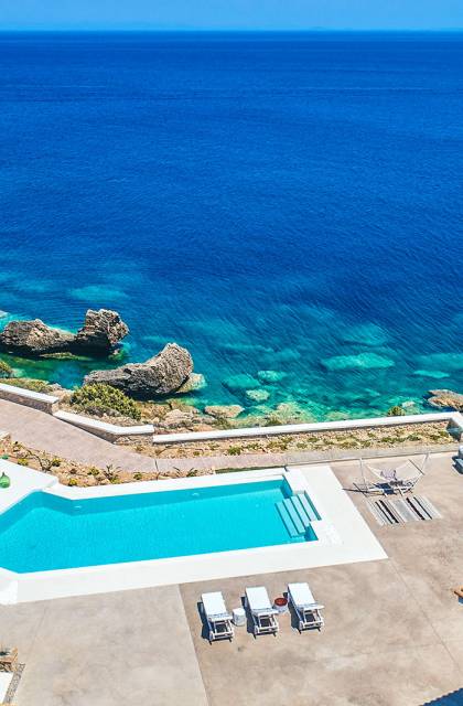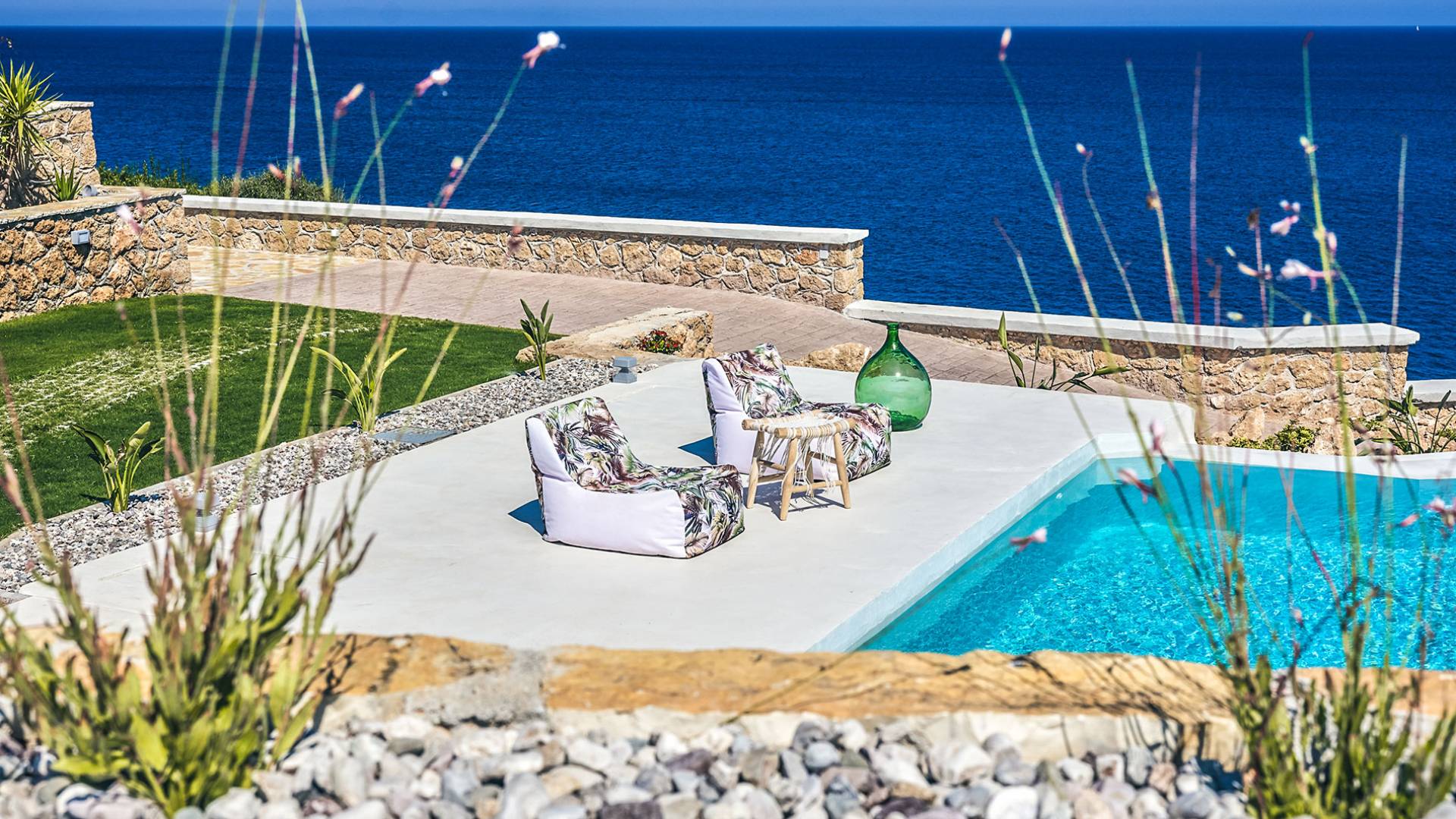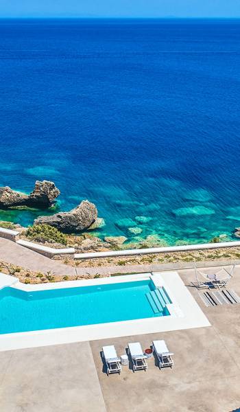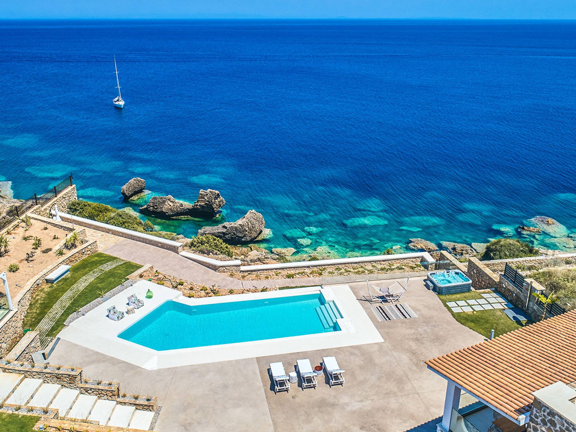 Der Außenbereich ist ein riesiger Hof, der direkt am Meer gebaut wurde. Es beinhaltet alles, was Sie brauchen, um Ihren Aufenthalt in der Arismari Villa zu genießen und zu entspannen. Die bedeutendste Einrichtung des Ortes ist ein großer unendlicher Swimmingpool, in dem Sie sich entspannen können, während Sie auf das Meer und den Horizont blicken. In der Nähe finden Sie auch einen Grill, falls Sie einfach einen ganzen Tag in der Villa verbringen möchten, entspannen, träumen, schwimmen, kochen, essen, schlafen.