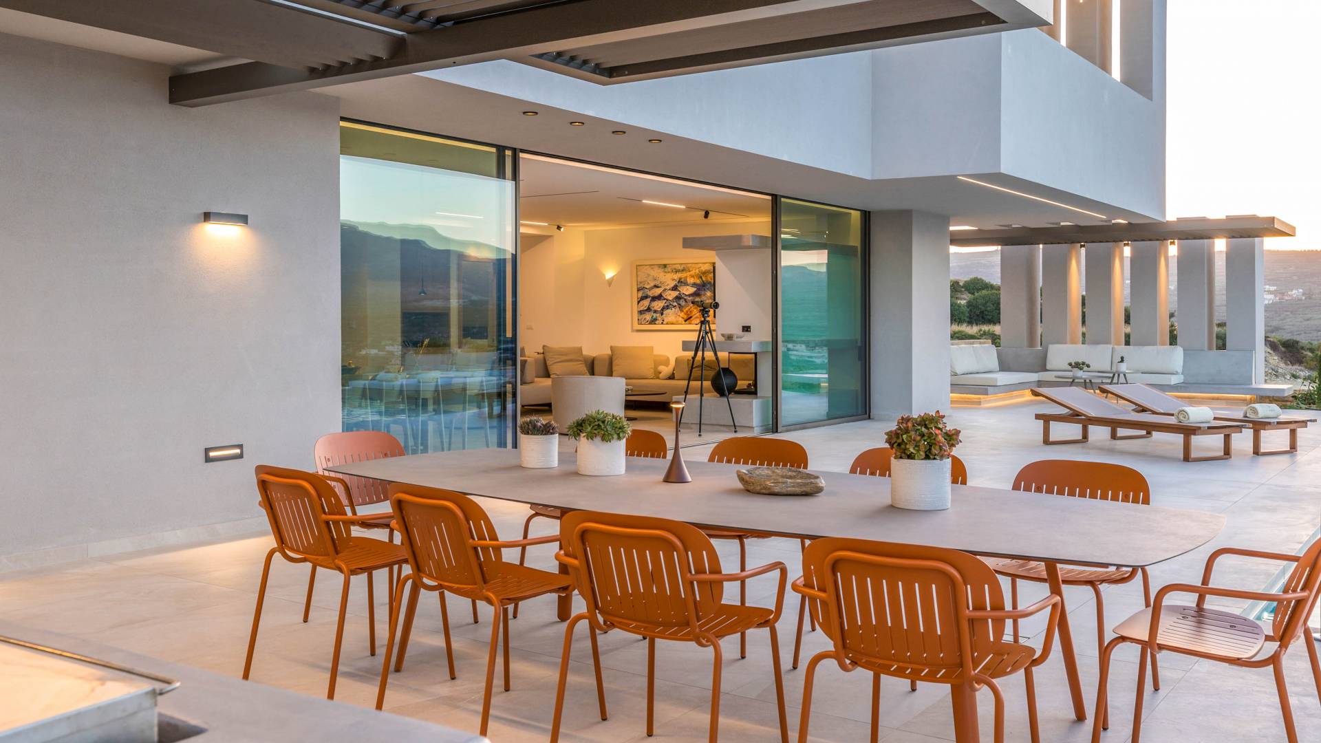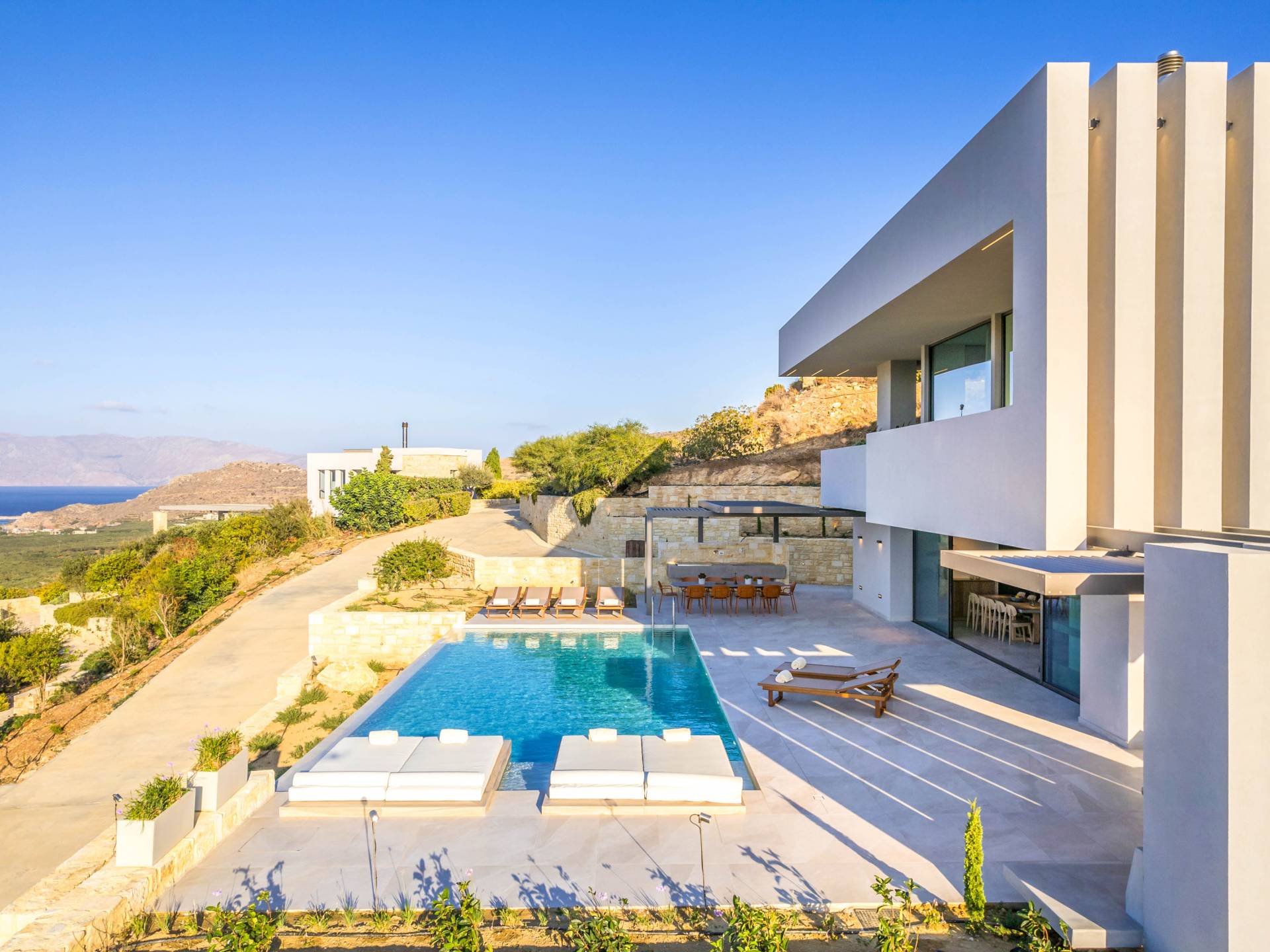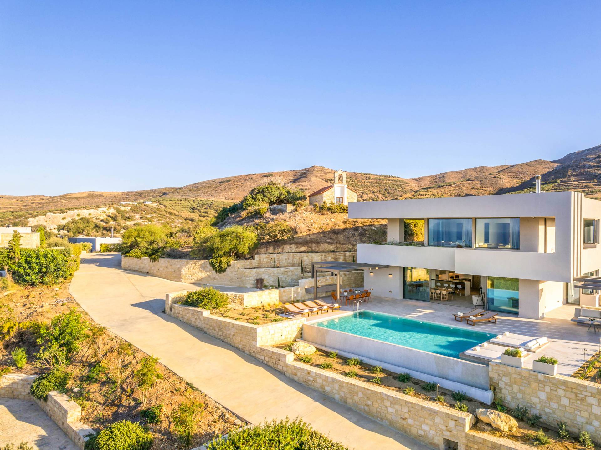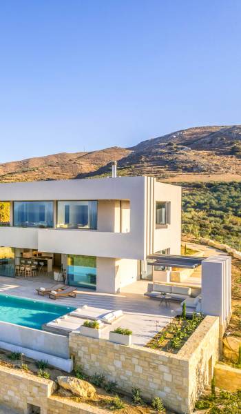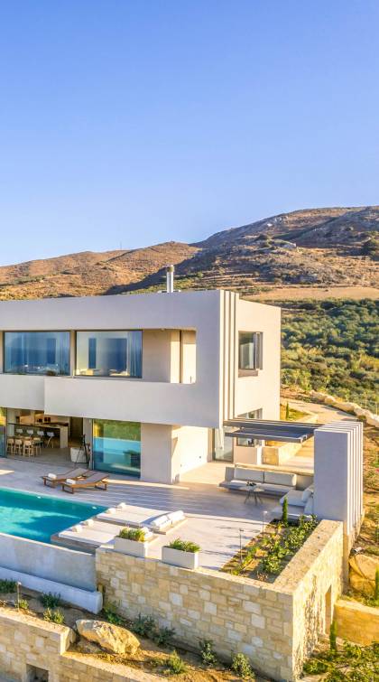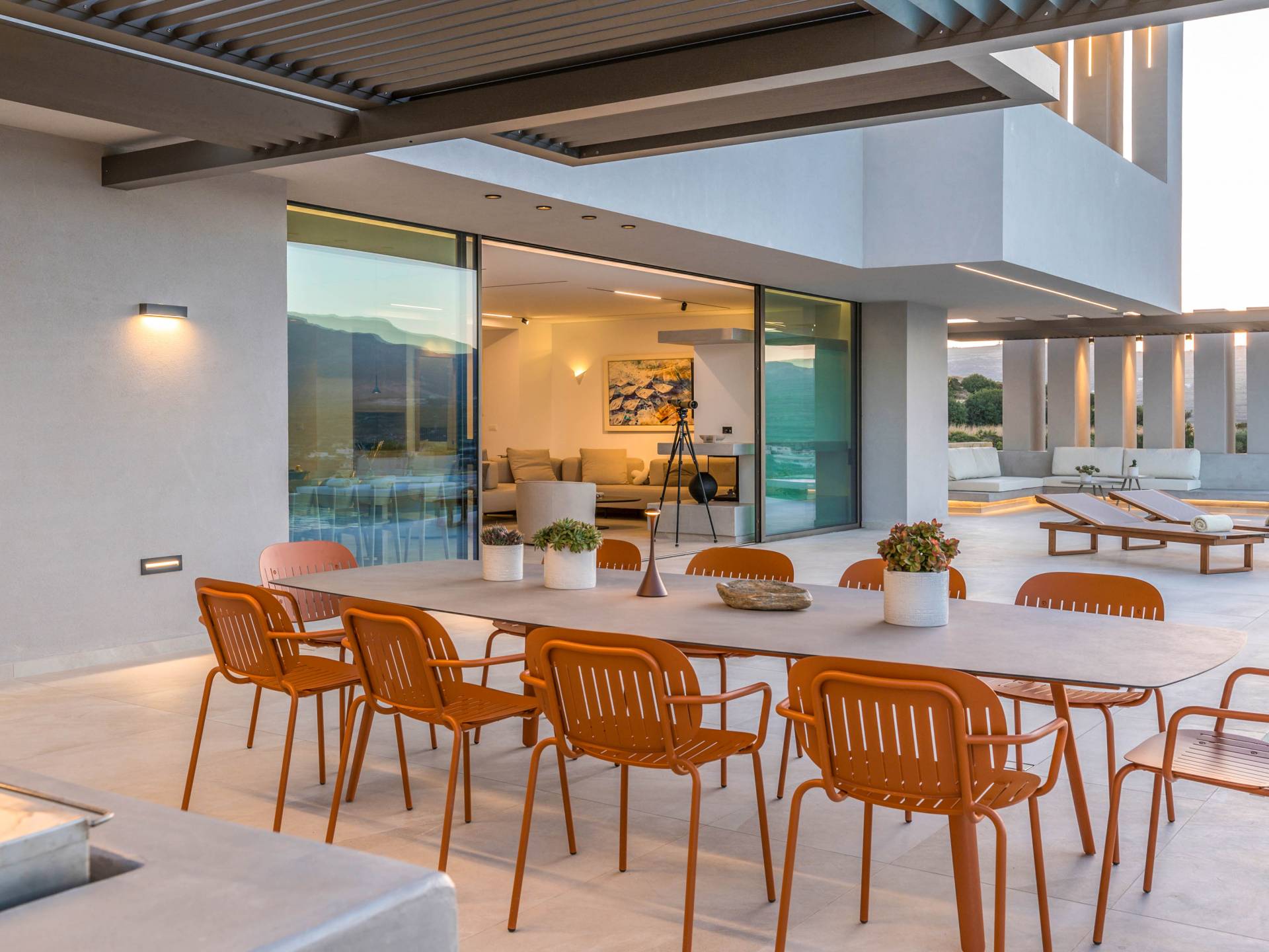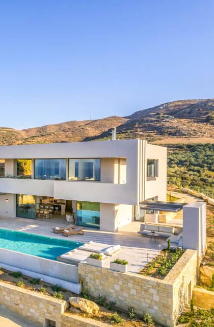 Die elegante Struktur der Villa fügt sich nahtlos in die Landschaft ein und präsentiert ein raffiniertes Äußeres, das das schicke, durchdacht gestaltete Innere ergänzt. Jedes Schlafzimmer öffnet sich auf eine private Terrasse mit herrlichem Blick auf das Ägäische Meer, während ein von einer Pergola beschatteter Essbereich im Freien zum Entspannen und Essen inmitten eines wunderschön angelegten Gartens voller einheimischer Blumen, Bäume und Sträucher einlädt.