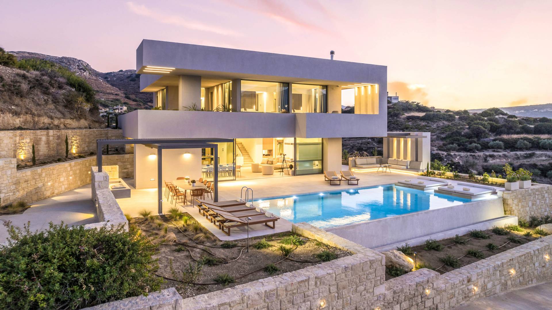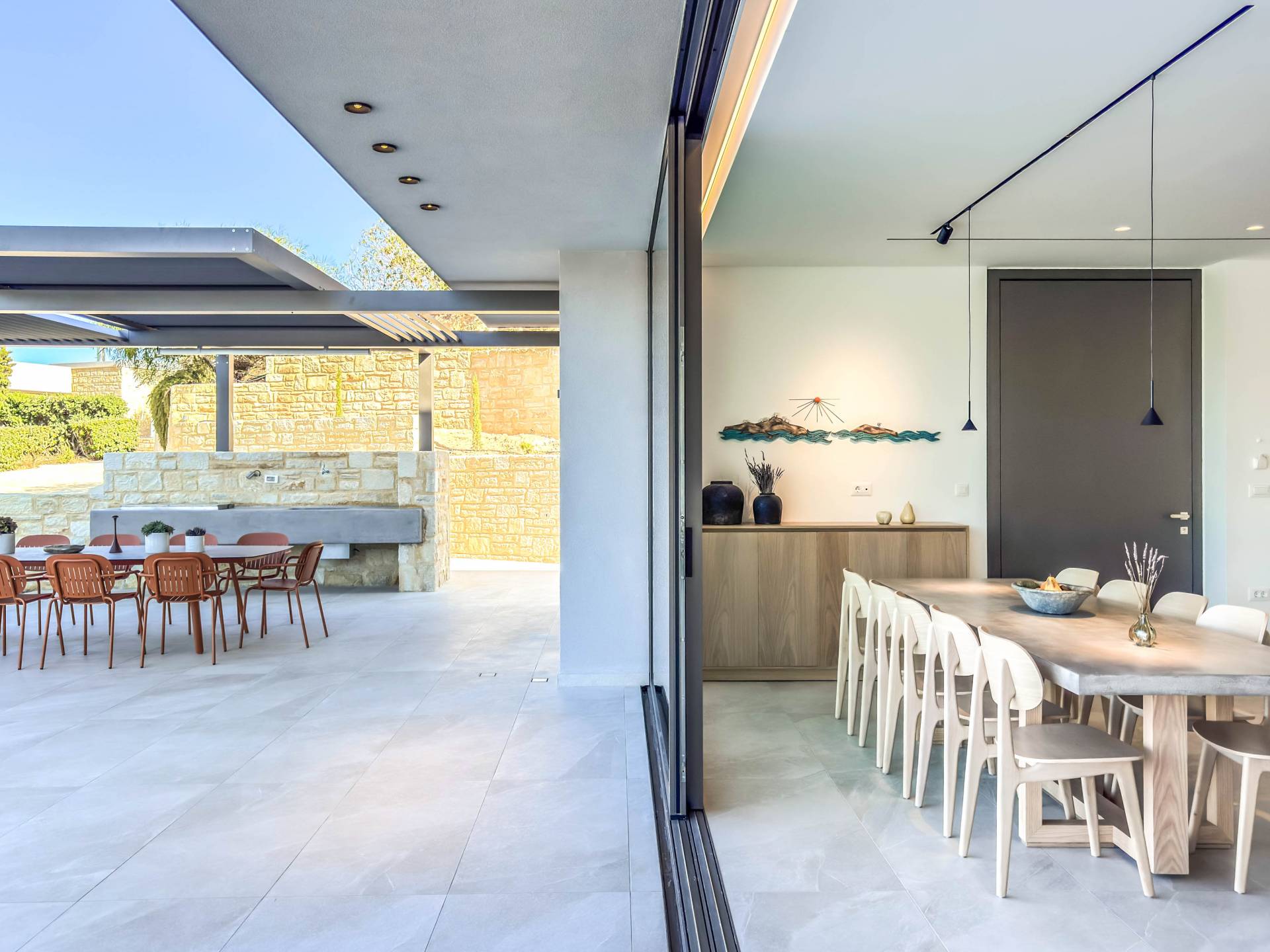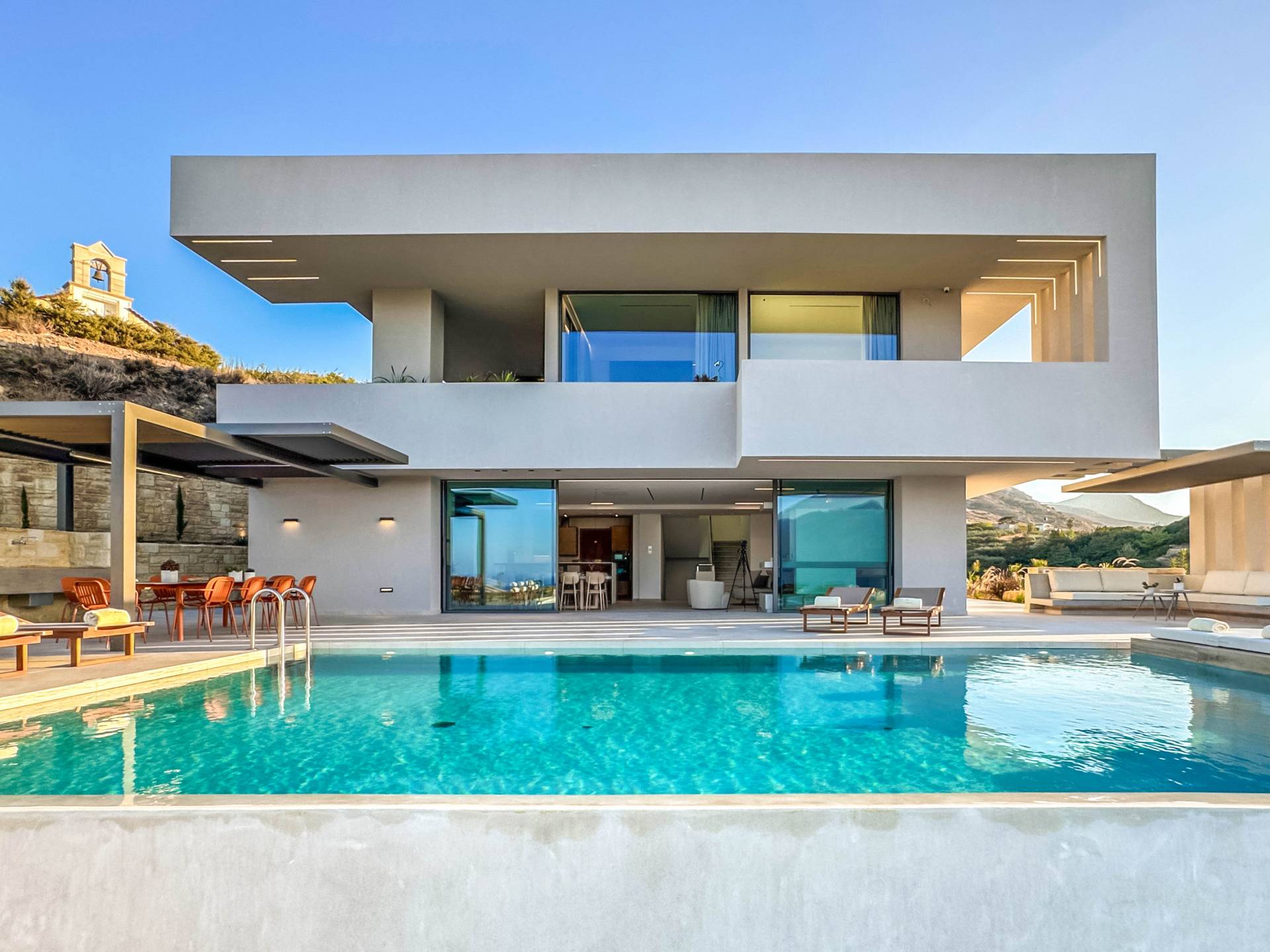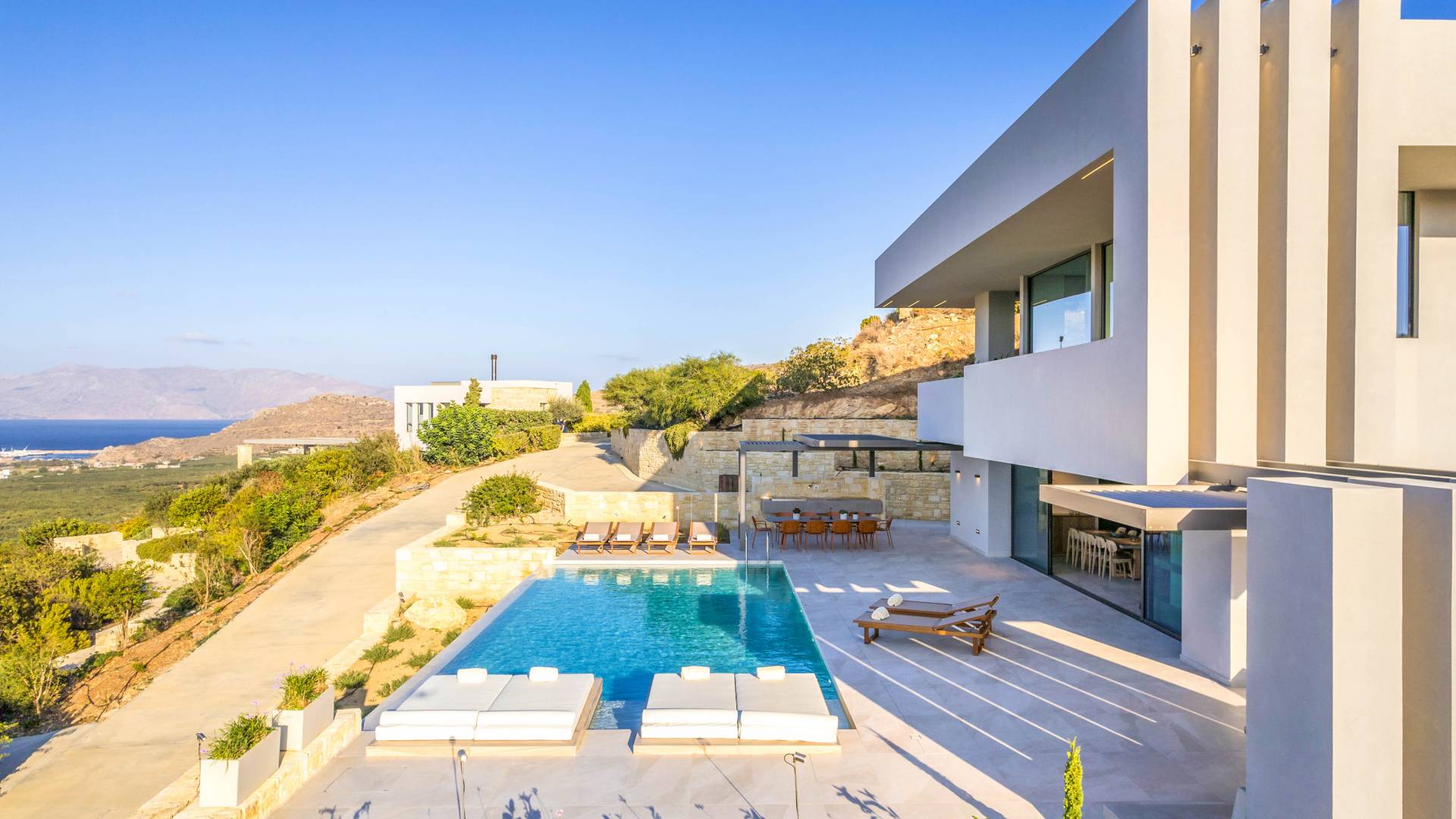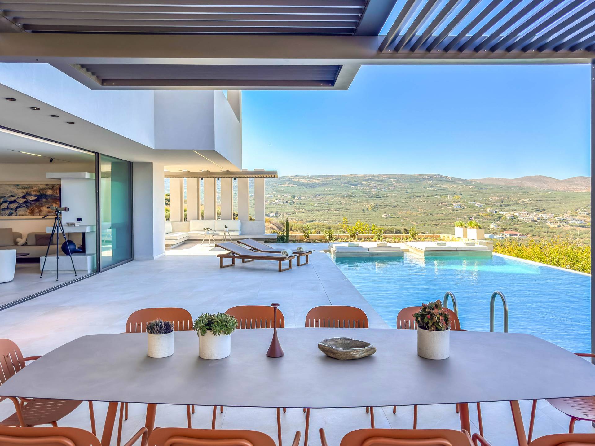 Die elegante Struktur der Villa fügt sich nahtlos in die Landschaft ein und präsentiert ein raffiniertes Äußeres, das das schicke, durchdacht gestaltete Innere ergänzt. Jedes Schlafzimmer öffnet sich auf eine private Terrasse mit herrlichem Blick auf das Ägäische Meer, während ein von einer Pergola beschatteter Essbereich im Freien zum Entspannen und Essen inmitten eines wunderschön angelegten Gartens voller einheimischer Blumen, Bäume und Sträucher einlädt.