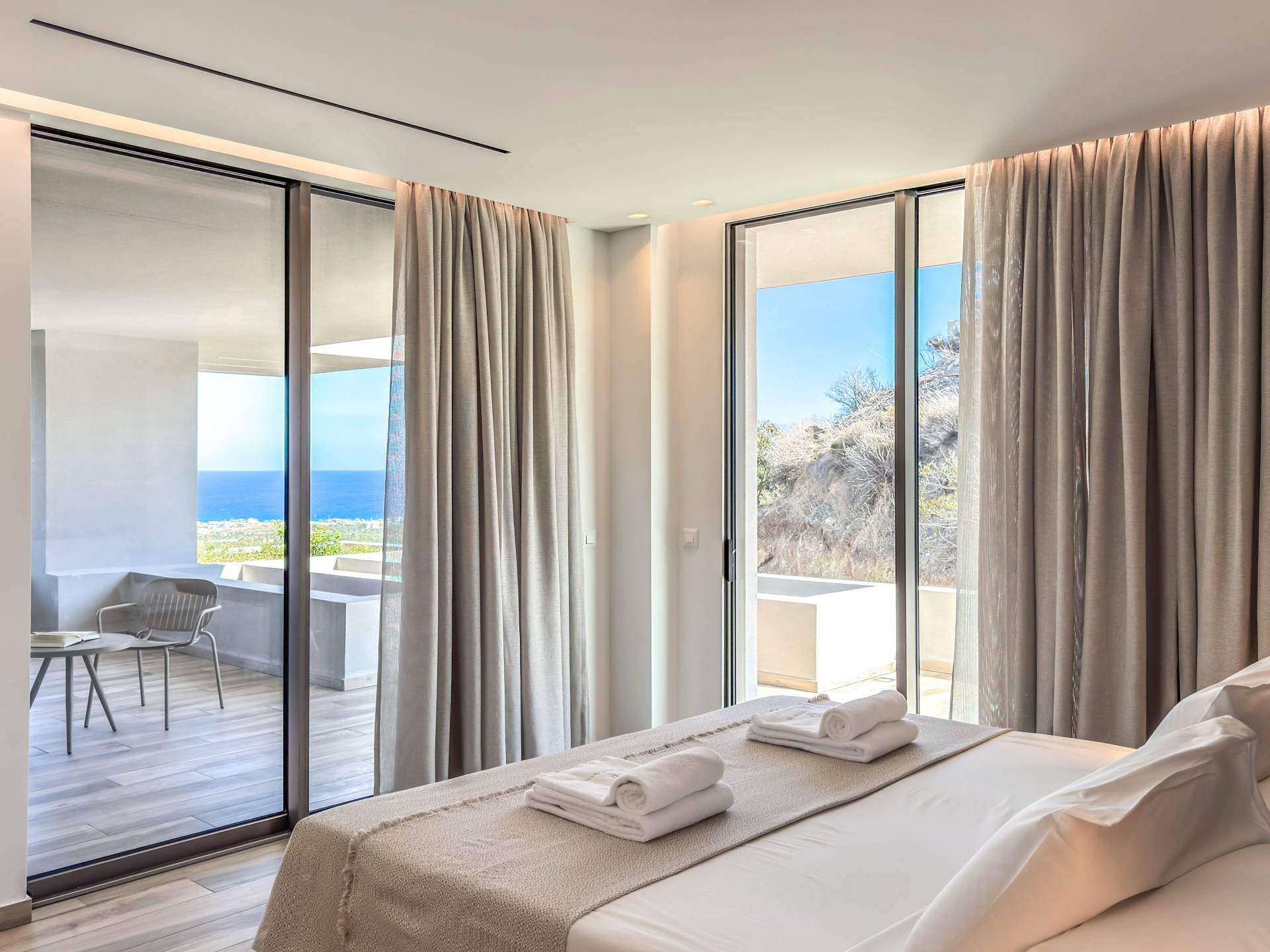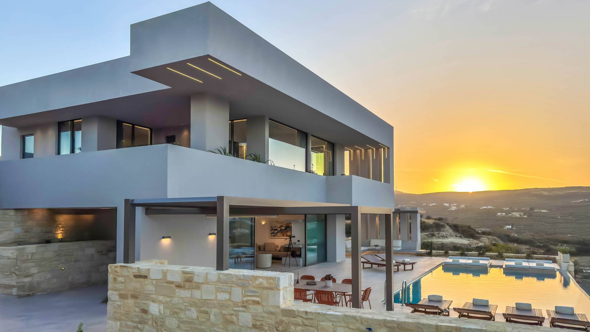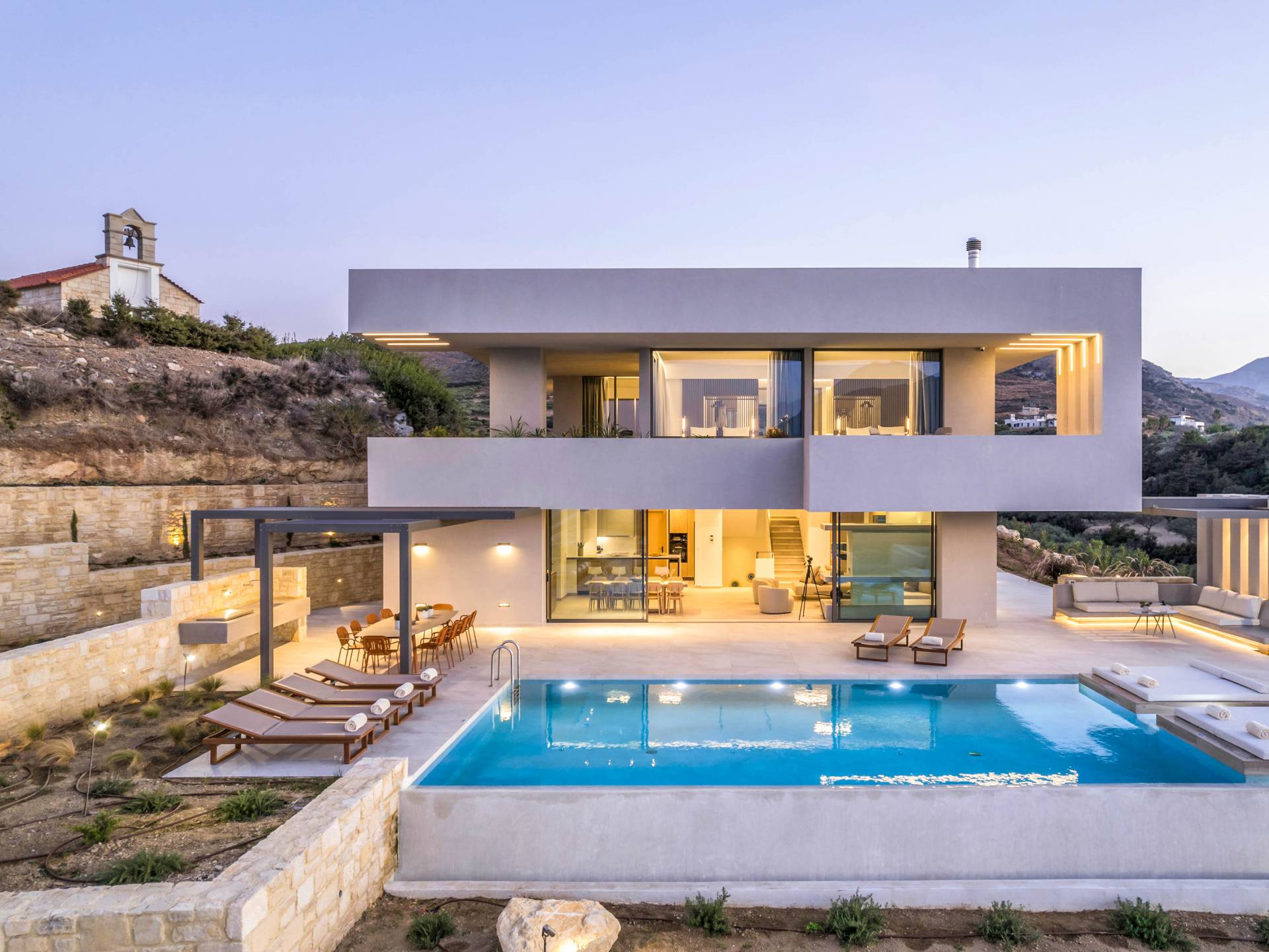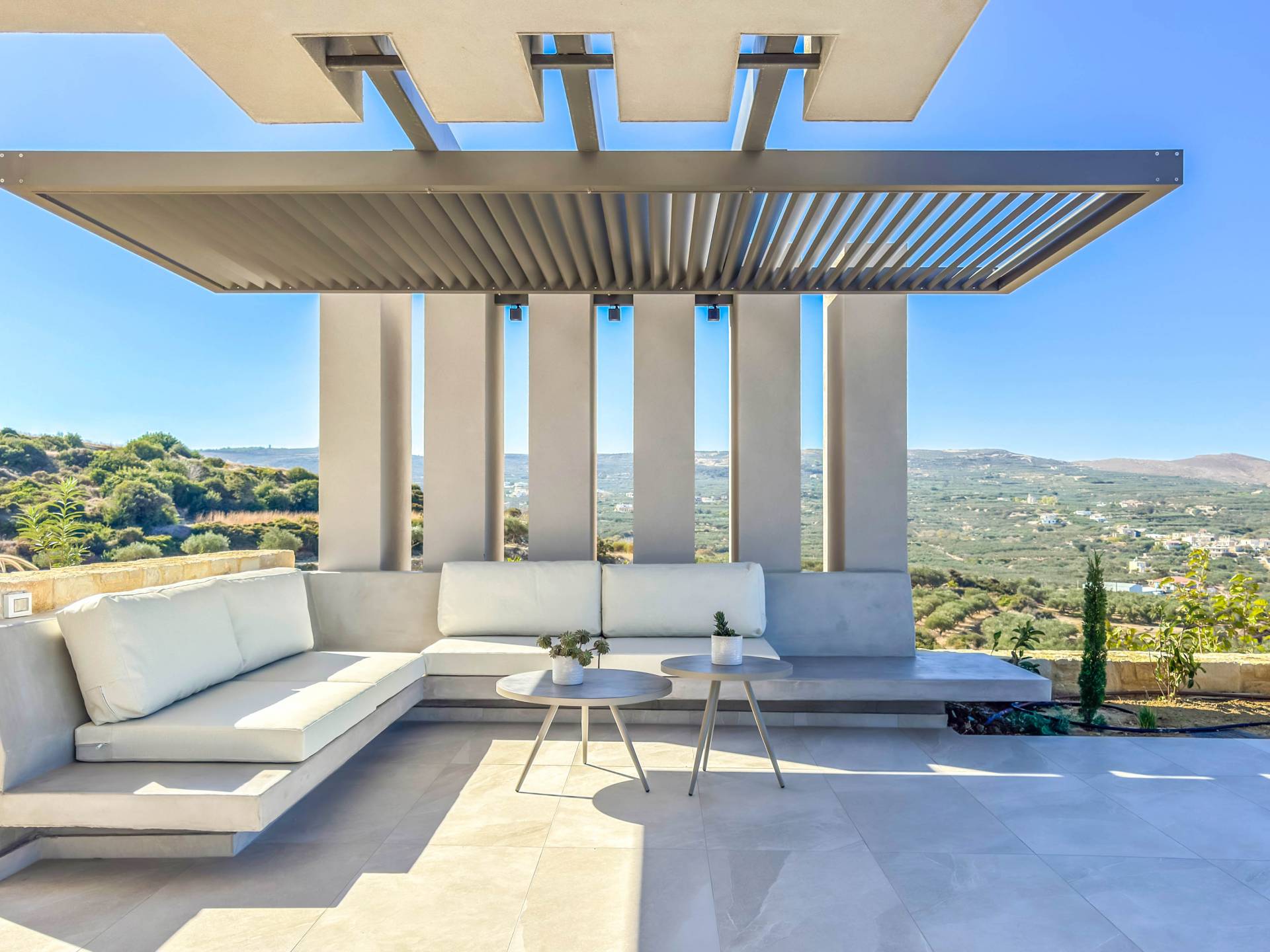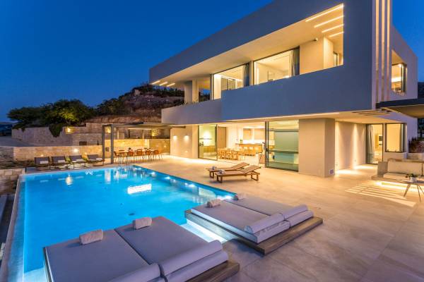 Die elegante Struktur der Villa fügt sich nahtlos in die Landschaft ein und präsentiert ein raffiniertes Äußeres, das das schicke, durchdacht gestaltete Innere ergänzt. Jedes Schlafzimmer öffnet sich auf eine private Terrasse mit herrlichem Blick auf das Ägäische Meer, während ein von einer Pergola beschatteter Essbereich im Freien zum Entspannen und Essen inmitten eines wunderschön angelegten Gartens voller einheimischer Blumen, Bäume und Sträucher einlädt.