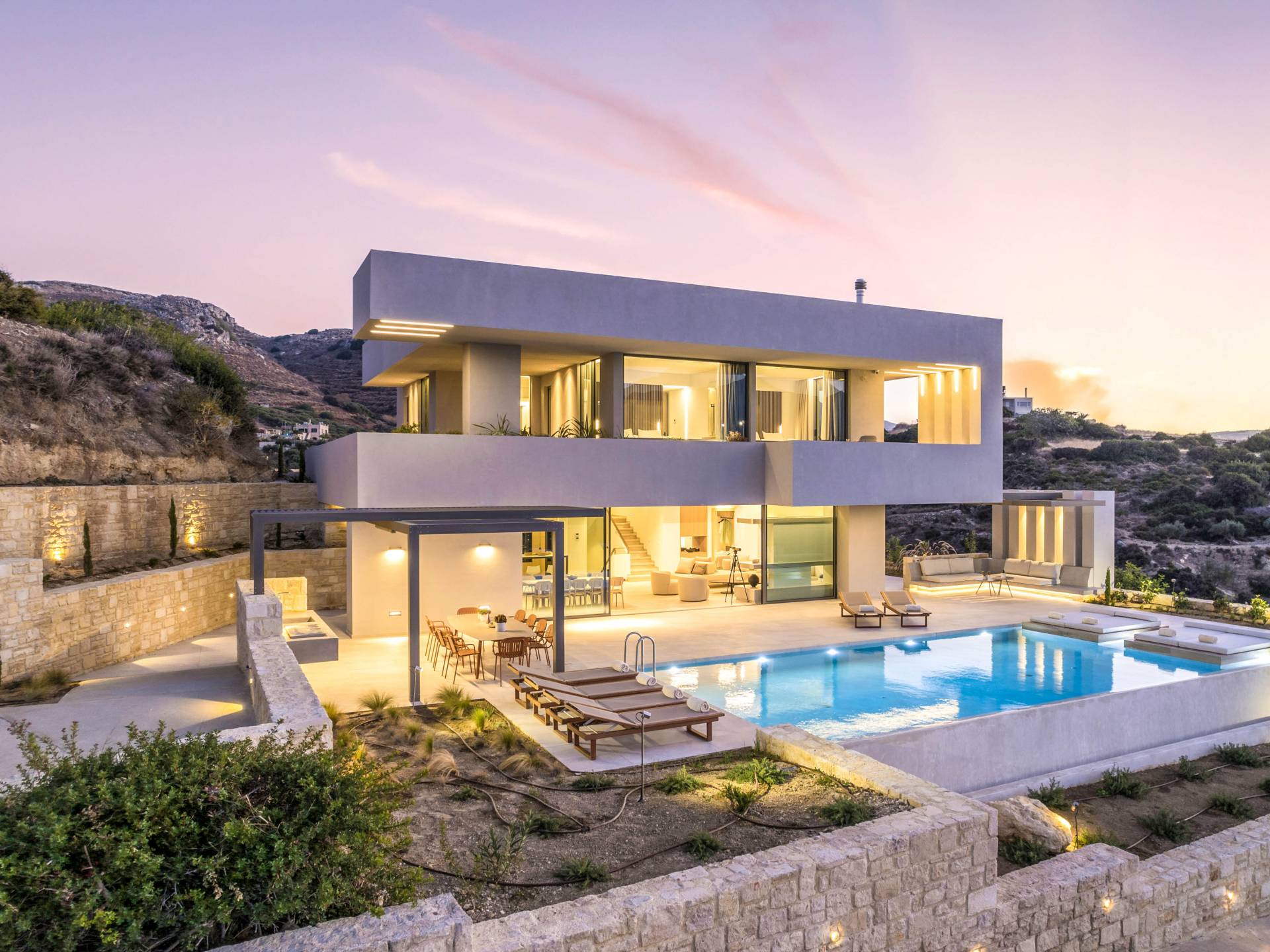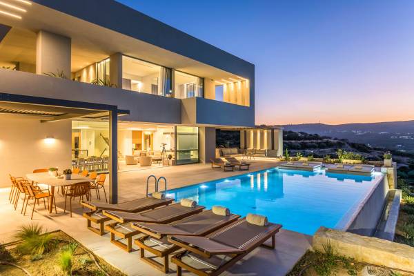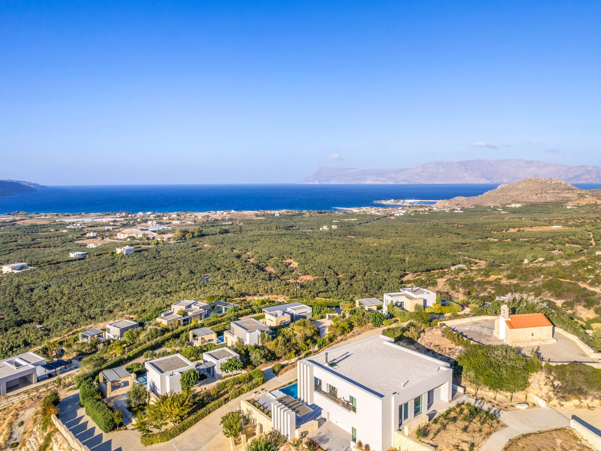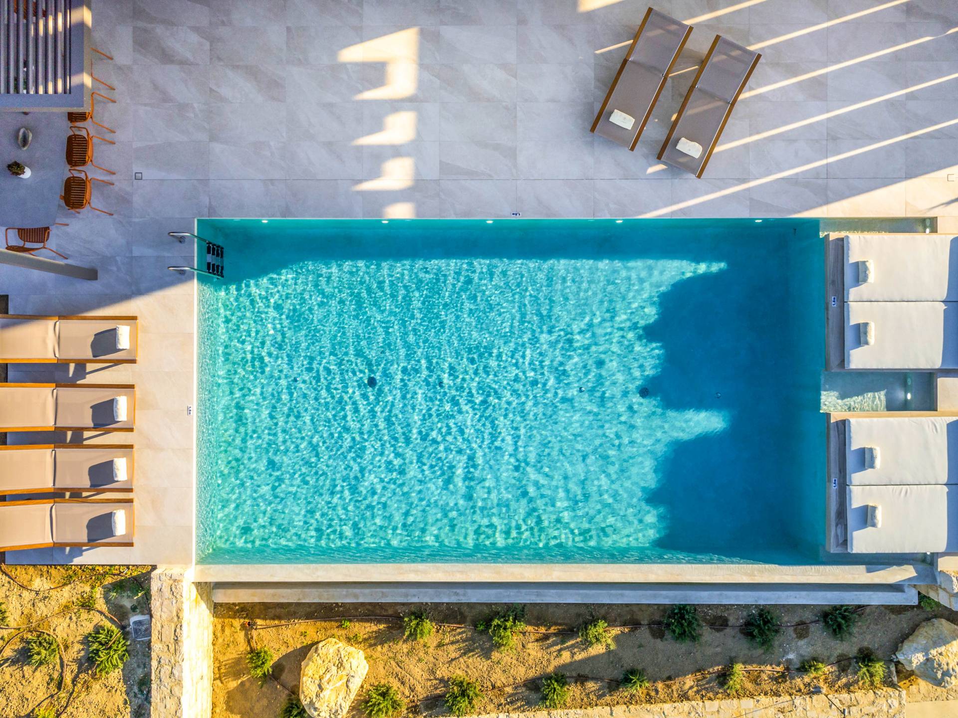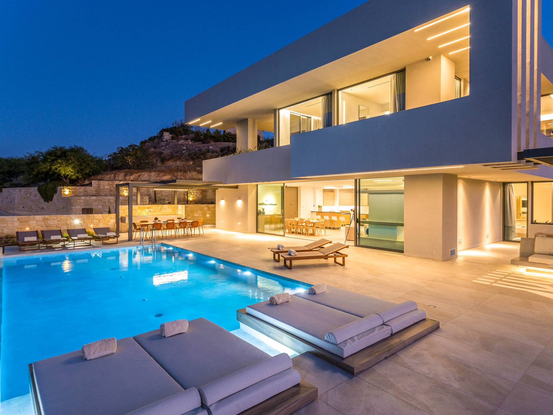 Die elegante Struktur der Villa fügt sich nahtlos in die Landschaft ein und präsentiert ein raffiniertes Äußeres, das das schicke, durchdacht gestaltete Innere ergänzt. Jedes Schlafzimmer öffnet sich auf eine private Terrasse mit herrlichem Blick auf das Ägäische Meer, während ein von einer Pergola beschatteter Essbereich im Freien zum Entspannen und Essen inmitten eines wunderschön angelegten Gartens voller einheimischer Blumen, Bäume und Sträucher einlädt.