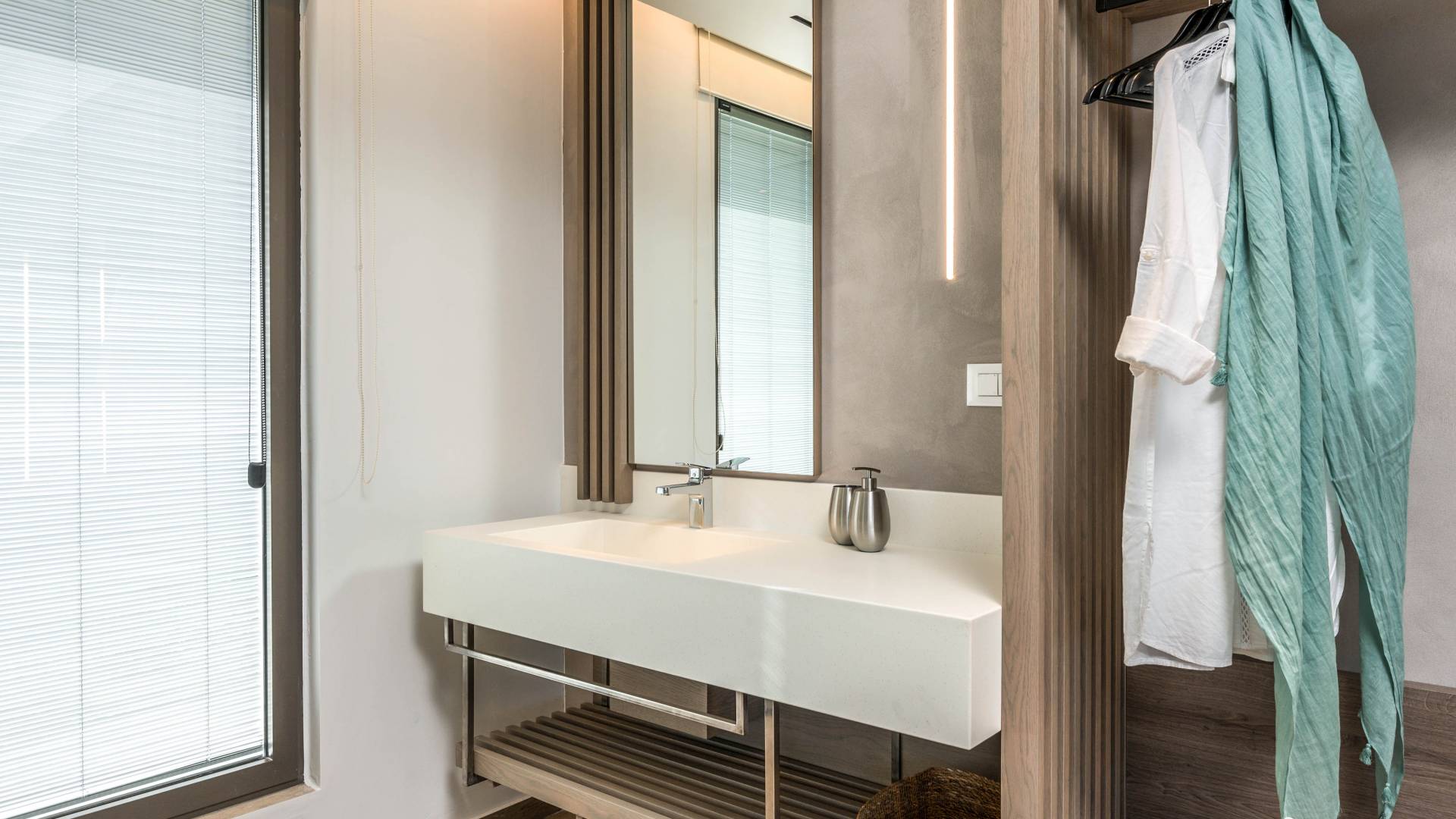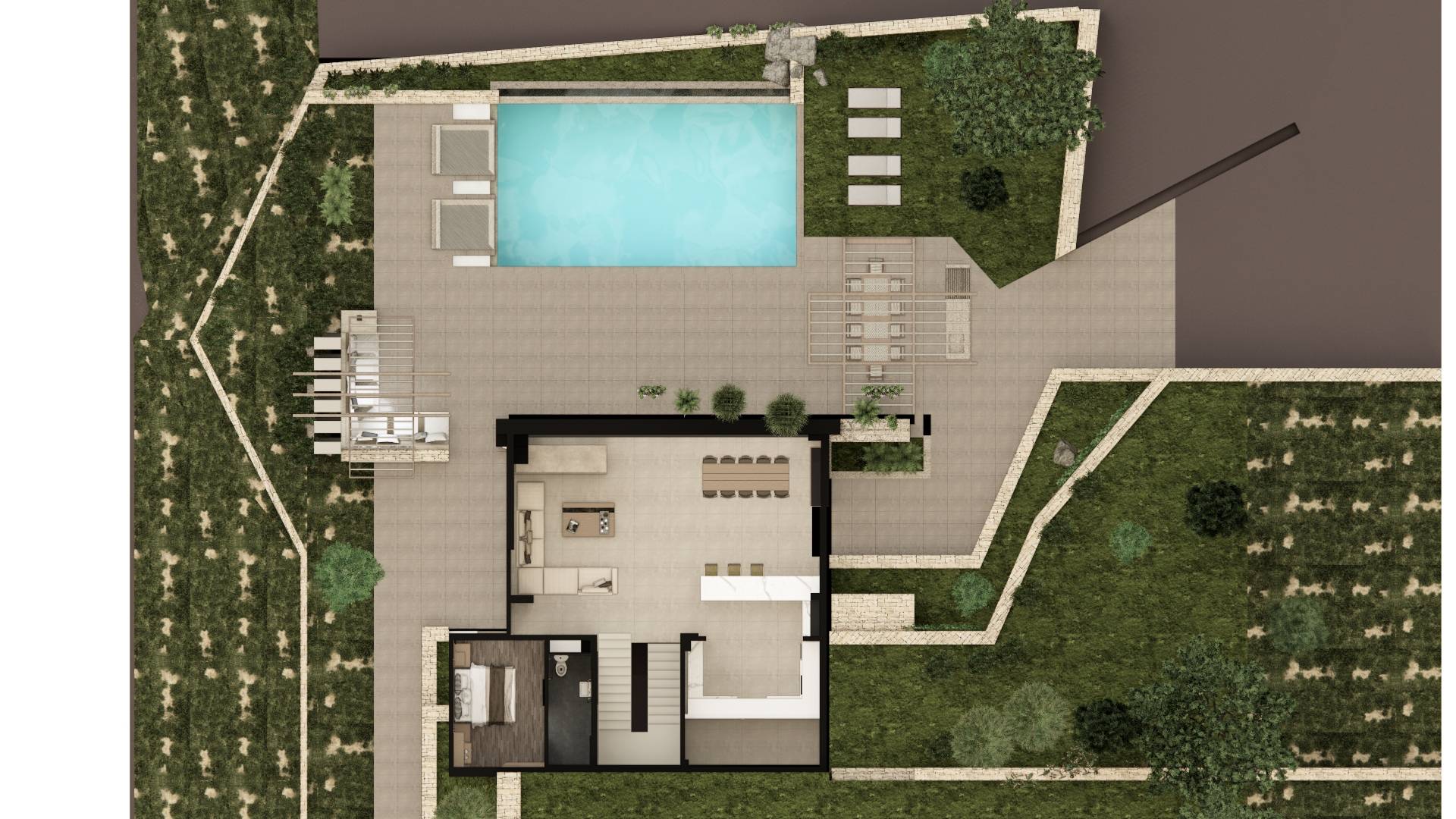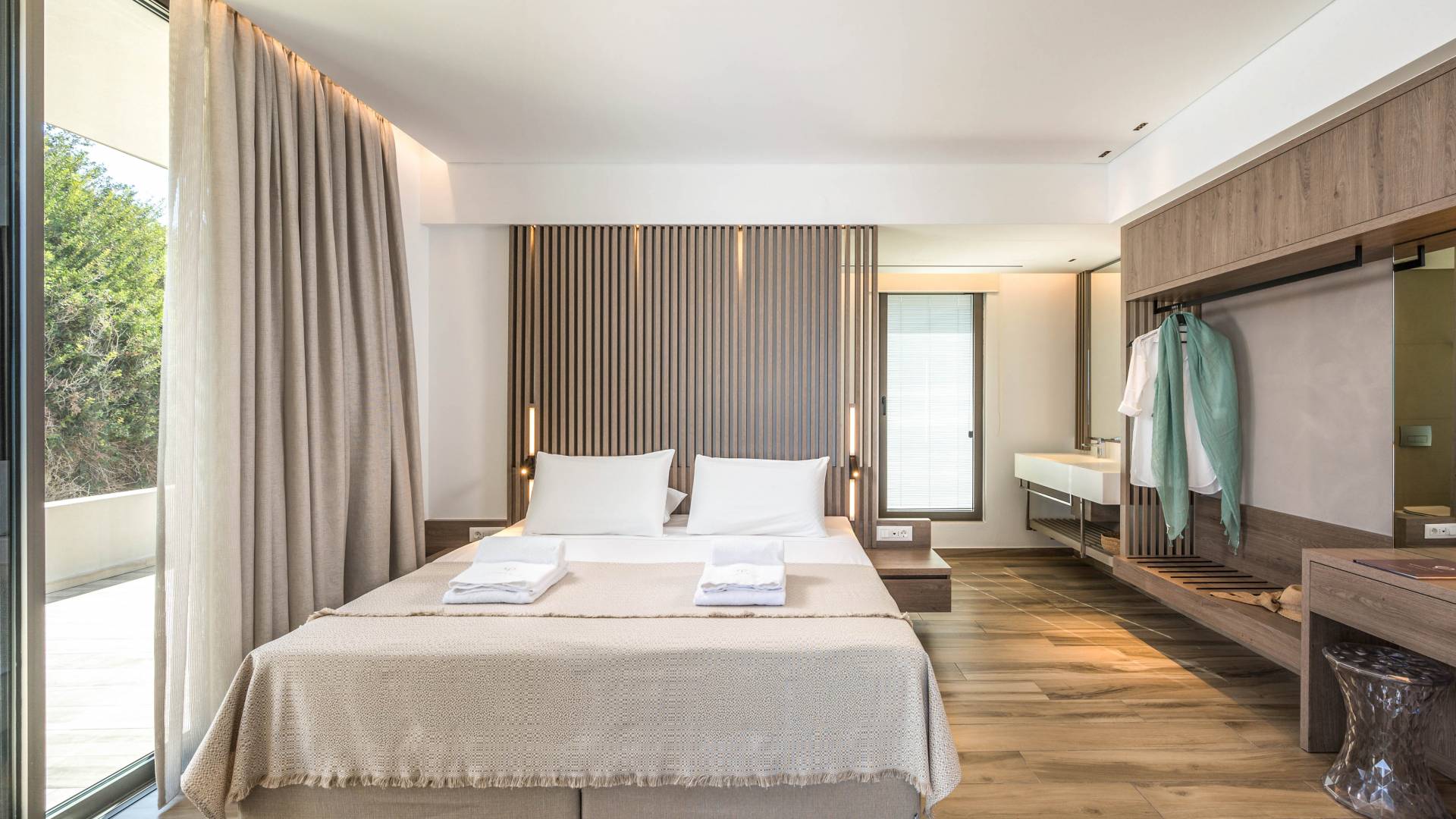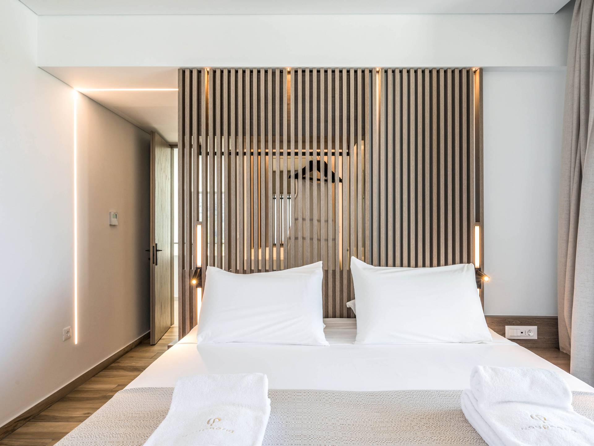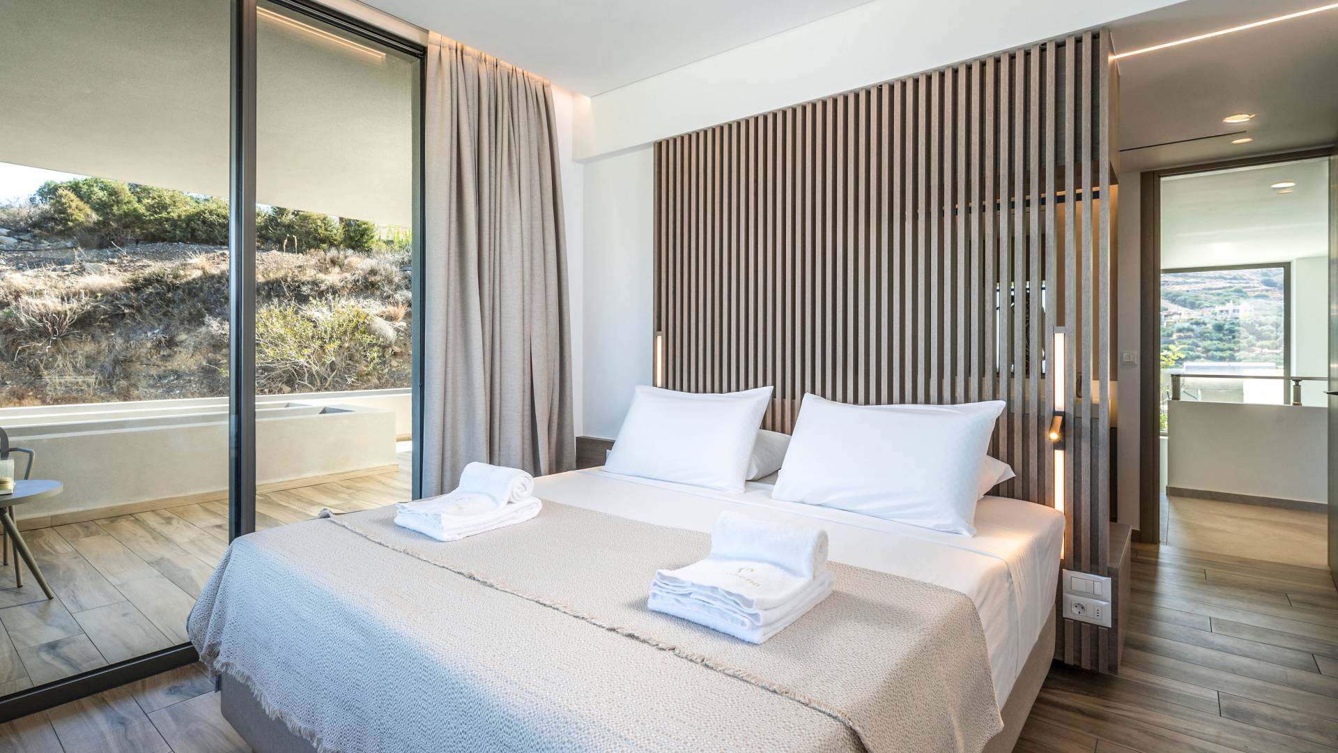 Die elegante Struktur der Villa fügt sich nahtlos in die Landschaft ein und präsentiert ein raffiniertes Äußeres, das das schicke, durchdacht gestaltete Innere ergänzt. Jedes Schlafzimmer öffnet sich auf eine private Terrasse mit herrlichem Blick auf das Ägäische Meer, während ein von einer Pergola beschatteter Essbereich im Freien zum Entspannen und Essen inmitten eines wunderschön angelegten Gartens voller einheimischer Blumen, Bäume und Sträucher einlädt.