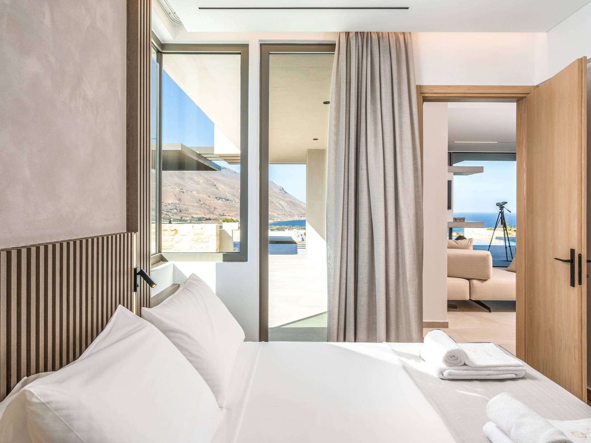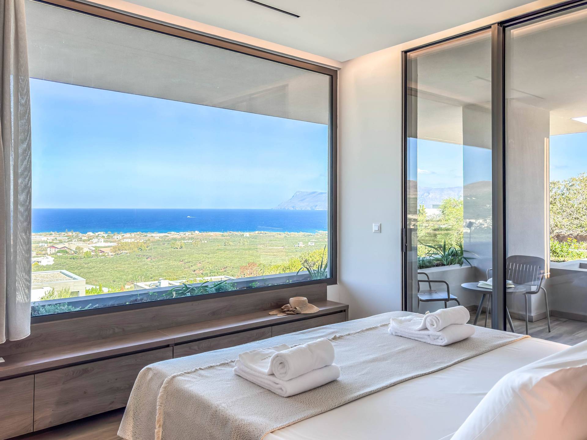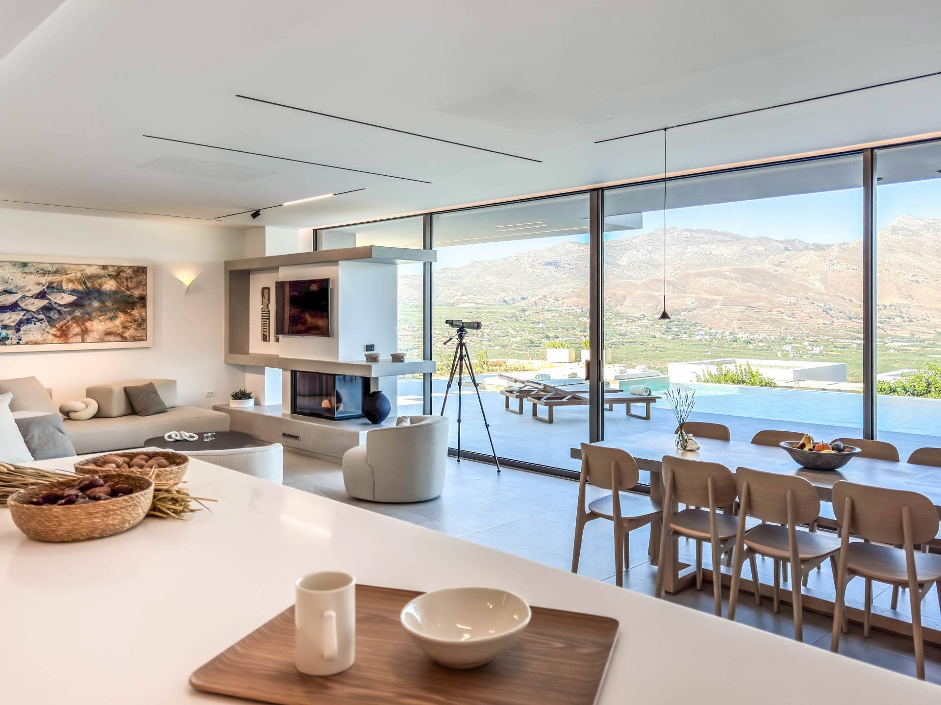 Große Fenster auf beiden Seiten der Villa lassen reichlich natürliches Licht herein und verwischen die Grenzen zwischen den luftigen Innenräumen und der erfrischenden Außenumgebung. Getreu ihrem Namen ist die Villa Aeida Kissamos eine luxuriöse Oase in einer atemberaubenden Umgebung und bietet die perfekte Kulisse für einen unvergesslichen Kurzurlaub.