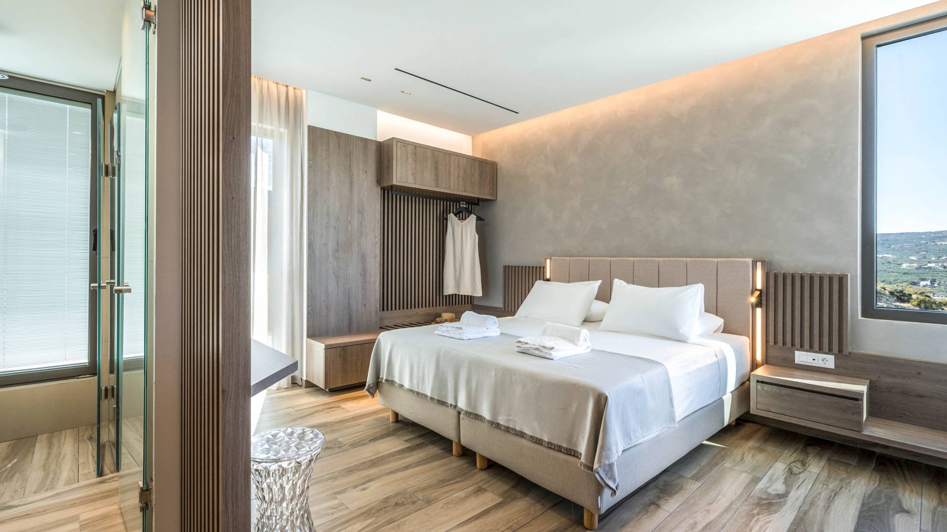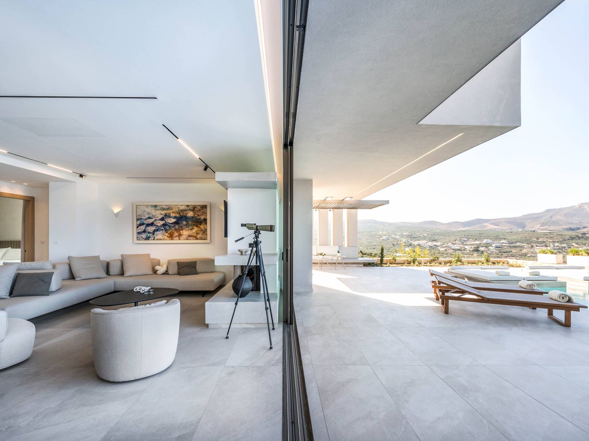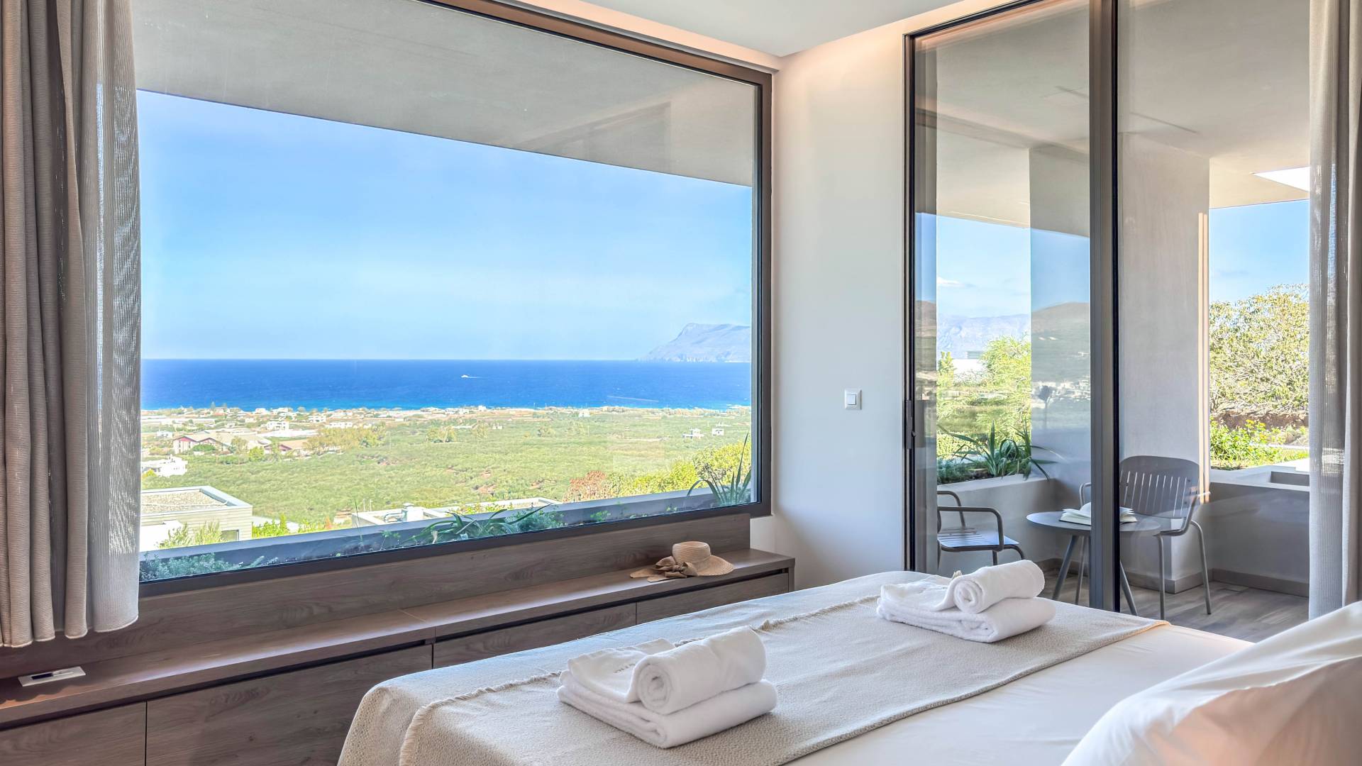 Große Fenster auf beiden Seiten der Villa lassen reichlich natürliches Licht herein und verwischen die Grenzen zwischen den luftigen Innenräumen und der erfrischenden Außenumgebung. Getreu ihrem Namen ist die Villa Aeida Kissamos eine luxuriöse Oase in einer atemberaubenden Umgebung und bietet die perfekte Kulisse für einen unvergesslichen Kurzurlaub.