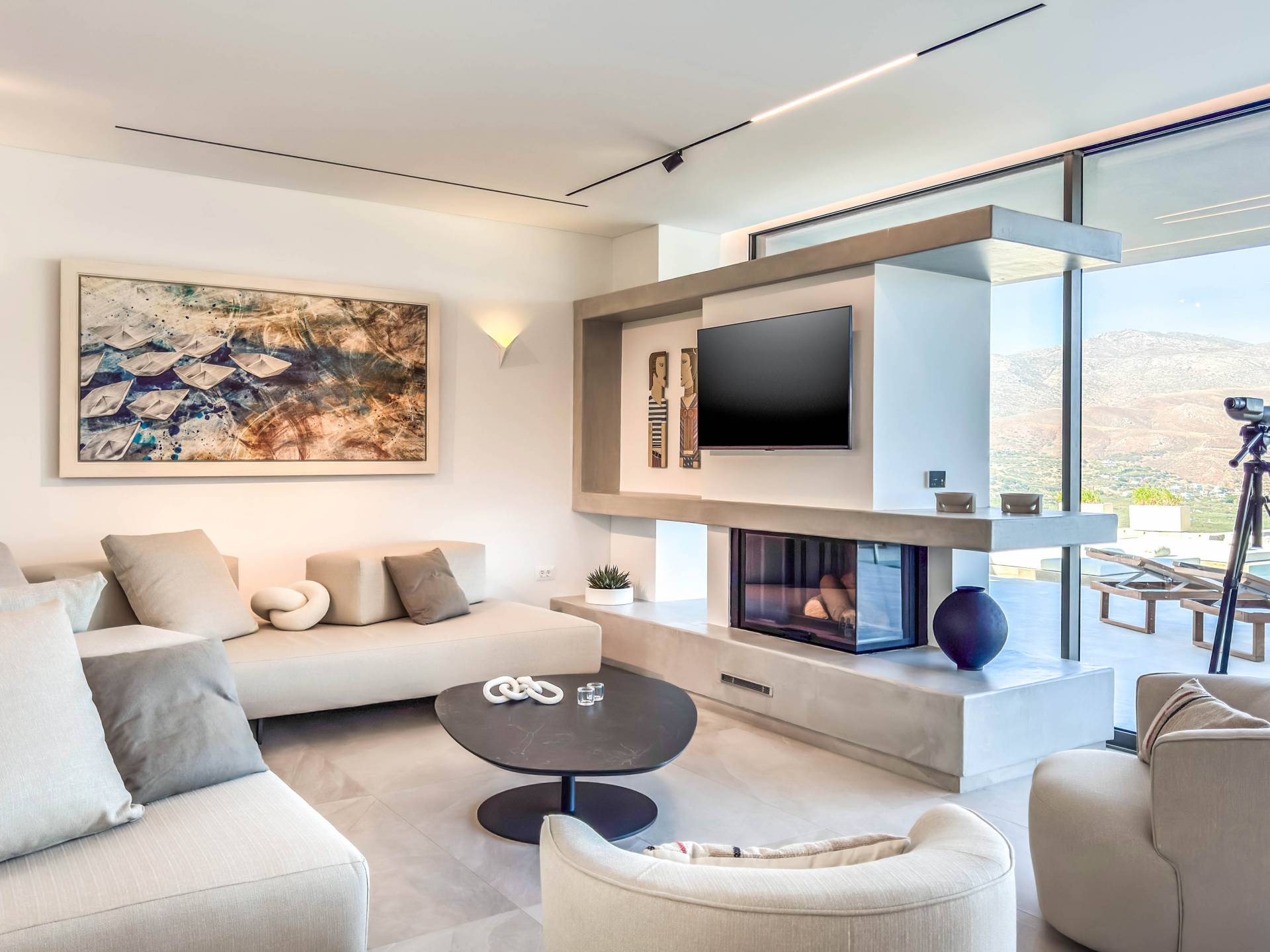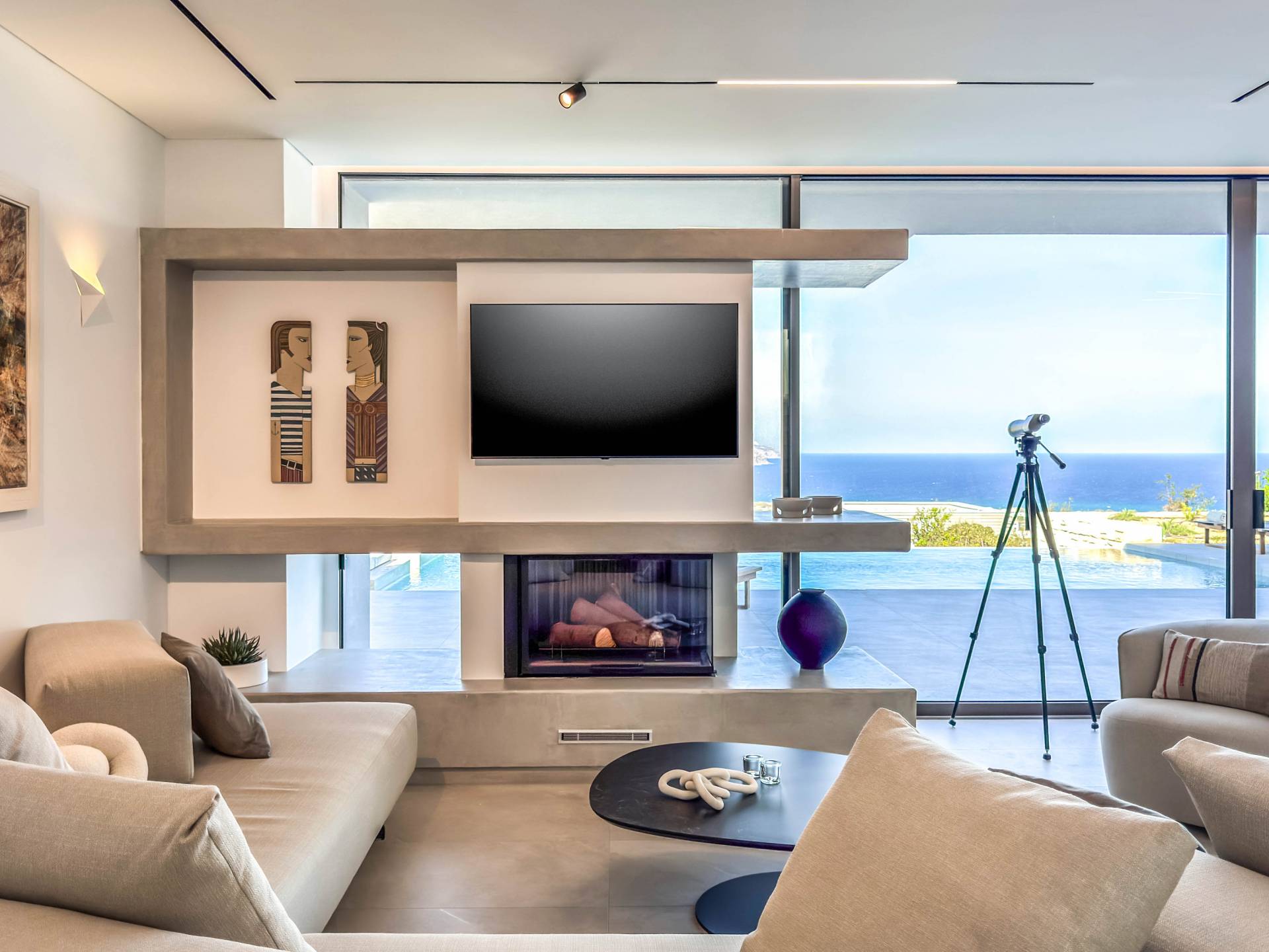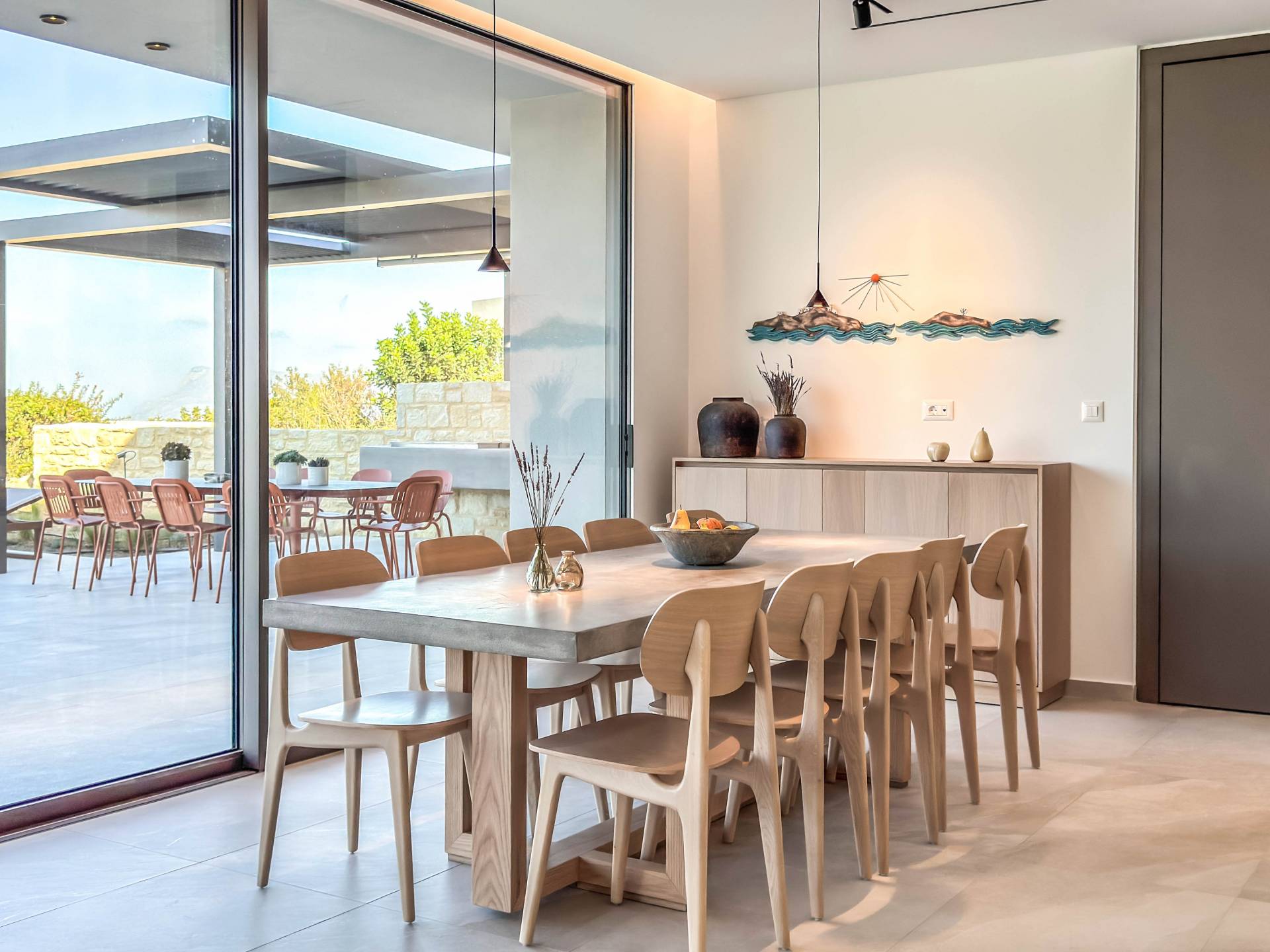 Im Inneren verfügt die Villa über eine offene Küche, die komplett mit erstklassigen Geräten ausgestattet ist und über ausreichend Ablagefläche für müheloses Kochen verfügt. Der angrenzende Ess- und Wohnbereich ist um einen umweltfreundlichen Kamin herum angeordnet und schafft einen gemütlichen Gemeinschaftsraum. Jedes Schlafzimmer bietet Platz für bis zu 10 Gäste und ist ein eigener privater Rückzugsort mit eigenem Bad und atemberaubendem Meer- und Bergblick.