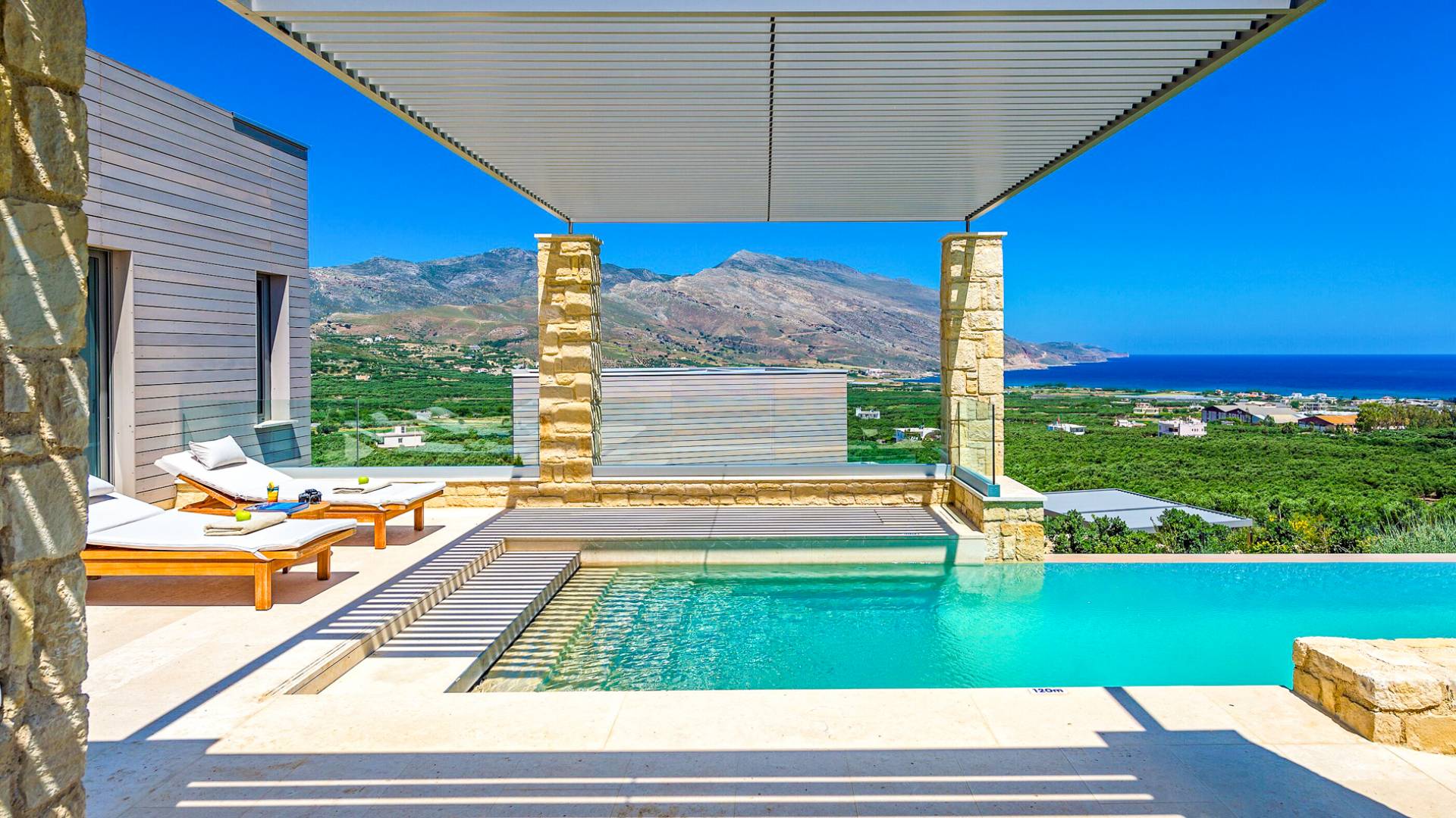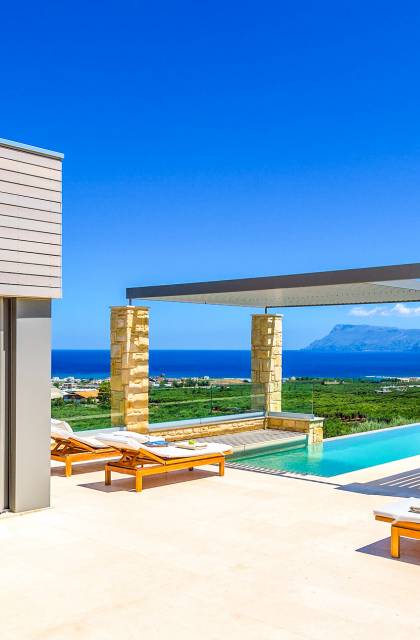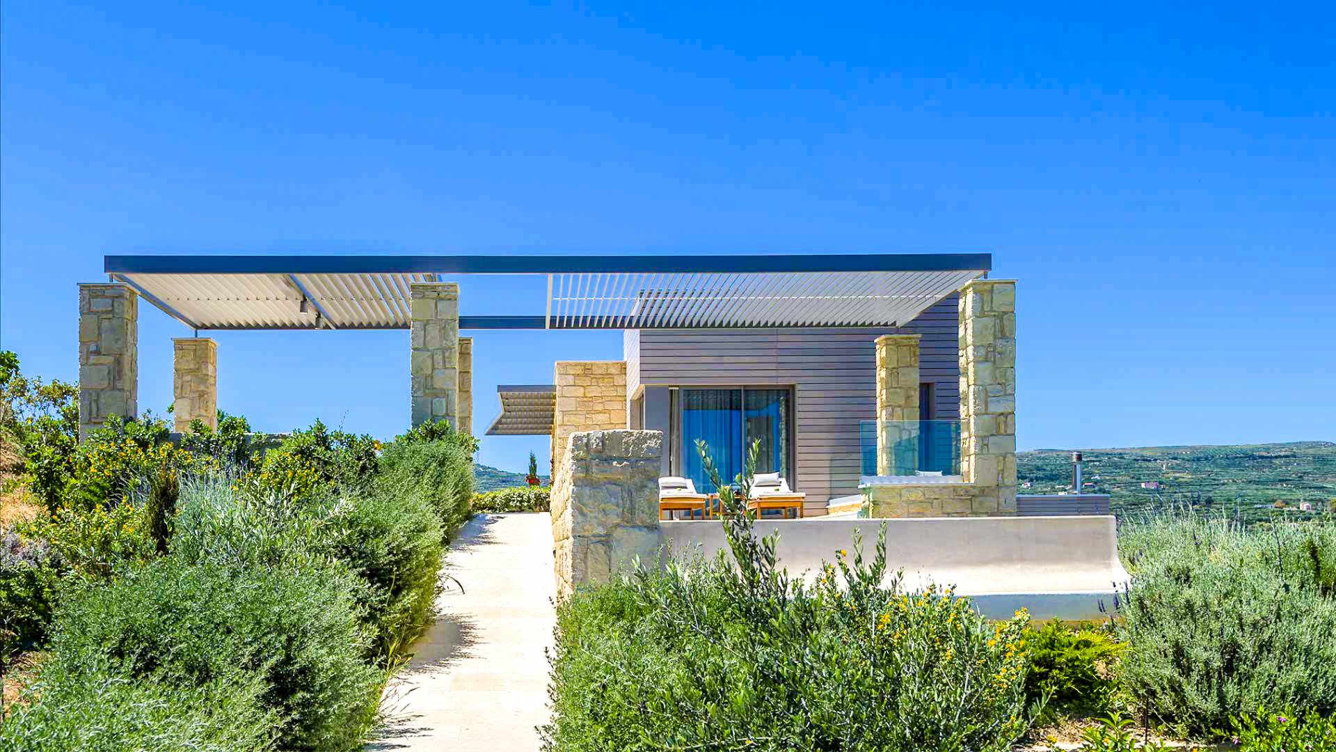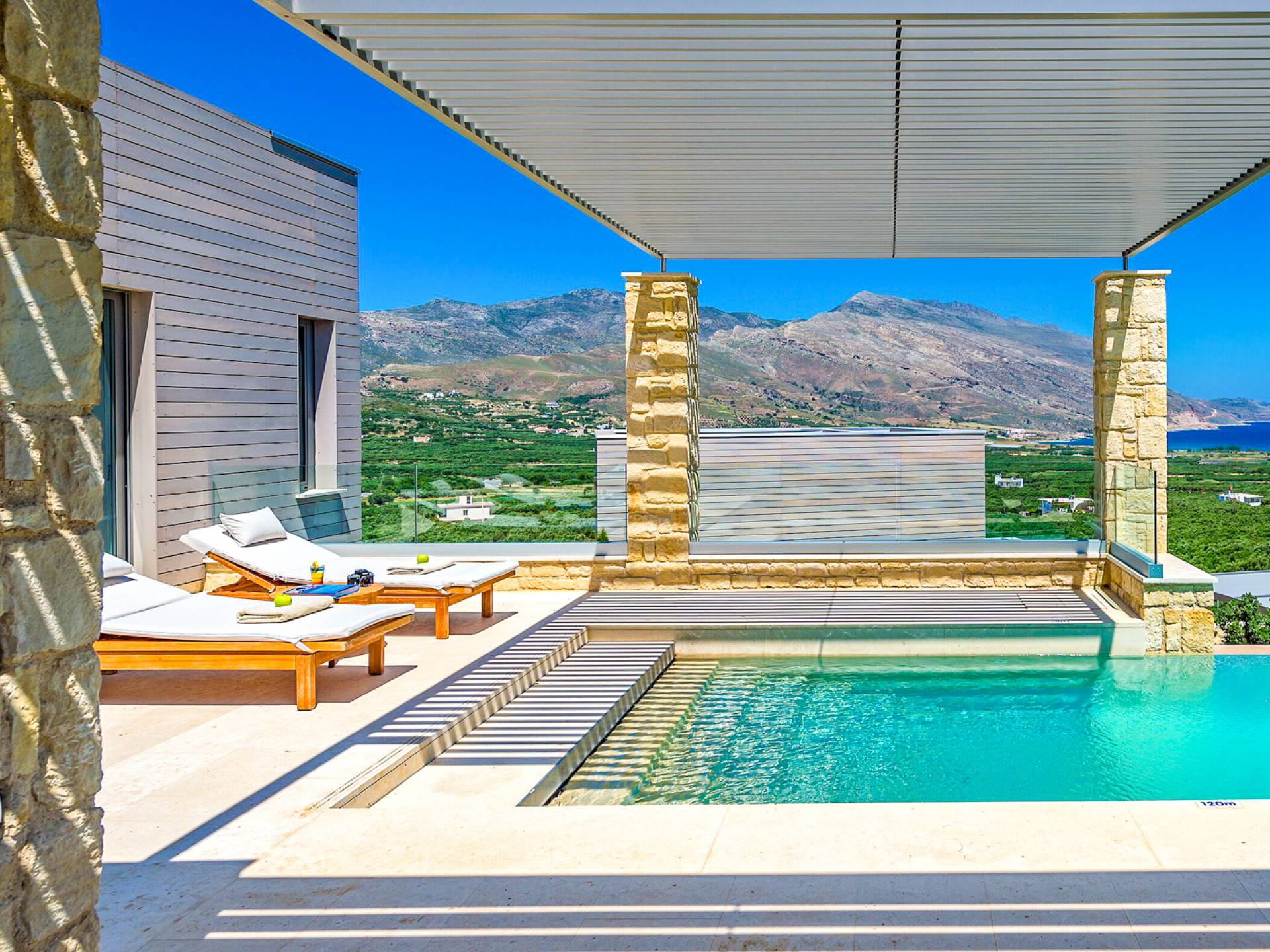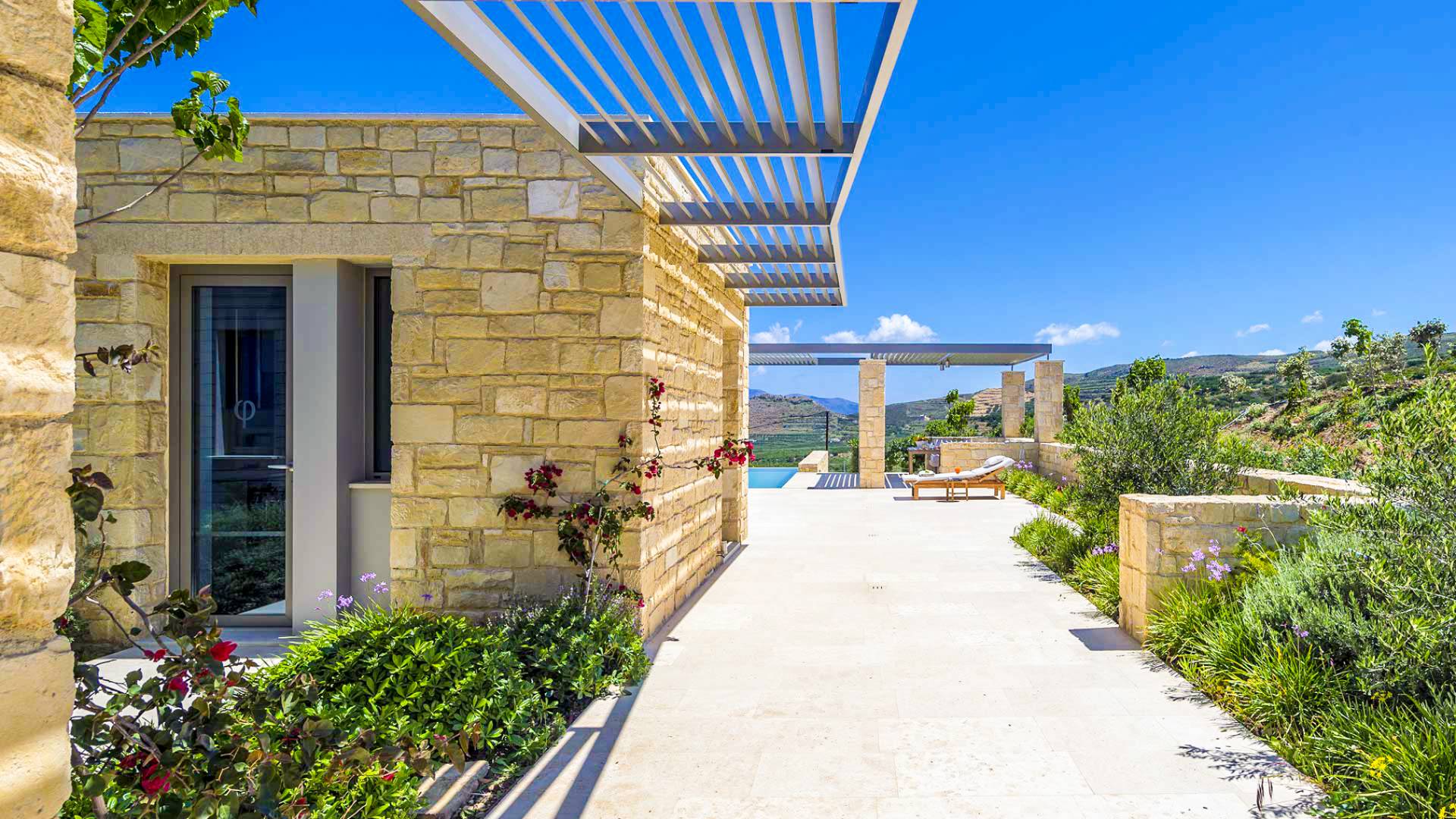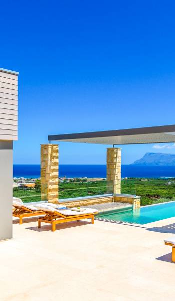 Große Fenster lassen das Licht herein und bieten einen atemberaubenden Blick über die Bucht von Kissamos und über die angelegten Gärten der Villa. Endemische Sträucher, Blumen und Bäume werden durch traditionelle Steinmauern ergänzt, die sich in die natürliche Umgebung einfügen, um die Symphonie zu verstärken. Der private Infinity-Pool überblickt Olivenhaine in Richtung der Ägäis und ist ein unvergessliches Bild eines Rahmens, der den ganzen Charme des Mittelmeers umgibt. Das innovative Konzept einer dreieckigen Fassade trennt Wohn- und Schlafbereich in zwei Gebäuden, die über einen Gehweg miteinander kommunizieren, und sorgt so für noch mehr Privatsphäre.
