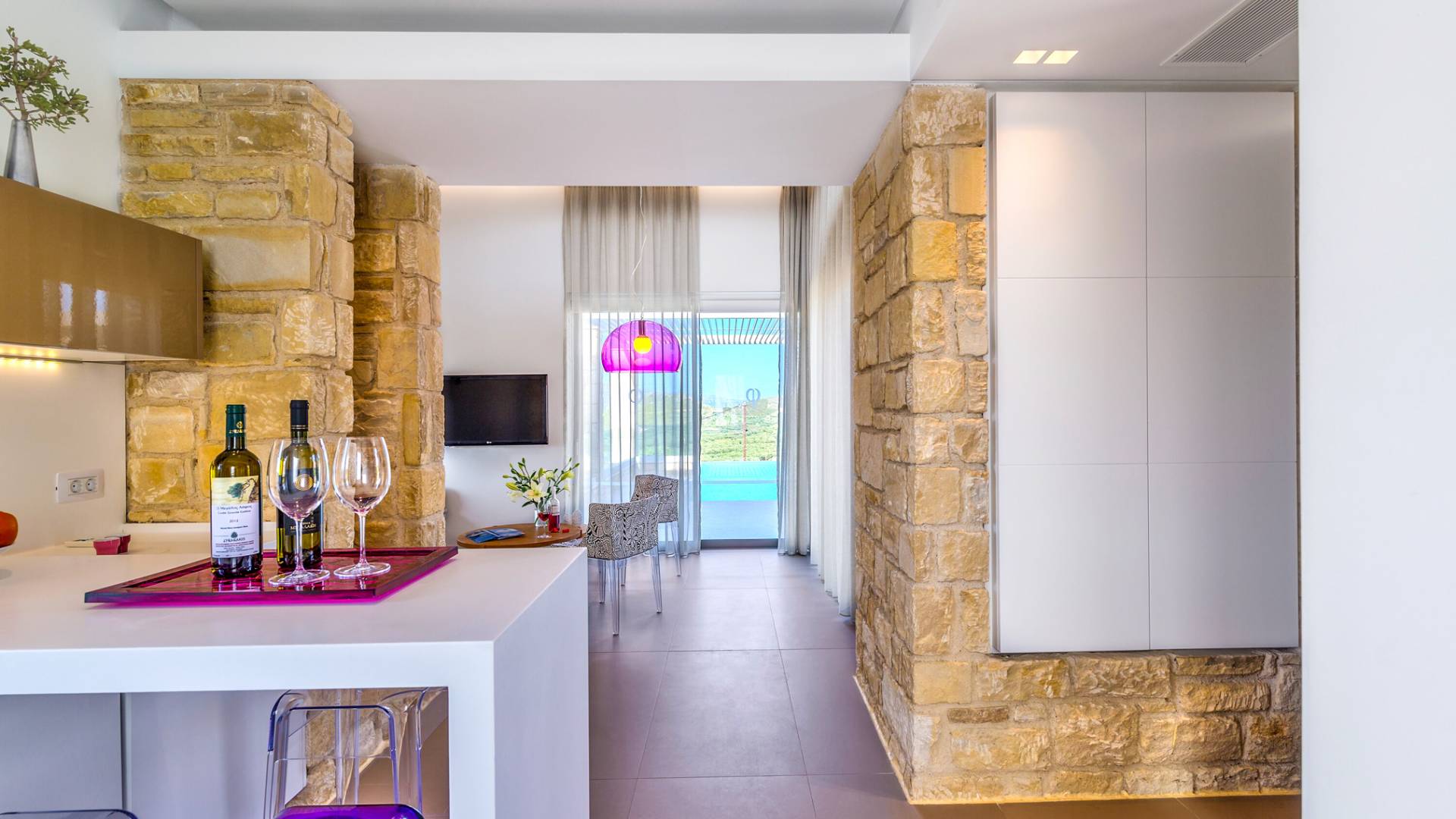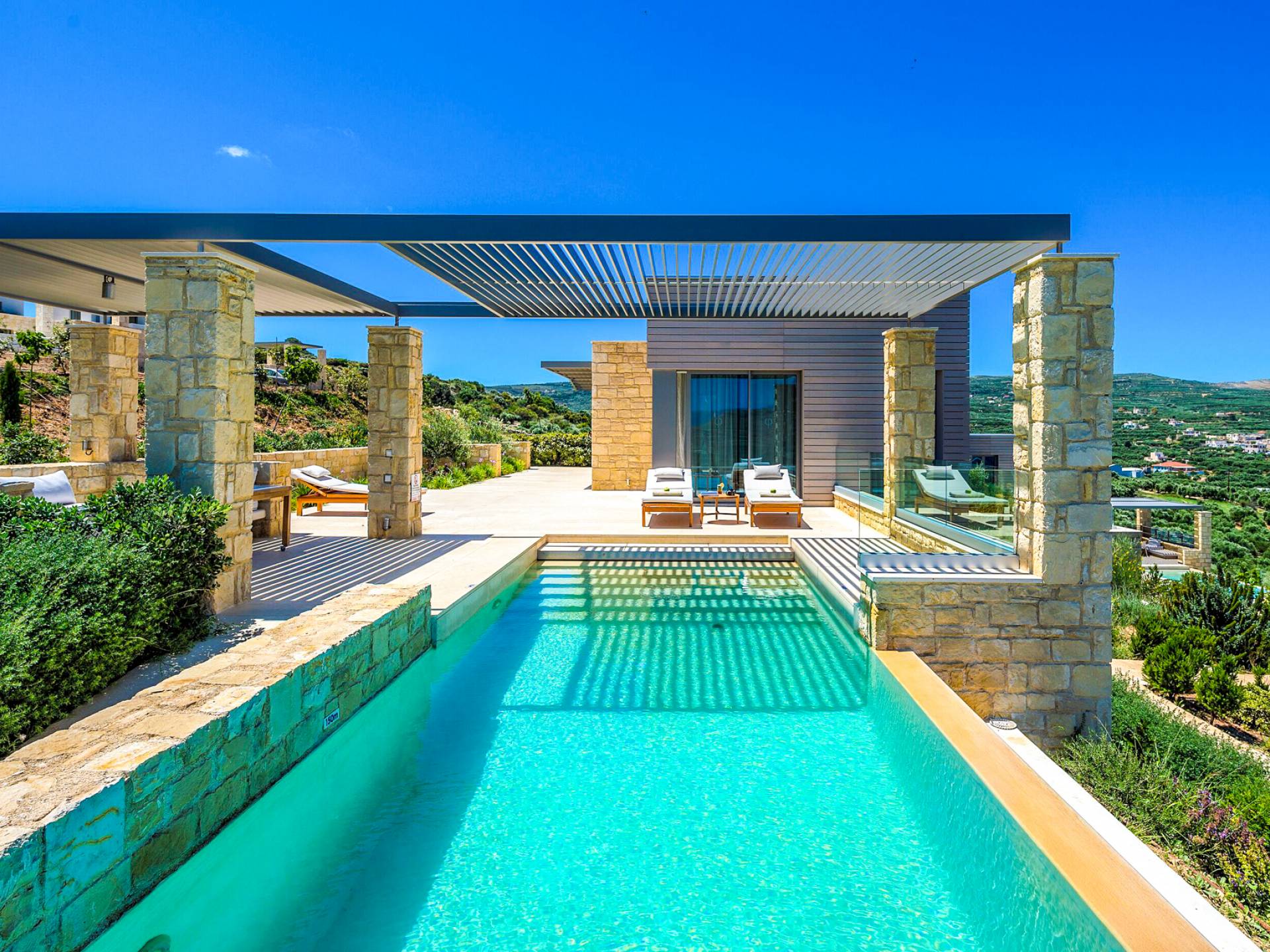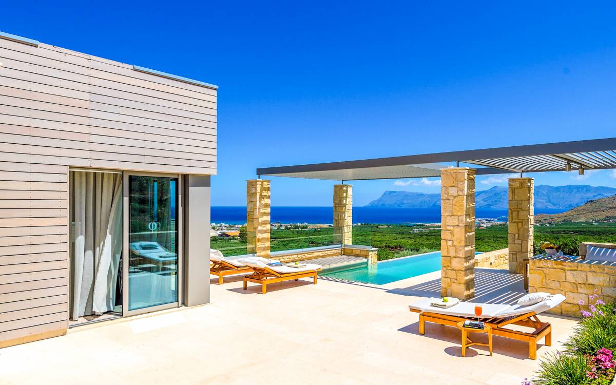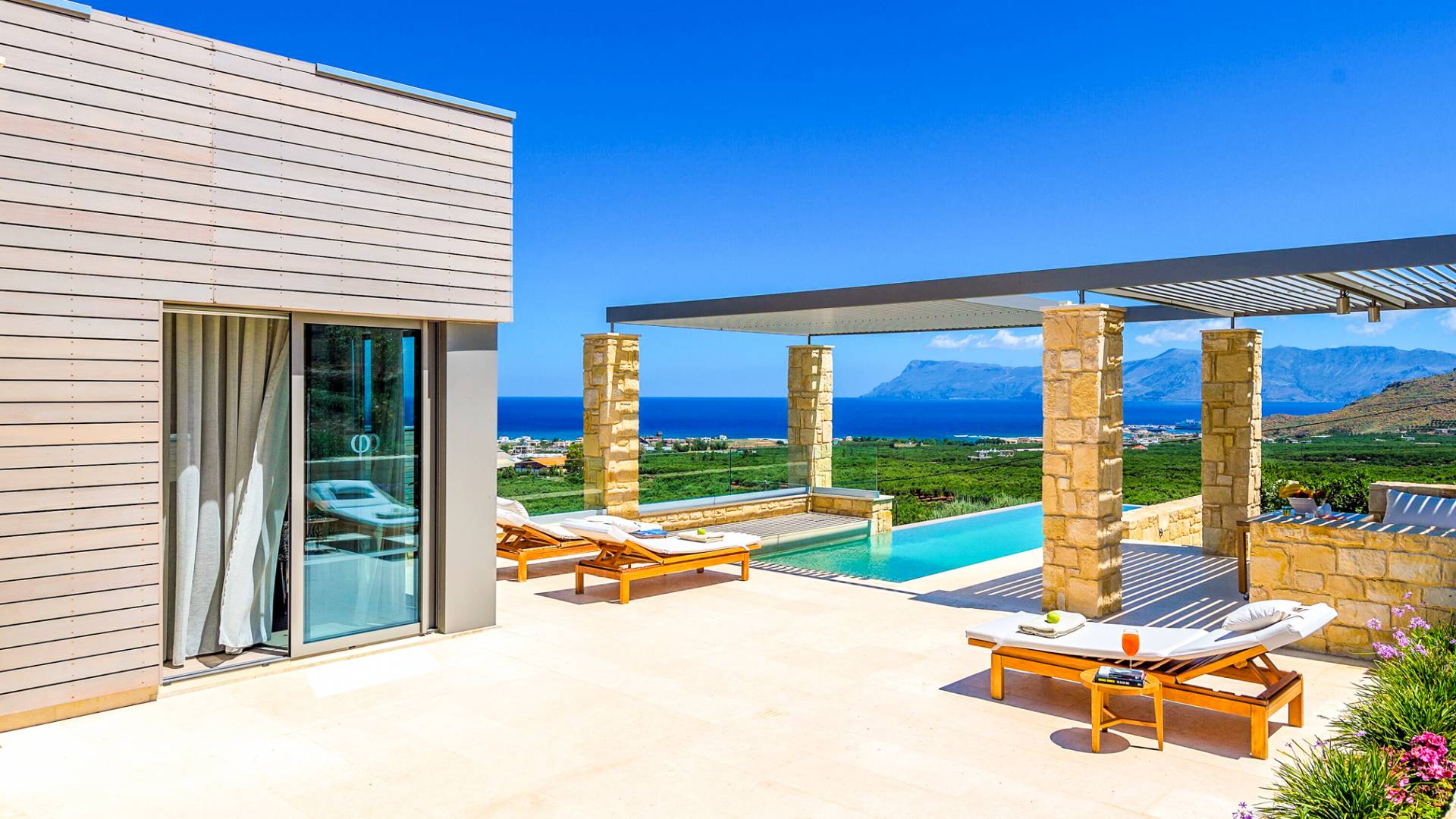 Große Fenster lassen das Licht herein und bieten einen atemberaubenden Blick über die Bucht von Kissamos und über die angelegten Gärten der Villa. Endemische Sträucher, Blumen und Bäume werden durch traditionelle Steinmauern ergänzt, die sich in die natürliche Umgebung einfügen, um die Symphonie zu verstärken. Der private Infinity-Pool überblickt Olivenhaine in Richtung der Ägäis und ist ein unvergessliches Bild eines Rahmens, der den ganzen Charme des Mittelmeers umgibt. Das innovative Konzept einer dreieckigen Fassade trennt Wohn- und Schlafbereich in zwei Gebäuden, die über einen Gehweg miteinander kommunizieren, und sorgt so für noch mehr Privatsphäre.