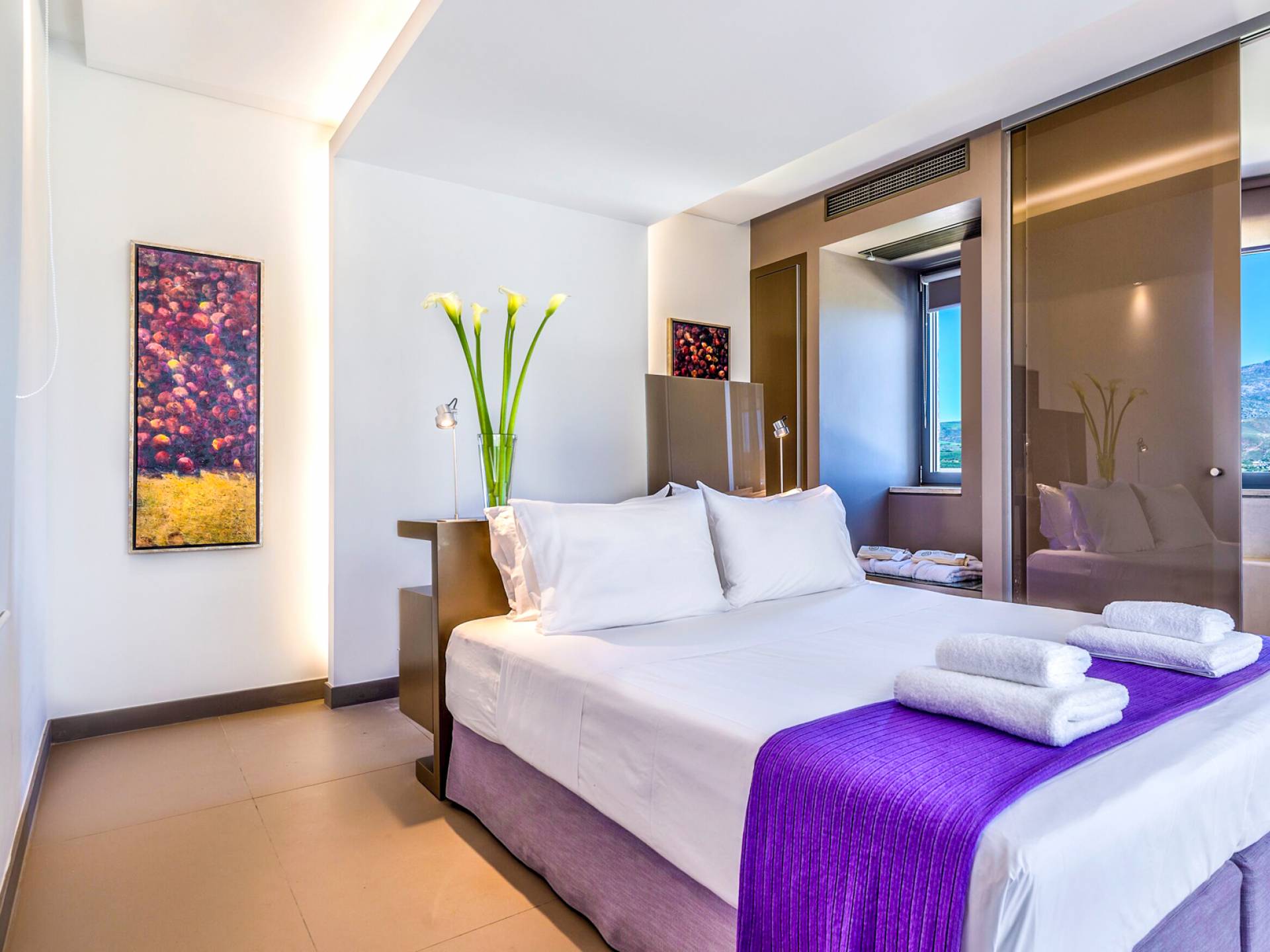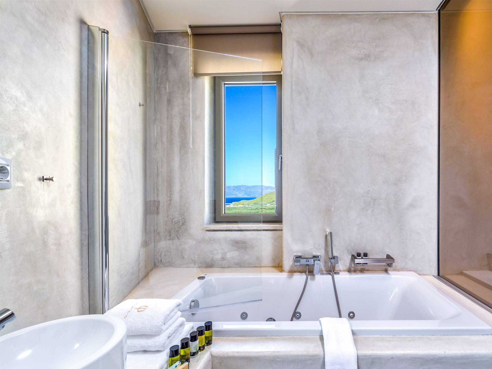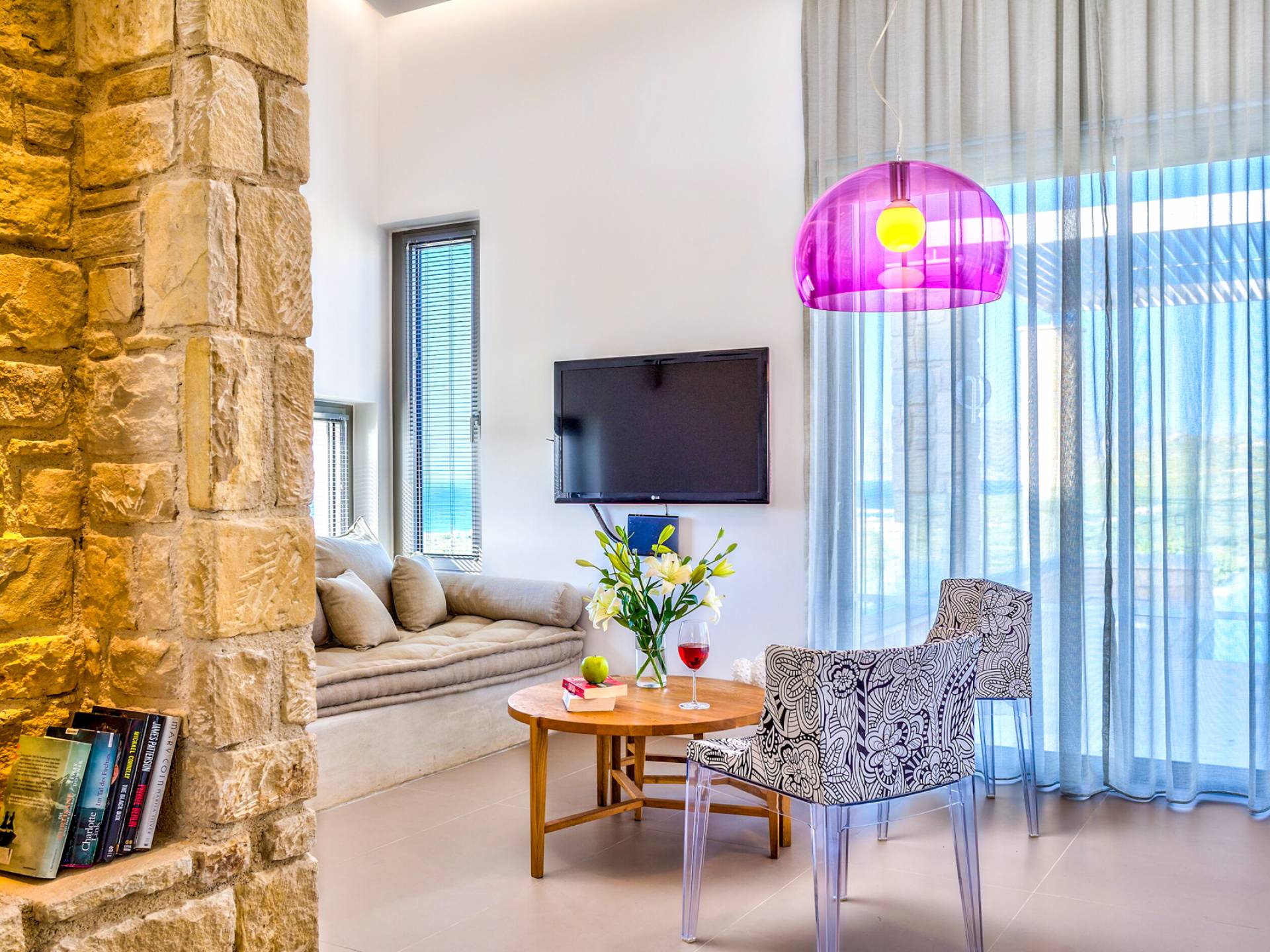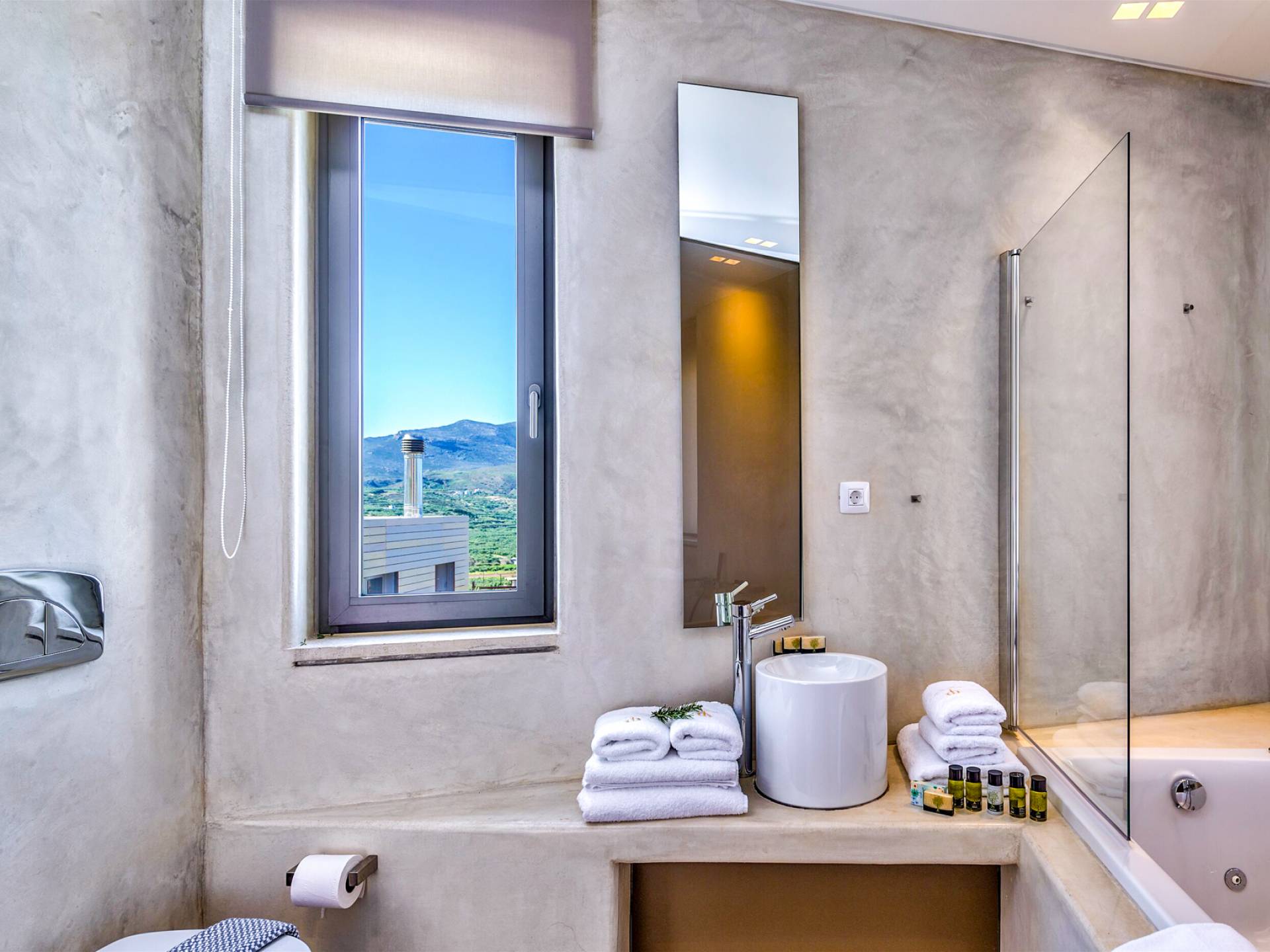 Große Fenster lassen das Licht herein und bieten einen atemberaubenden Blick über die Bucht von Kissamos und über die angelegten Gärten der Villa. Endemische Sträucher, Blumen und Bäume werden durch traditionelle Steinmauern ergänzt, die sich in die natürliche Umgebung einfügen, um die Symphonie zu verstärken. Der private Infinity-Pool überblickt Olivenhaine in Richtung der Ägäis und ist ein unvergessliches Bild eines Rahmens, der den ganzen Charme des Mittelmeers umgibt. Das innovative Konzept einer dreieckigen Fassade trennt Wohn- und Schlafbereich in zwei Gebäuden, die über einen Gehweg miteinander kommunizieren, und sorgt so für noch mehr Privatsphäre.