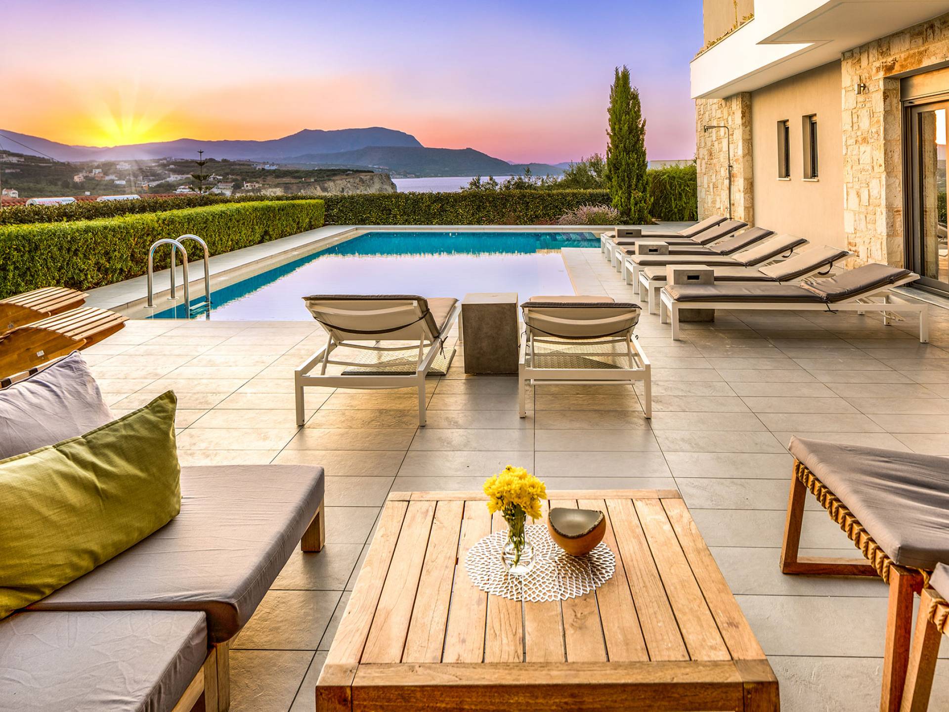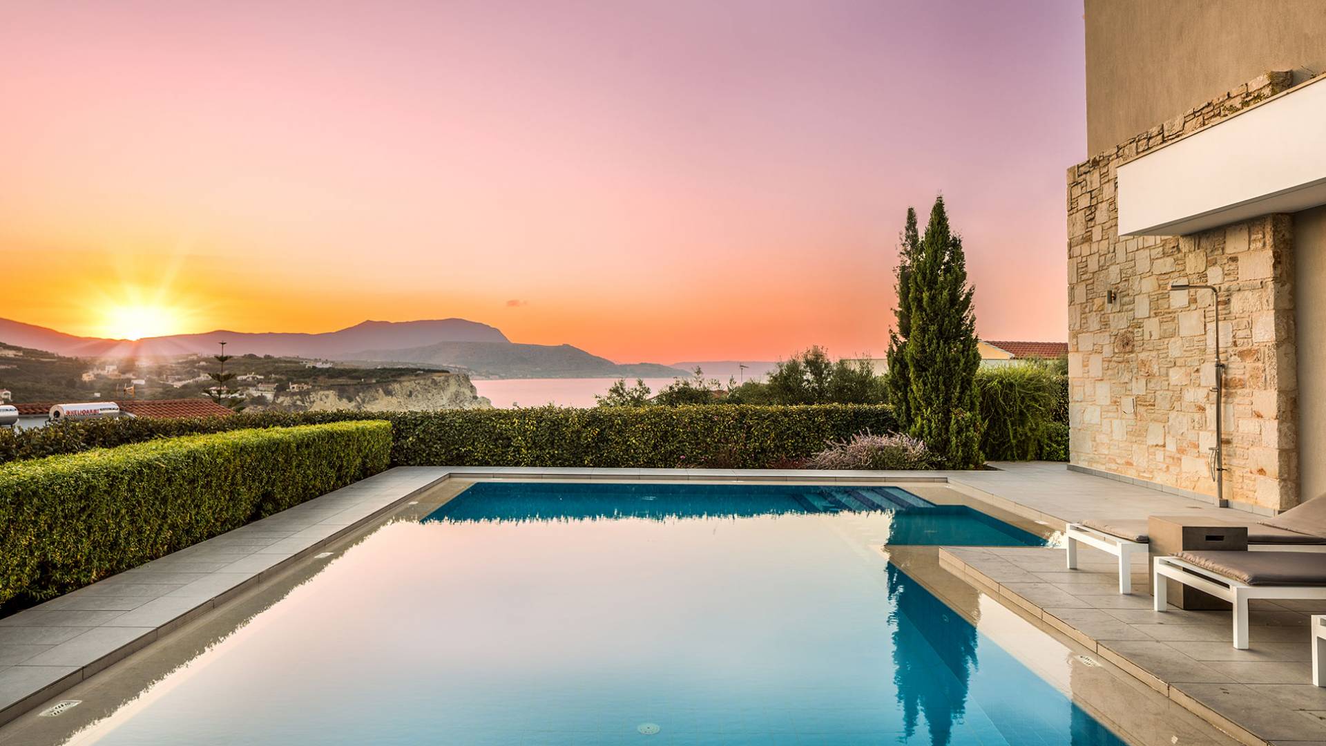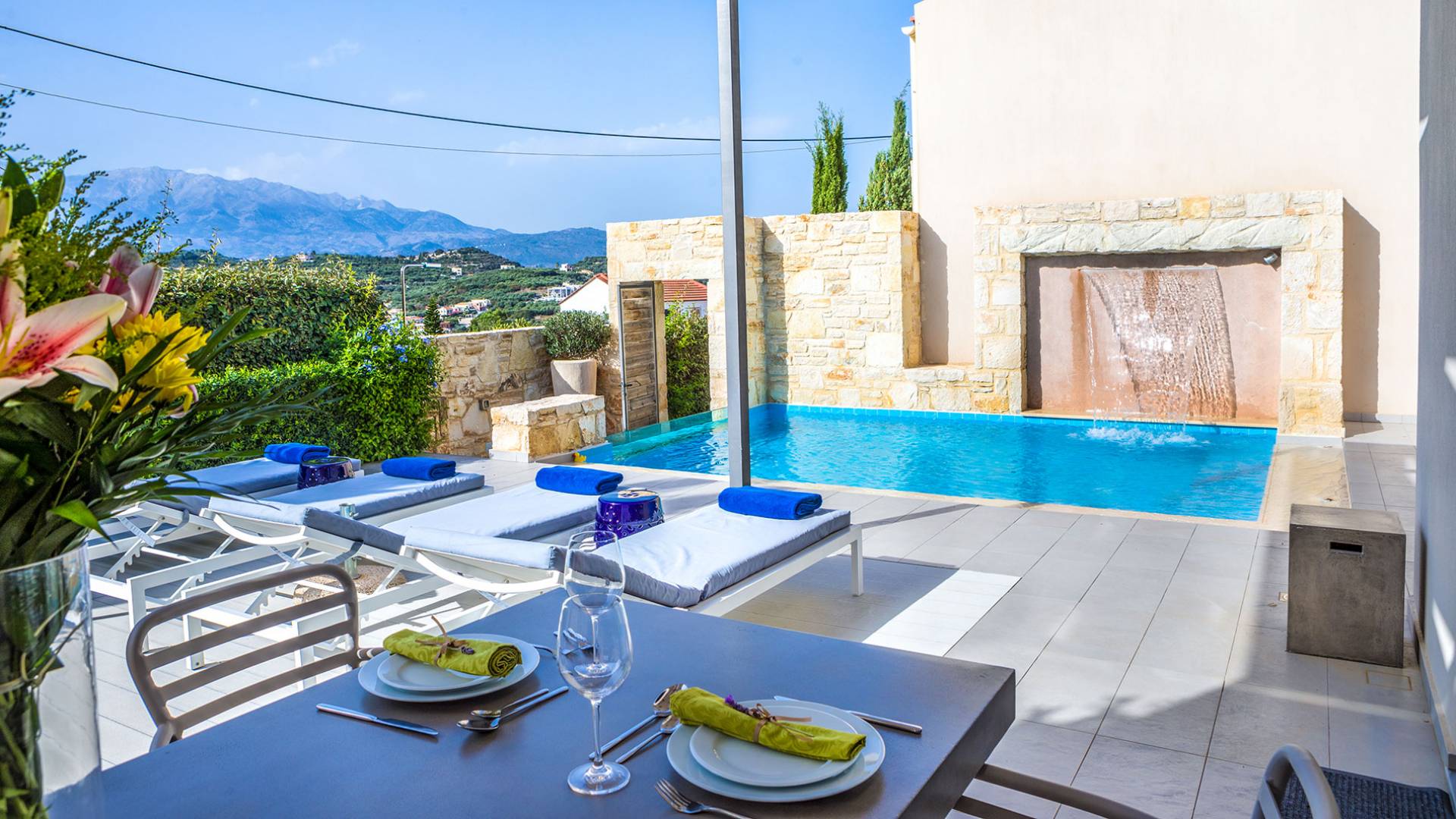 The villas enjoys a fantastic location just moments away from Almyrida, one of Crete’s most beloved summer destinations. Its stunning sandy beach is perfect for families and kids, offering safe swimming and beautiful scenery.