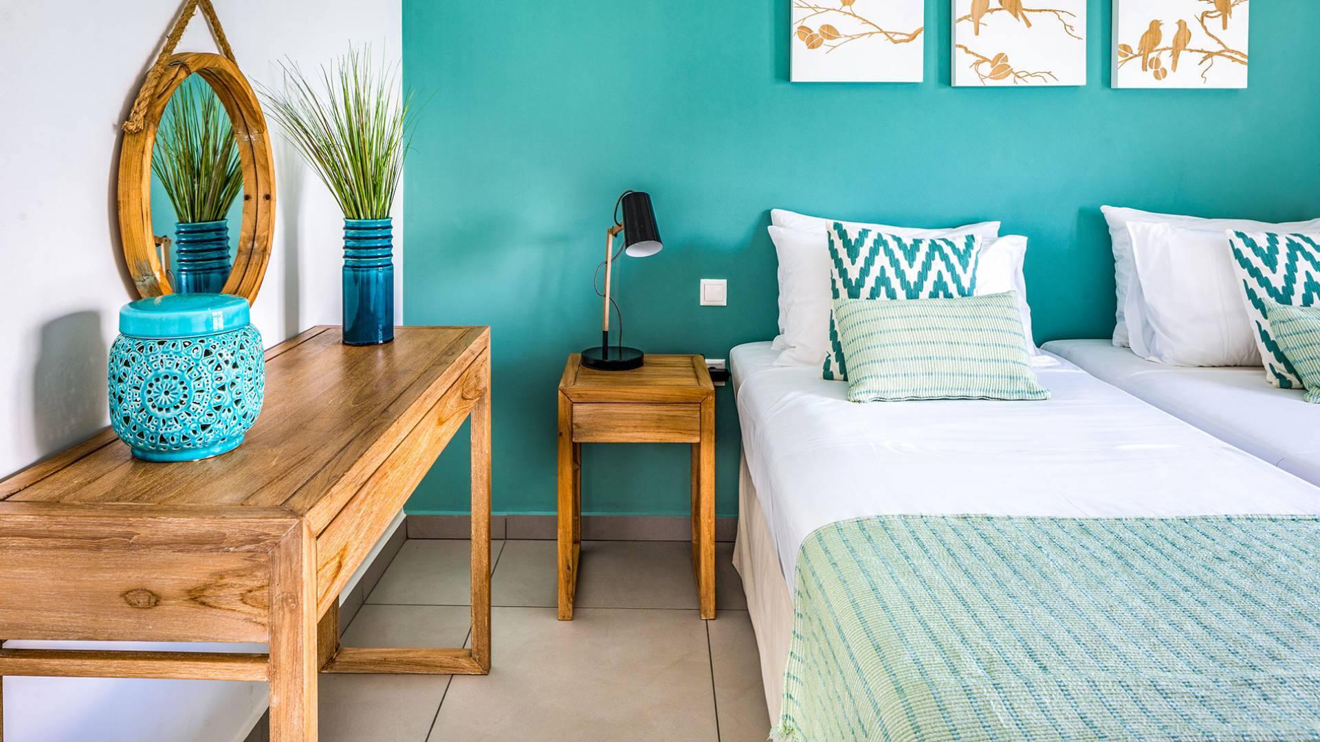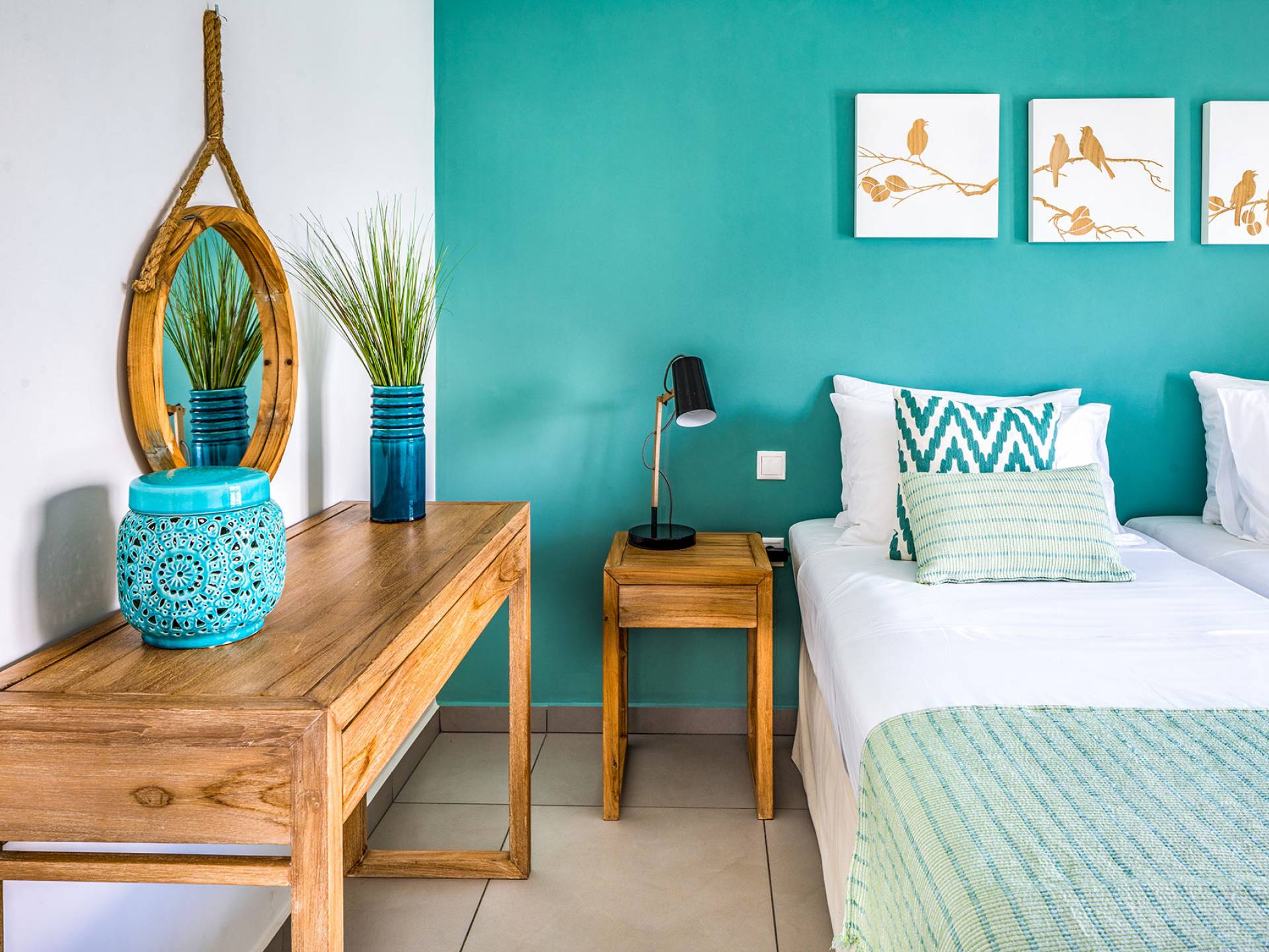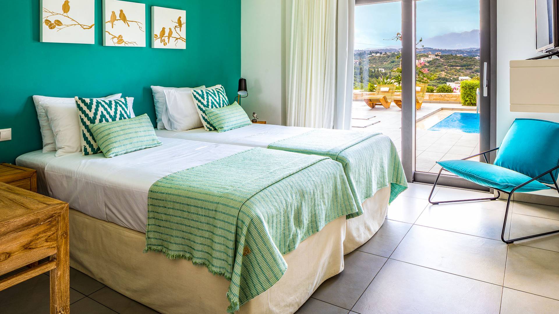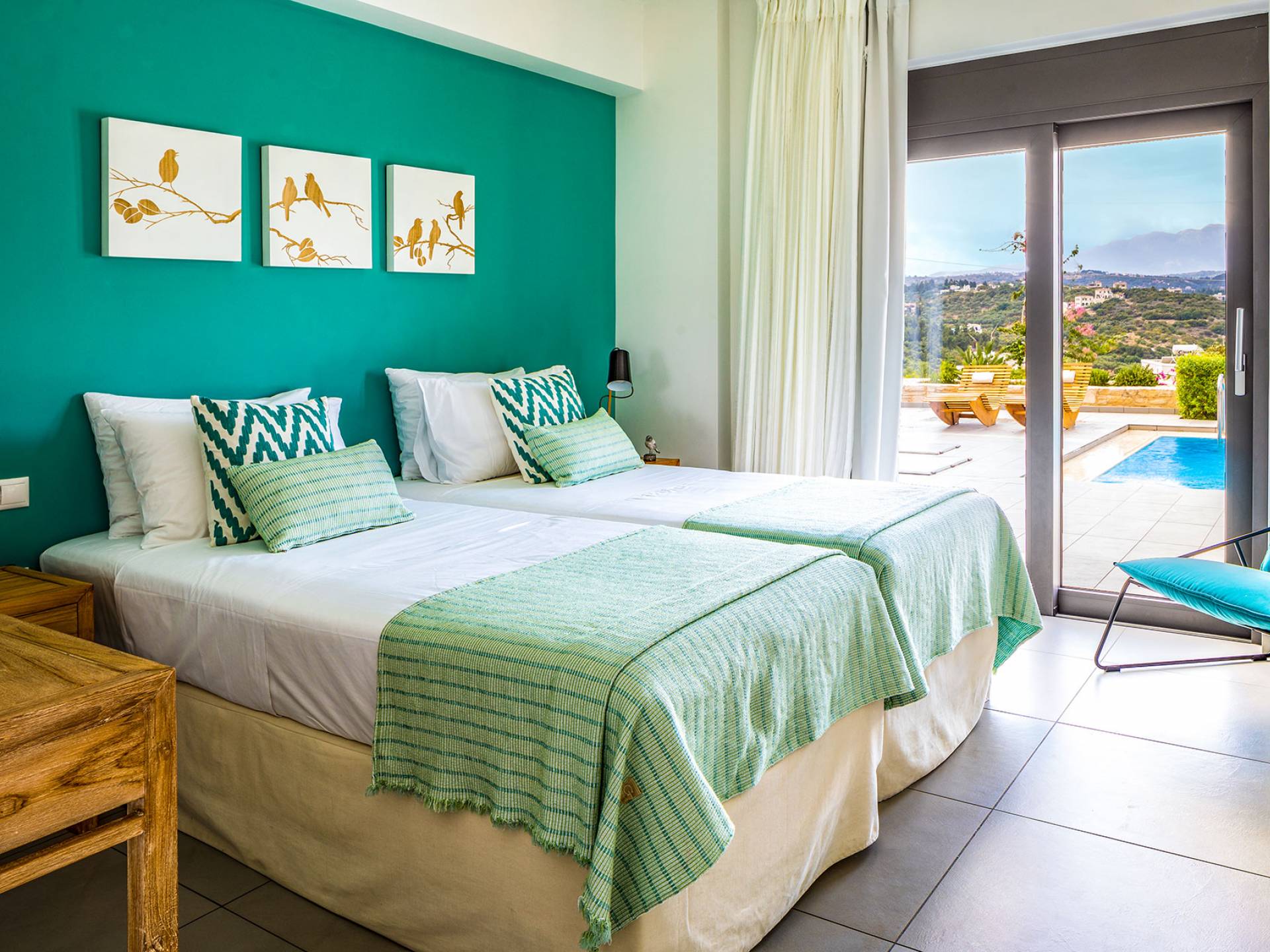 - Bedroom 1 with two single beds, ensuite bathroom and pool access