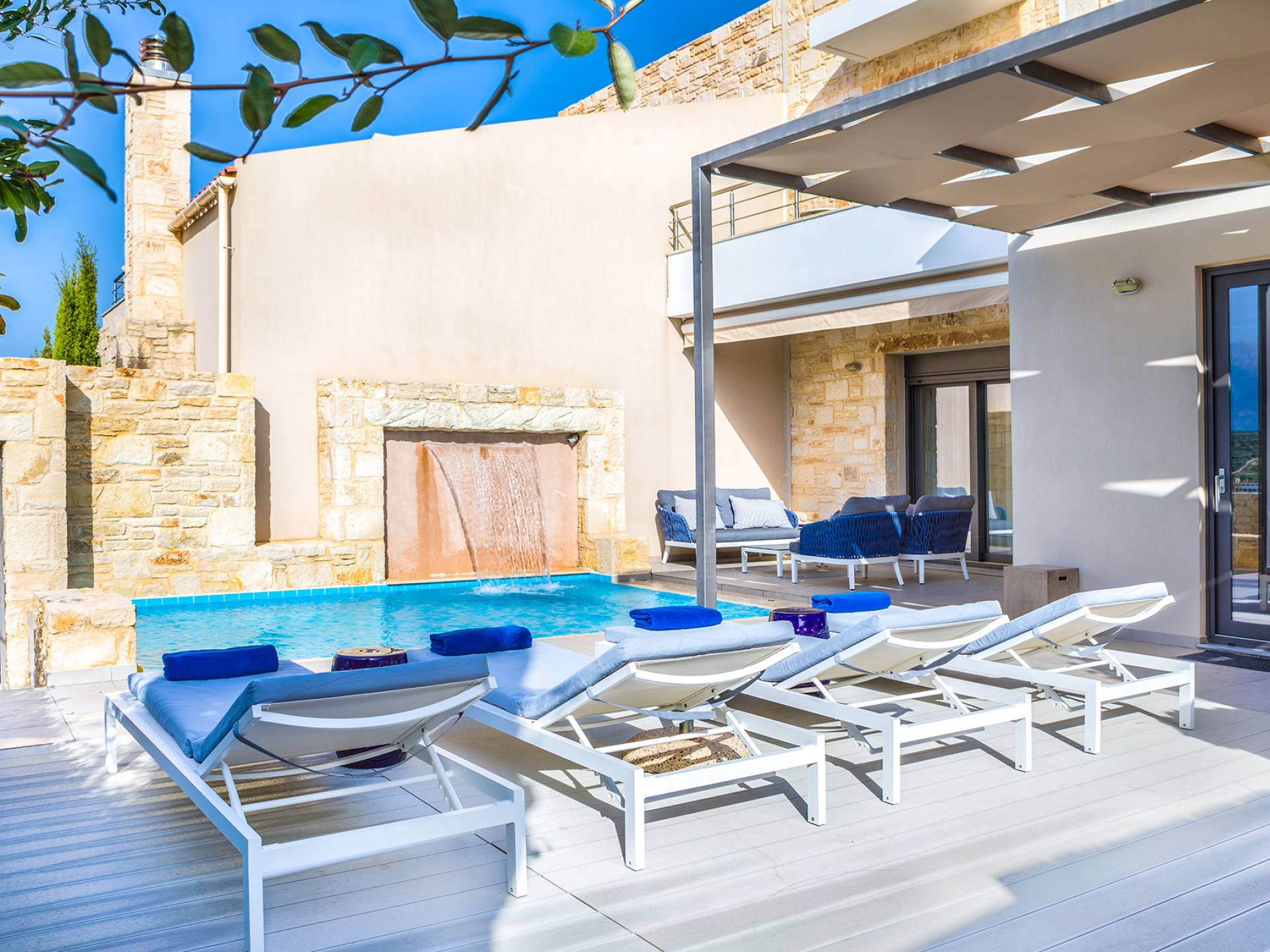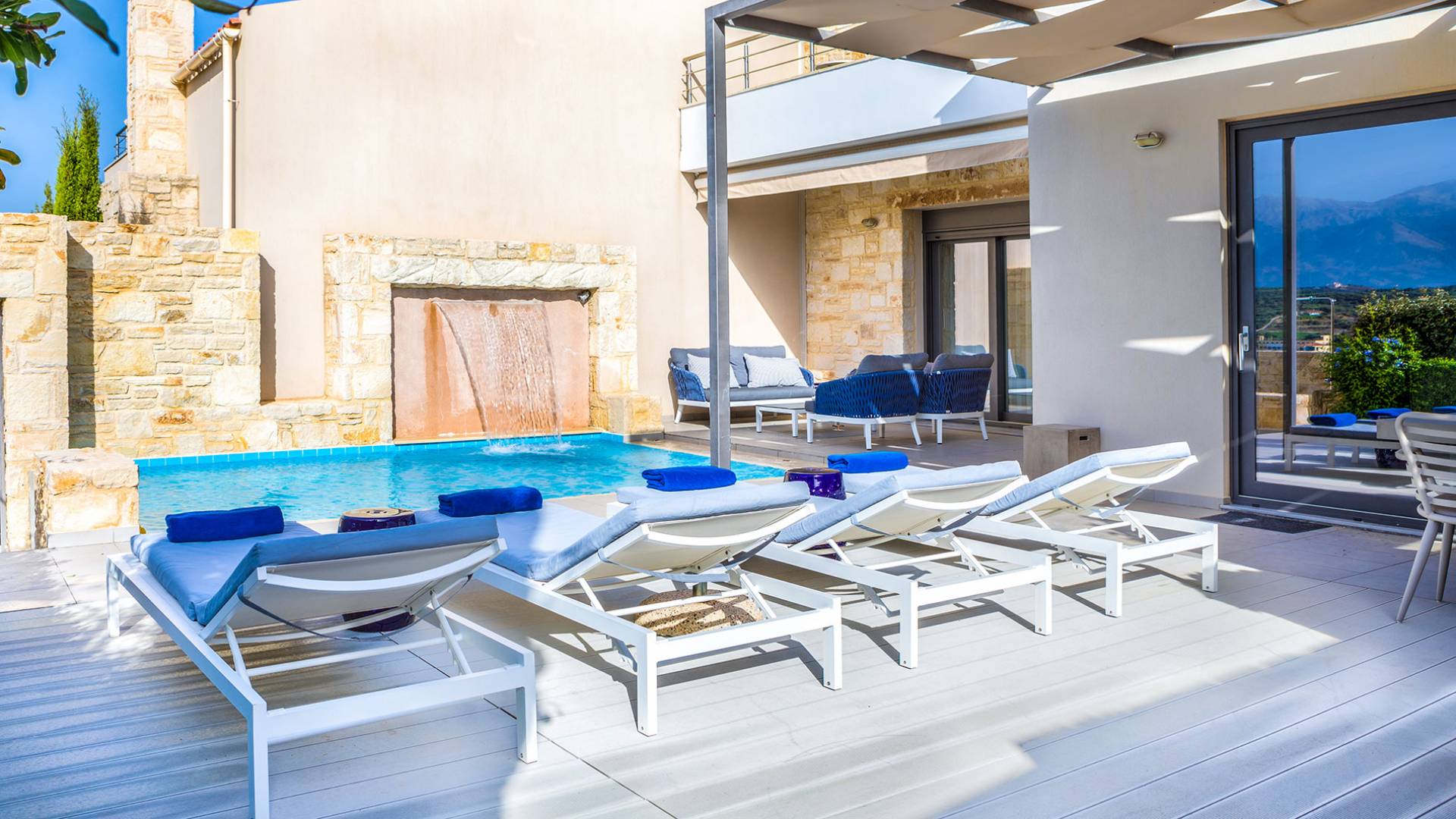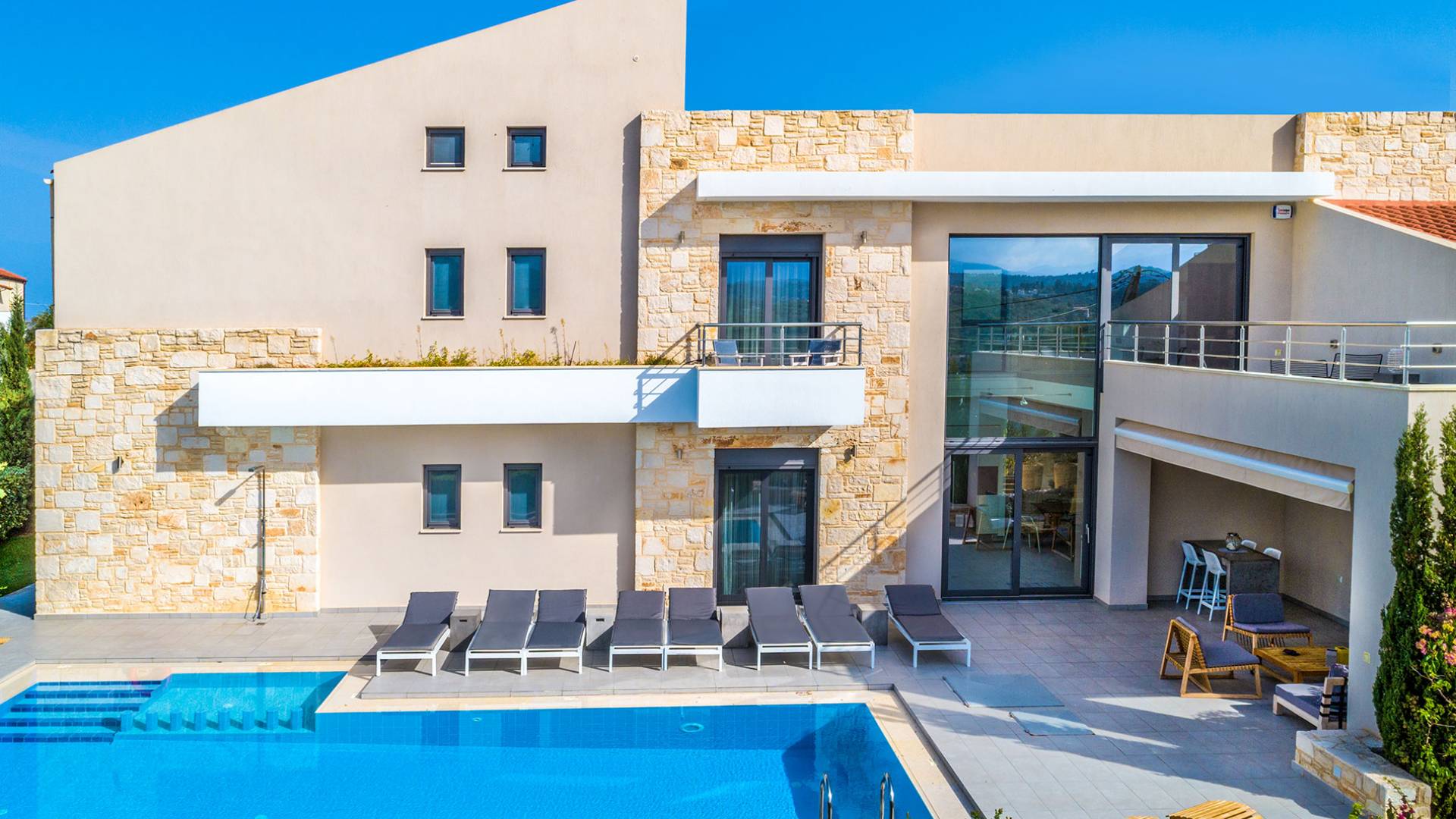 Enjoy a stay in these chic, modern villas with 2 private pools in Almyrida, thoughtfully designed for comfort and relaxation. Large windows fill the spaces with natural light, creating a calm and welcoming atmosphere throughout.