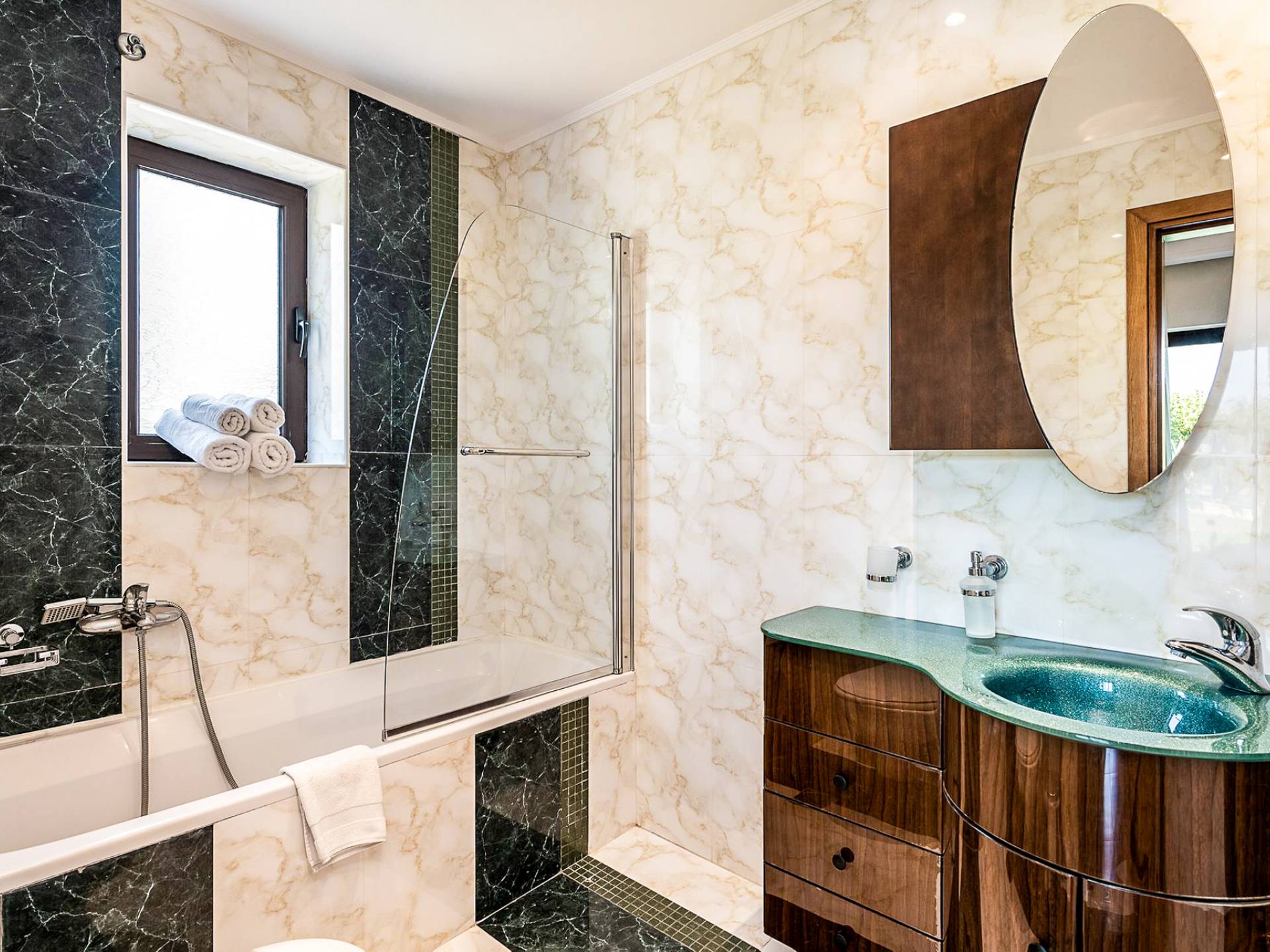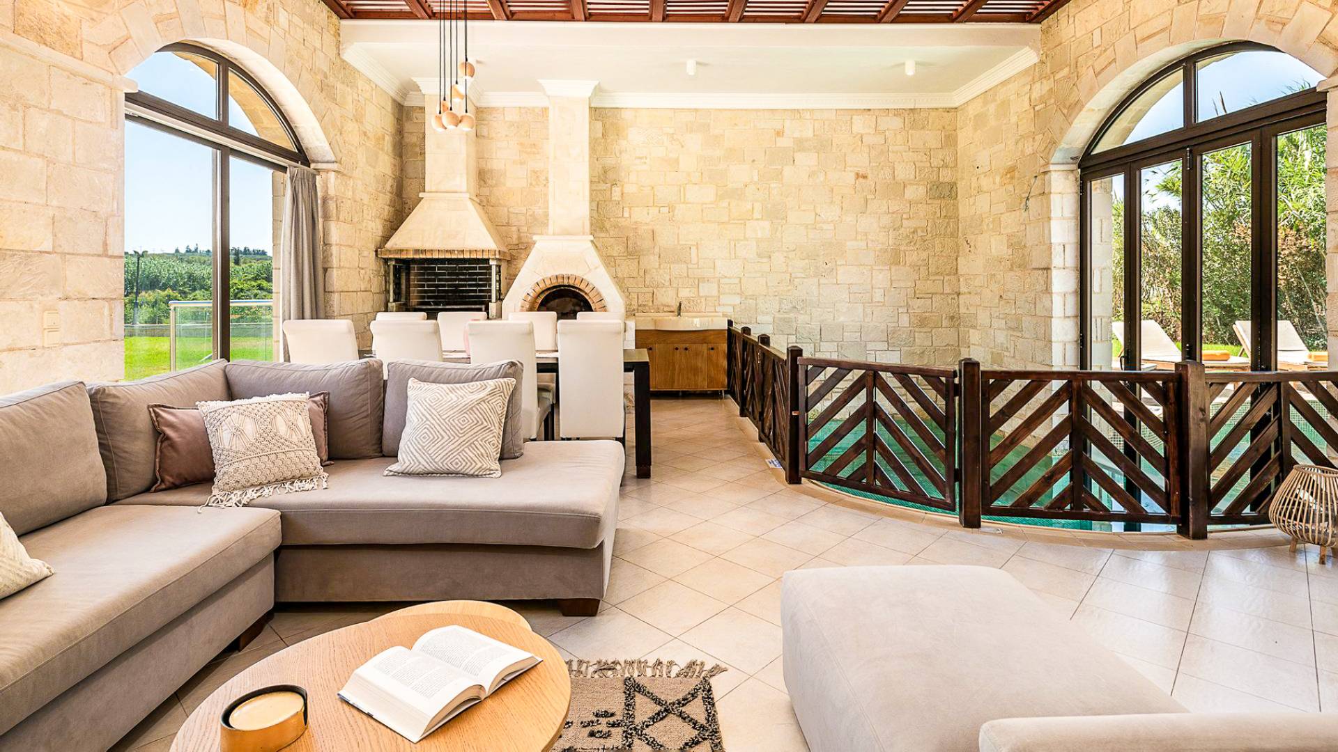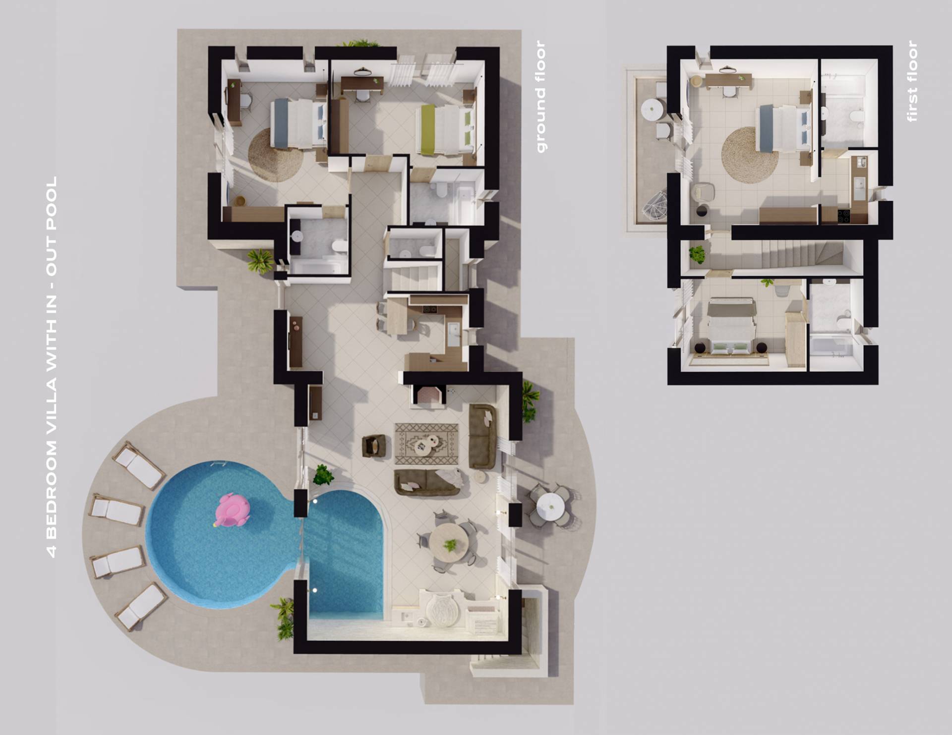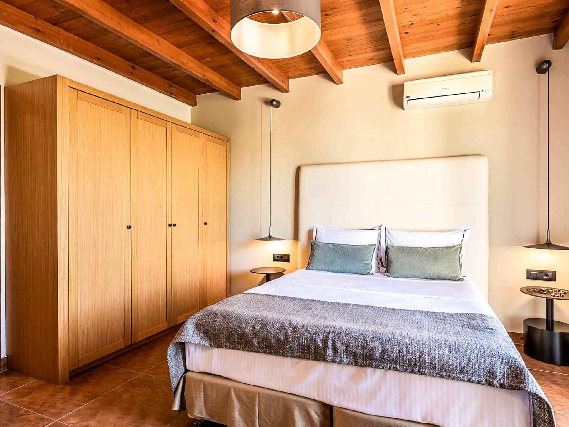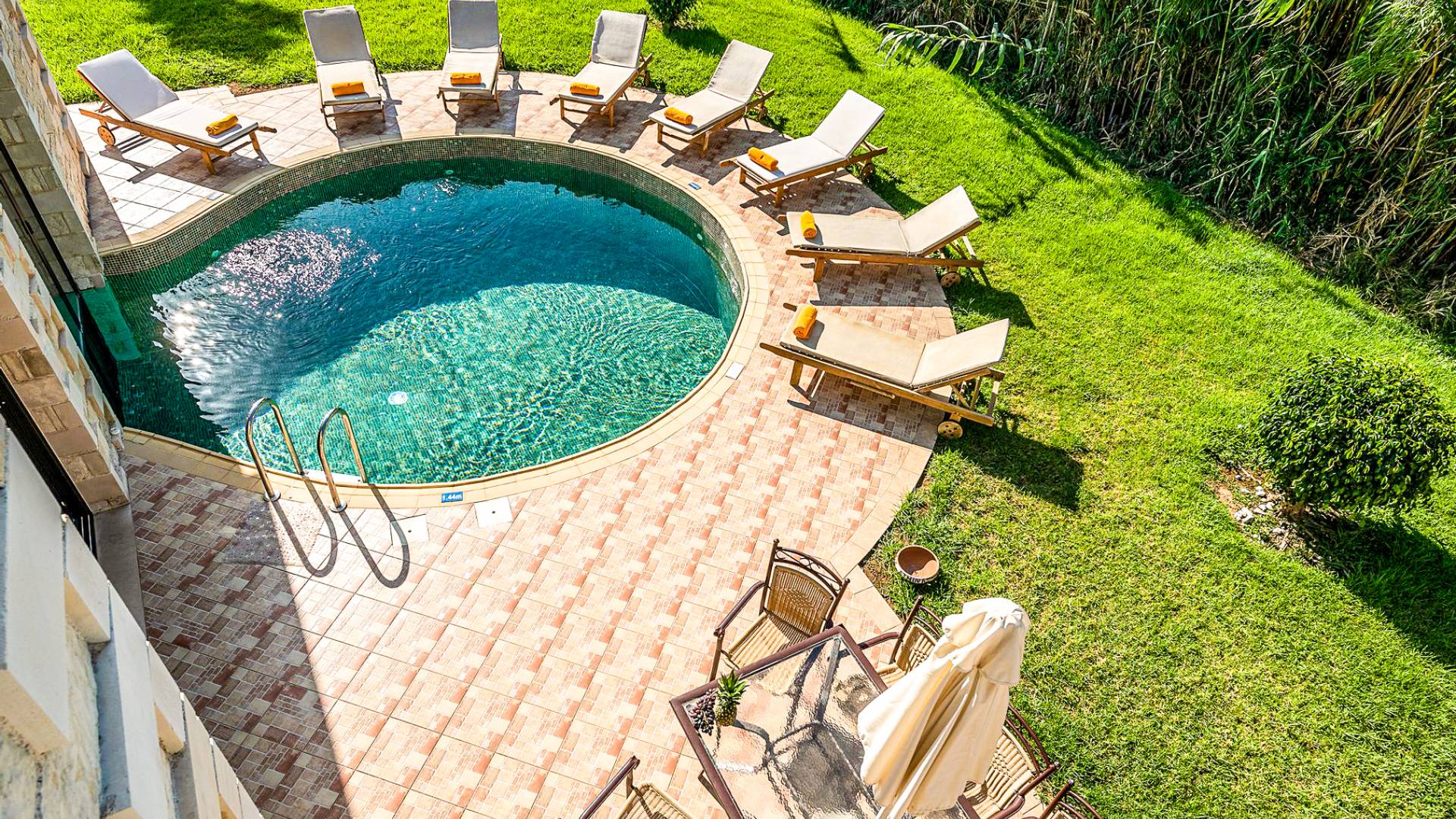 Im Erdgeschoss befindet sich ein stilvoll eingerichteter Wohn- und Essbereich mit Kamin und Grill, kombiniert mit einem privaten Innen-/Außenpool, der eine wahre und bezaubernde Atmosphäre schafft. Im Erdgeschoss befinden sich zwei Doppelzimmer mit eigenem Bad. Außerdem gibt es ein WC und ein Zustellbett für die 9. Person. Im ersten Stock befinden sich zwei Doppelzimmer mit eigenem Bad und großen Balkonen mit Blick auf die Gärten. Alle Zimmer verfügen über einen 32-Zoll-Flachbildfernseher, eine Klimaanlage sowie eine Zentralheizung, wodurch die Villa das ganze Jahr über als Unterkunft geeignet ist, sowie Gartenmöbel, Sonnenliegen und Sonnenschirme.